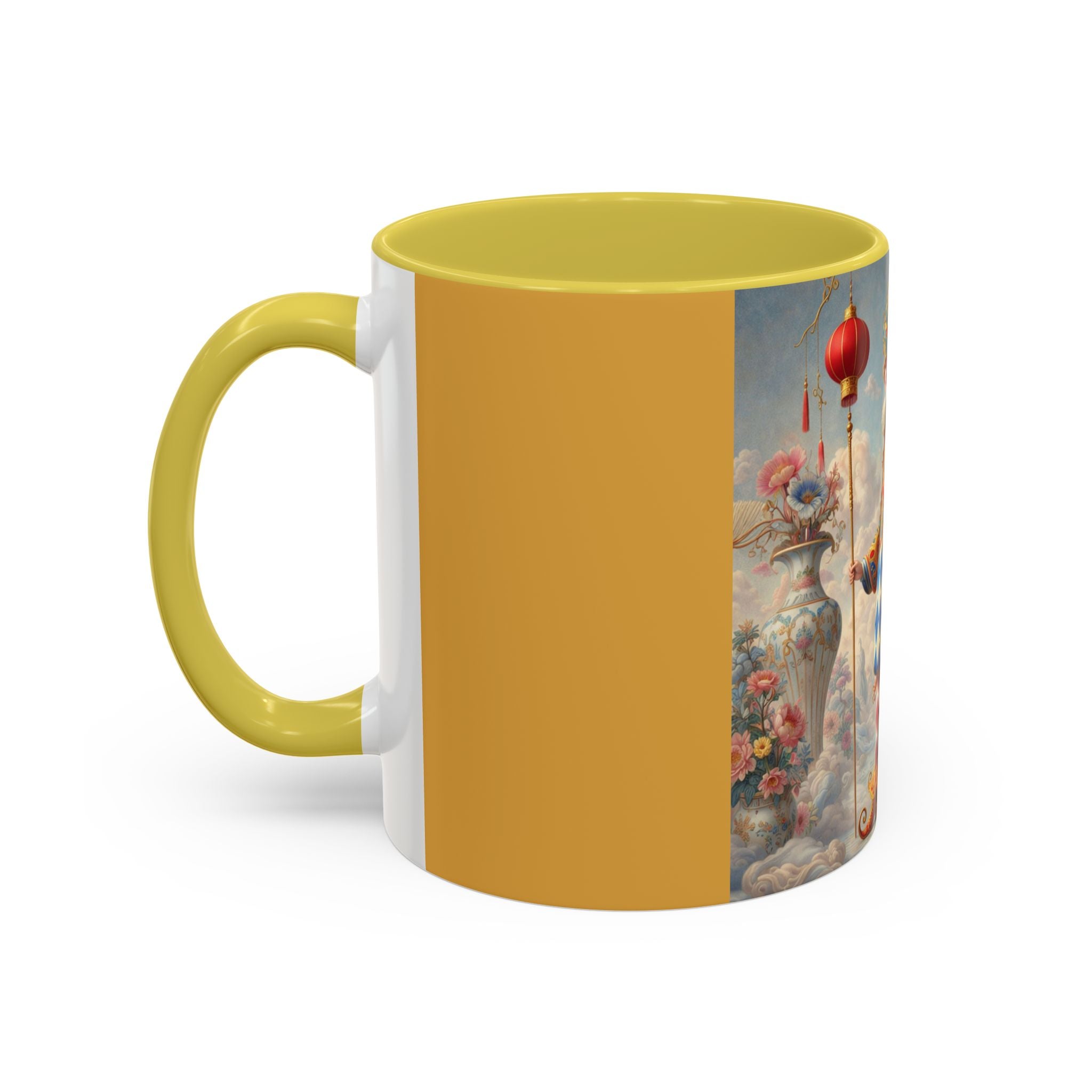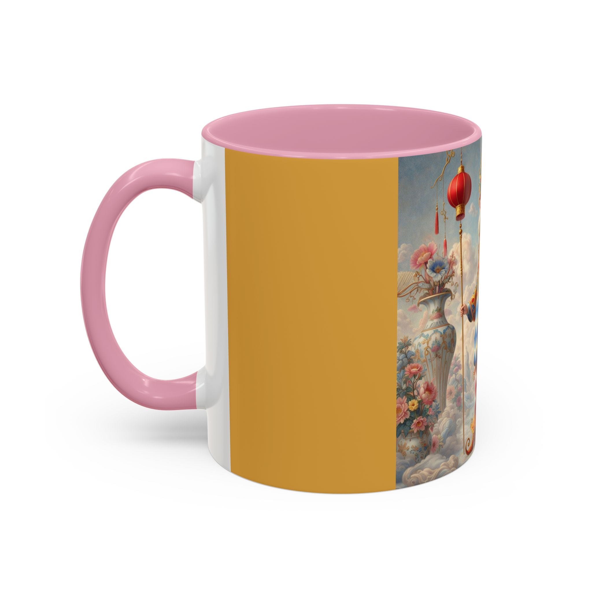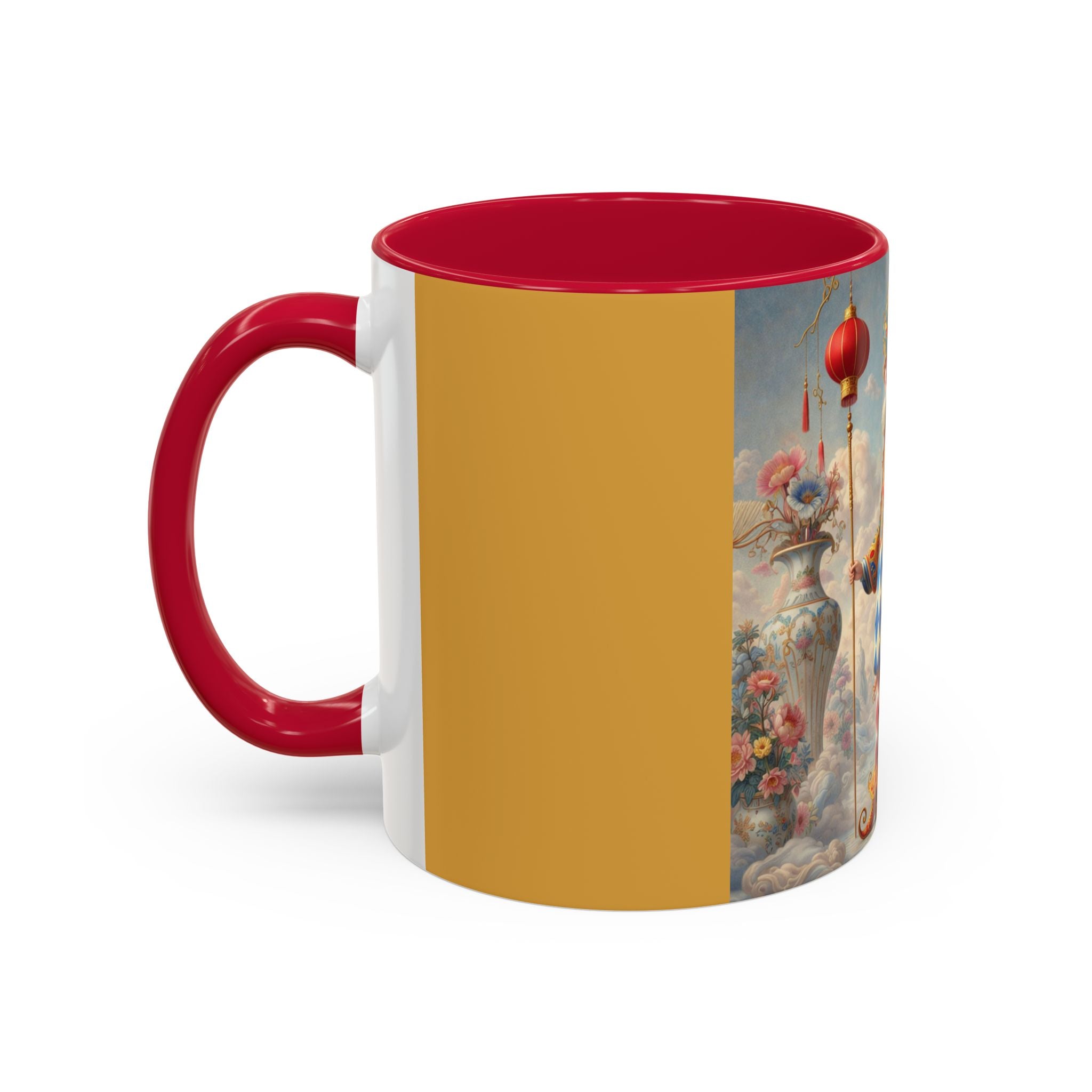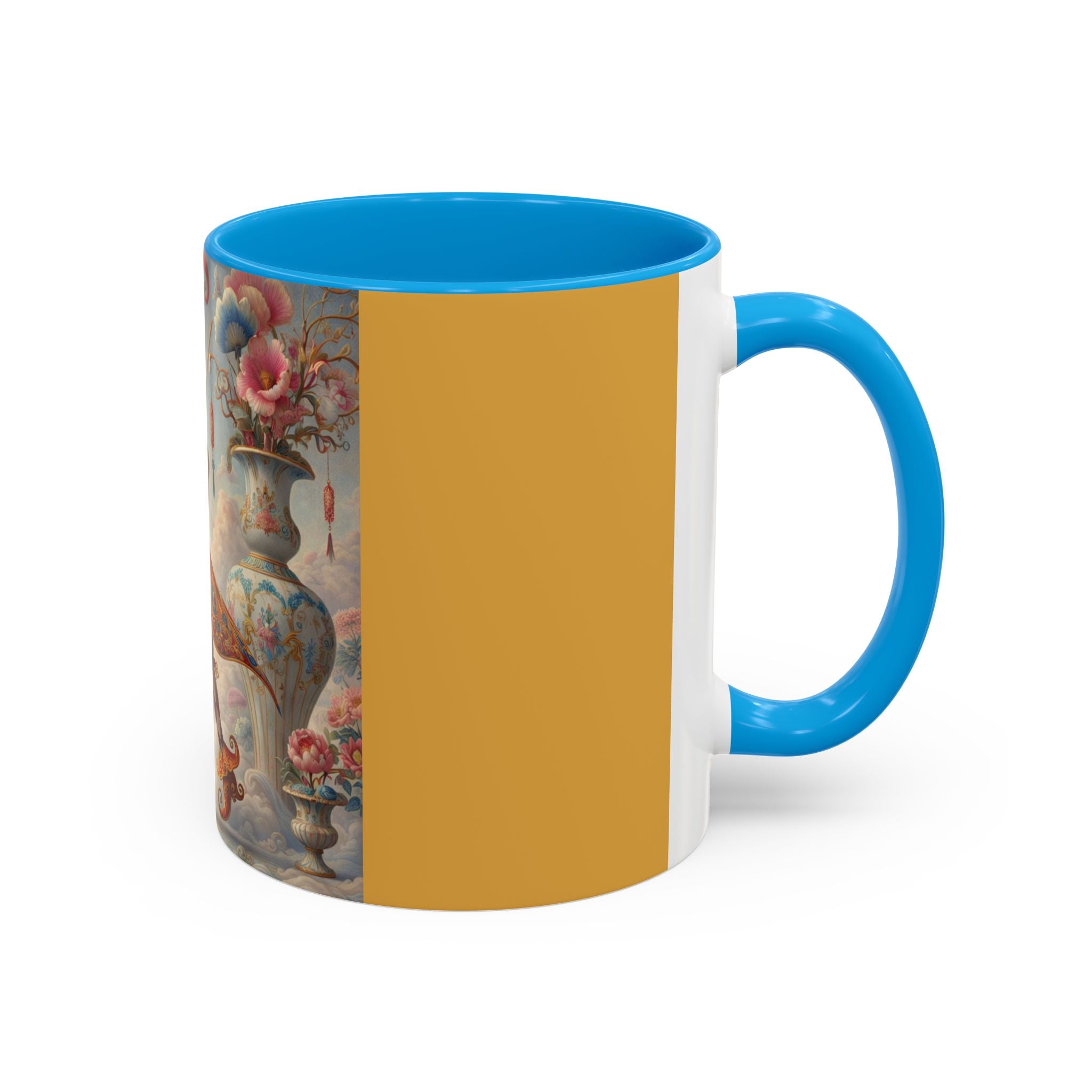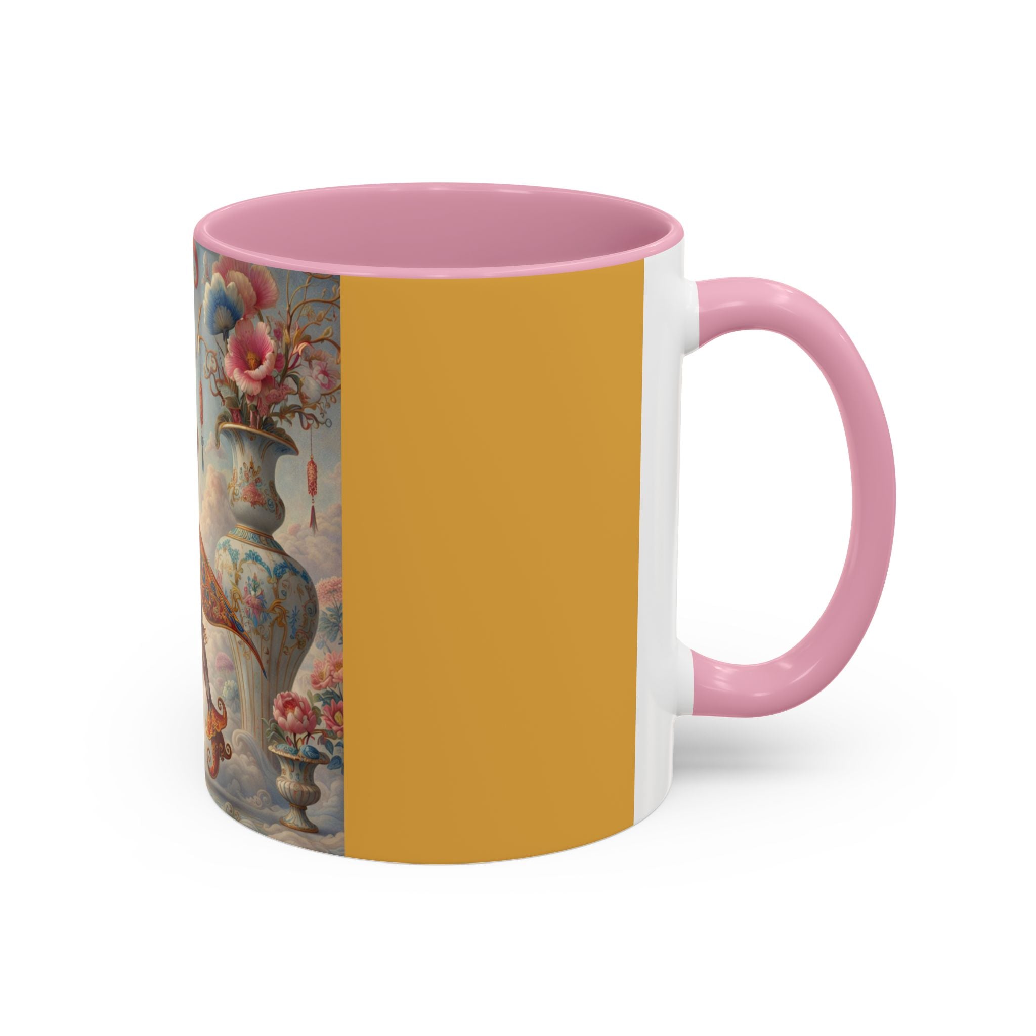 The Ornamental Jester Colorful Mugs (11oz, 15oz) bring everyday ritual and refined artistry together, turning your morning coffee or afternoon tea into a moment of quiet theater. Crafted from glossy ceramic and finished with a colored handle and interior, these mugs are available in two practical sizes and twelve accent colors, making them as expressive as they are functional. As you lift the mug, the artwork reveals a poised jester figure—elegant rather than comedic—rendered in porcelain whites, soft blush, and muted pastels, where ornamental costume details and floral accents suggest ceremony, balance, and curated beauty rather than spectacle. The result is a mug that feels timeless, decorative, and thoughtfully composed, perfect for both daily use and display.