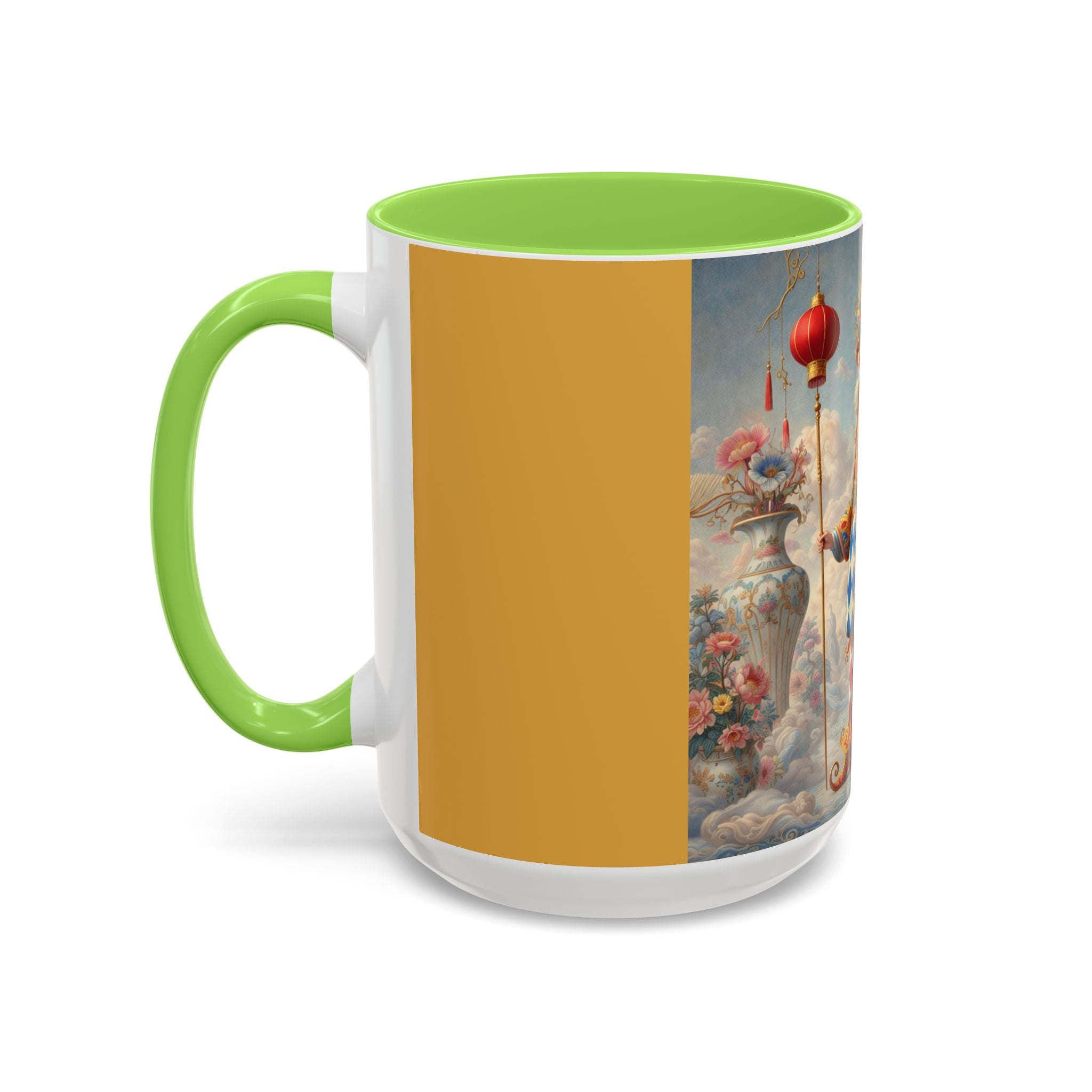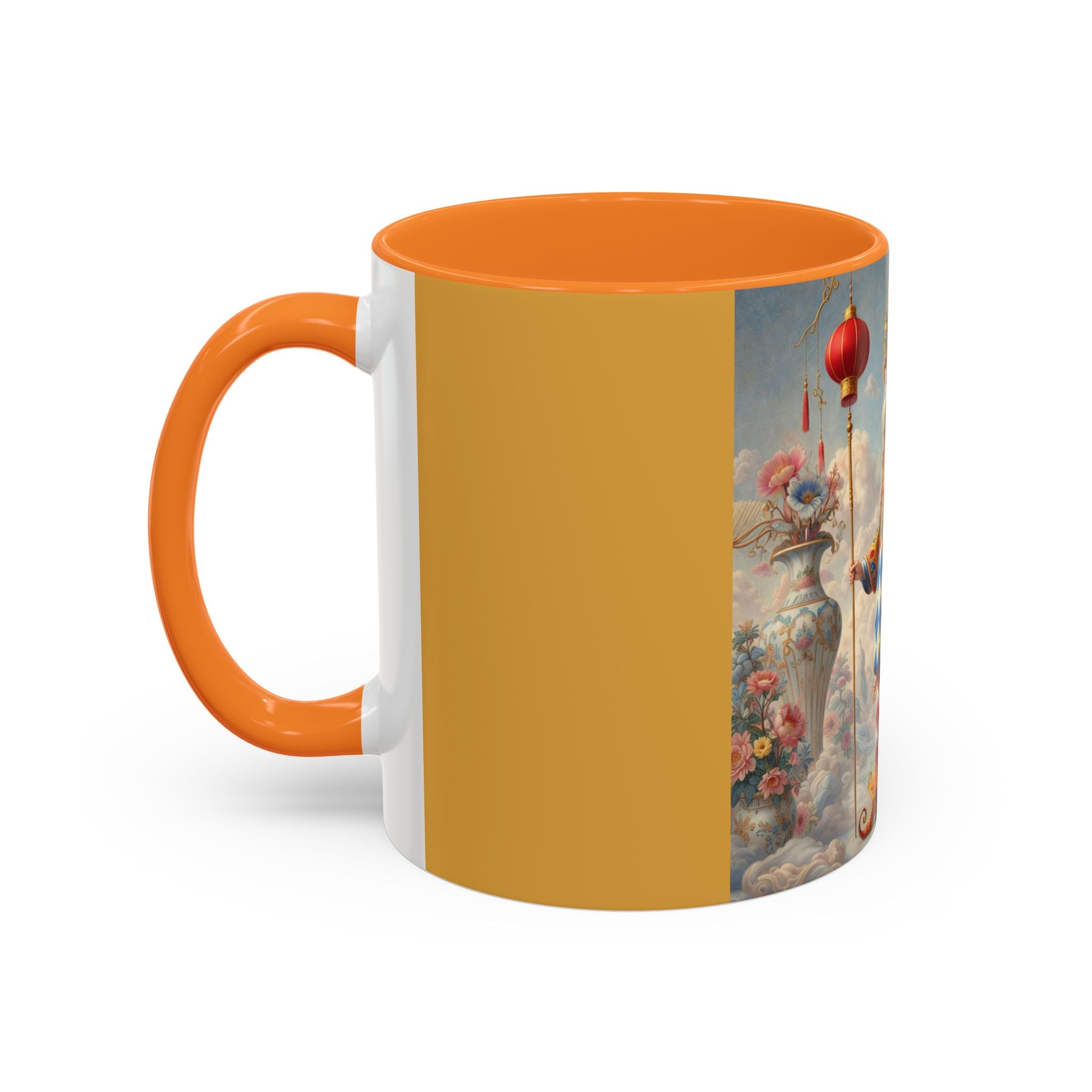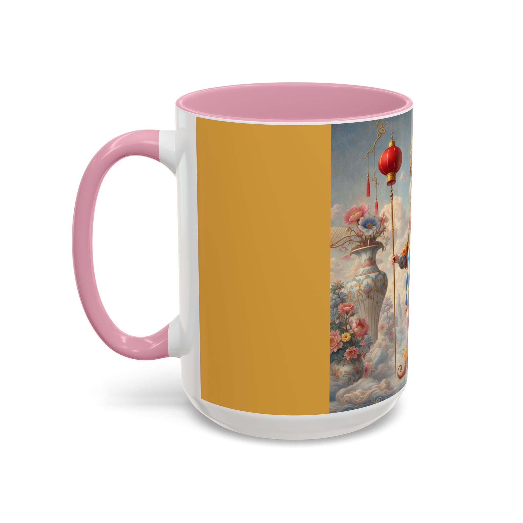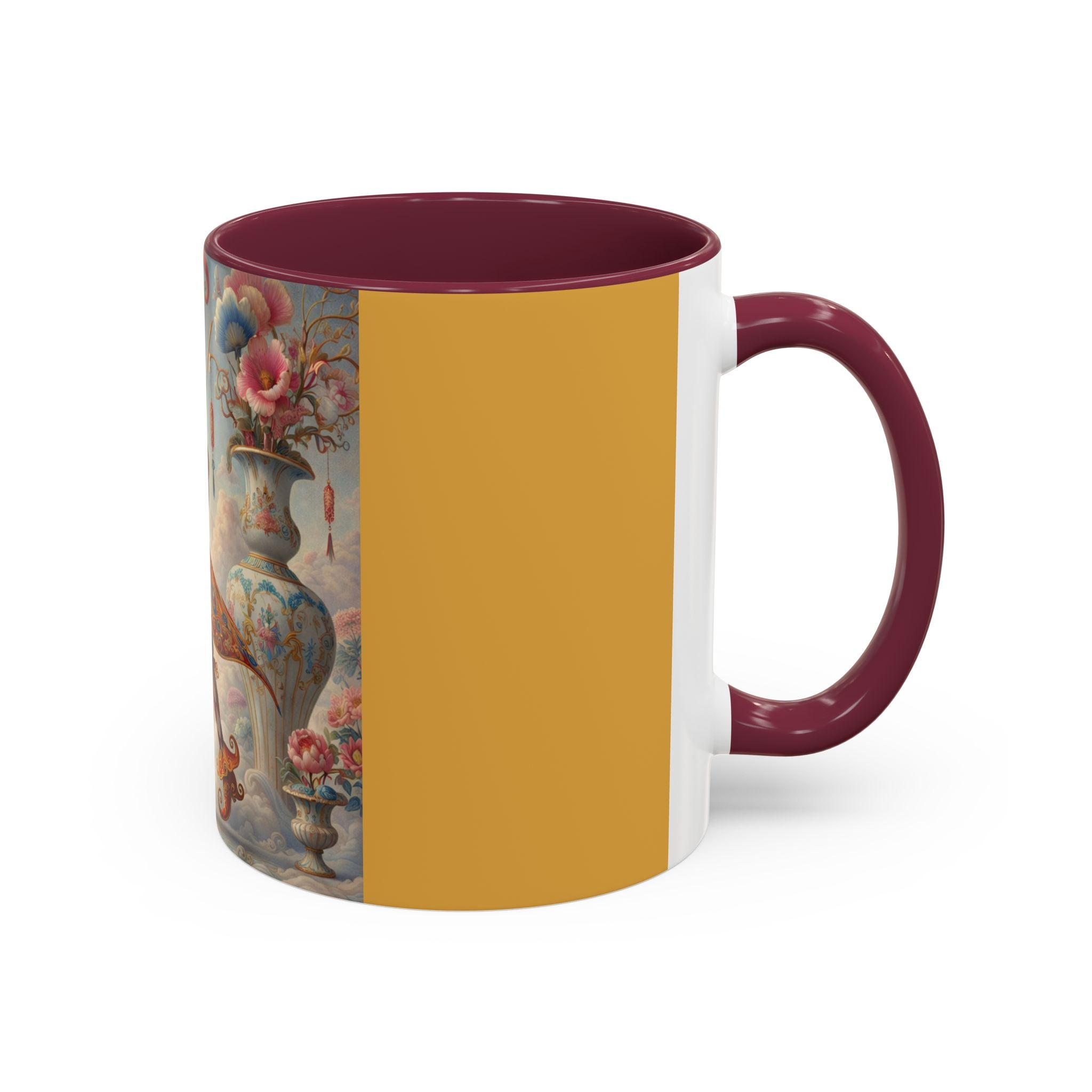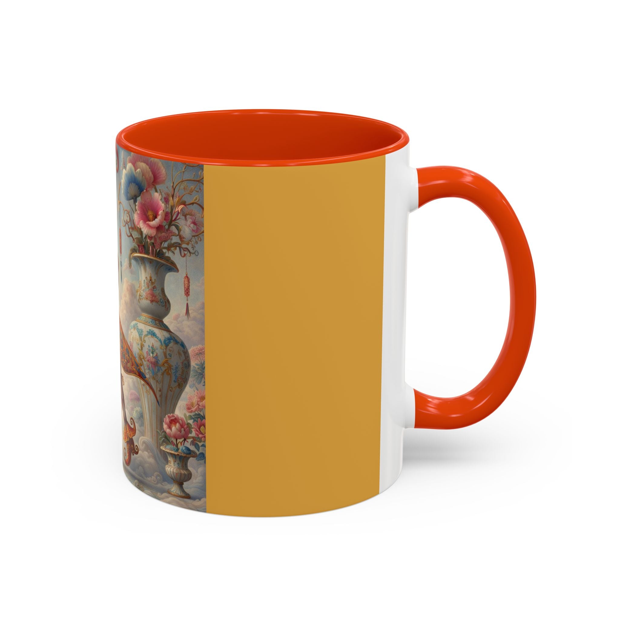 The Ornamental Jester Colorful Mugs (11oz, 15oz) bring everyday ritual and refined artistry together, turning your morning coffee or afternoon tea into a moment of quiet theater. Crafted from glossy ceramic and finished with a colored handle and interior, these mugs are available in two practical sizes and twelve accent colors, making them as expressive as they are functional. As you lift the mug, the artwork reveals a poised jester figure—elegant rather than comedic—rendered in porcelain whites, soft blush, and muted pastels, where ornamental costume details and floral accents suggest ceremony, balance, and curated beauty rather than spectacle. The result is a mug that feels timeless, decorative, and thoughtfully composed, perfect for both daily use and display.