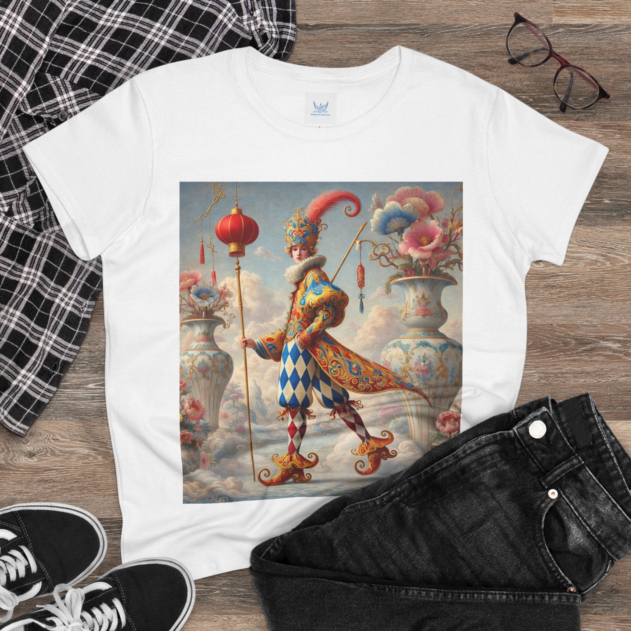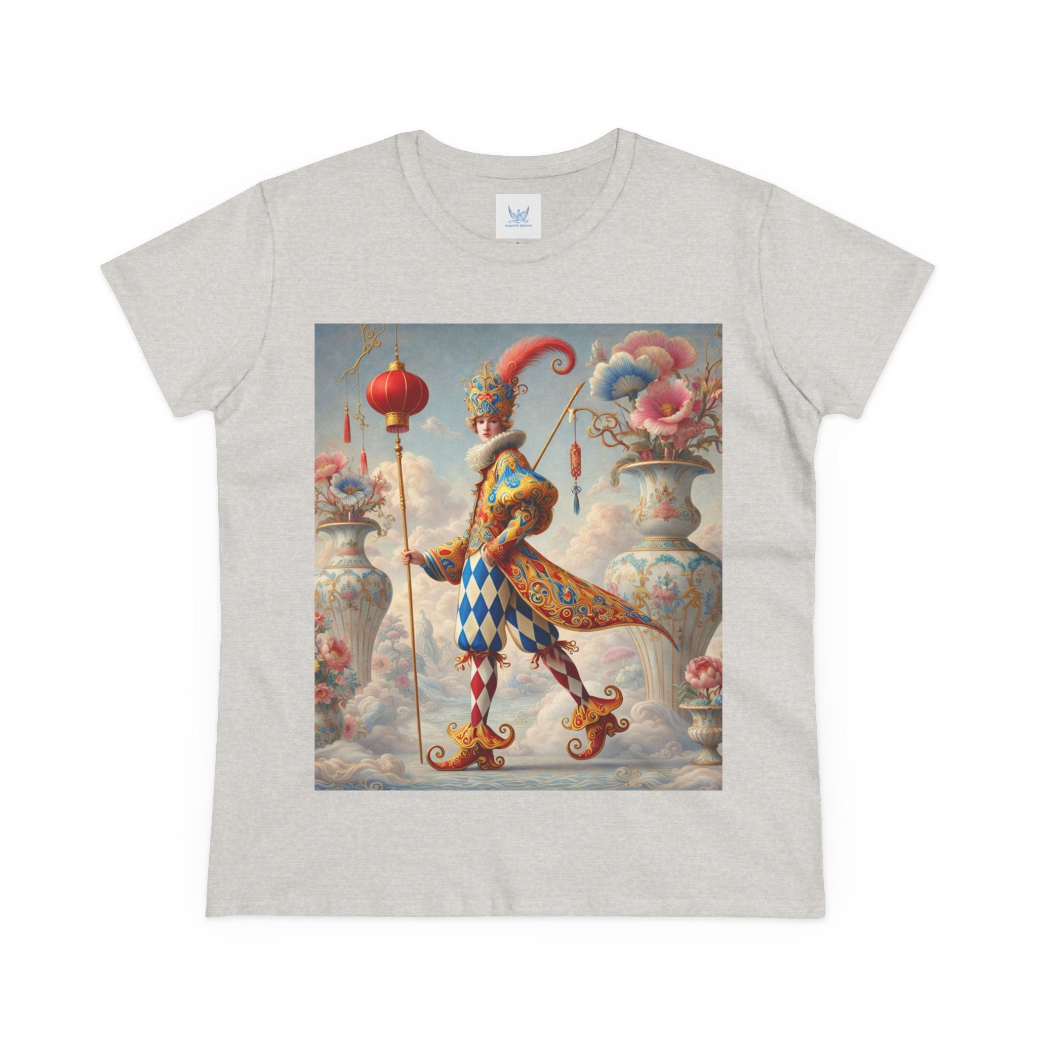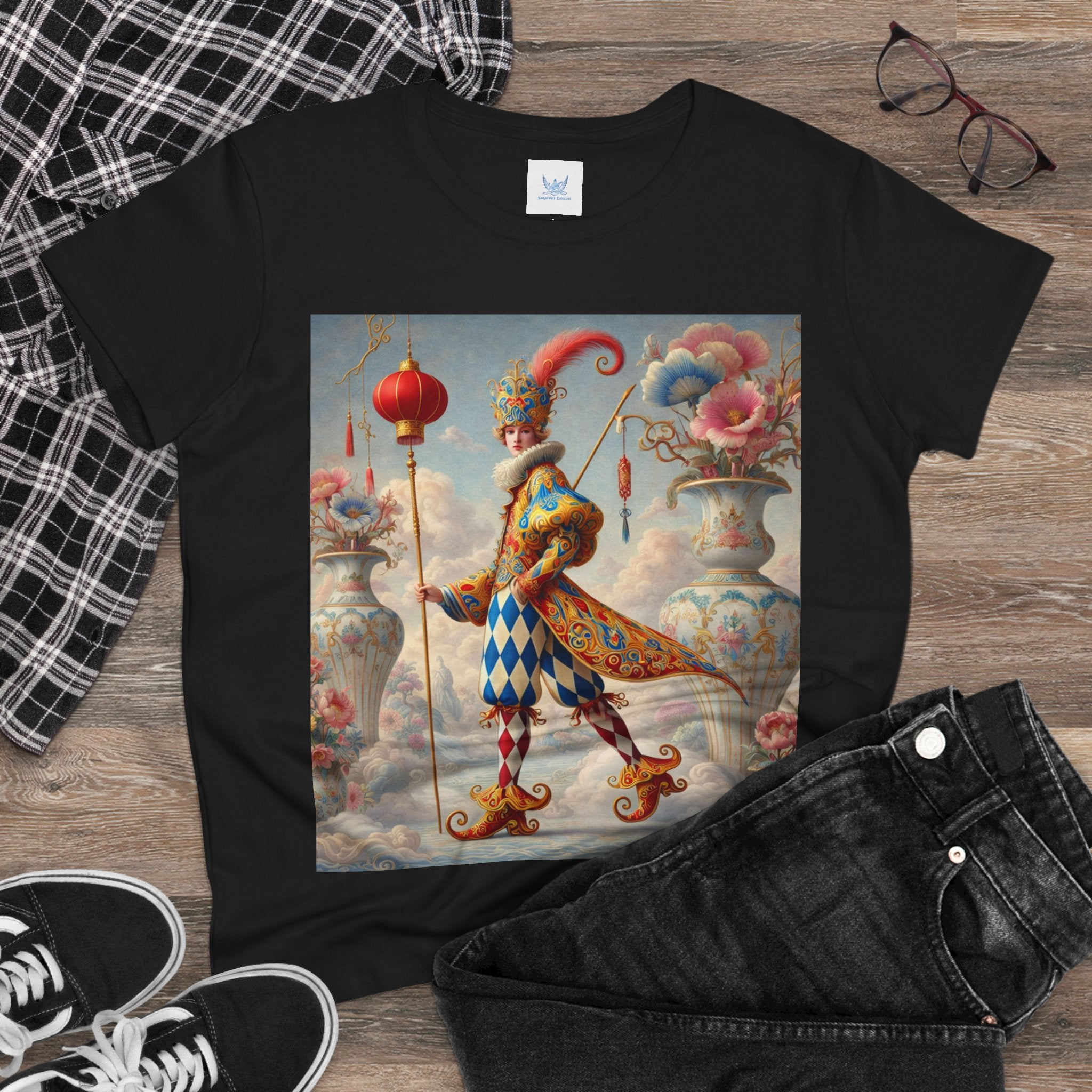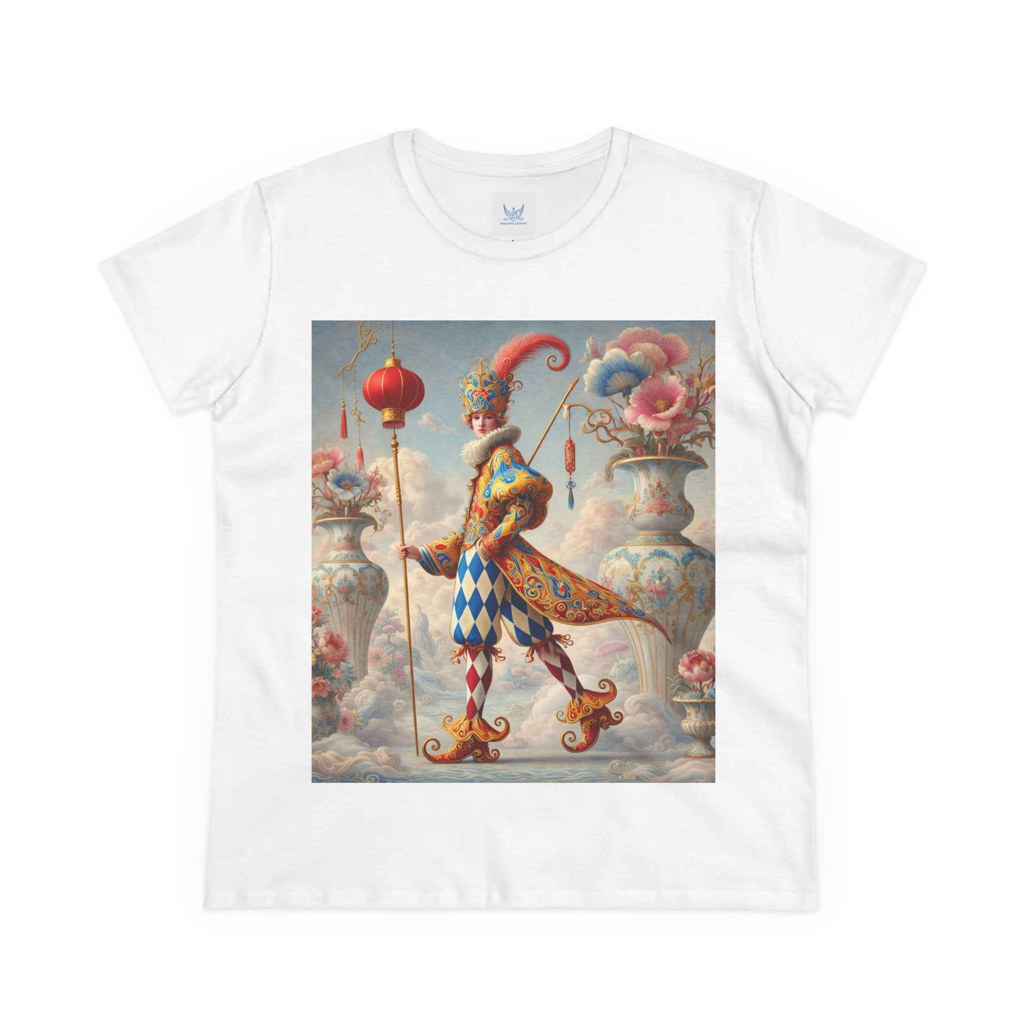 Printed on the shirt is The Ornamental Jester, a poised theatrical figure rendered in porcelain whites, soft blush, and muted pastels. Rather than playful comedy, the jester’s patterned costume, floral ornamentation, and sculptural silhouette suggest ritual, pageantry, and quiet performance. The balanced composition and restrained palette lend the tee a sense of refinement and symbolic calm, transforming it from a simple garment into a wearable art piece.