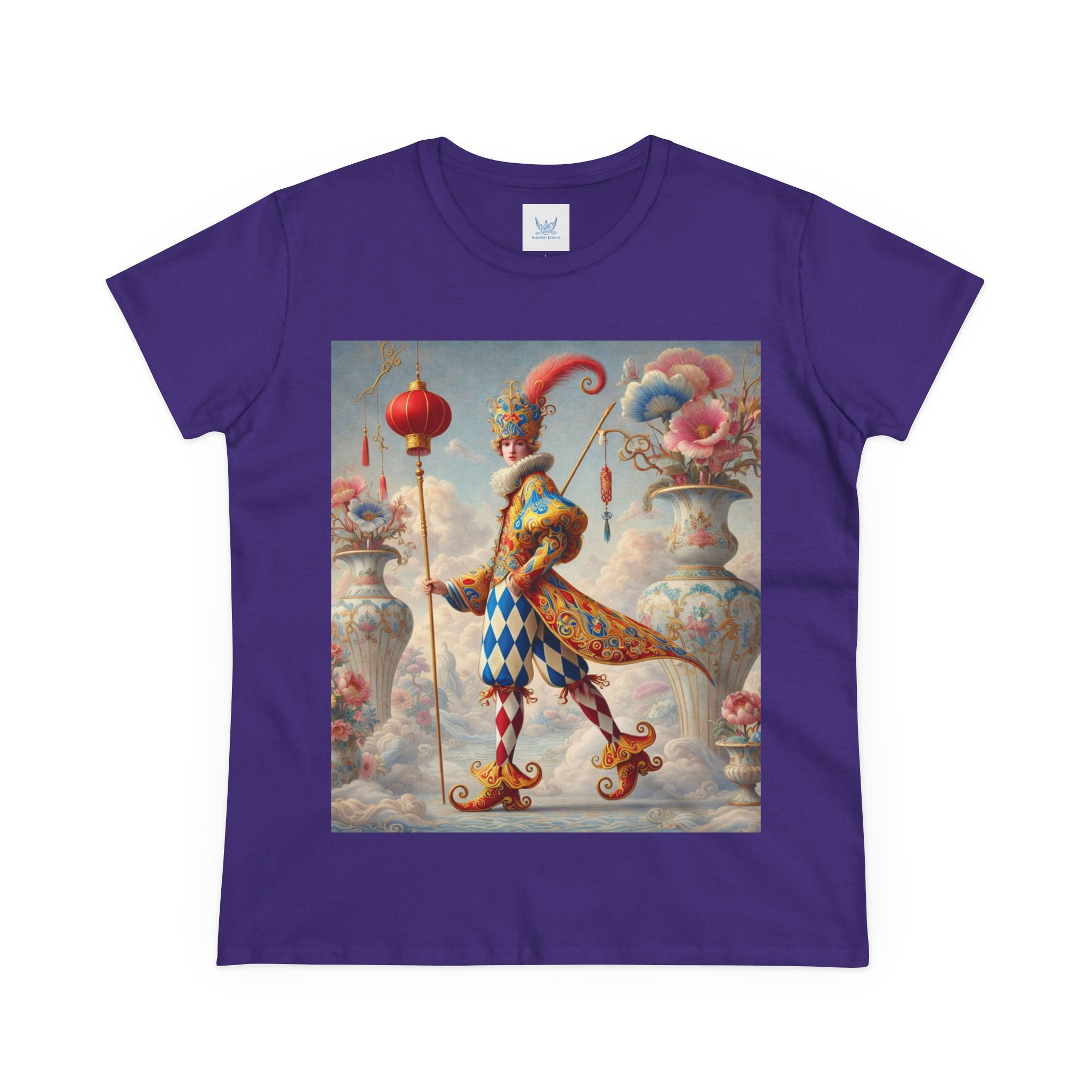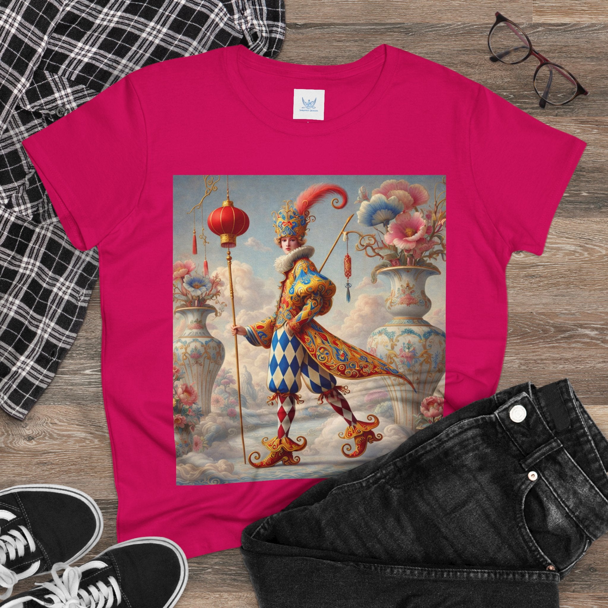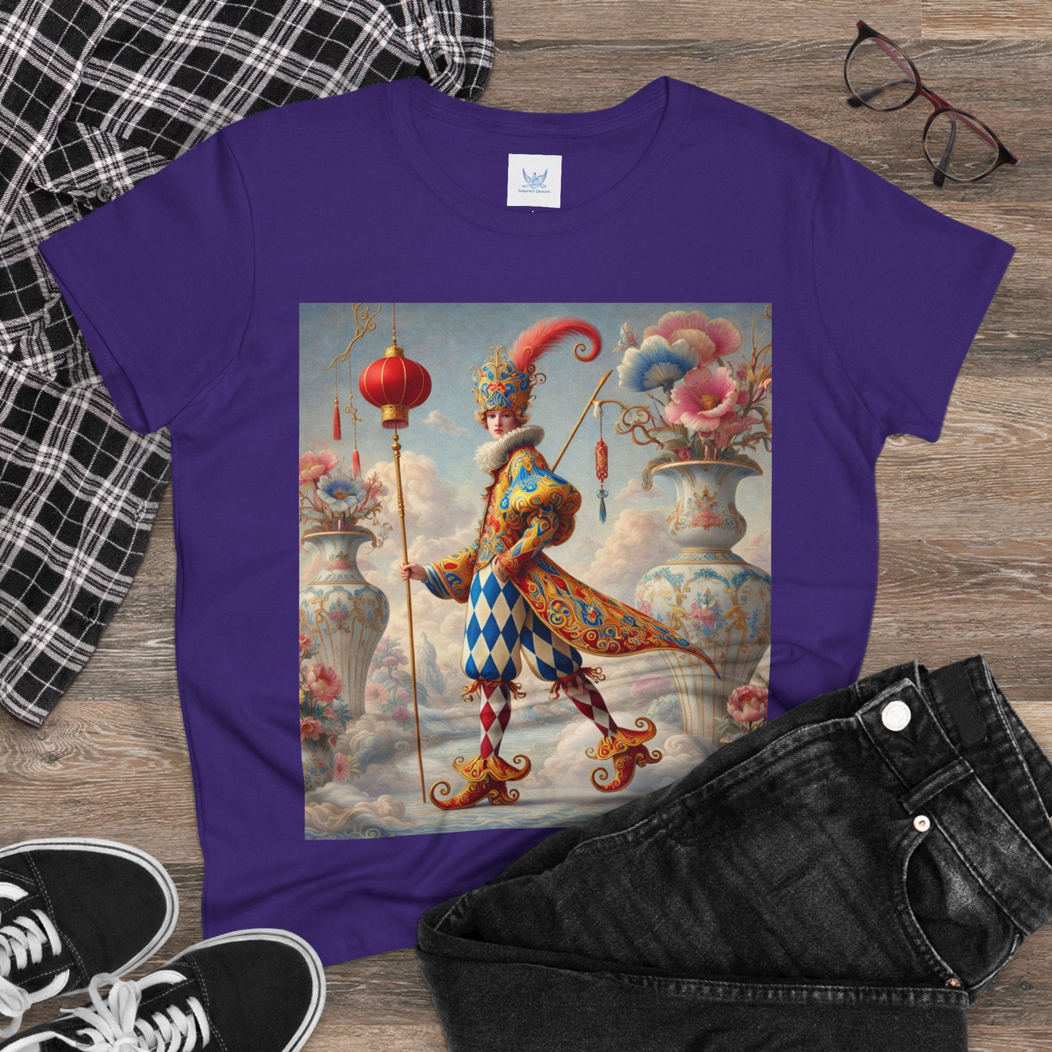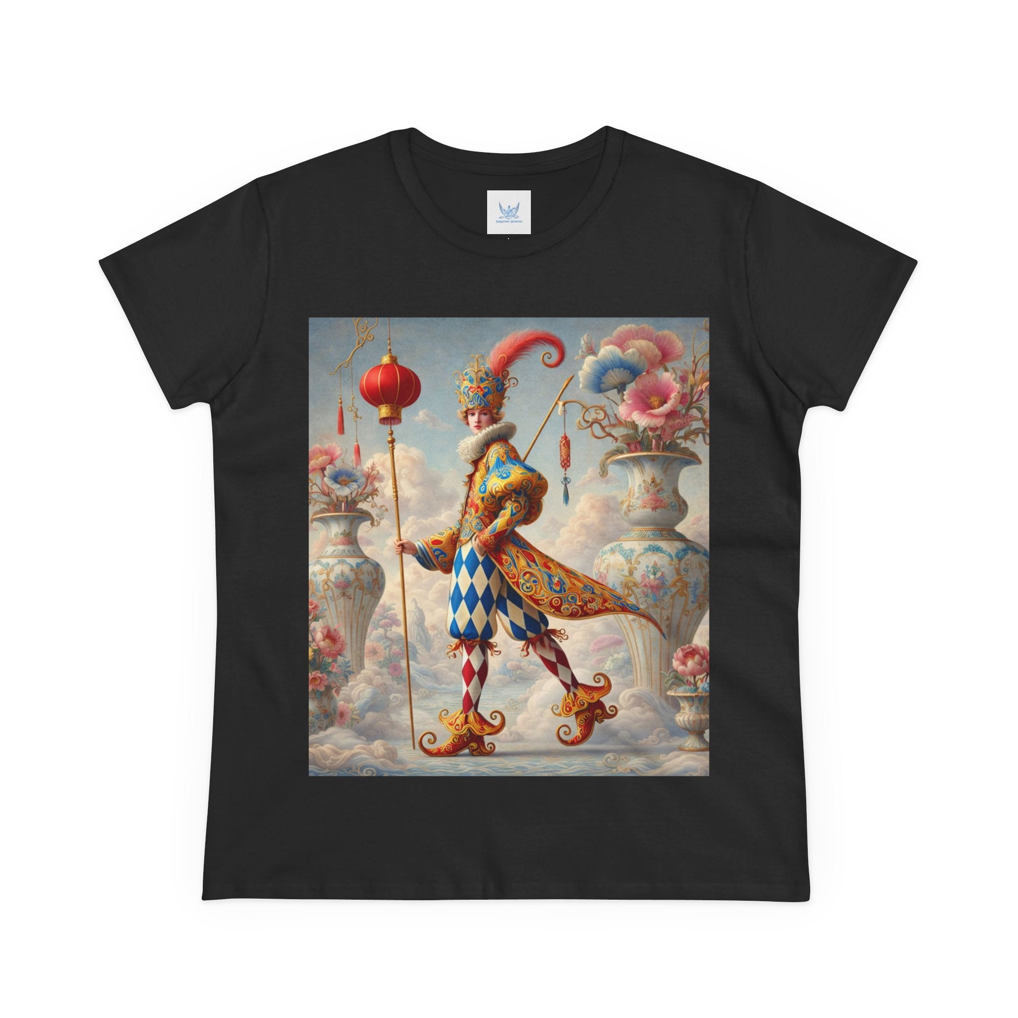 Printed on the shirt is The Ornamental Jester, a poised theatrical figure rendered in porcelain whites, soft blush, and muted pastels. Rather than playful comedy, the jester’s patterned costume, floral ornamentation, and sculptural silhouette suggest ritual, pageantry, and quiet performance. The balanced composition and restrained palette lend the tee a sense of refinement and symbolic calm, transforming it from a simple garment into a wearable art piece.