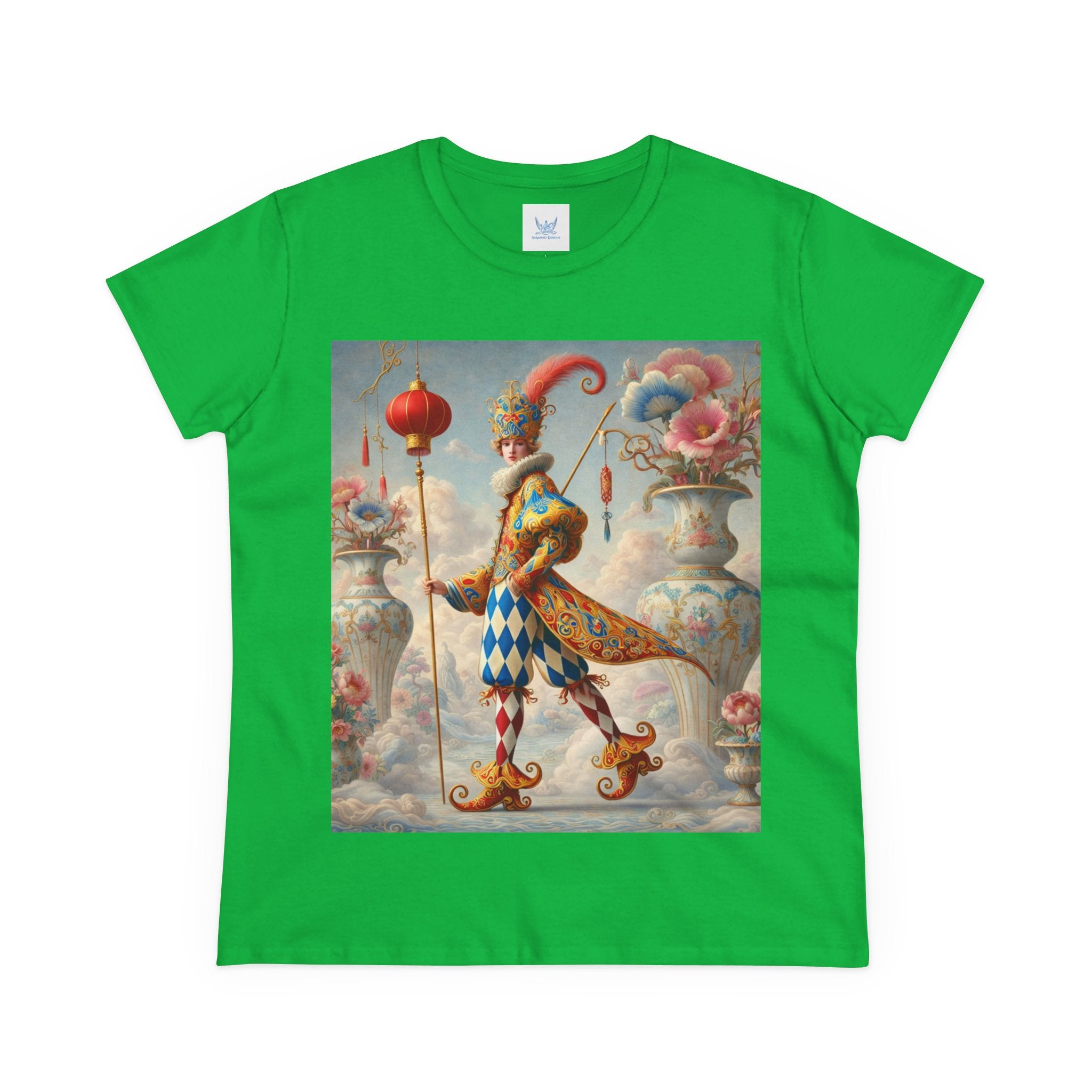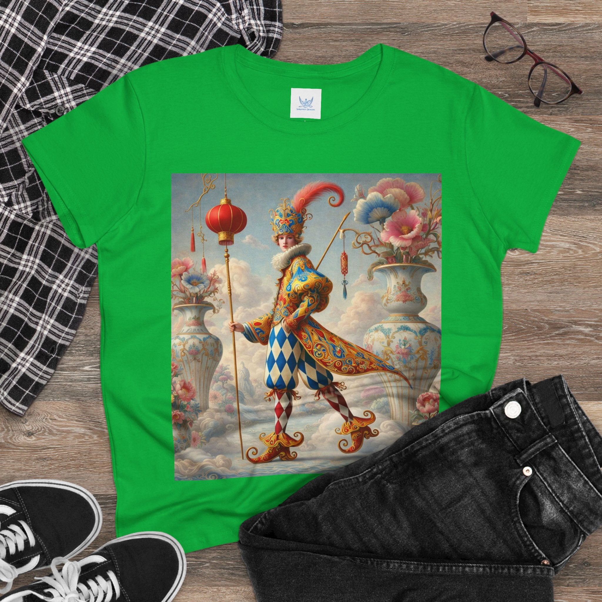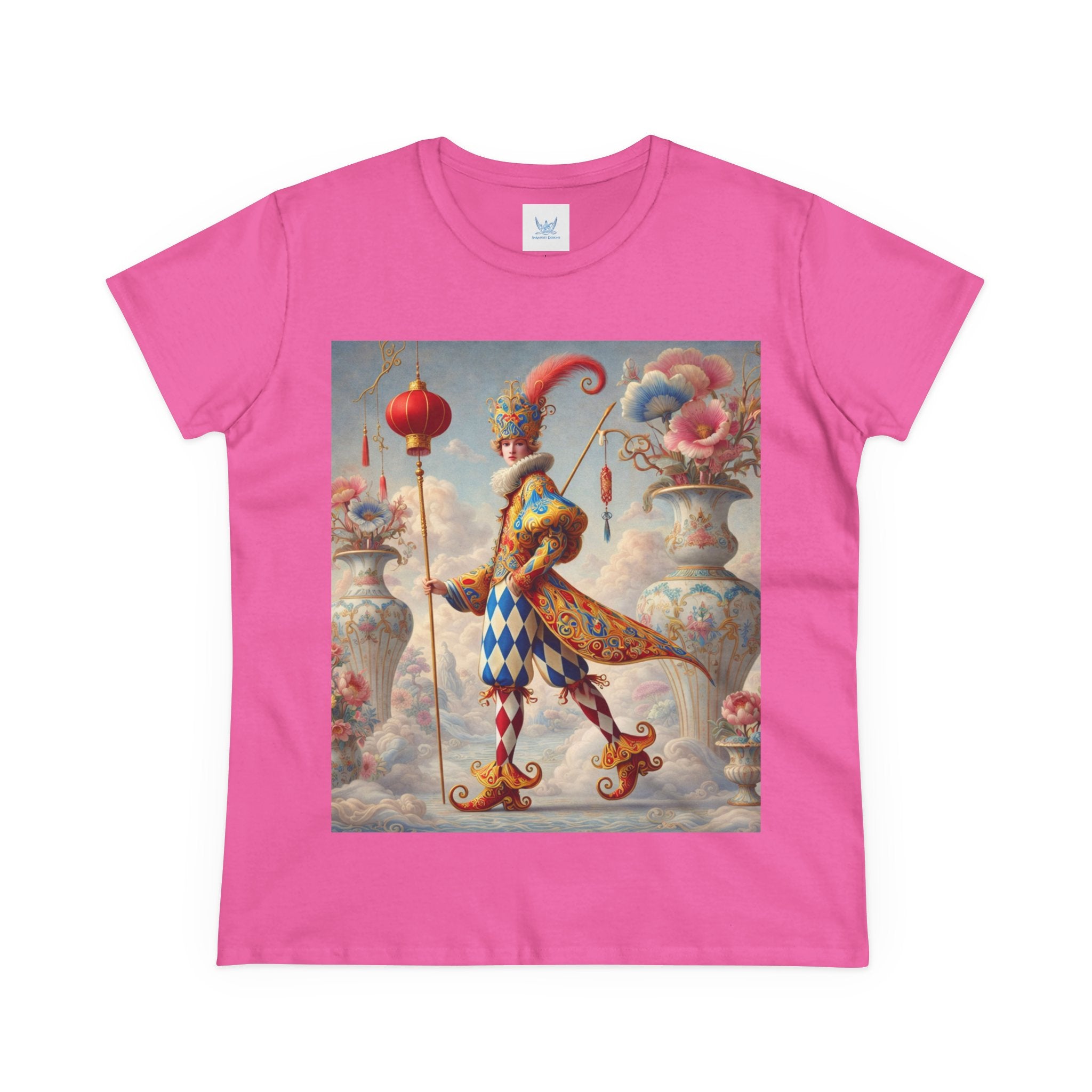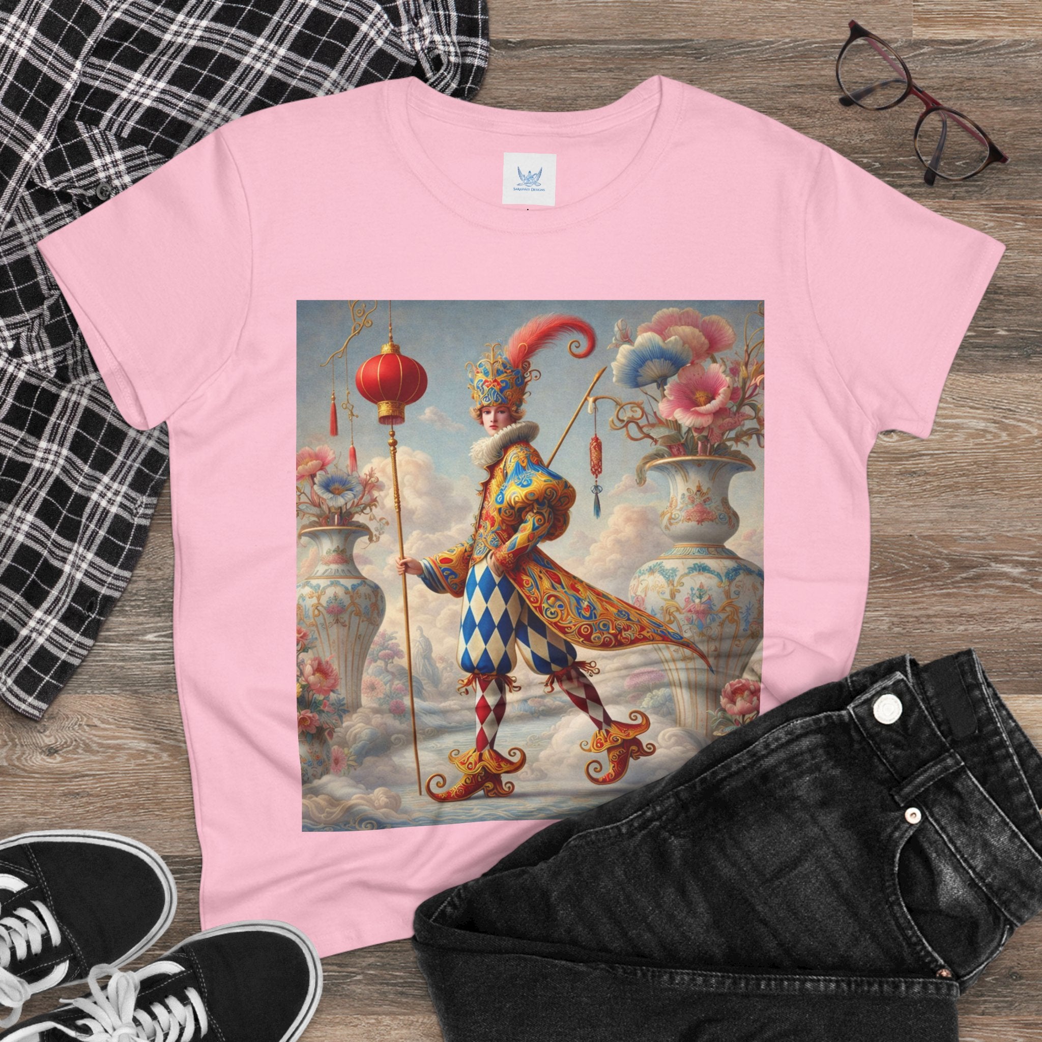 Printed on the shirt is The Ornamental Jester, a poised theatrical figure rendered in porcelain whites, soft blush, and muted pastels. Rather than playful comedy, the jester’s patterned costume, floral ornamentation, and sculptural silhouette suggest ritual, pageantry, and quiet performance. The balanced composition and restrained palette lend the tee a sense of refinement and symbolic calm, transforming it from a simple garment into a wearable art piece.