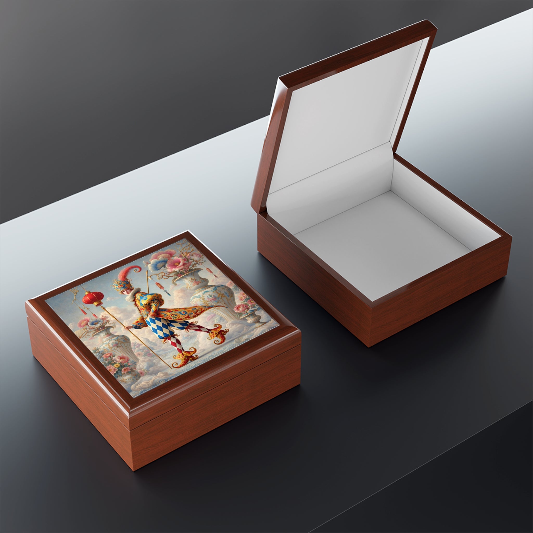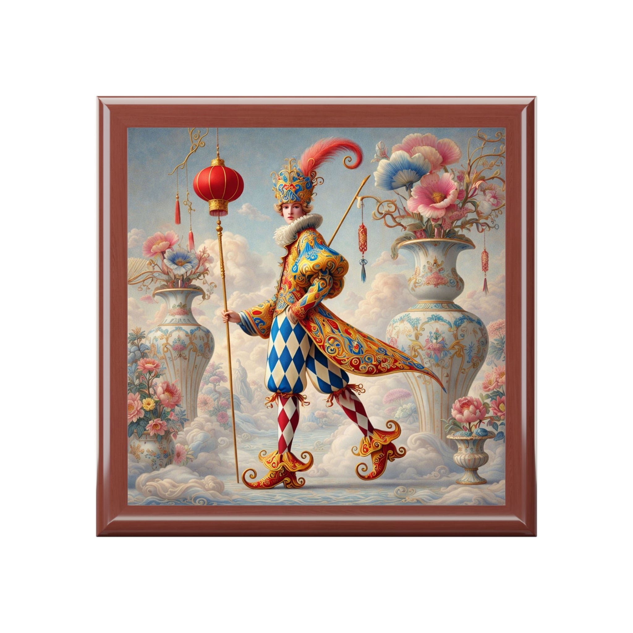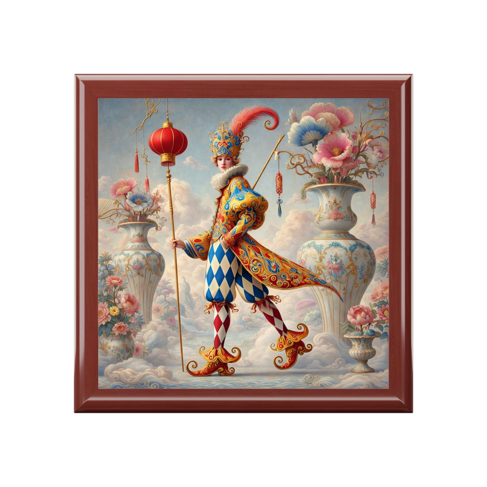 Set into the lid is a glossy ceramic tile featuring The Ornamental Jester, a poised, theatrical figure rendered in porcelain whites, soft blush, and muted pastels. Rather than playful comedy, the jester’s patterned costume, floral ornamentation, and balanced silhouette evoke ritual, pageantry, and ceremonial calm—transforming the box into a curated art object as much as a functional keepsake.