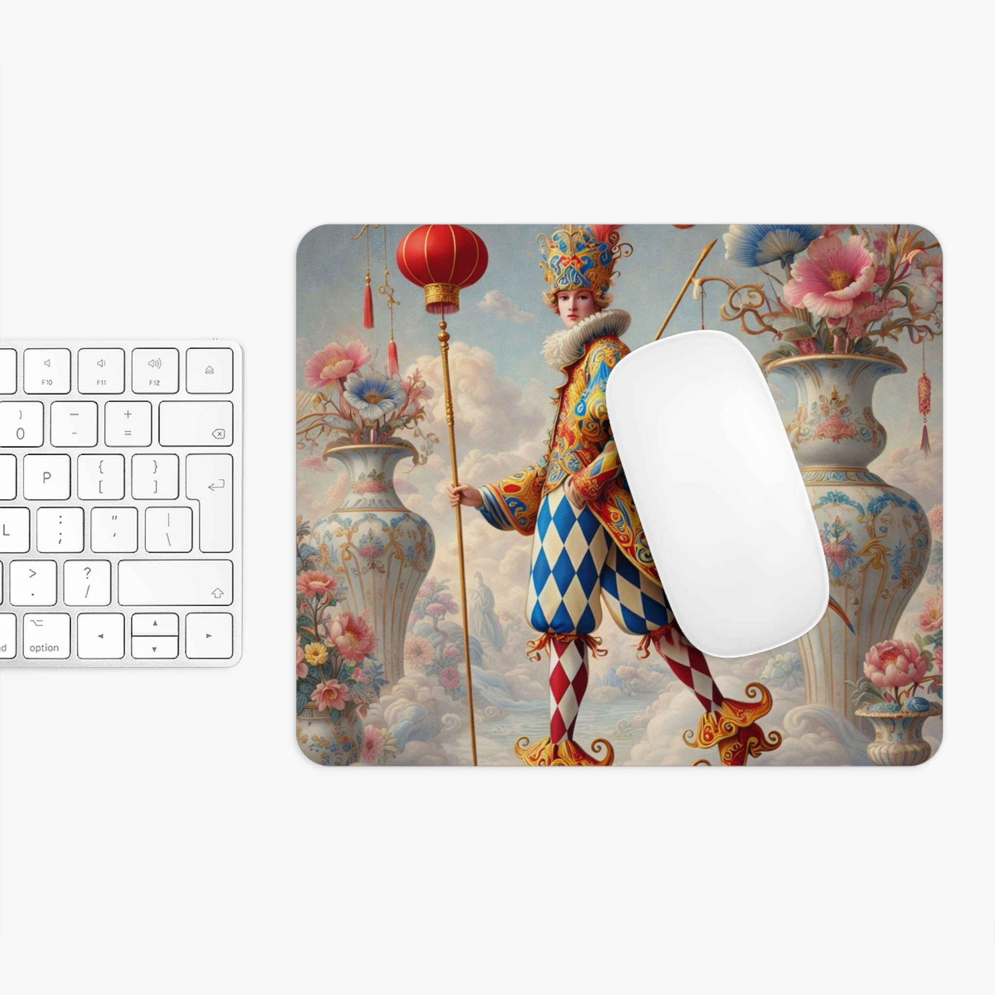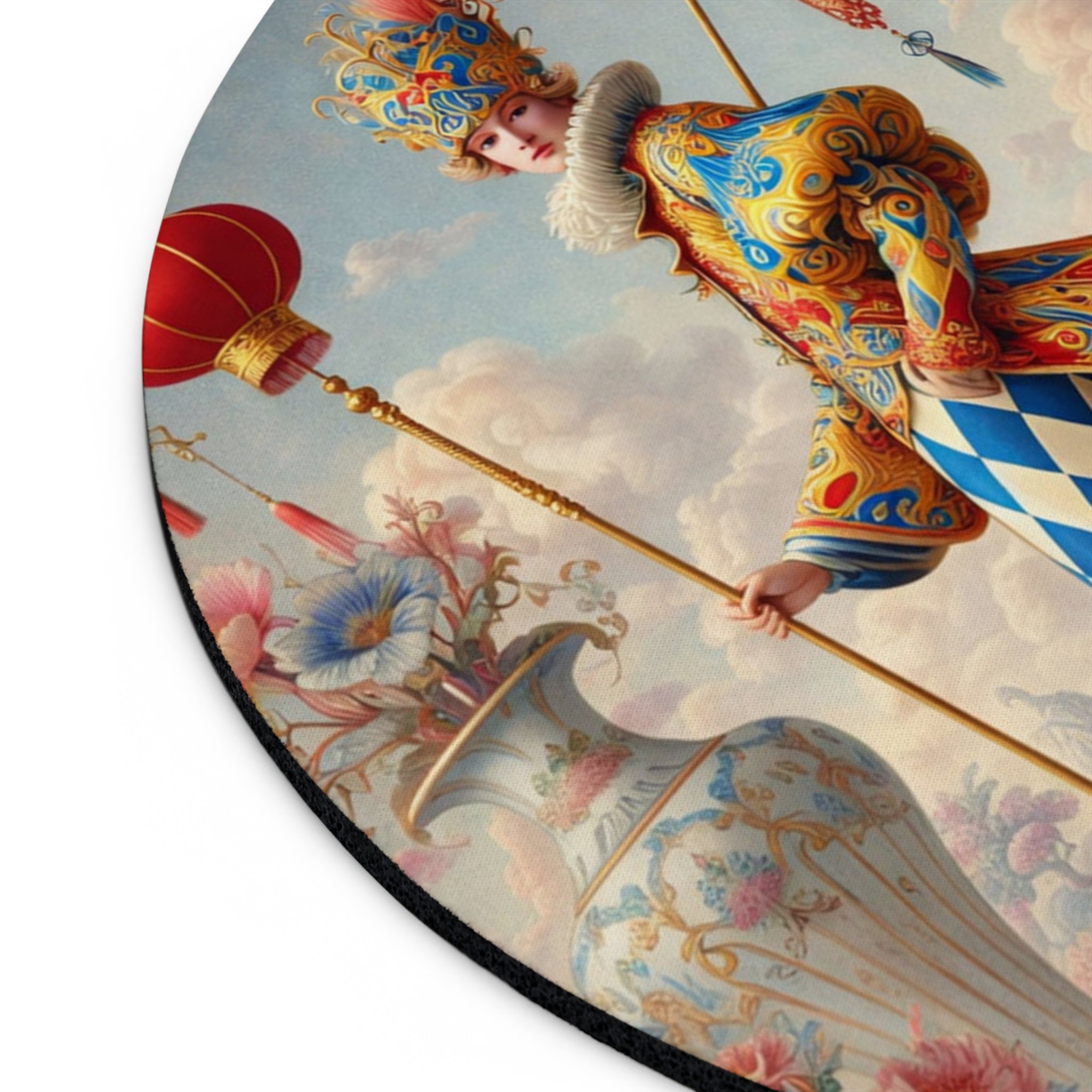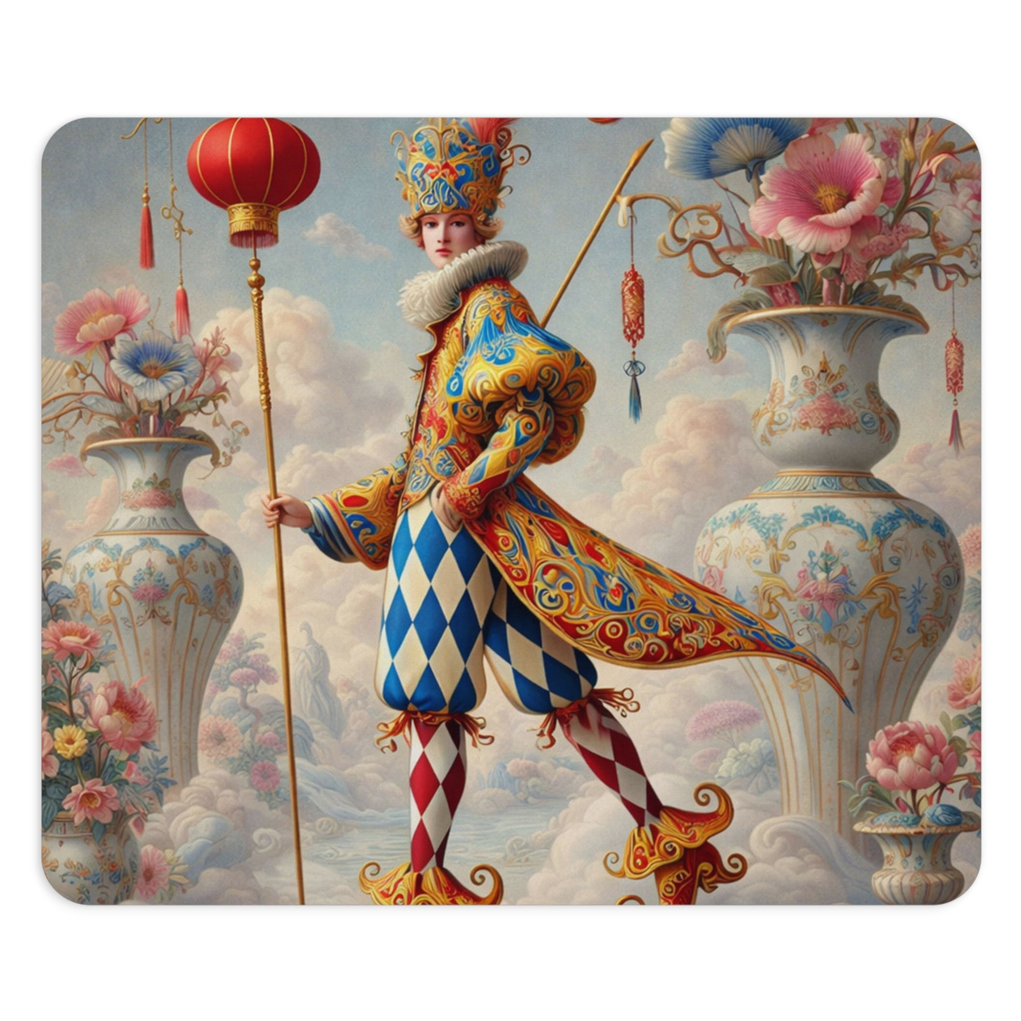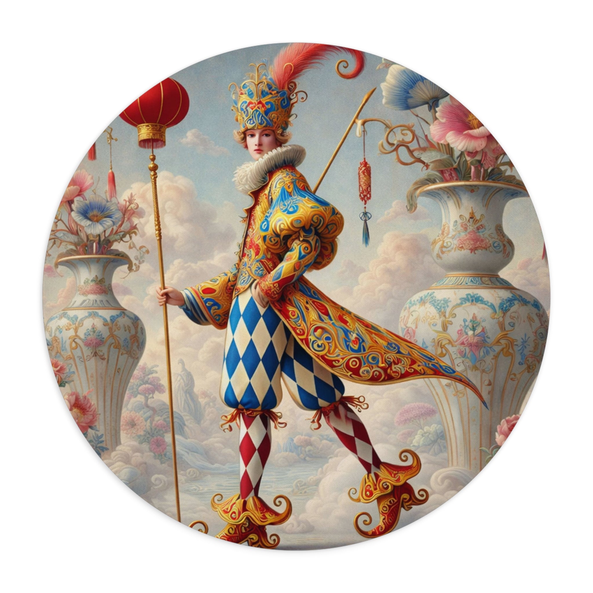 The artwork features a regal harlequin jester dressed in an exquisitely detailed costume of sapphire blues, warm reds, and ornate gold scrollwork. A feathered crown and soft ruff collar add old-world drama, while diamond-patterned leggings and curled, ornamental shoes complete the classic jester silhouette. Set in a surreal pastel sky world framed by towering porcelain vases overflowing with blossoms, the scene is accented by a lantern-topped staff and delicate hanging details that create a ceremonial, storybook atmosphere—whimsy with unmistakable luxury.