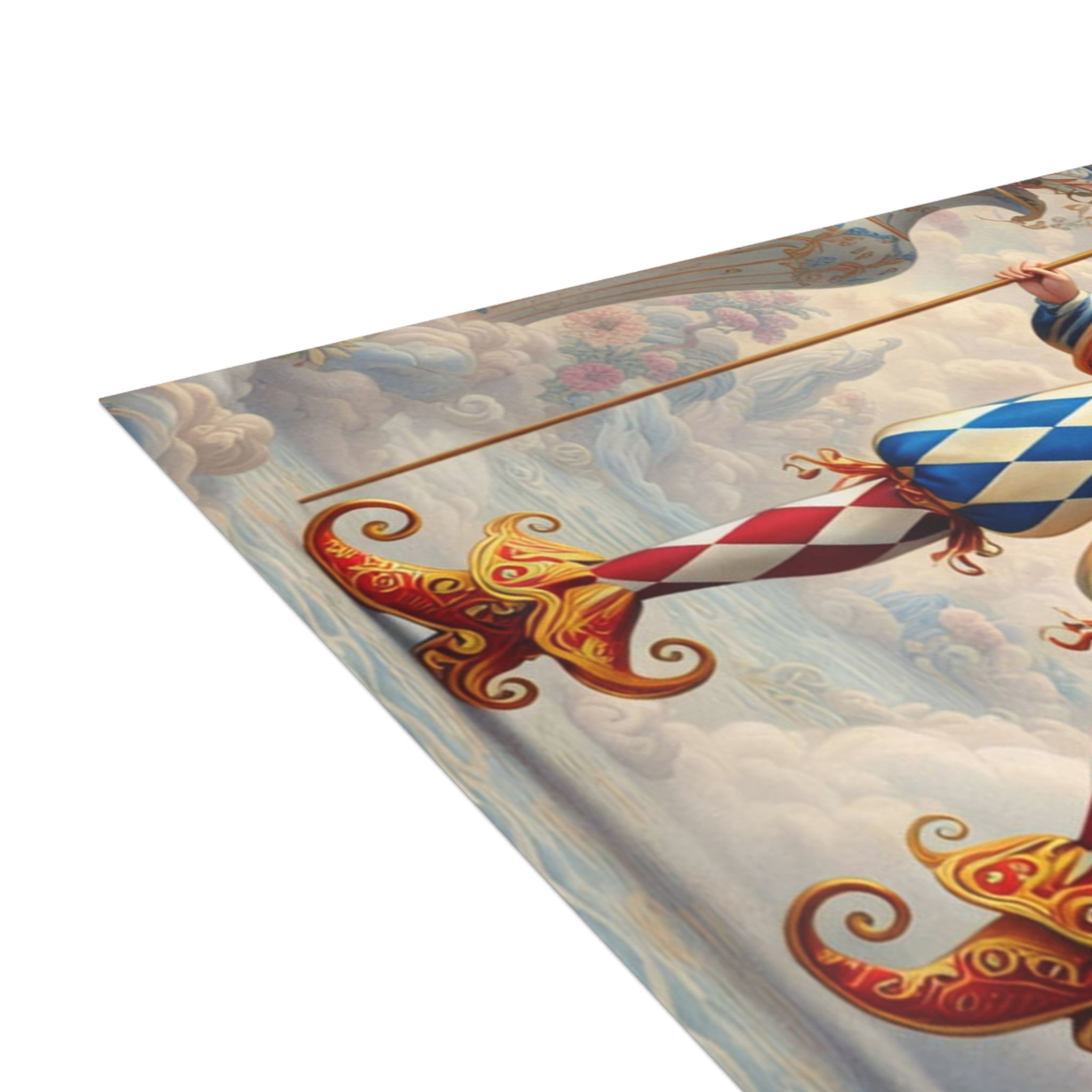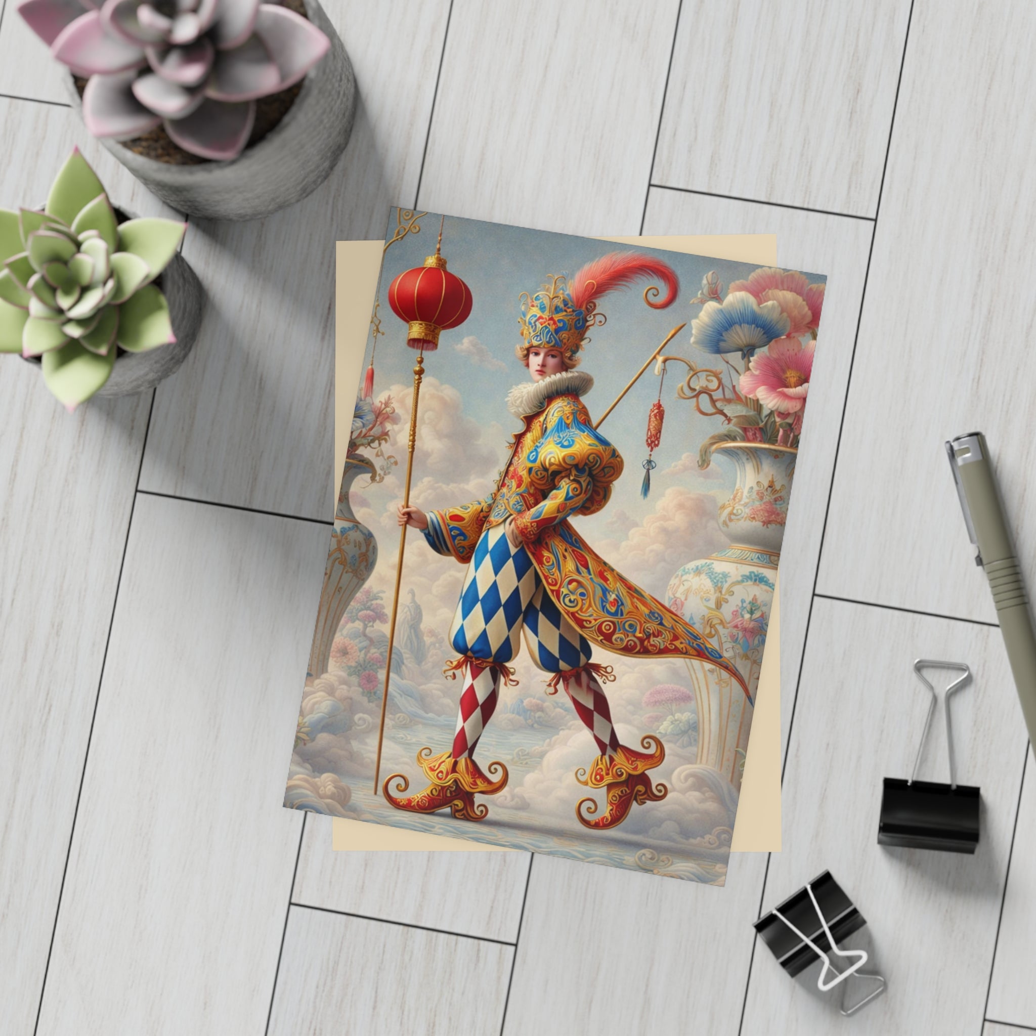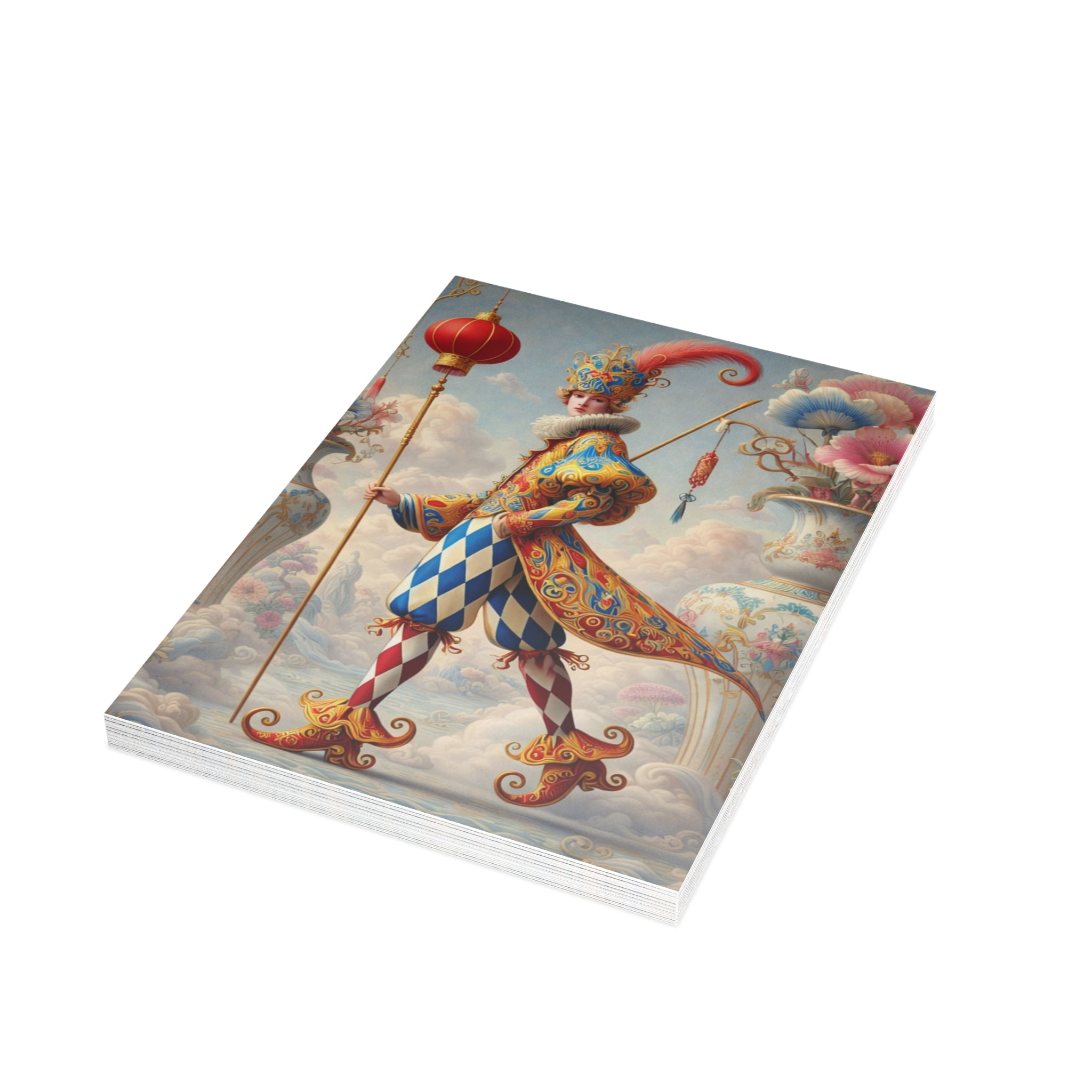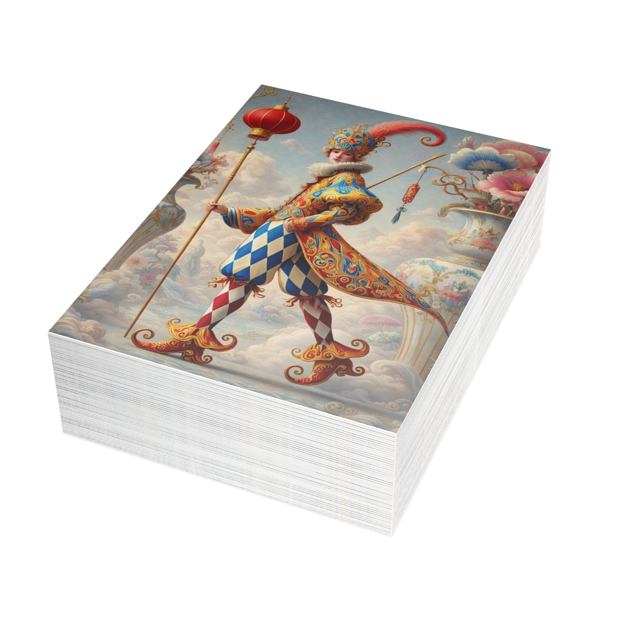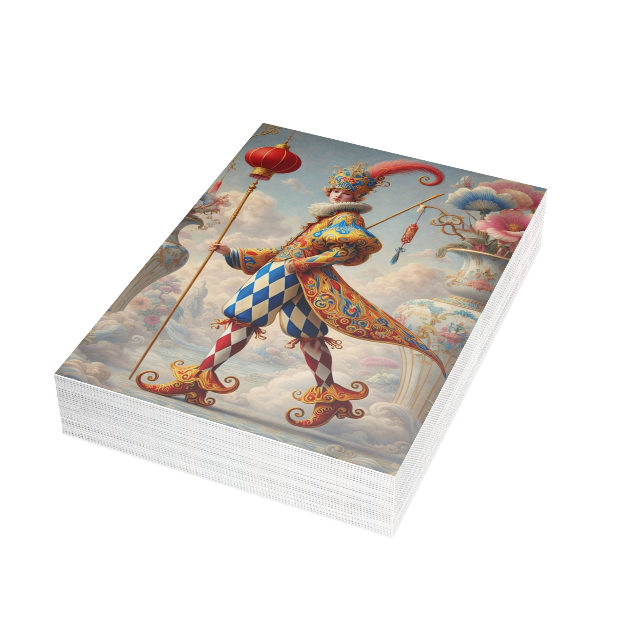 Each card features The Ornamental Jester, a poised theatrical figure rendered in porcelain whites, soft blush, and muted pastels. Patterned costume, floral accents, and sculptural balance replace humor with ritual, elegance, and quiet performance, giving the artwork a sense of curated beauty and ceremonial calm. Whether sent by post or kept as art cards, these postcards bring a refined, artful presence to everyday moments.