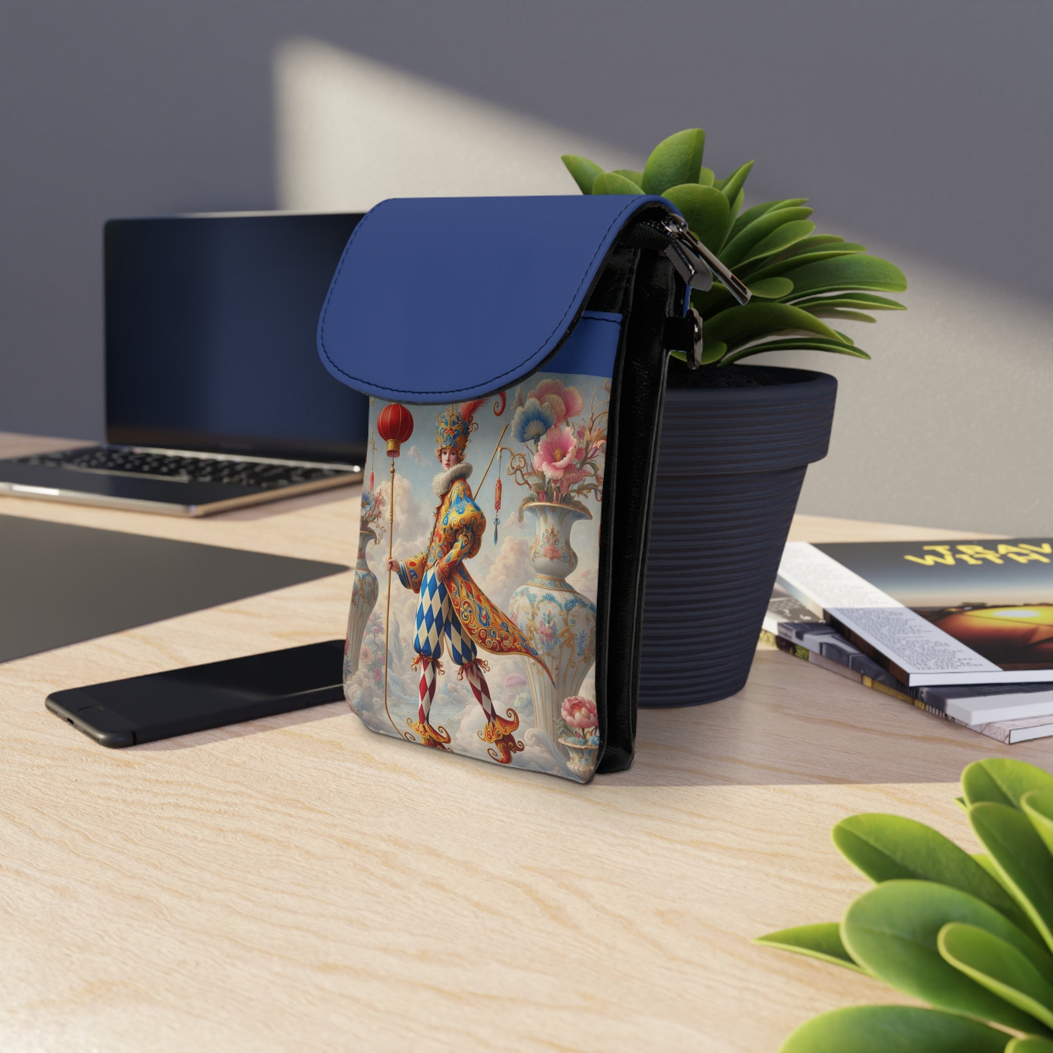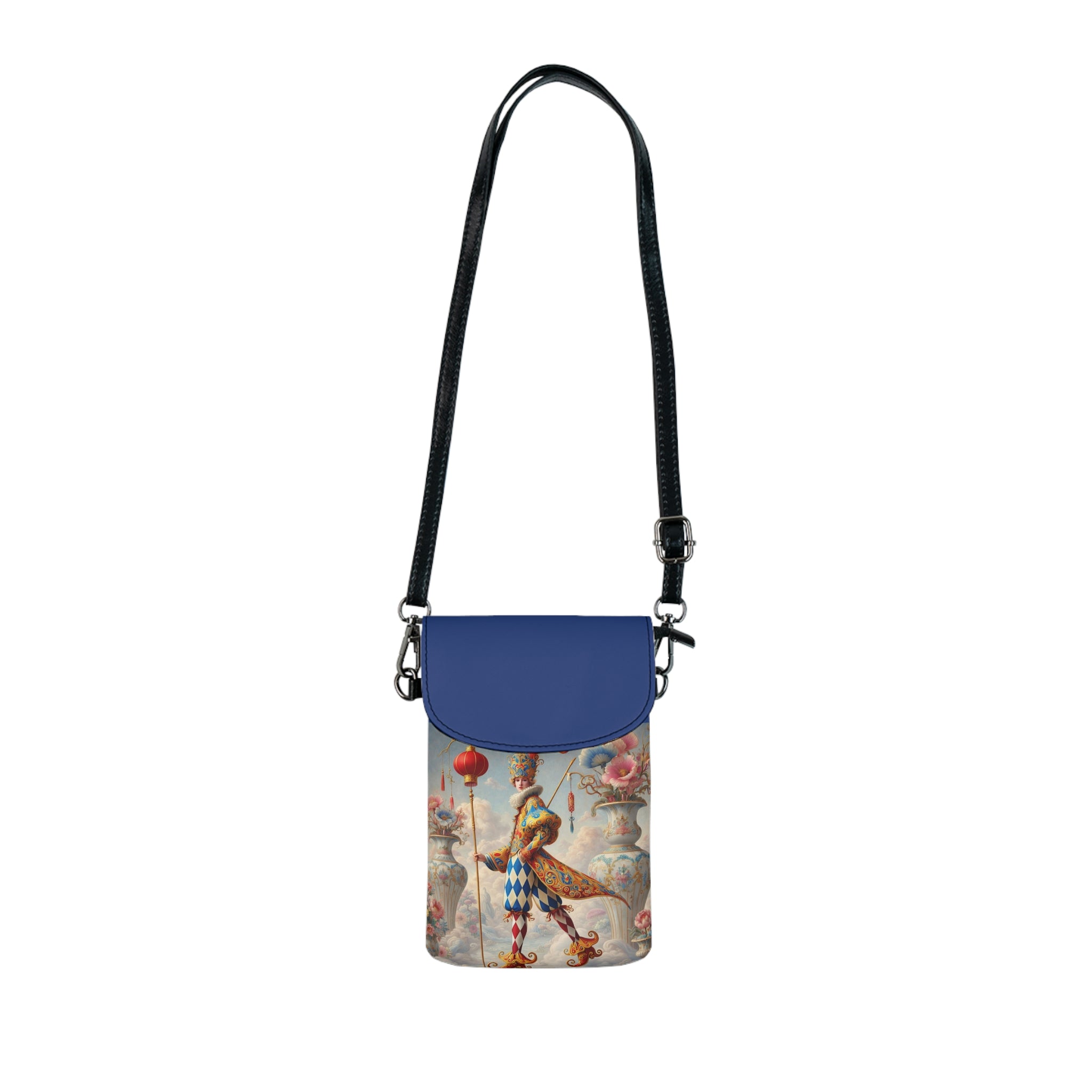 The Ornamental Jester Small Cell Phone Wallet combines compact, everyday convenience with refined decorative art, making it an elegant companion for errands, travel, or hands-free outings. Designed to be lightweight yet functional, this phone wallet features a sleek silhouette with an adjustable faux leather strap that allows it to be worn comfortably across the body or over the shoulder. Thoughtful interior compartments keep your phone and essentials organized while adding a polished, artful accent to daily wear.