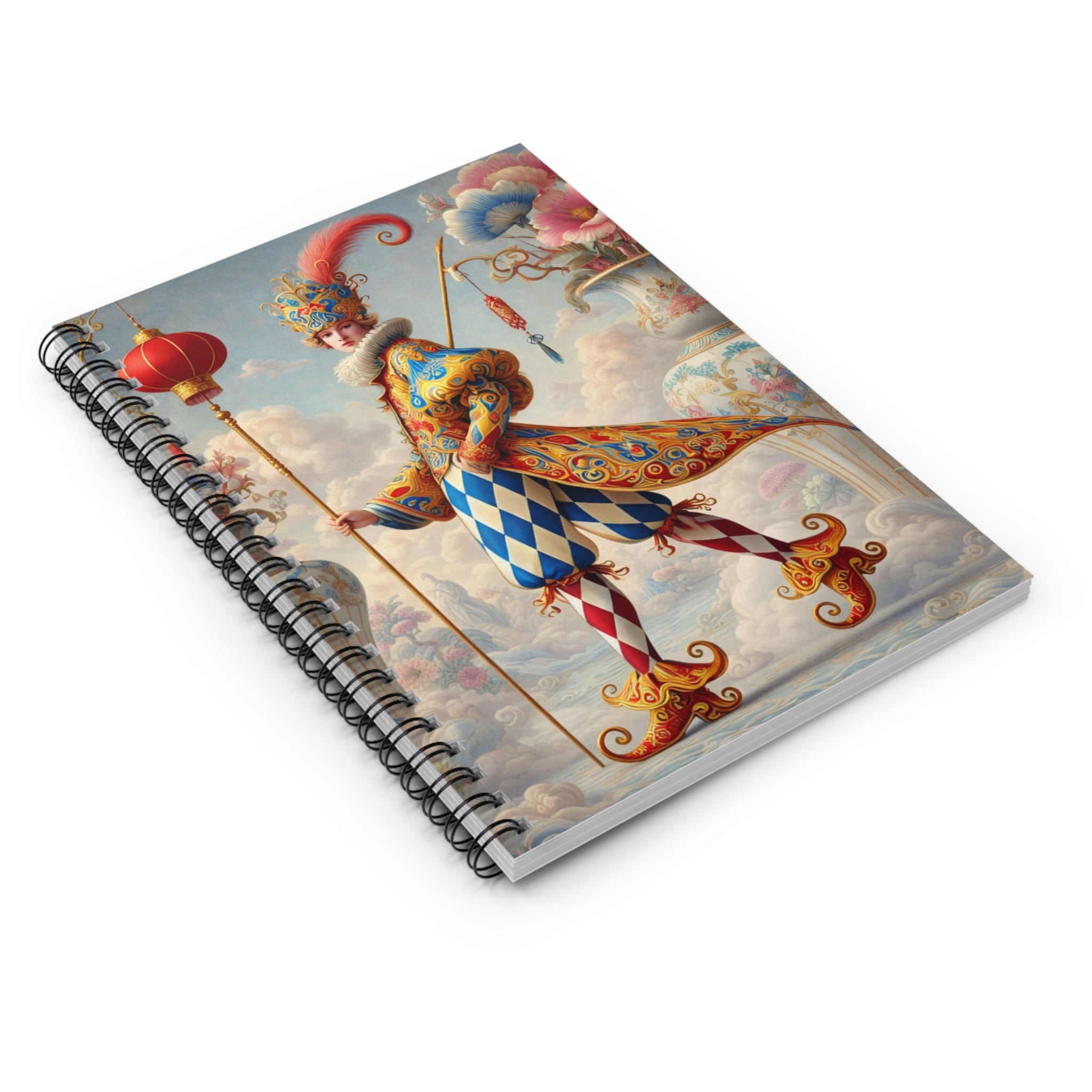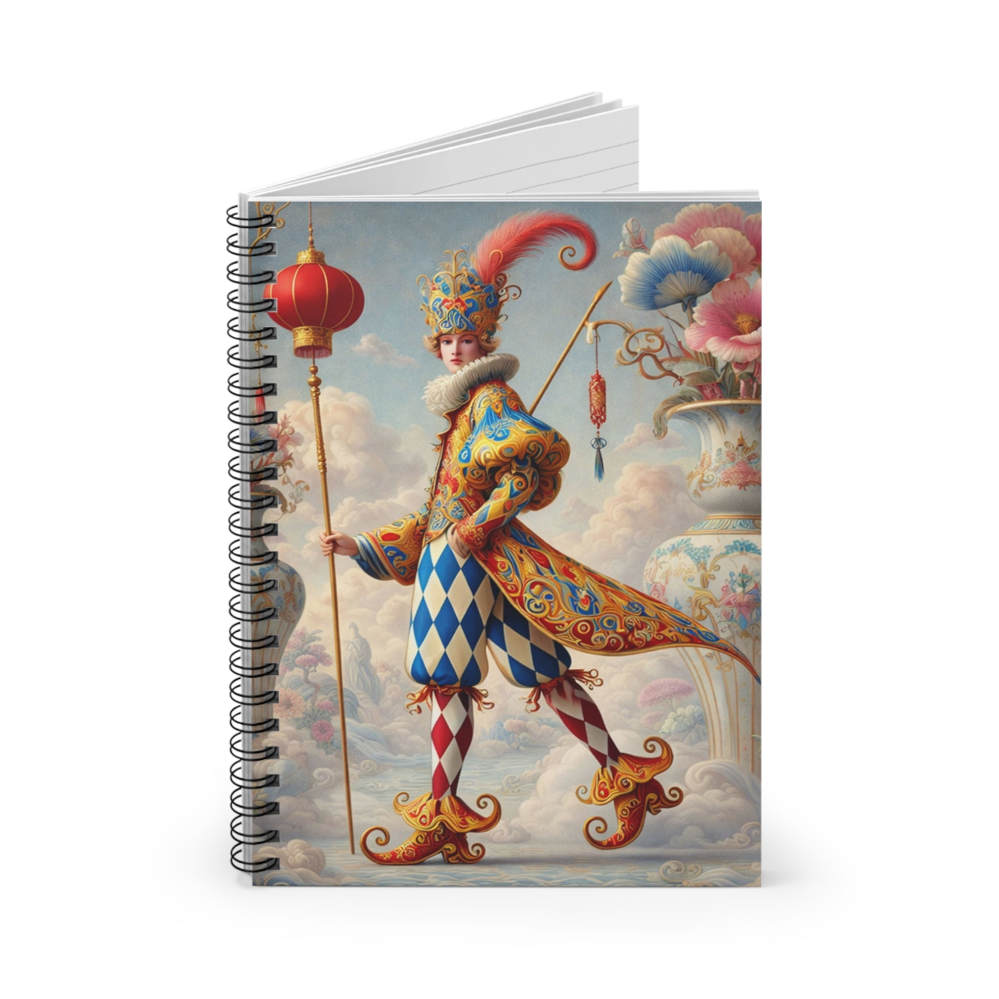 The Ornamental Jester Spiral Notebook – Ruled Line is designed to be both a practical everyday companion and a refined visual statement, perfect for shopping lists, notes, journaling, or creative writing. With 118 ruled pages and a durable printed cover, it’s made to travel easily while adding an artistic presence to desks, bags, and workspaces. The cover artwork features The Ornamental Jester, a poised, theatrical figure rendered in porcelain whites, soft blush, and muted pastels, where patterned costume and sculptural form suggest ritual, pageantry, and quiet performance rather than comedy. Floral accents and ornamental details soften the composition, giving the notebook a sense of balance, elegance, and curated calm that elevates even everyday writing.