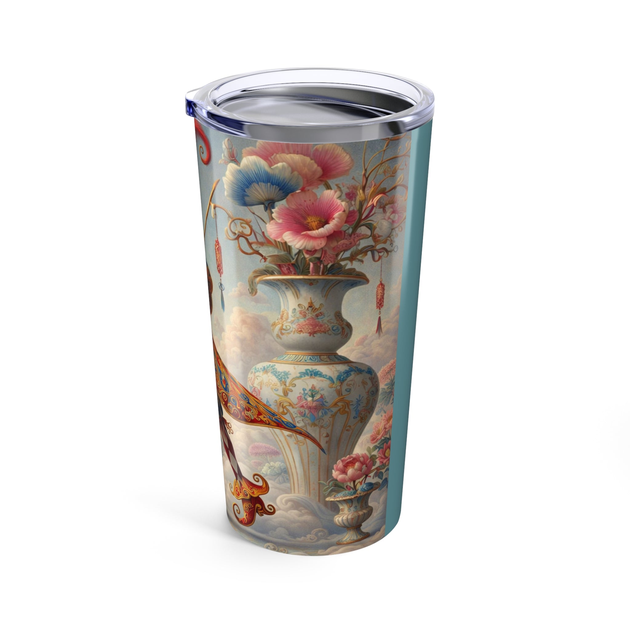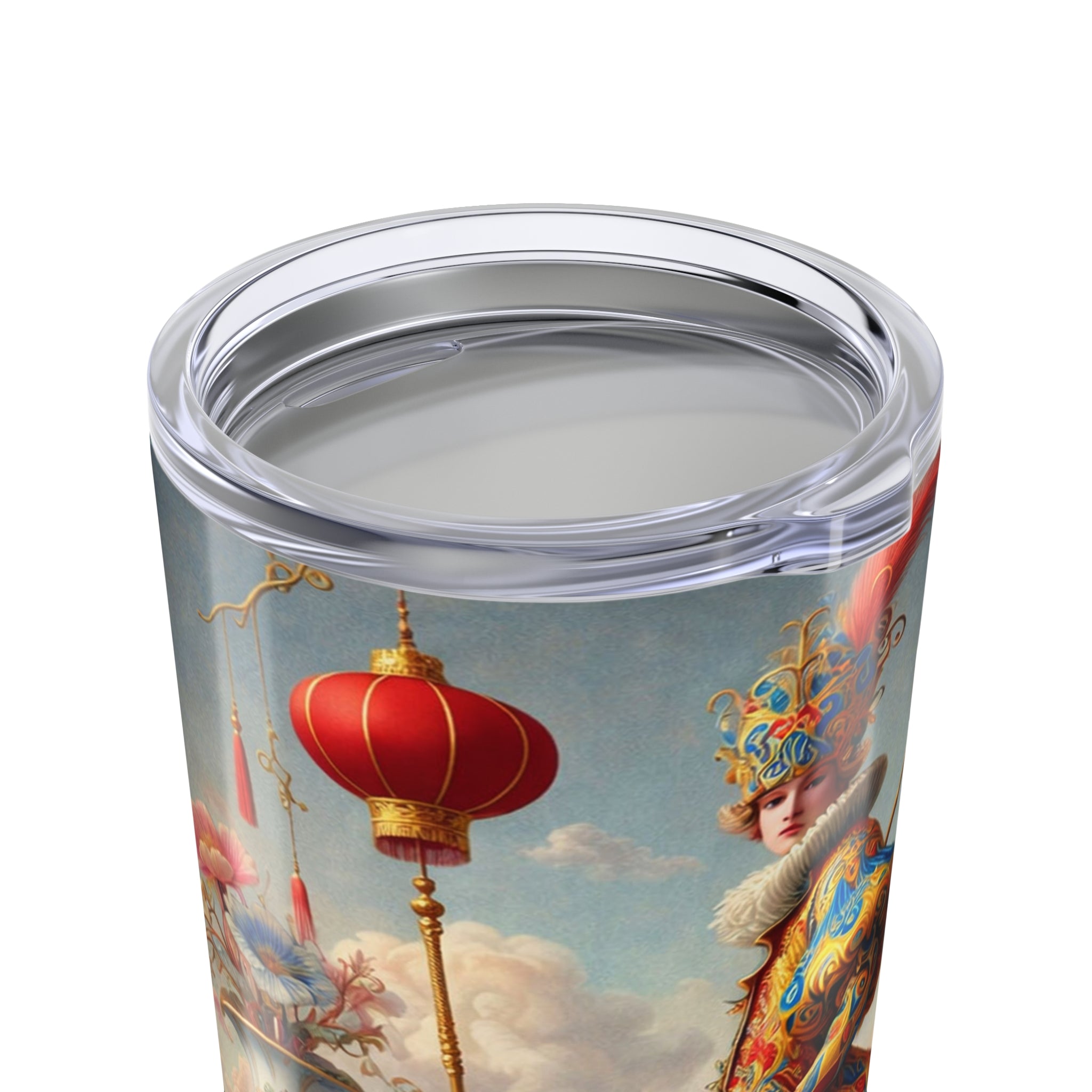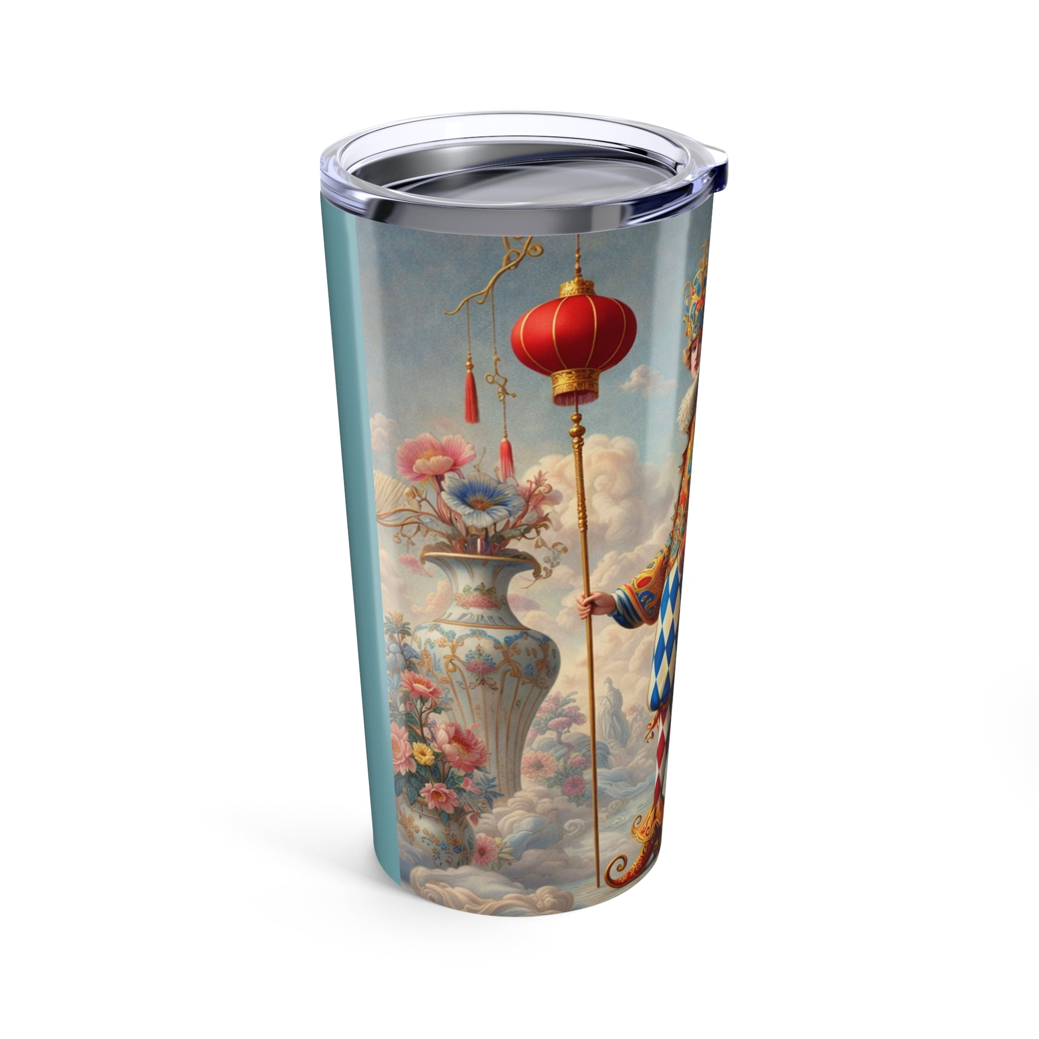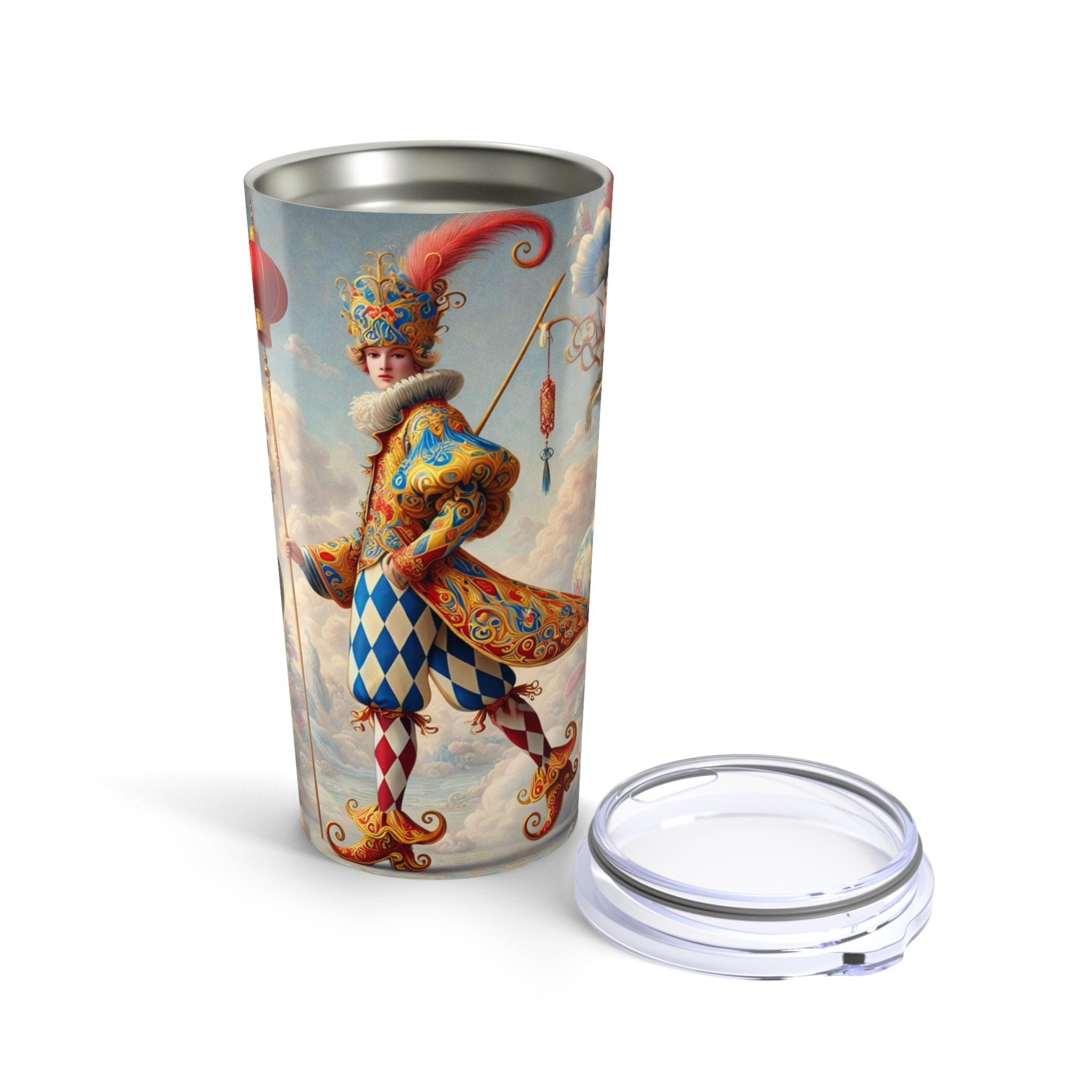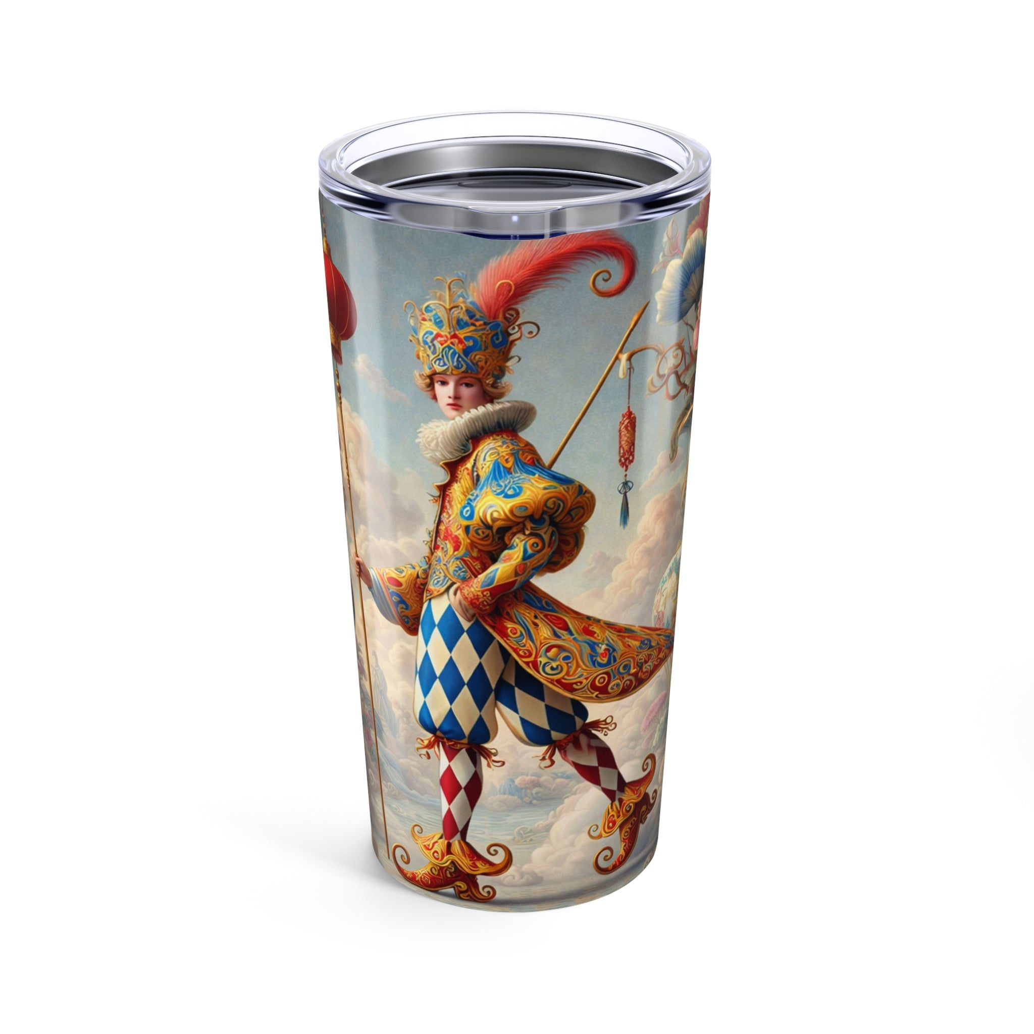 The Ornamental Jester Tumbler – 20oz blends everyday function with refined decorative art, making it an elegant companion for coffee, tea, or cold drinks on the go. Designed with double-wall insulation, this tumbler keeps beverages hot or cold while its durable stainless steel body stands up to daily use with ease. Wrapped in a glossy finish, the surface showcases The Ornamental Jester—a poised, theatrical figure rendered in porcelain whites, soft blush, and muted pastels. Rather than playful comedy, the jester’s sculptural costume, floral accents, and balanced composition evoke ritual, pageantry, and quiet performance, transforming a practical tumbler into a portable art object that feels curated and intentional.