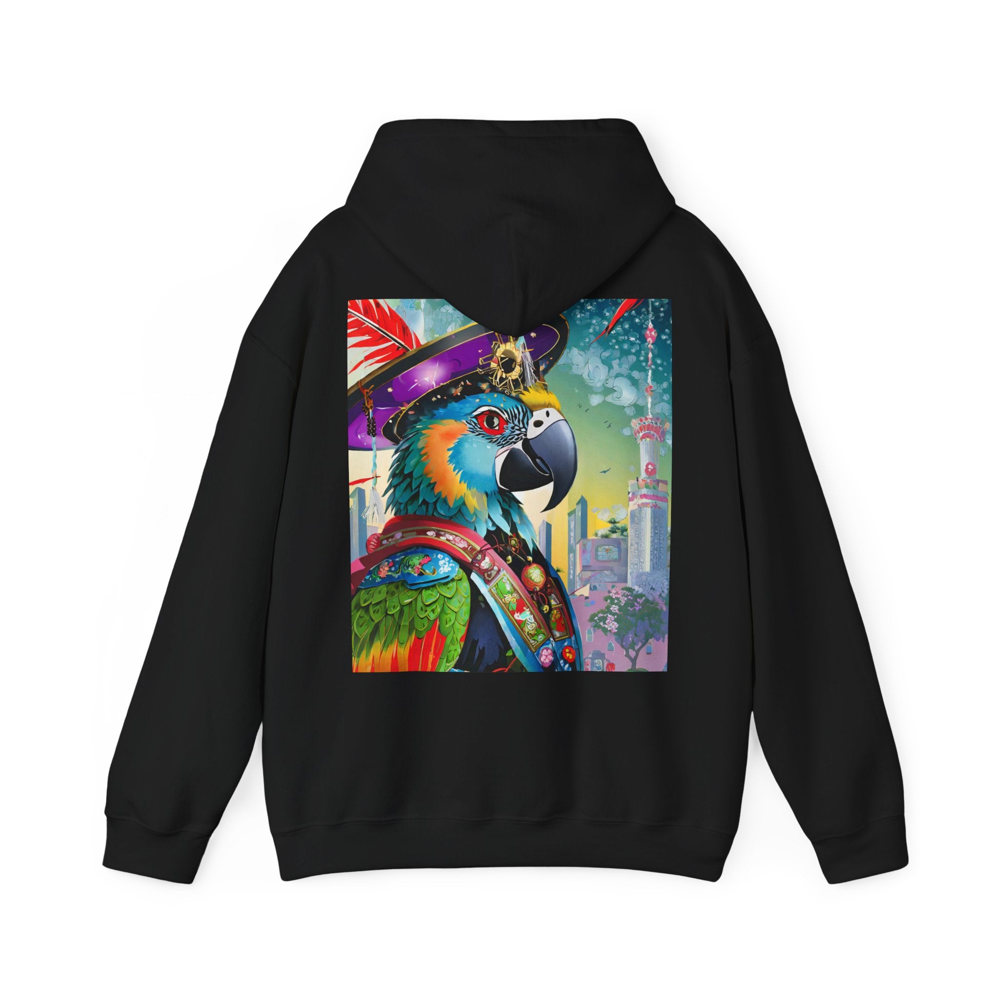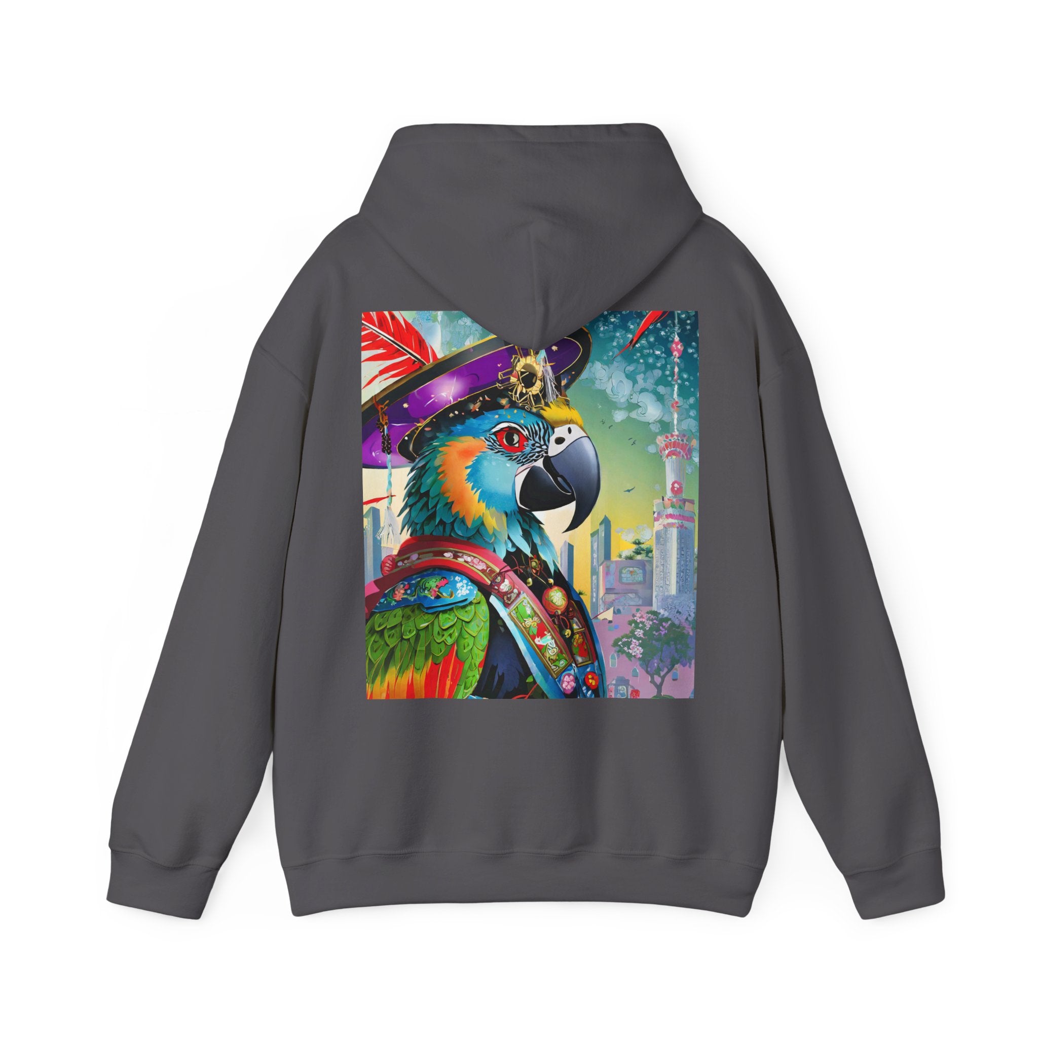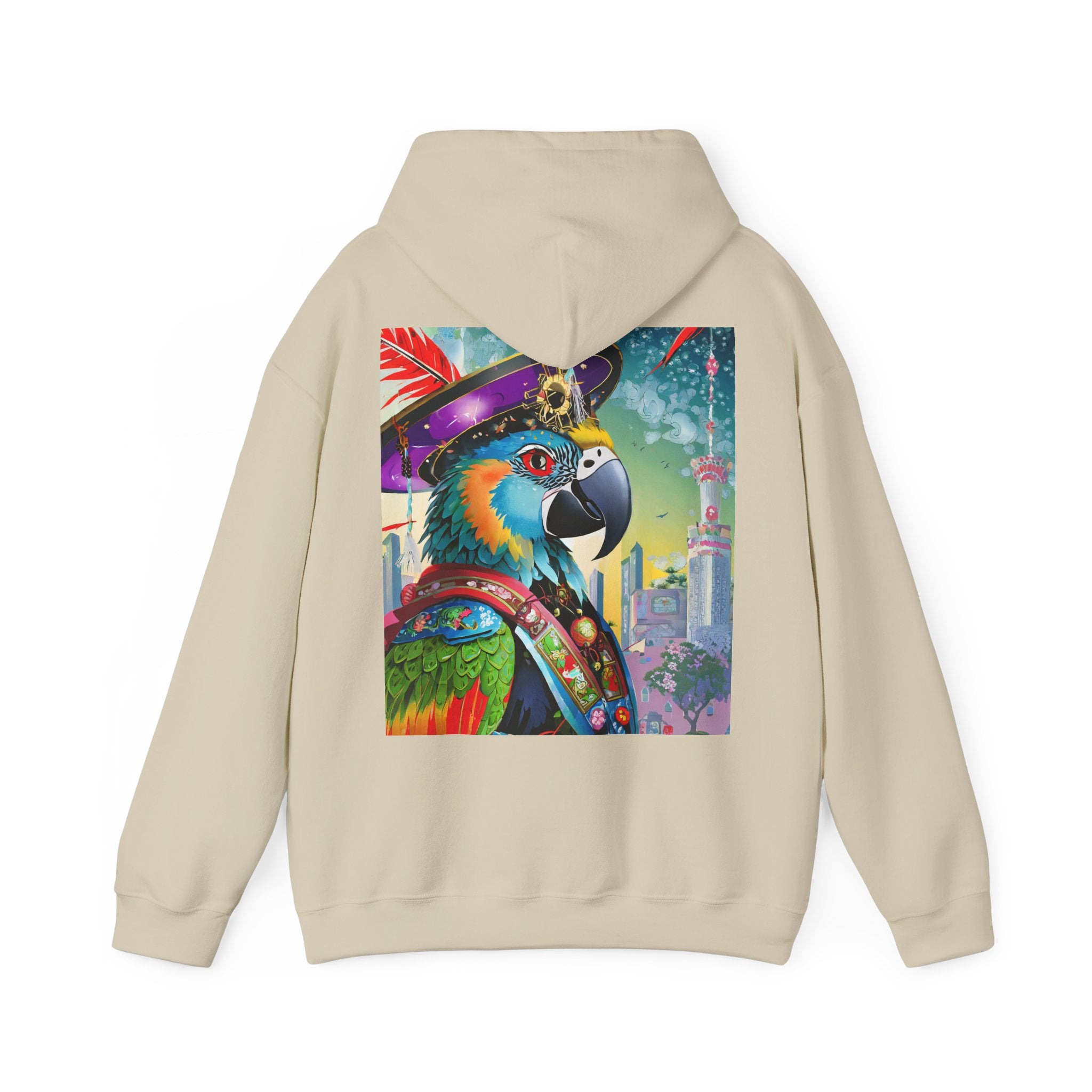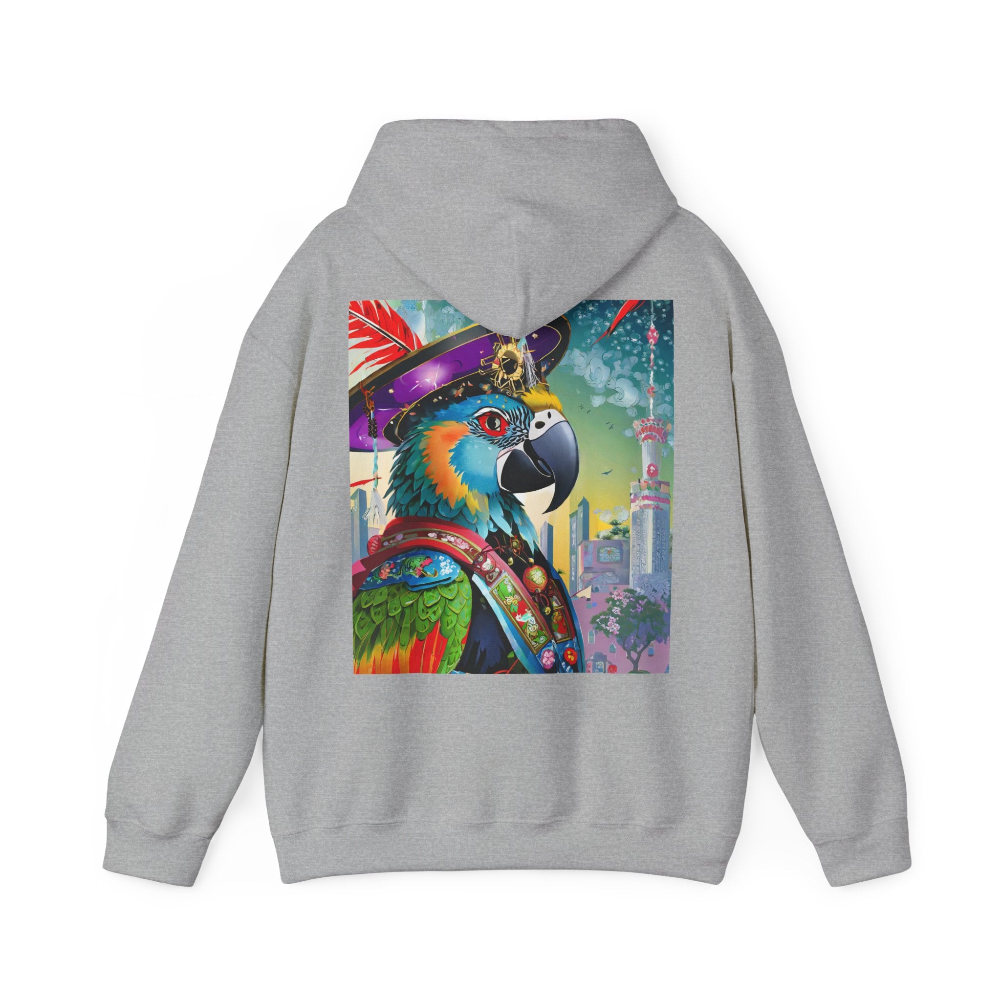 The background city radiates pink, turquoise, and gold tones beneath a luminous sky, blending high fashion with modern fantasy. The Parrot Aristocrat celebrates creativity, individuality, and bold sophistication — a fusion of nature, art, and style.