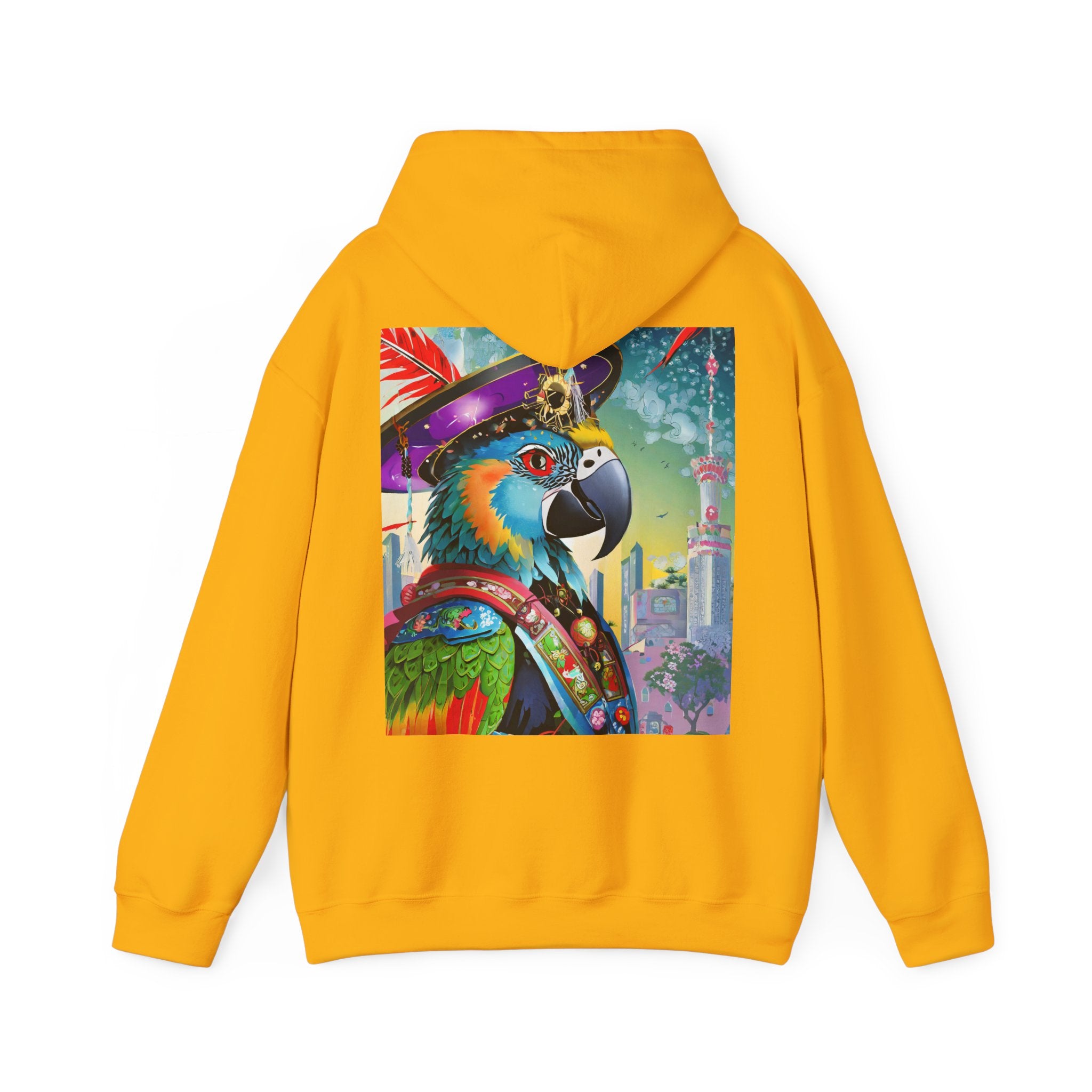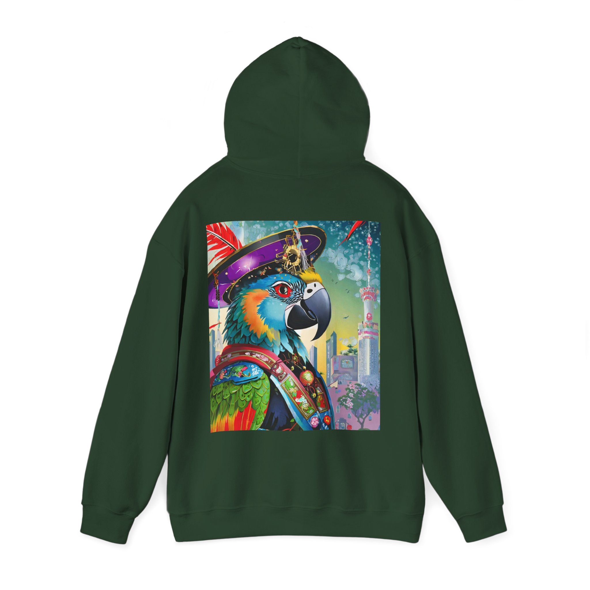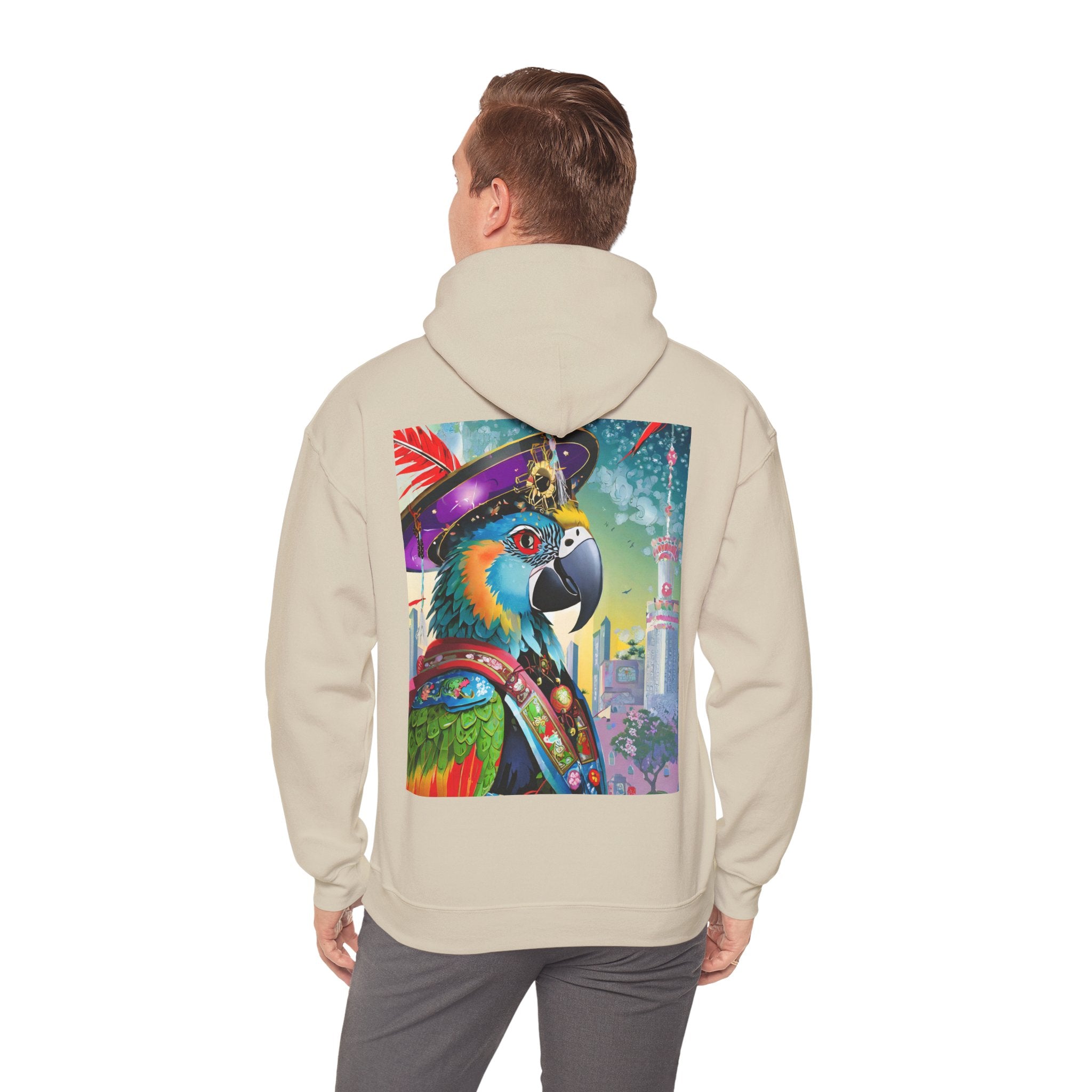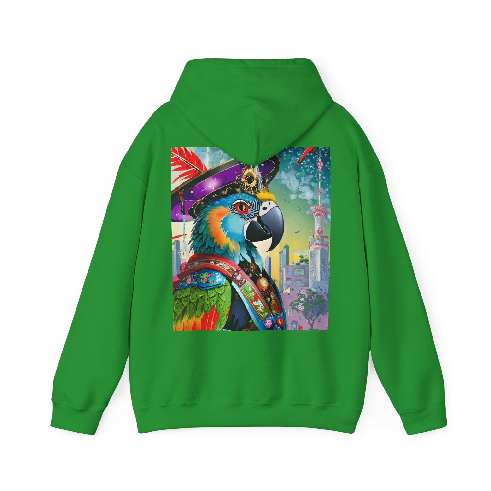 The background city radiates pink, turquoise, and gold tones beneath a luminous sky, blending high fashion with modern fantasy. The Parrot Aristocrat celebrates creativity, individuality, and bold sophistication — a fusion of nature, art, and style.