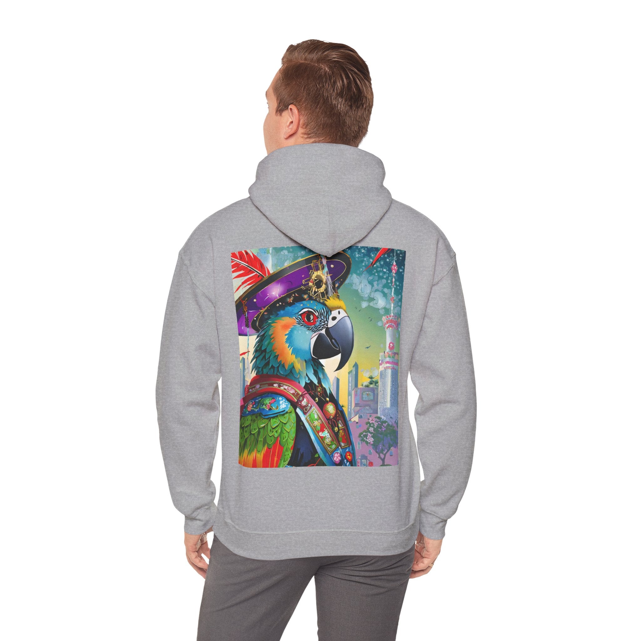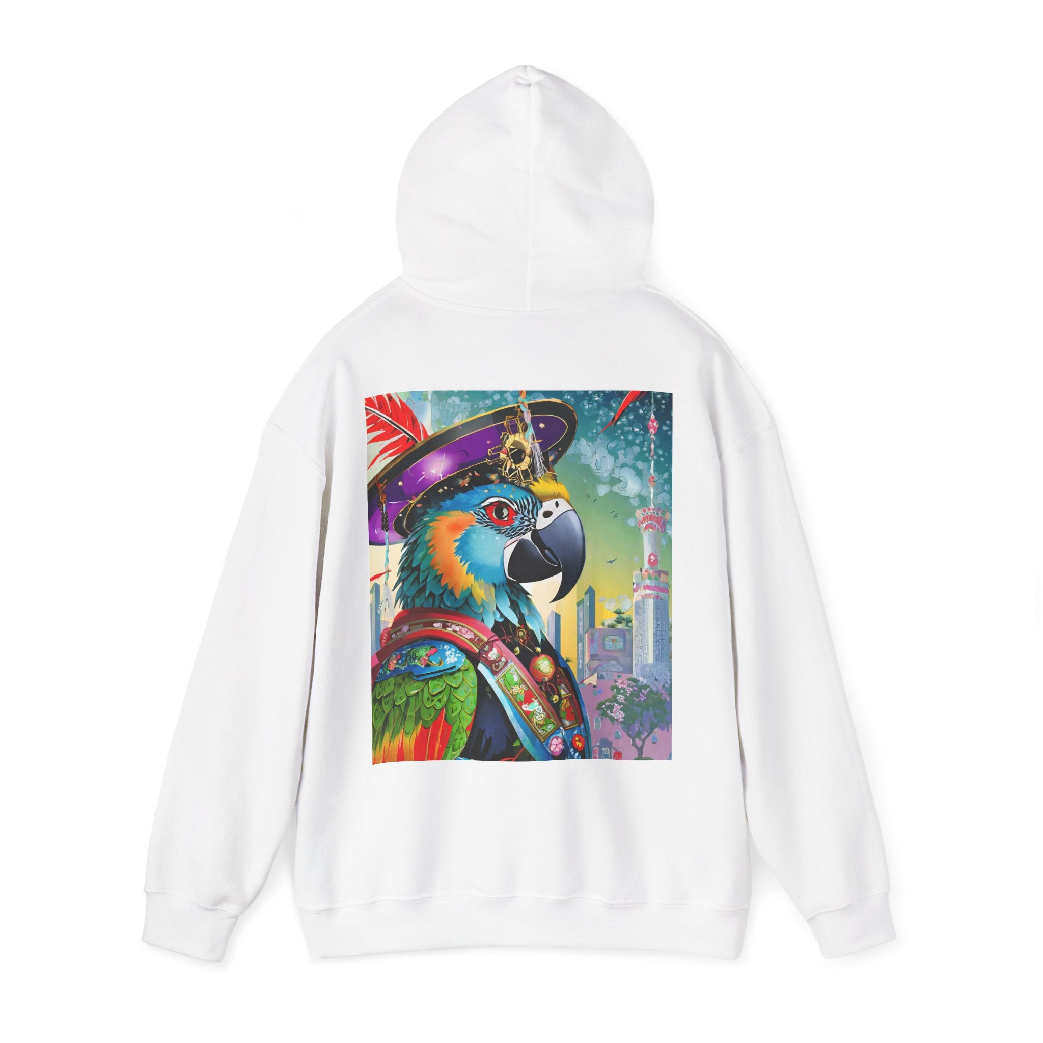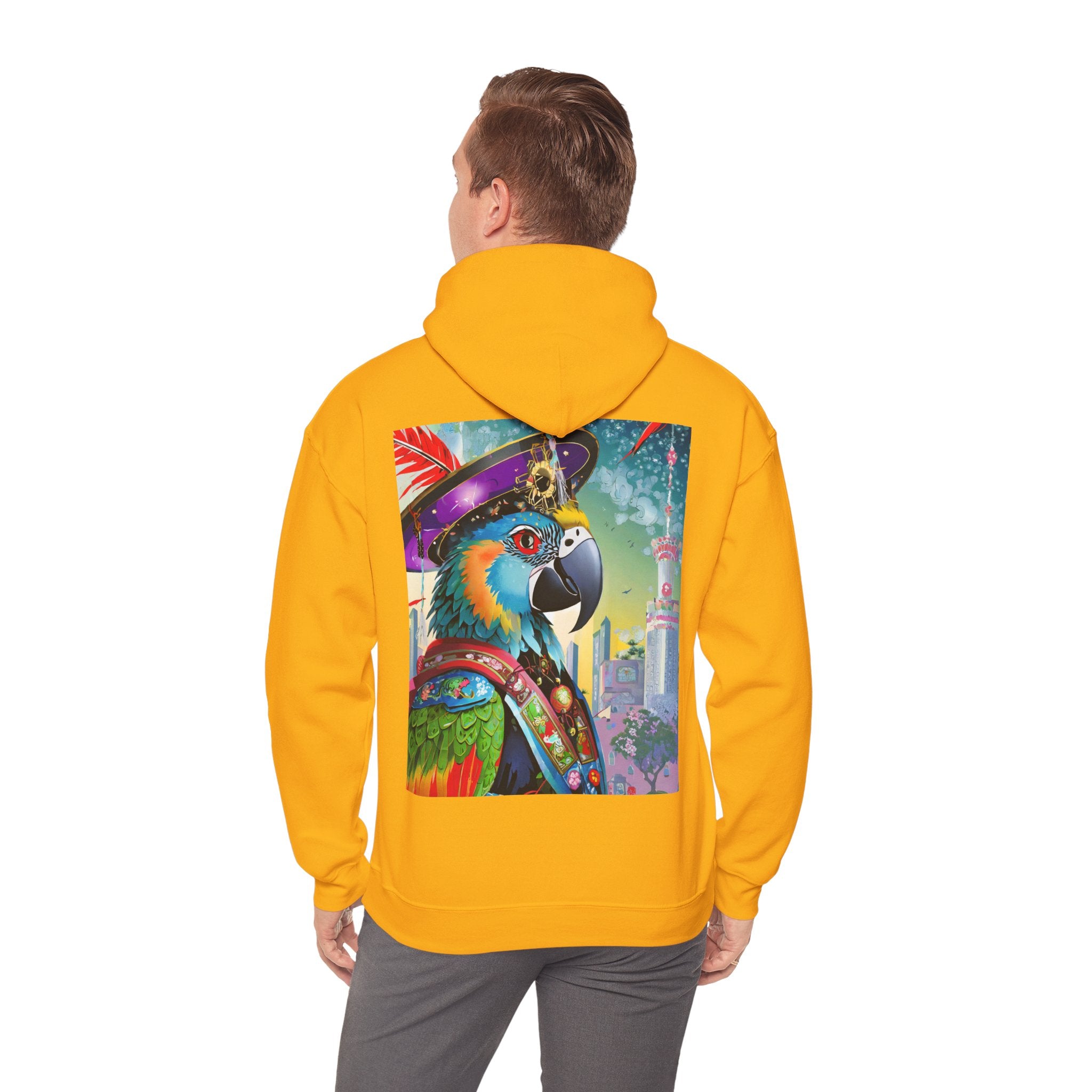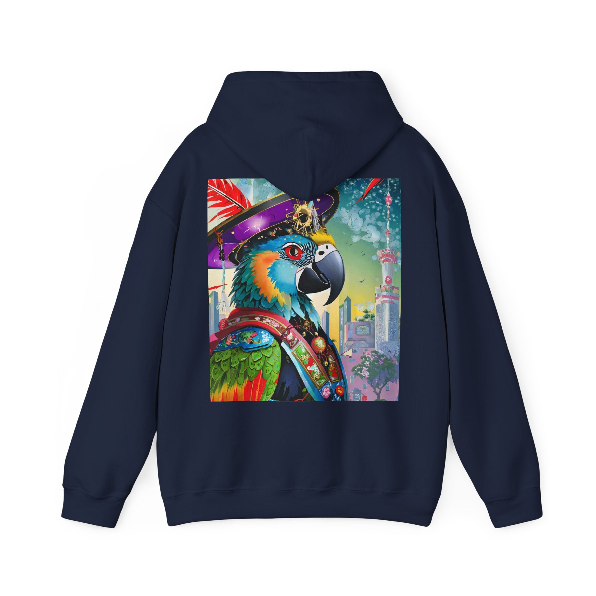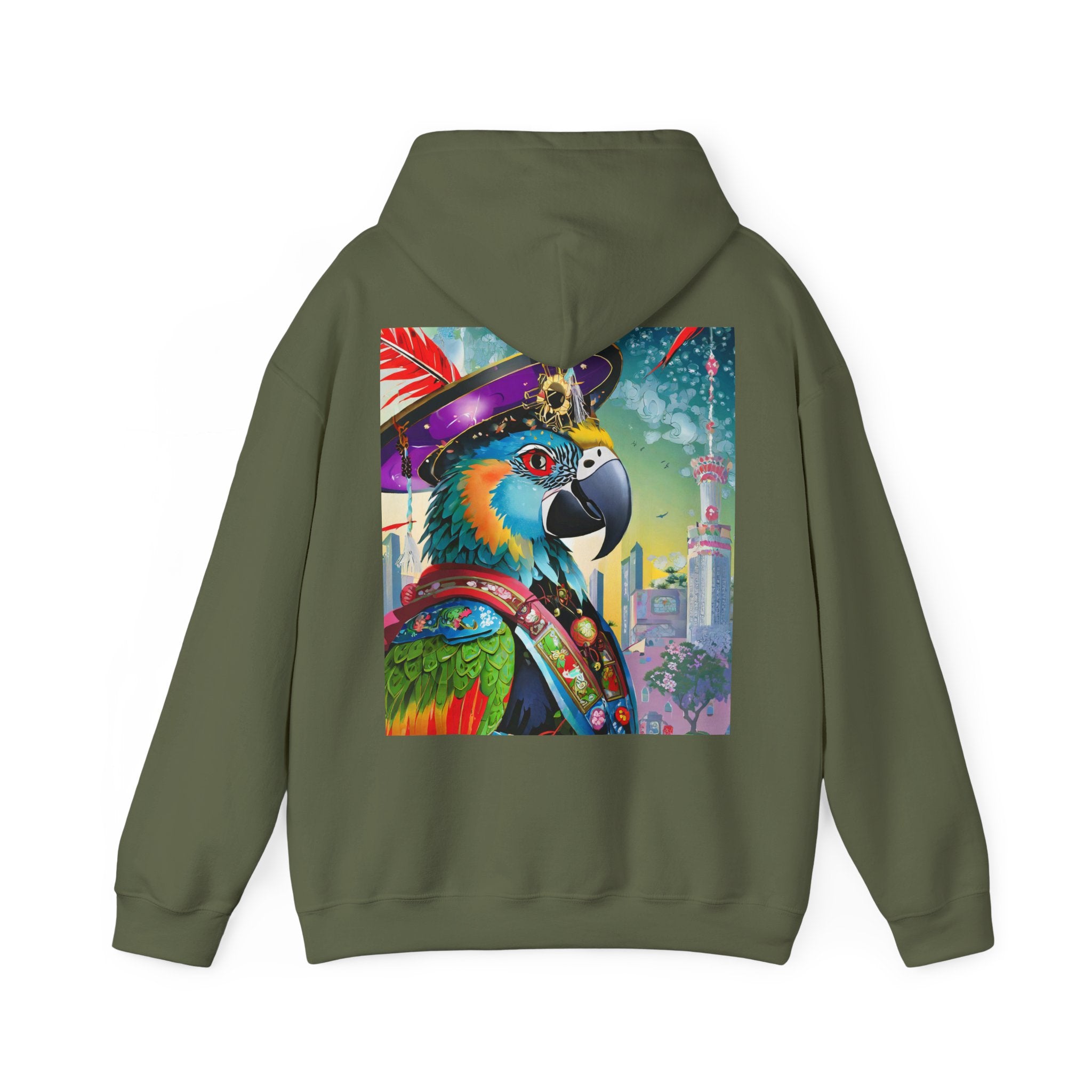 The background city radiates pink, turquoise, and gold tones beneath a luminous sky, blending high fashion with modern fantasy. The Parrot Aristocrat celebrates creativity, individuality, and bold sophistication — a fusion of nature, art, and style.