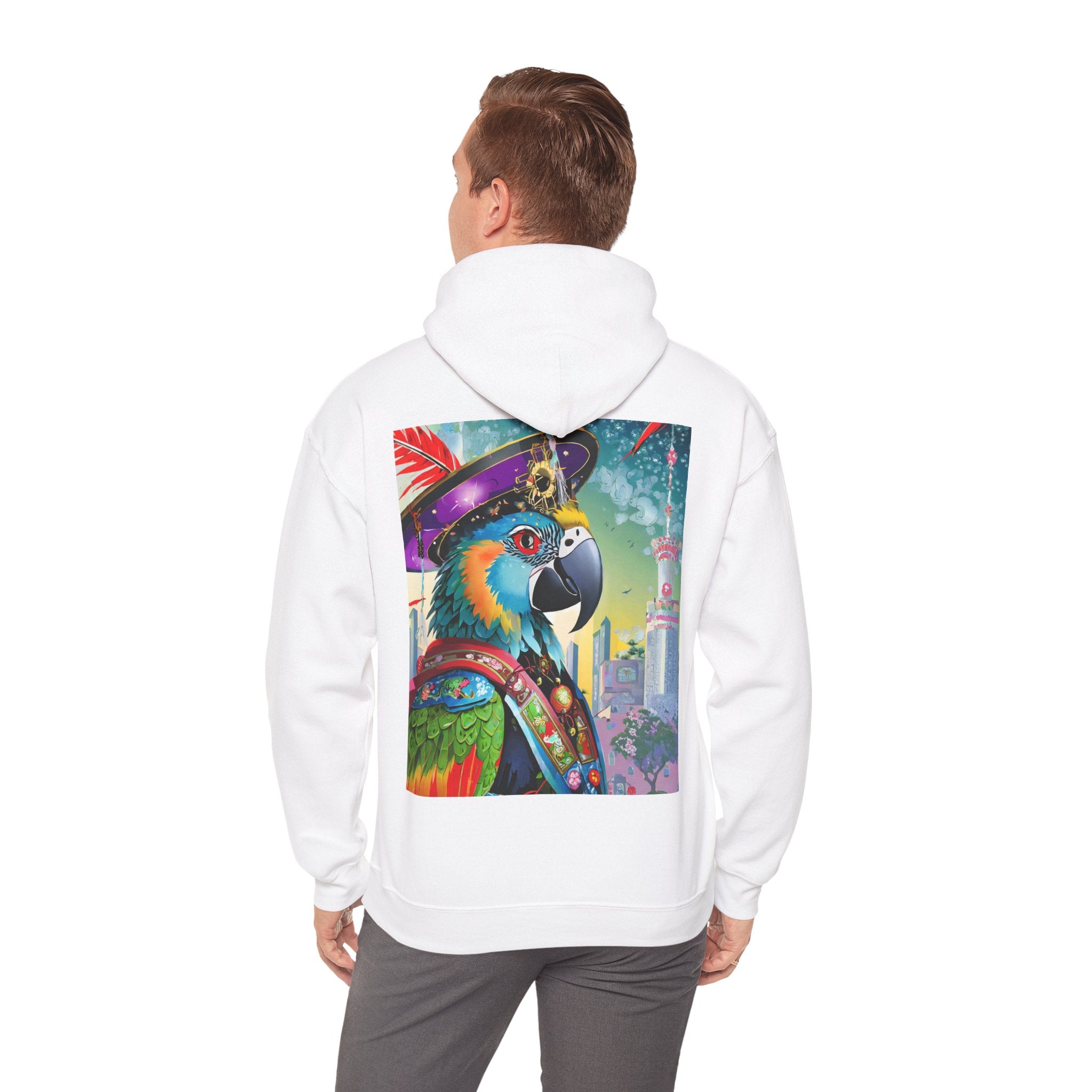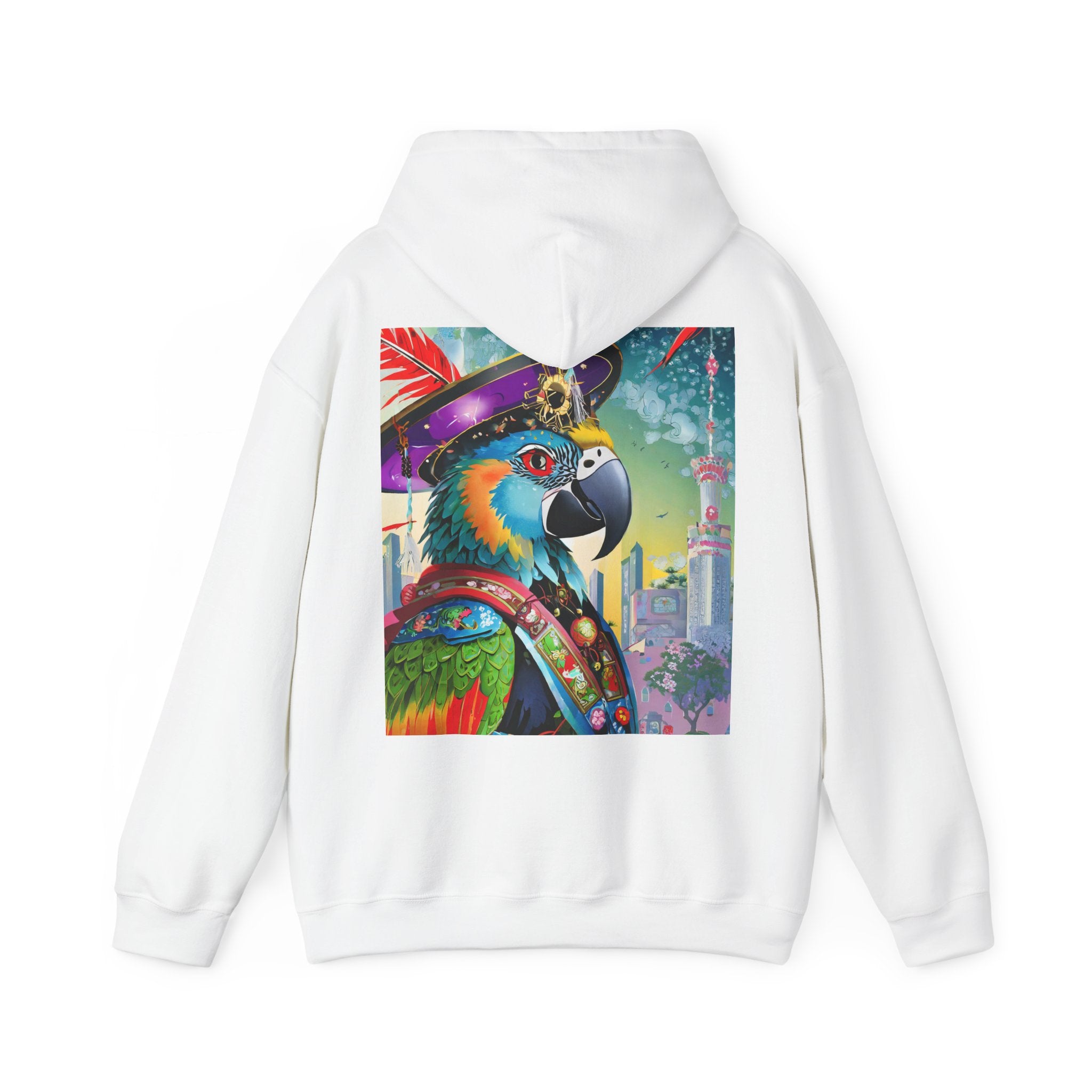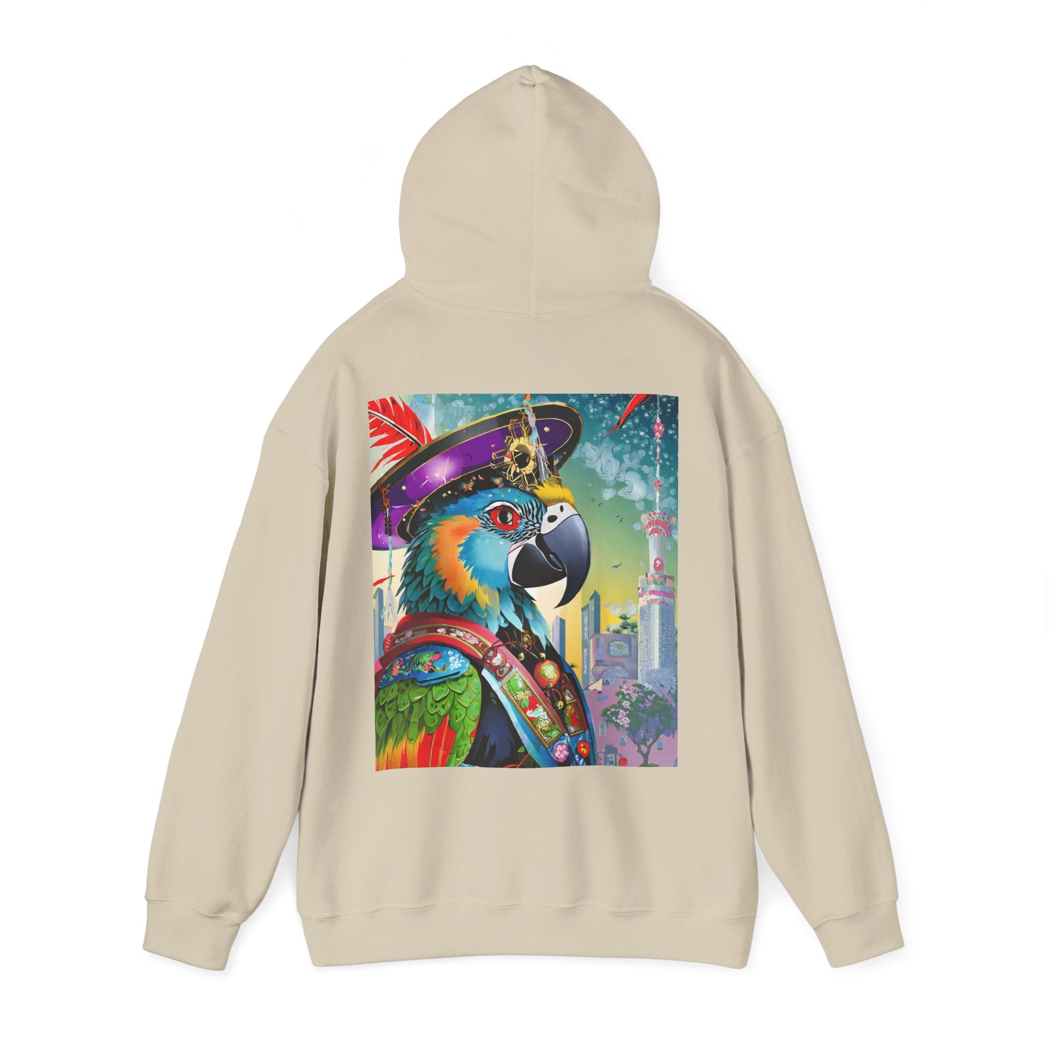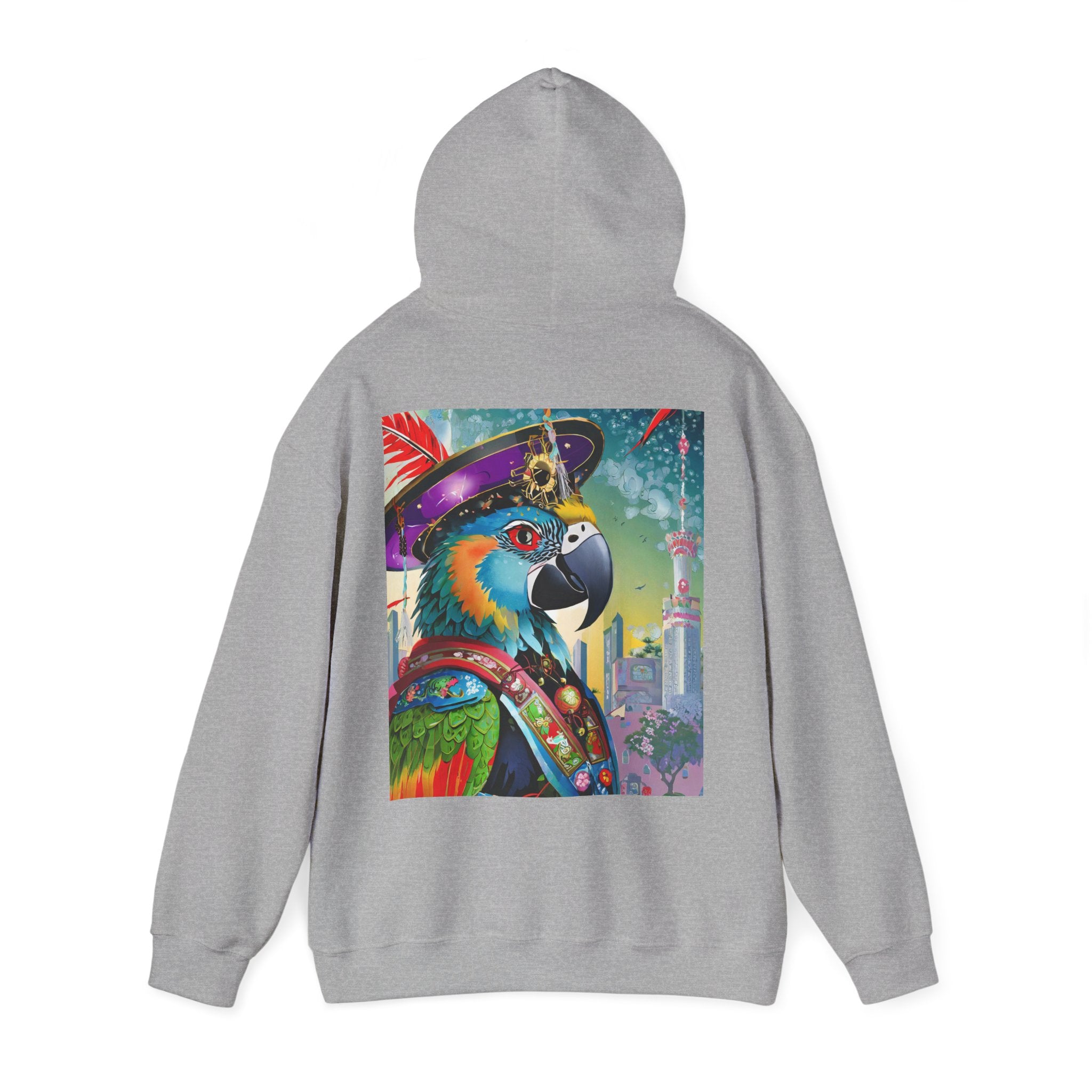 The background city radiates pink, turquoise, and gold tones beneath a luminous sky, blending high fashion with modern fantasy. The Parrot Aristocrat celebrates creativity, individuality, and bold sophistication — a fusion of nature, art, and style.
