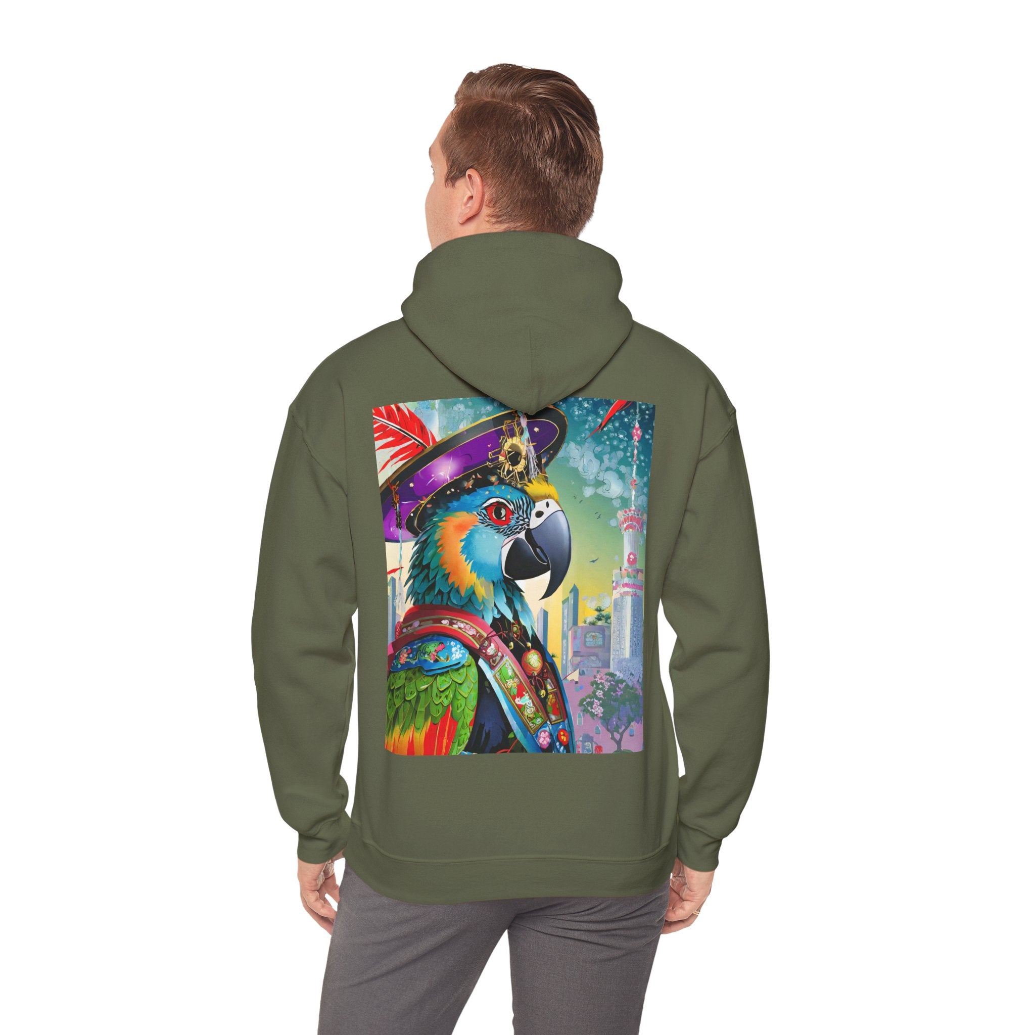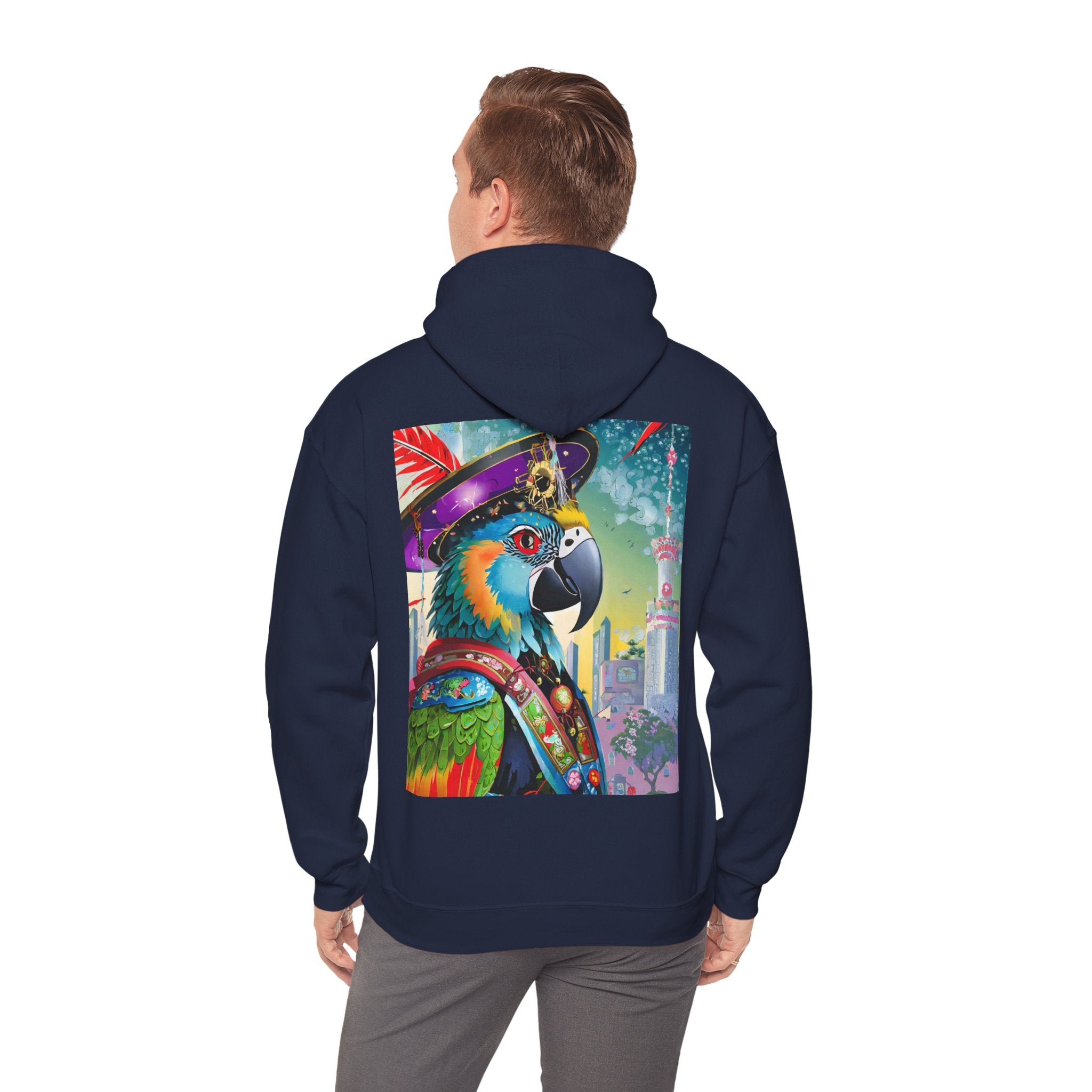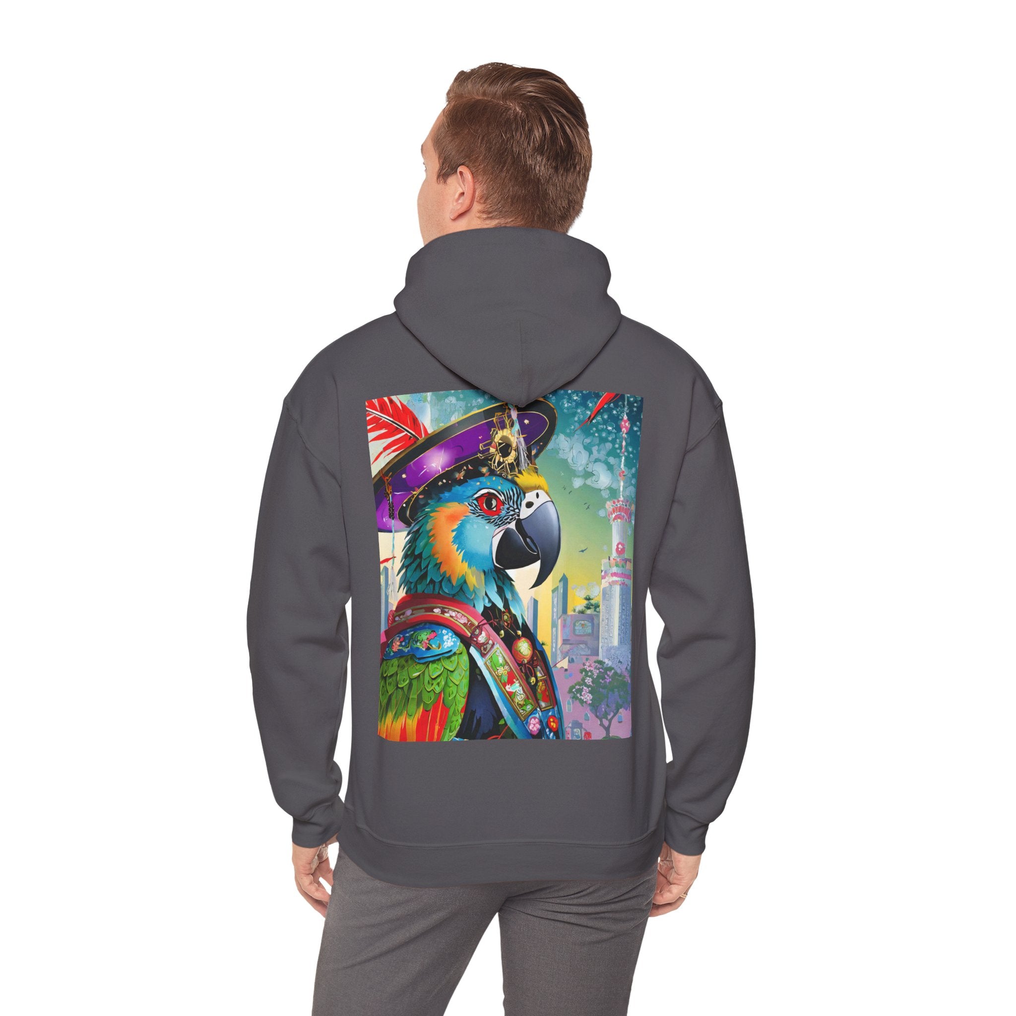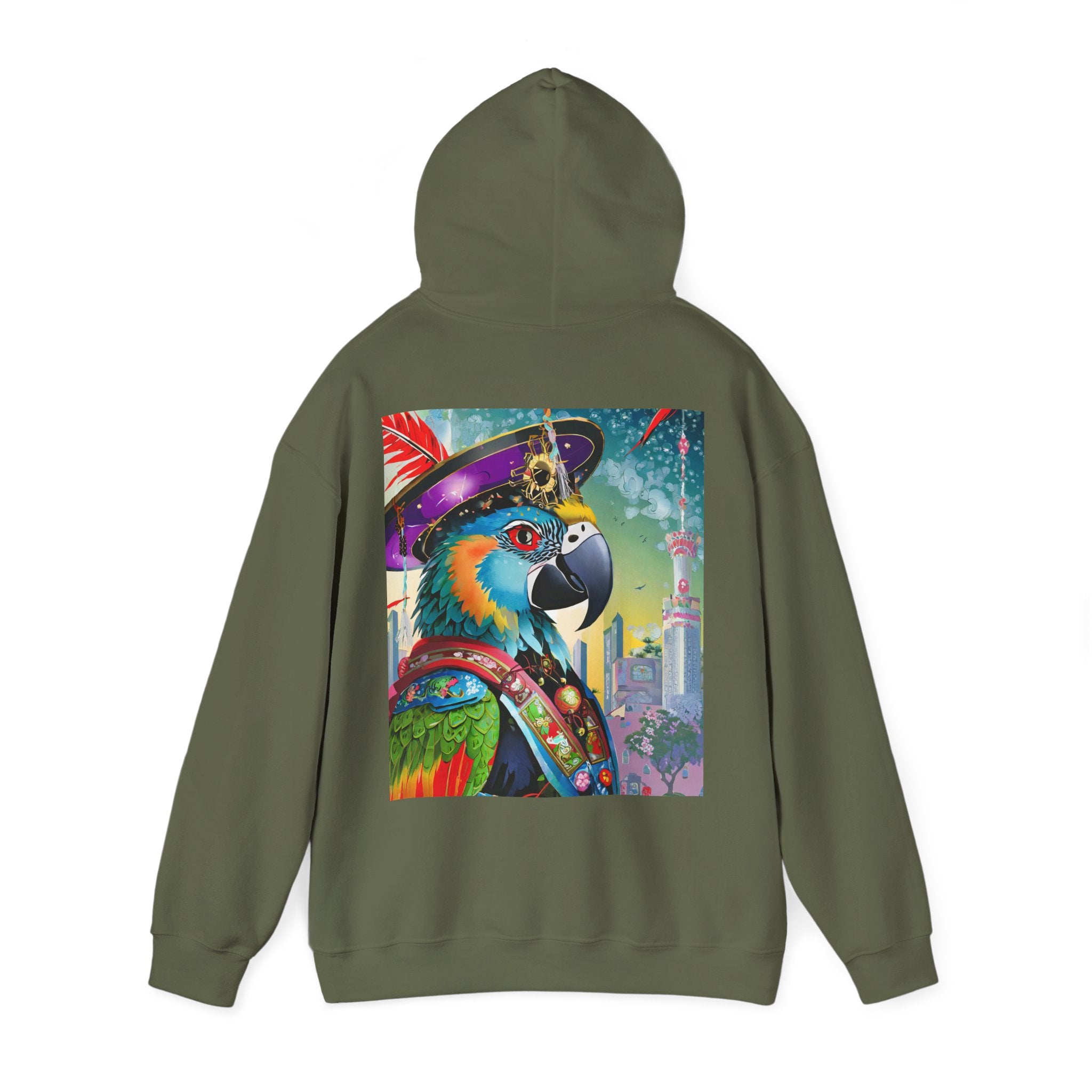 The background city radiates pink, turquoise, and gold tones beneath a luminous sky, blending high fashion with modern fantasy. The Parrot Aristocrat celebrates creativity, individuality, and bold sophistication — a fusion of nature, art, and style.