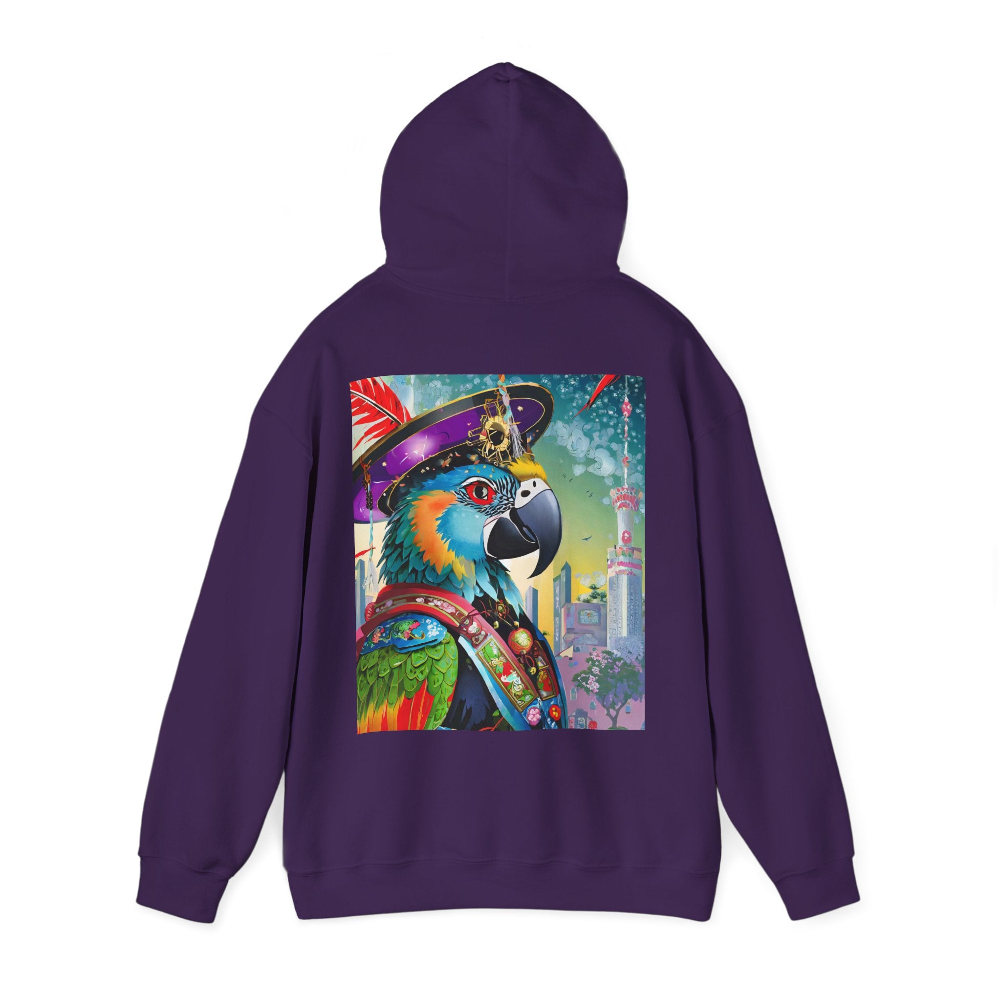 The Parrot Aristocrat combines elegance, color, and futuristic style in a captivating portrait. The artwork features a regal parrot posed against a glowing skyline, its feathers gleaming in greens, blues, and fiery oranges with a metallic sheen. A violet hat with a crimson feather and gold chain adds charm, while a jeweled garment around its neck sparkles with ornate detail and luxury.