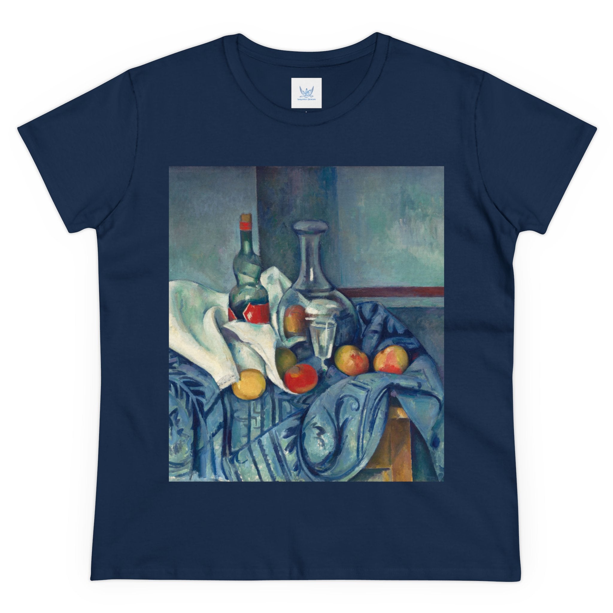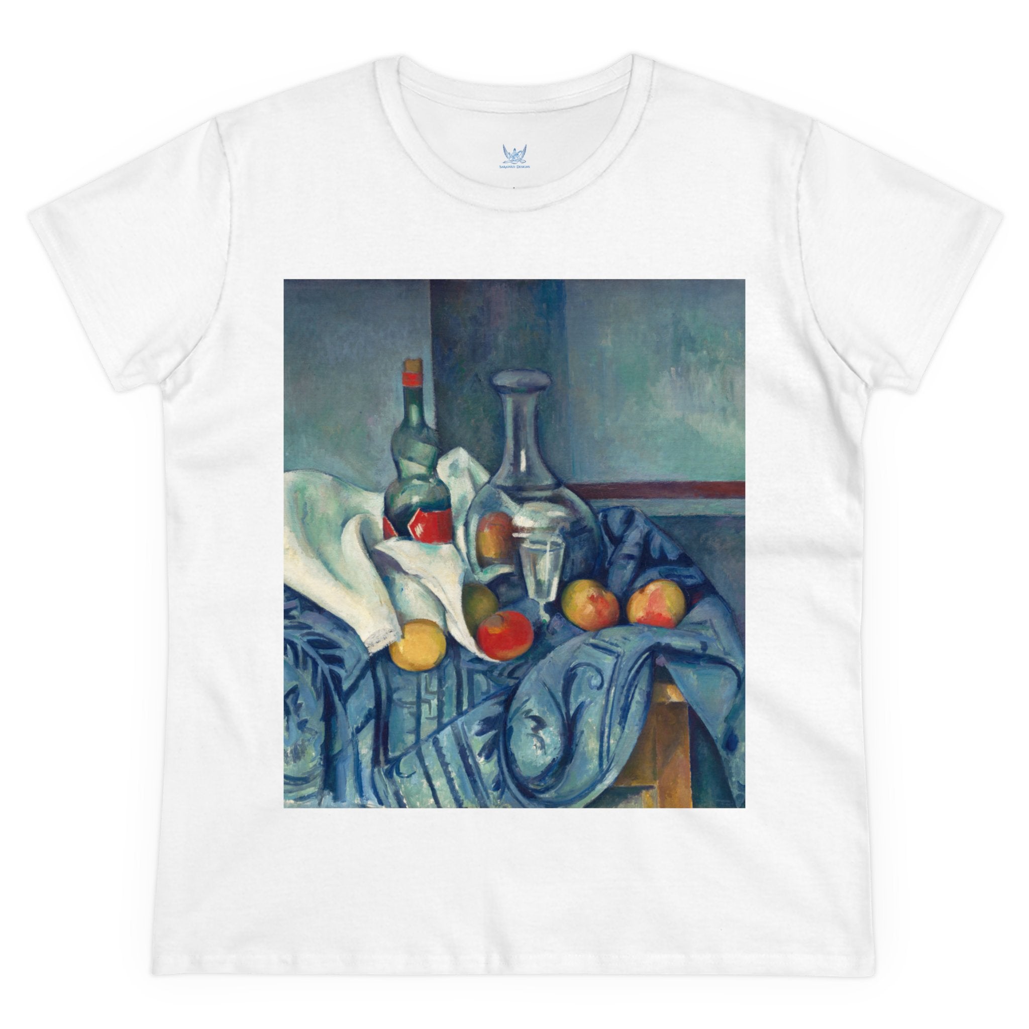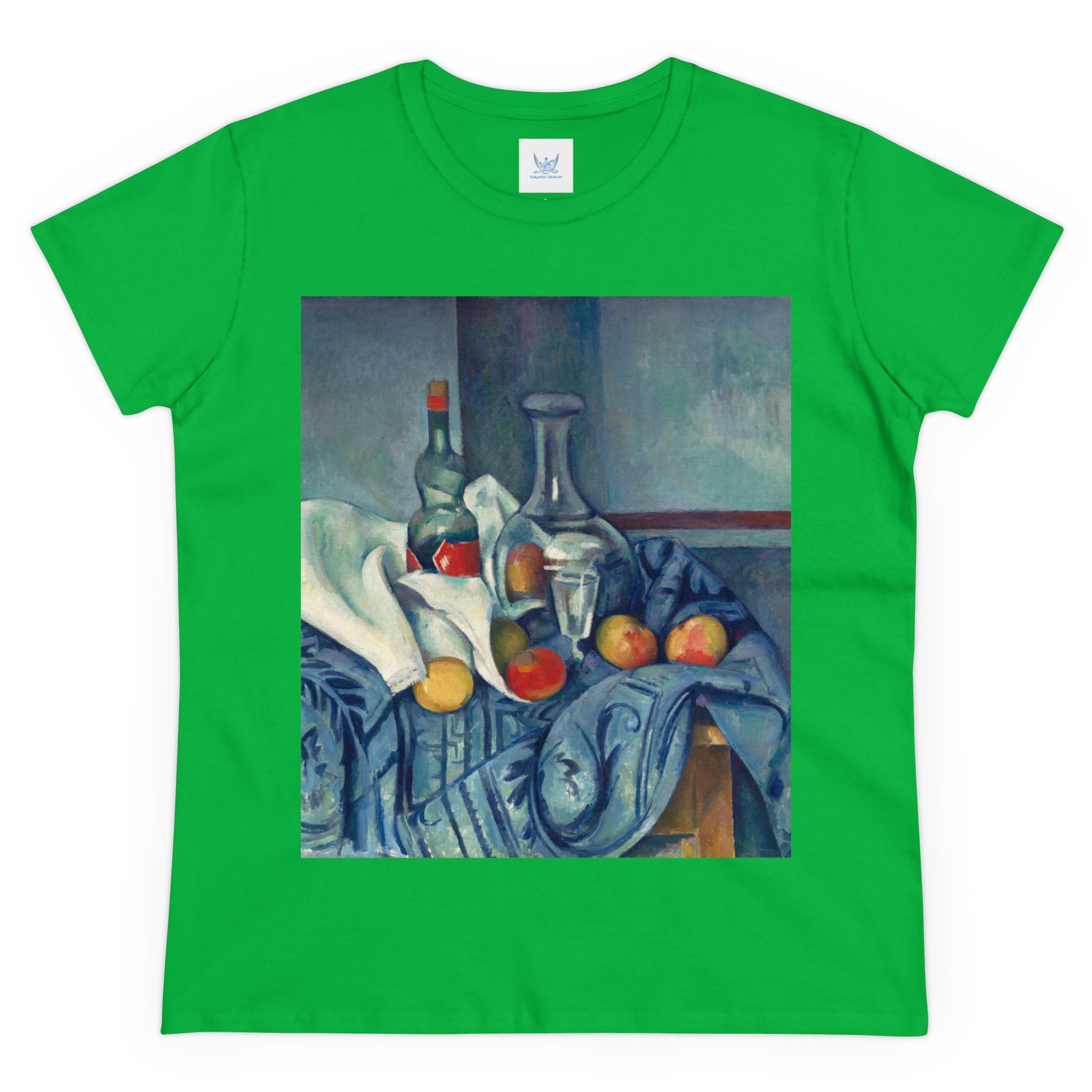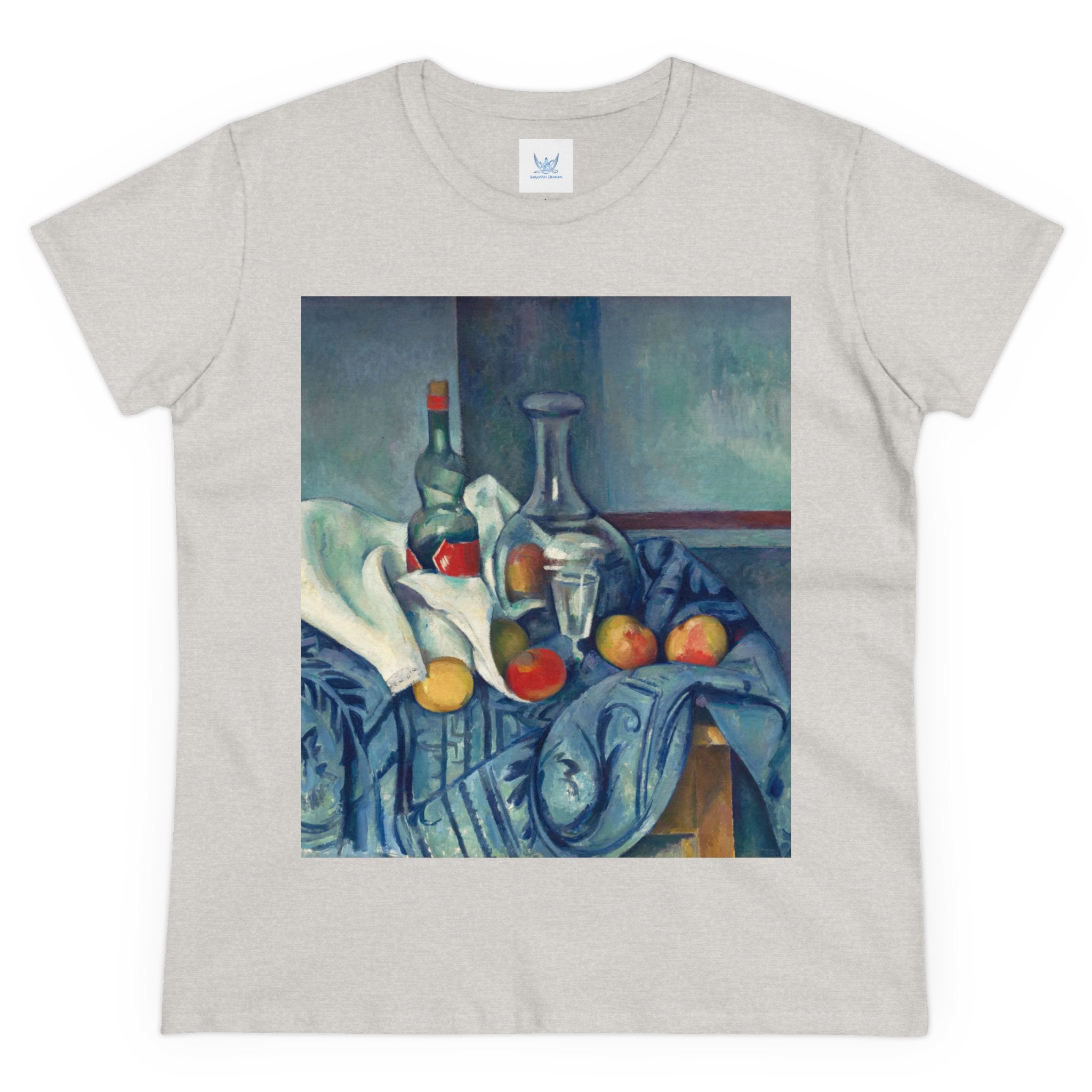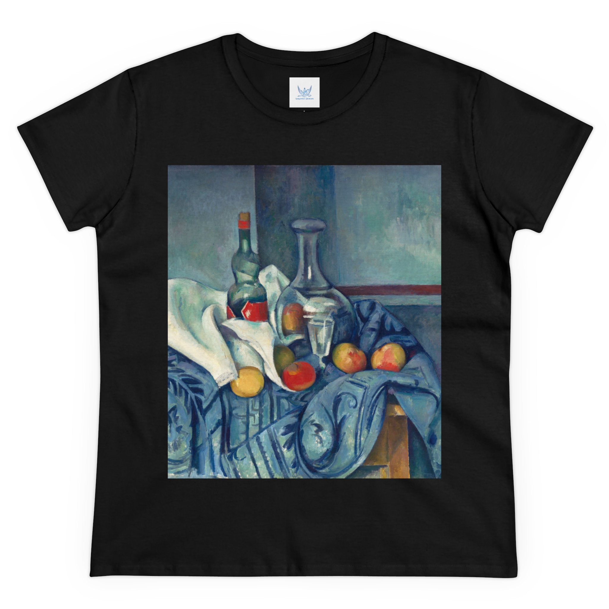 Artwork designed and digitally remastered by Sarasvati Designs. "The Peppermint Bottle" is an artwork created by the renowned French Post-Impressionist artist Paul Cézanne, believed to have been produced between 1893 and 1895. This painting is a striking example of Cézanne's innovative and influential style, which bridged the gap between Impressionism and the emergence of modern art in the 20th century. The painting presents a simple yet captivating still life composition. At the center of the artwork is a glass bottle containing peppermint liqueur. The bottle is placed on a table with a white tablecloth, and it is accompanied by other objects and utensils, such as a glass and a small dish. "The Peppermint Bottle," was highly influential in the development of modern art. His approach to form and space laid the groundwork for Cubism and other 20th-century art movements. This painting showcases his dedication to reimagining traditional still life through a modern lens.