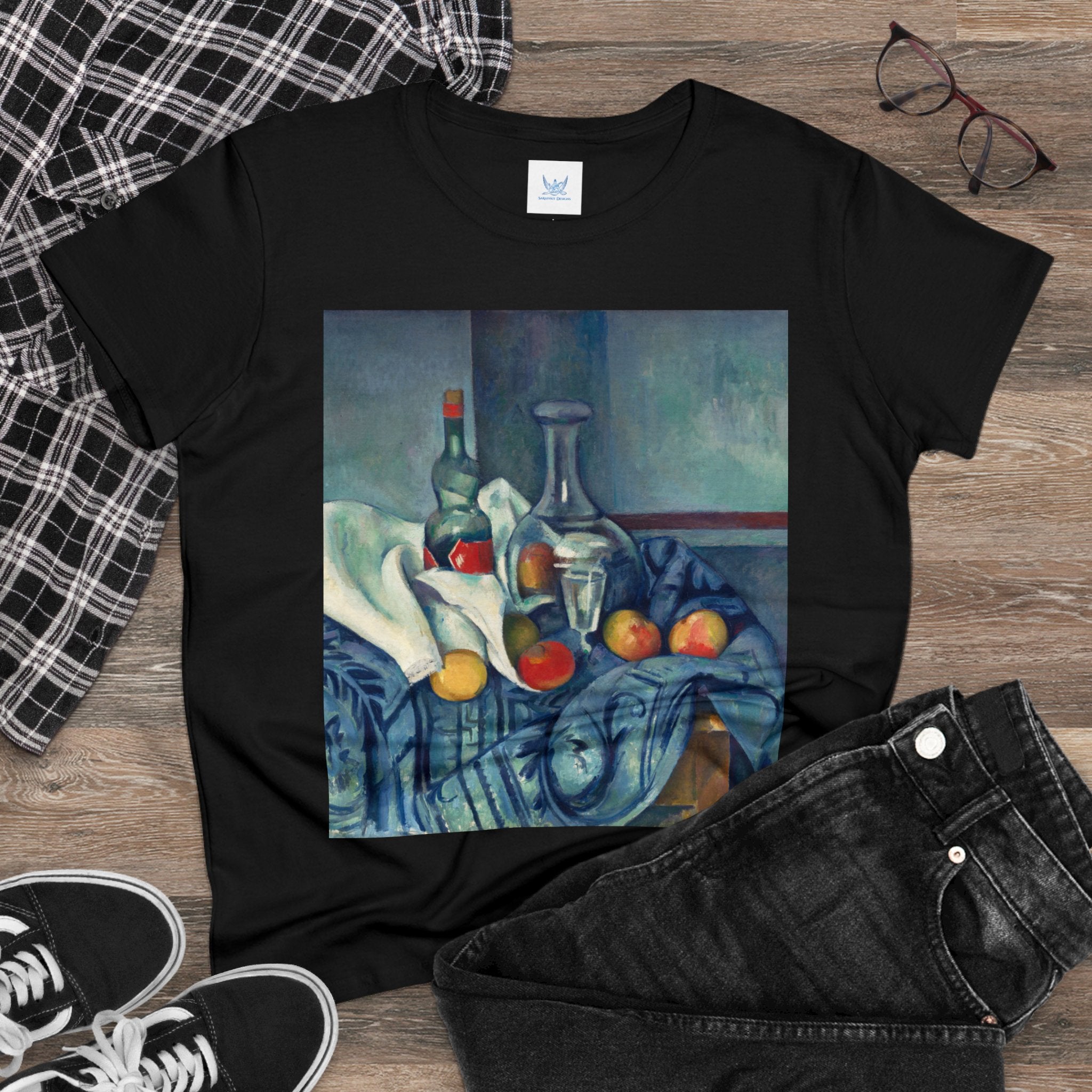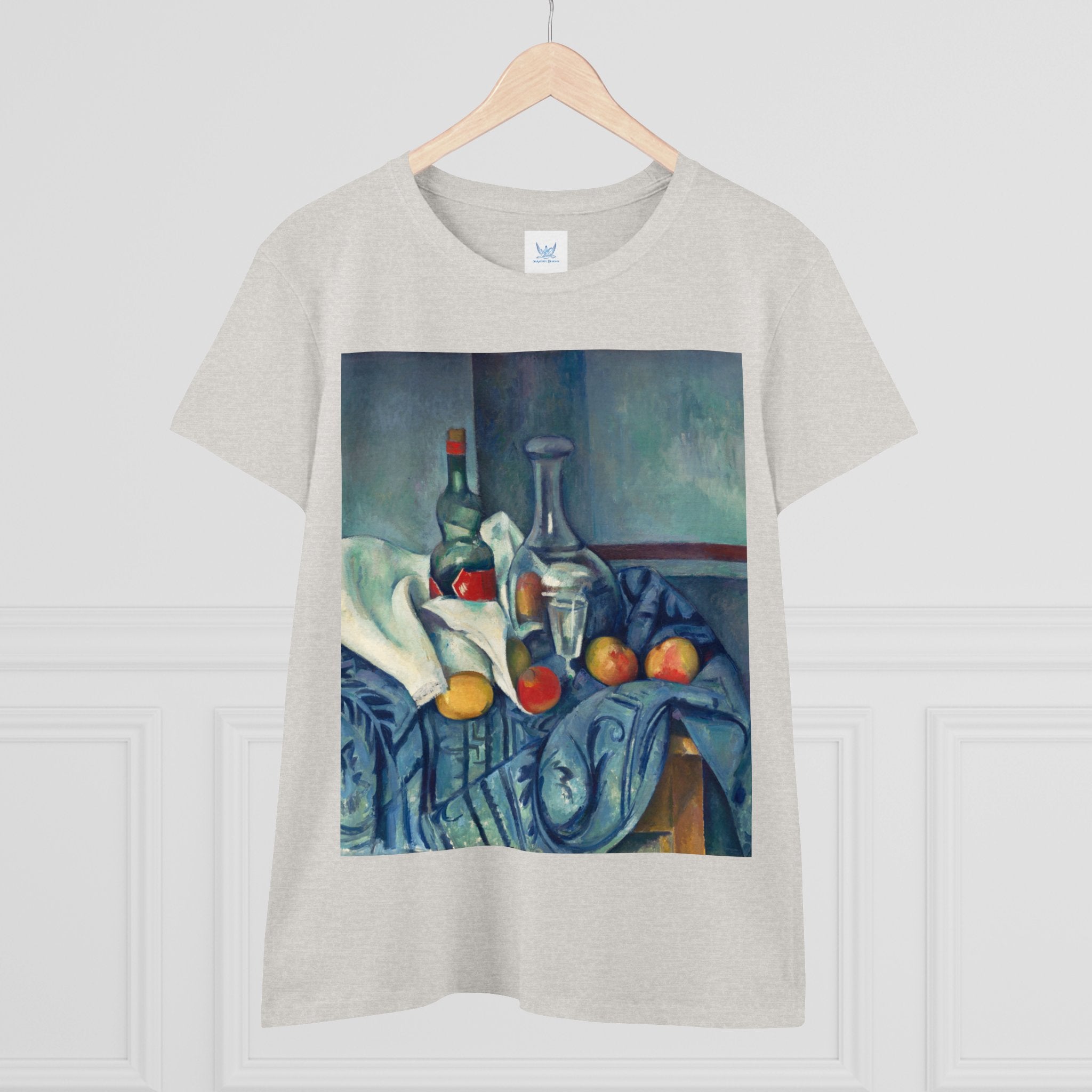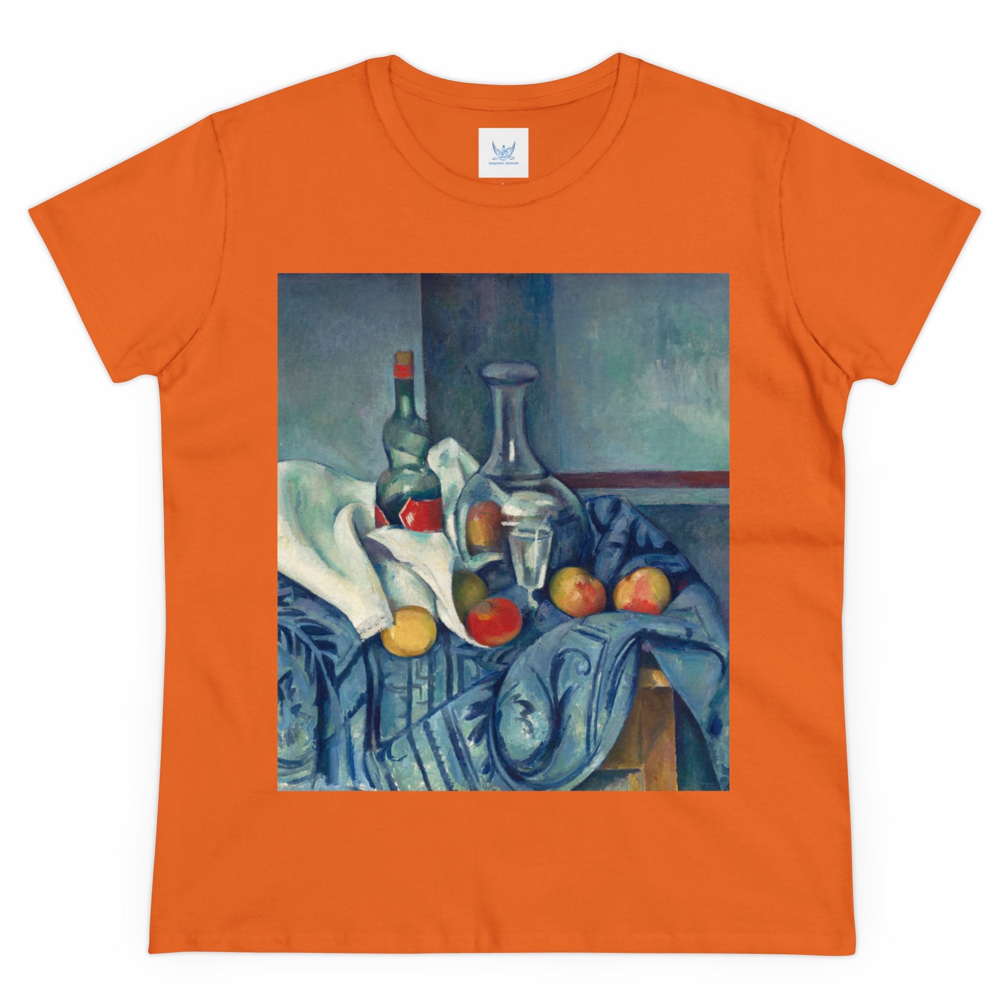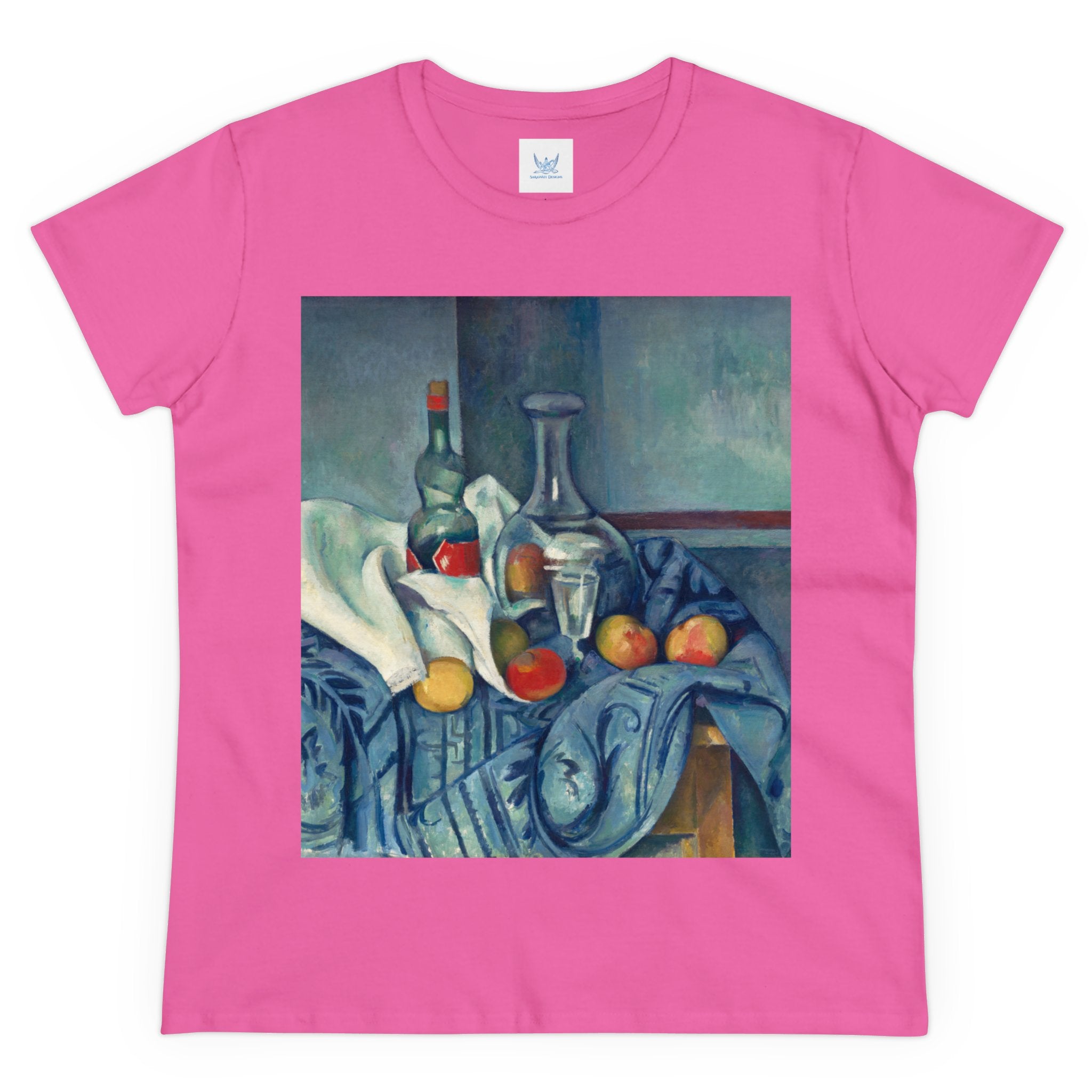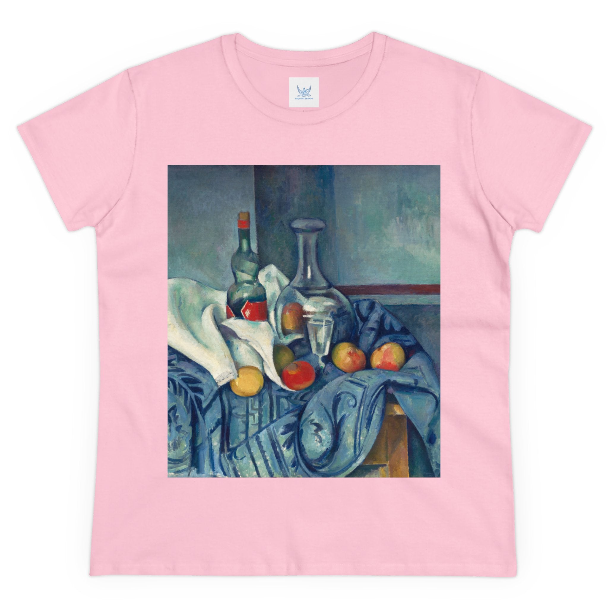 Artwork designed and digitally remastered by Sarasvati Designs. "The Peppermint Bottle" is an artwork created by the renowned French Post-Impressionist artist Paul Cézanne, believed to have been produced between 1893 and 1895. This painting is a striking example of Cézanne's innovative and influential style, which bridged the gap between Impressionism and the emergence of modern art in the 20th century. The painting presents a simple yet captivating still life composition. At the center of the artwork is a glass bottle containing peppermint liqueur. The bottle is placed on a table with a white tablecloth, and it is accompanied by other objects and utensils, such as a glass and a small dish. "The Peppermint Bottle," was highly influential in the development of modern art. His approach to form and space laid the groundwork for Cubism and other 20th-century art movements. This painting showcases his dedication to reimagining traditional still life through a modern lens.