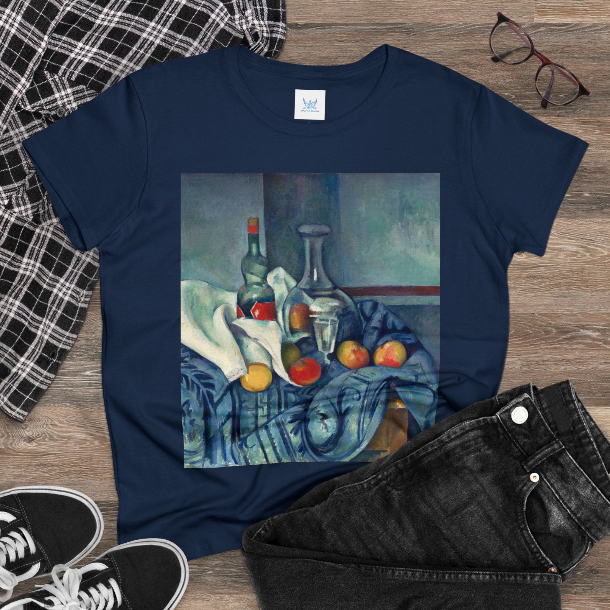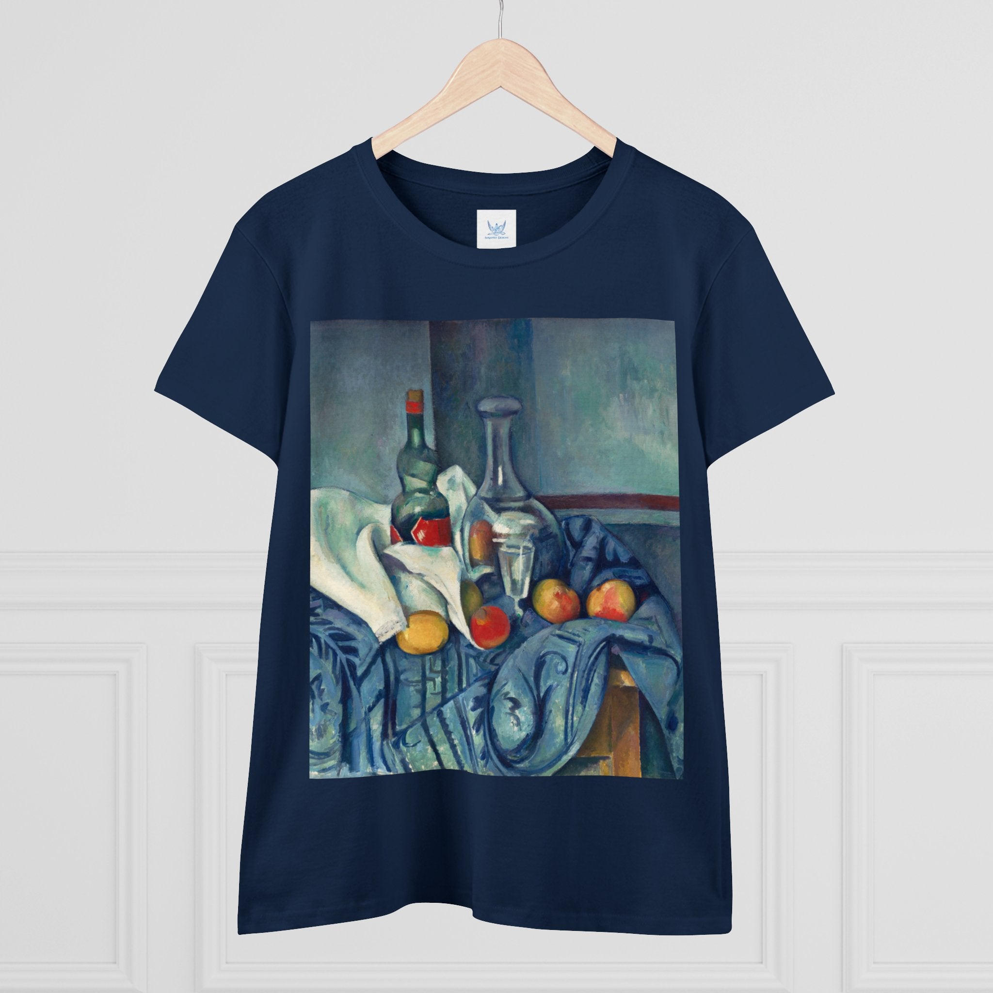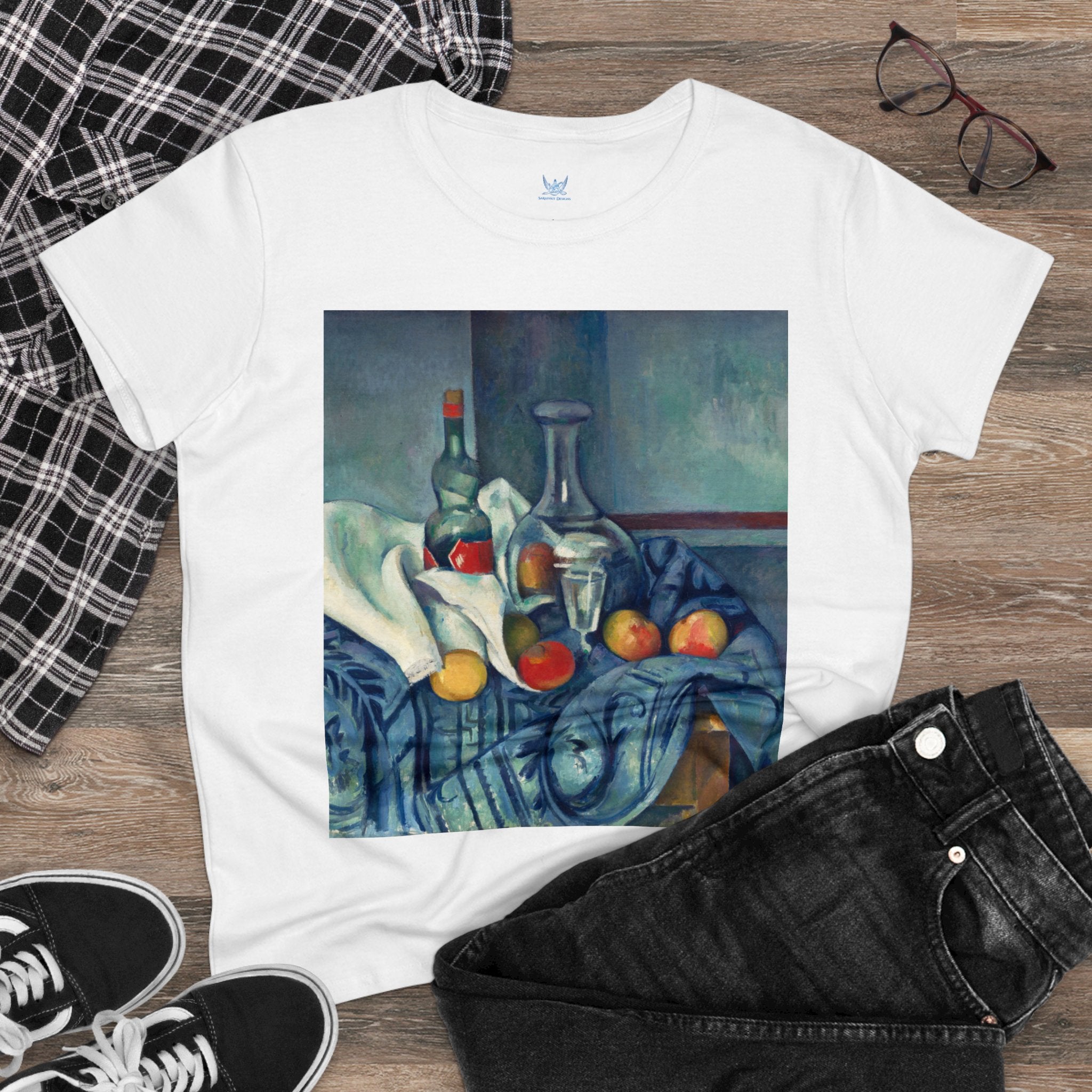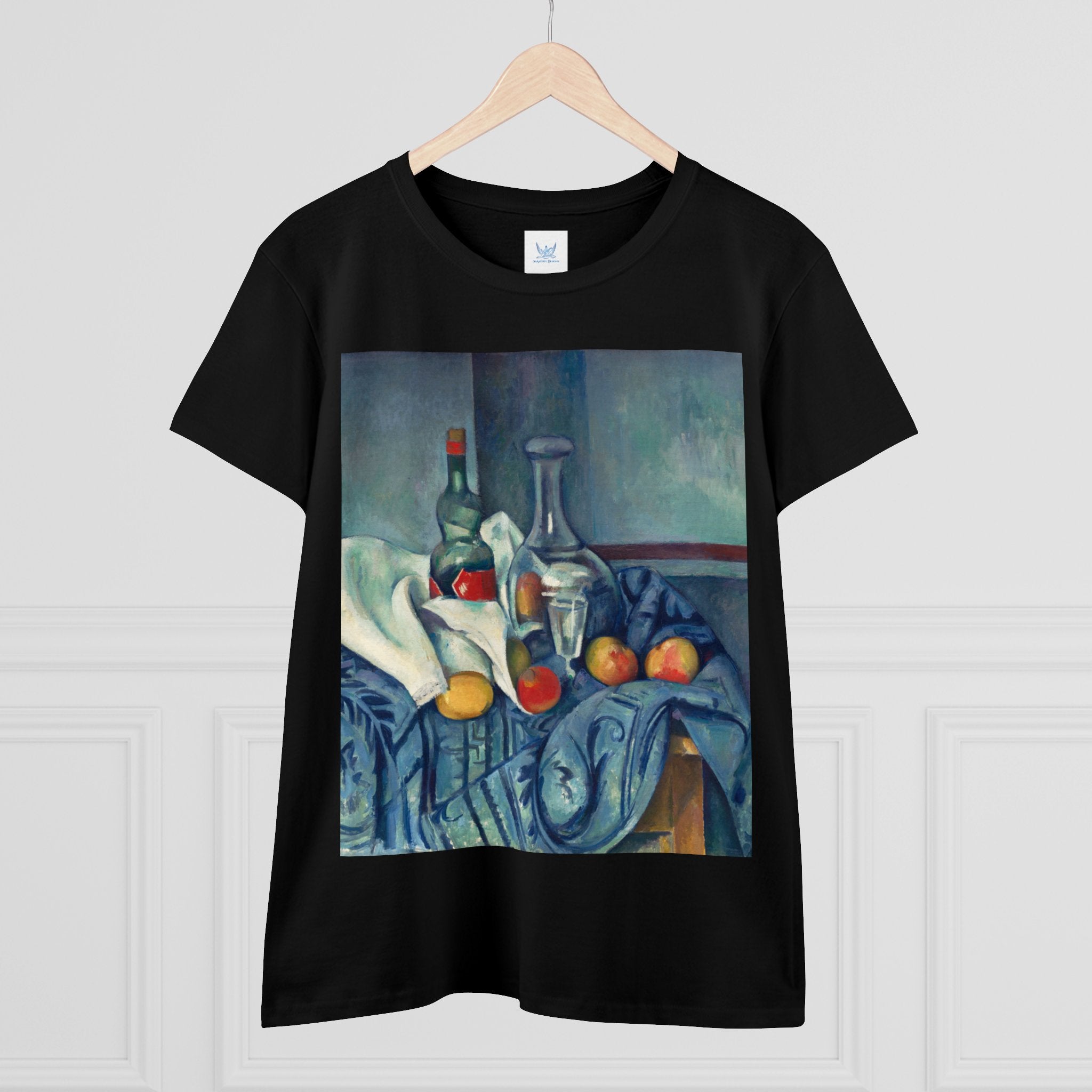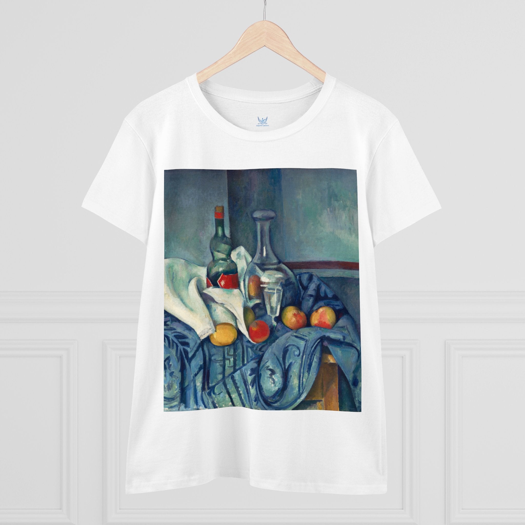 Artwork designed and digitally remastered by Sarasvati Designs. "The Peppermint Bottle" is an artwork created by the renowned French Post-Impressionist artist Paul Cézanne, believed to have been produced between 1893 and 1895. This painting is a striking example of Cézanne's innovative and influential style, which bridged the gap between Impressionism and the emergence of modern art in the 20th century. The painting presents a simple yet captivating still life composition. At the center of the artwork is a glass bottle containing peppermint liqueur. The bottle is placed on a table with a white tablecloth, and it is accompanied by other objects and utensils, such as a glass and a small dish. "The Peppermint Bottle," was highly influential in the development of modern art. His approach to form and space laid the groundwork for Cubism and other 20th-century art movements. This painting showcases his dedication to reimagining traditional still life through a modern lens.