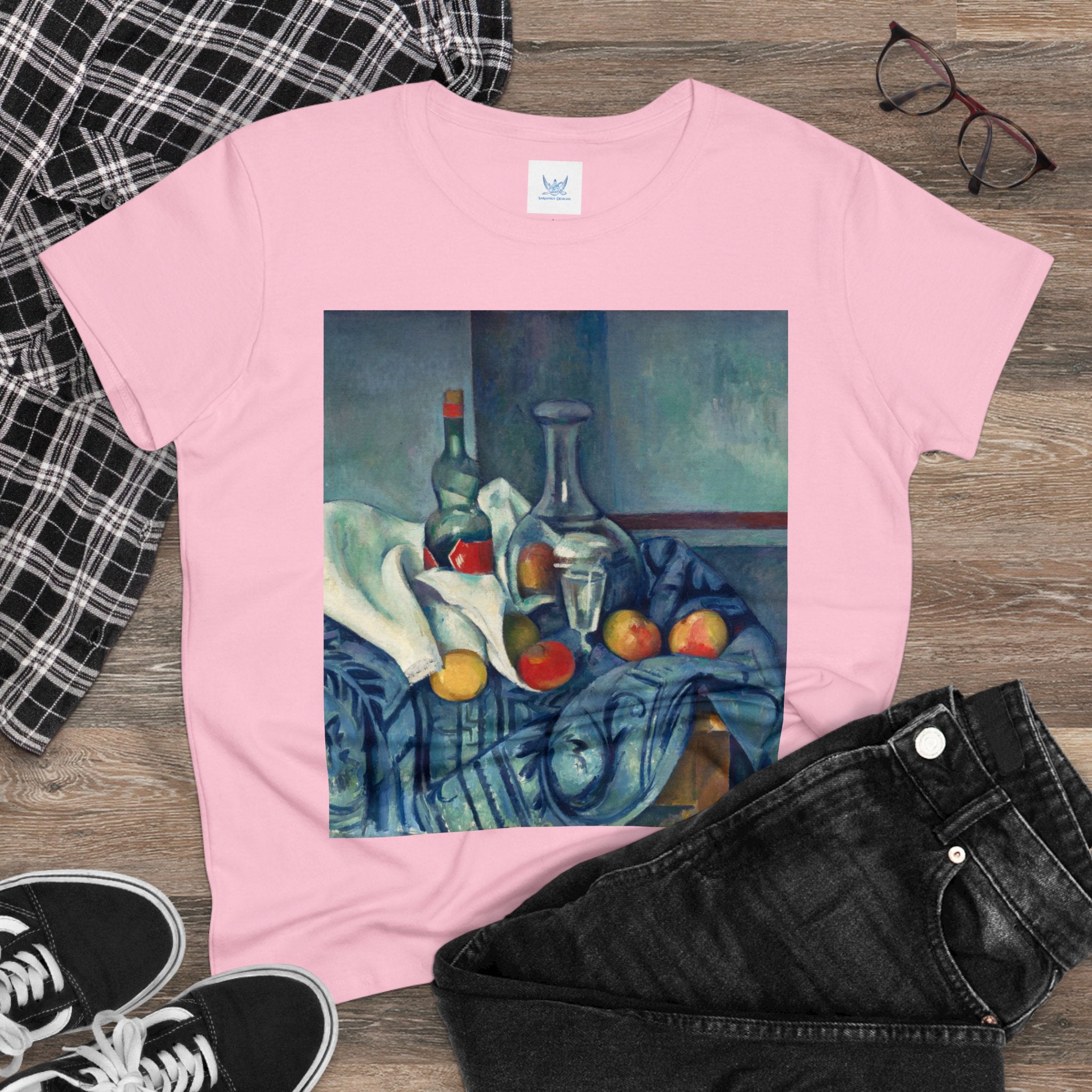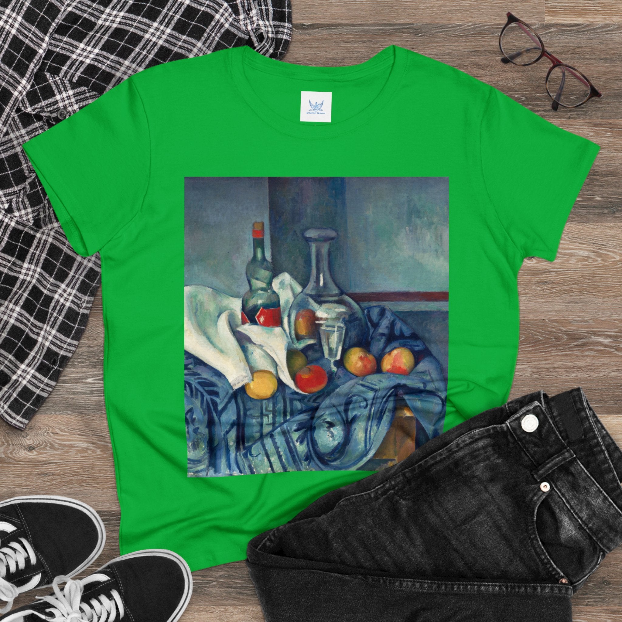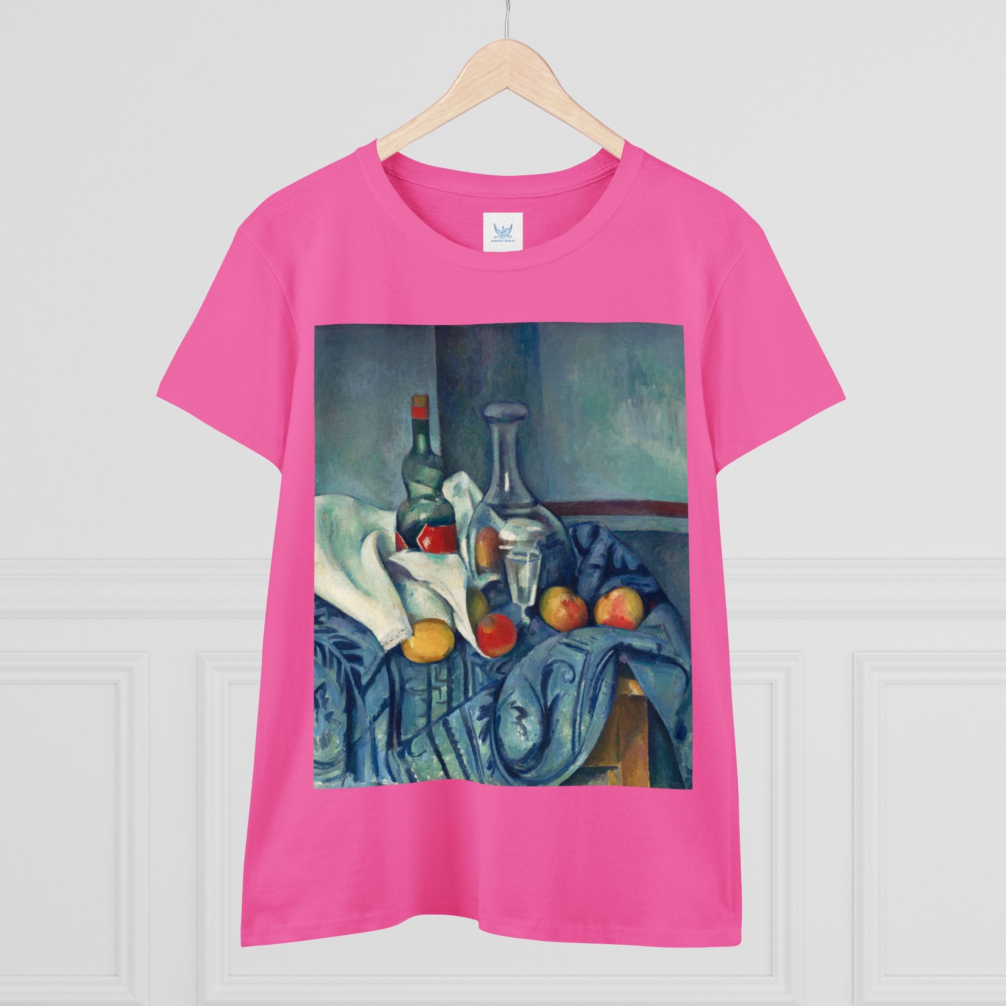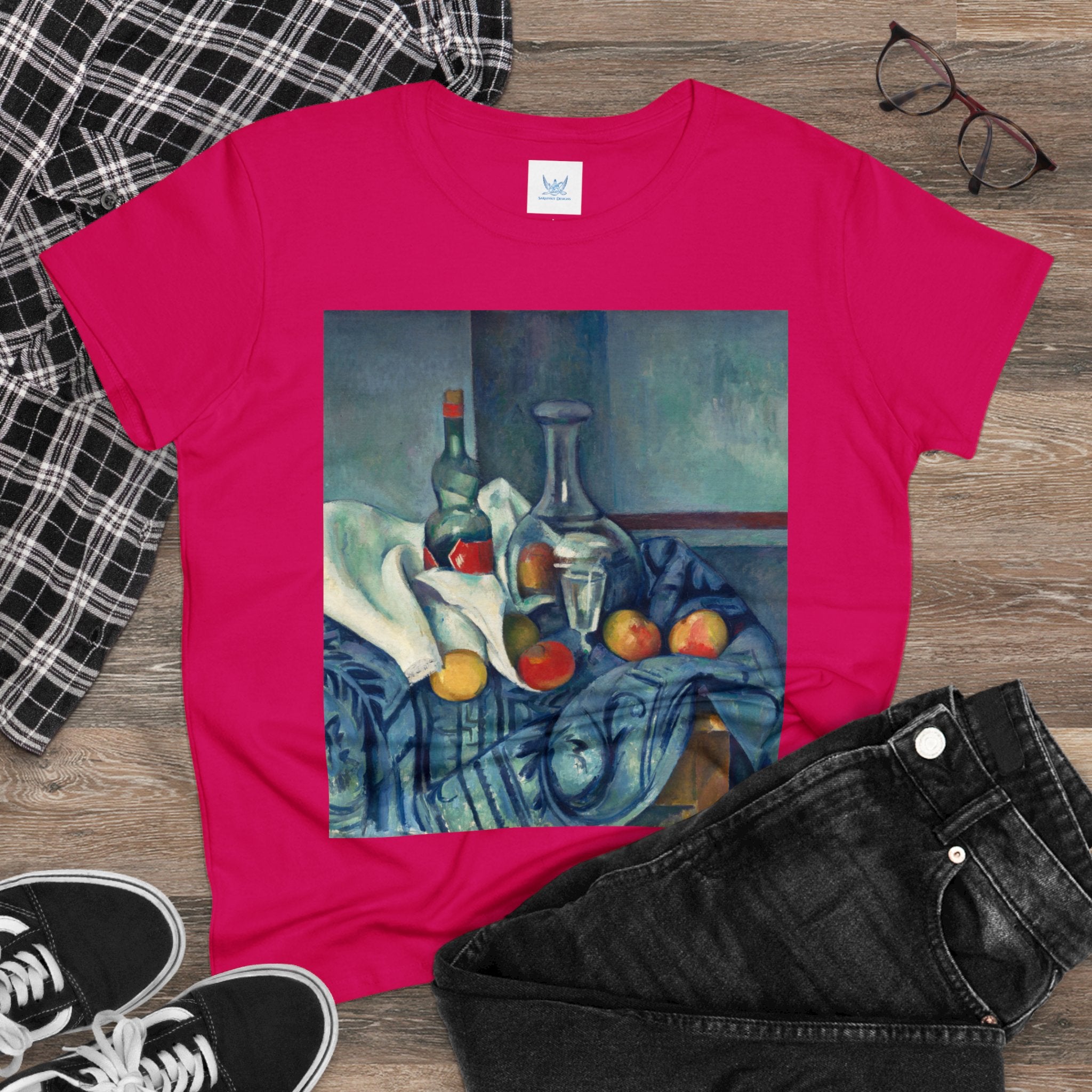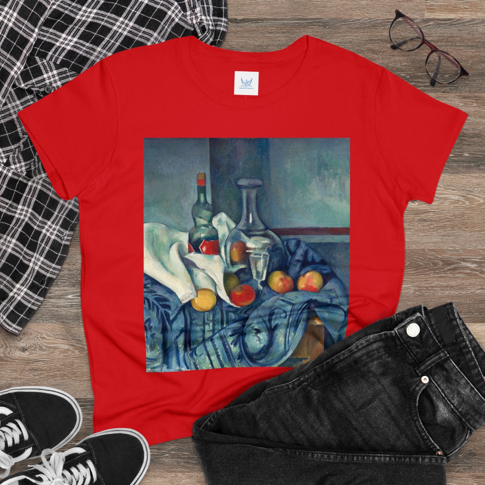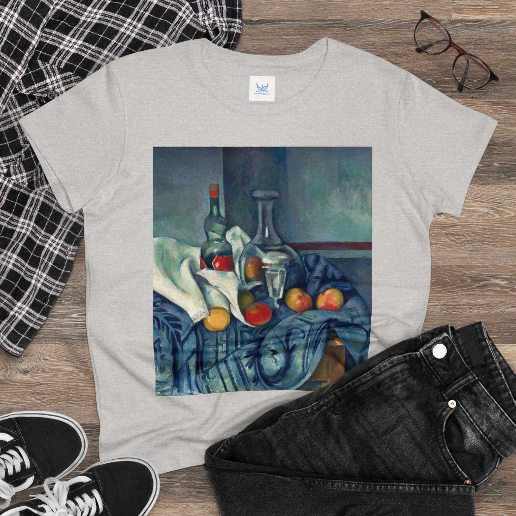 Artwork designed and digitally remastered by Sarasvati Designs. "The Peppermint Bottle" is an artwork created by the renowned French Post-Impressionist artist Paul Cézanne, believed to have been produced between 1893 and 1895. This painting is a striking example of Cézanne's innovative and influential style, which bridged the gap between Impressionism and the emergence of modern art in the 20th century. The painting presents a simple yet captivating still life composition. At the center of the artwork is a glass bottle containing peppermint liqueur. The bottle is placed on a table with a white tablecloth, and it is accompanied by other objects and utensils, such as a glass and a small dish. "The Peppermint Bottle," was highly influential in the development of modern art. His approach to form and space laid the groundwork for Cubism and other 20th-century art movements. This painting showcases his dedication to reimagining traditional still life through a modern lens.