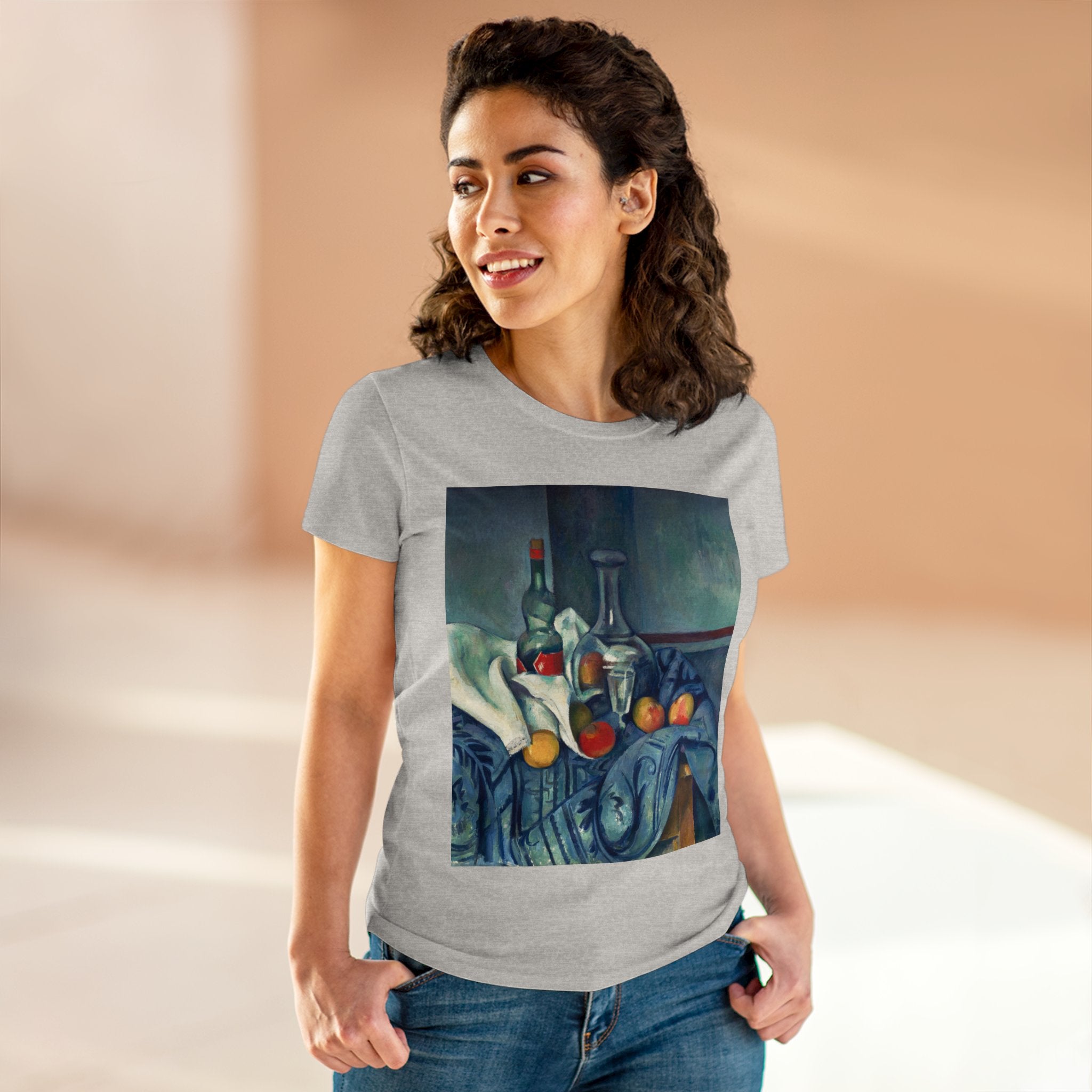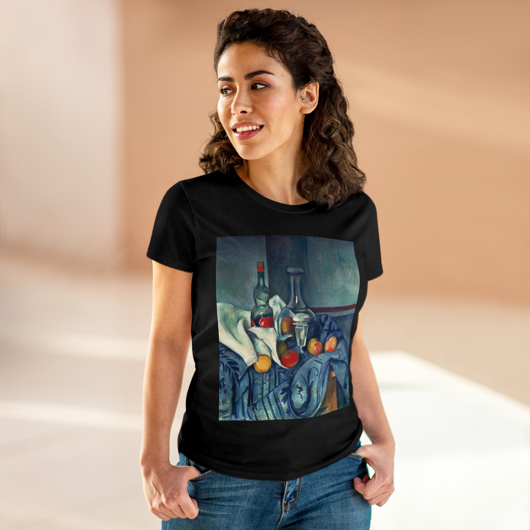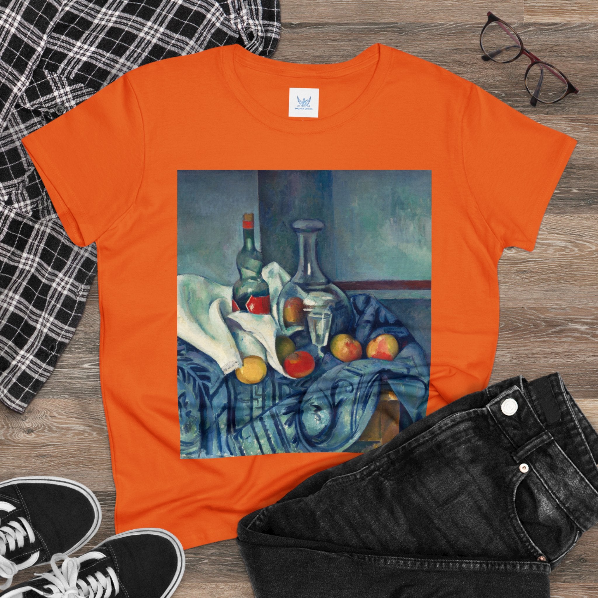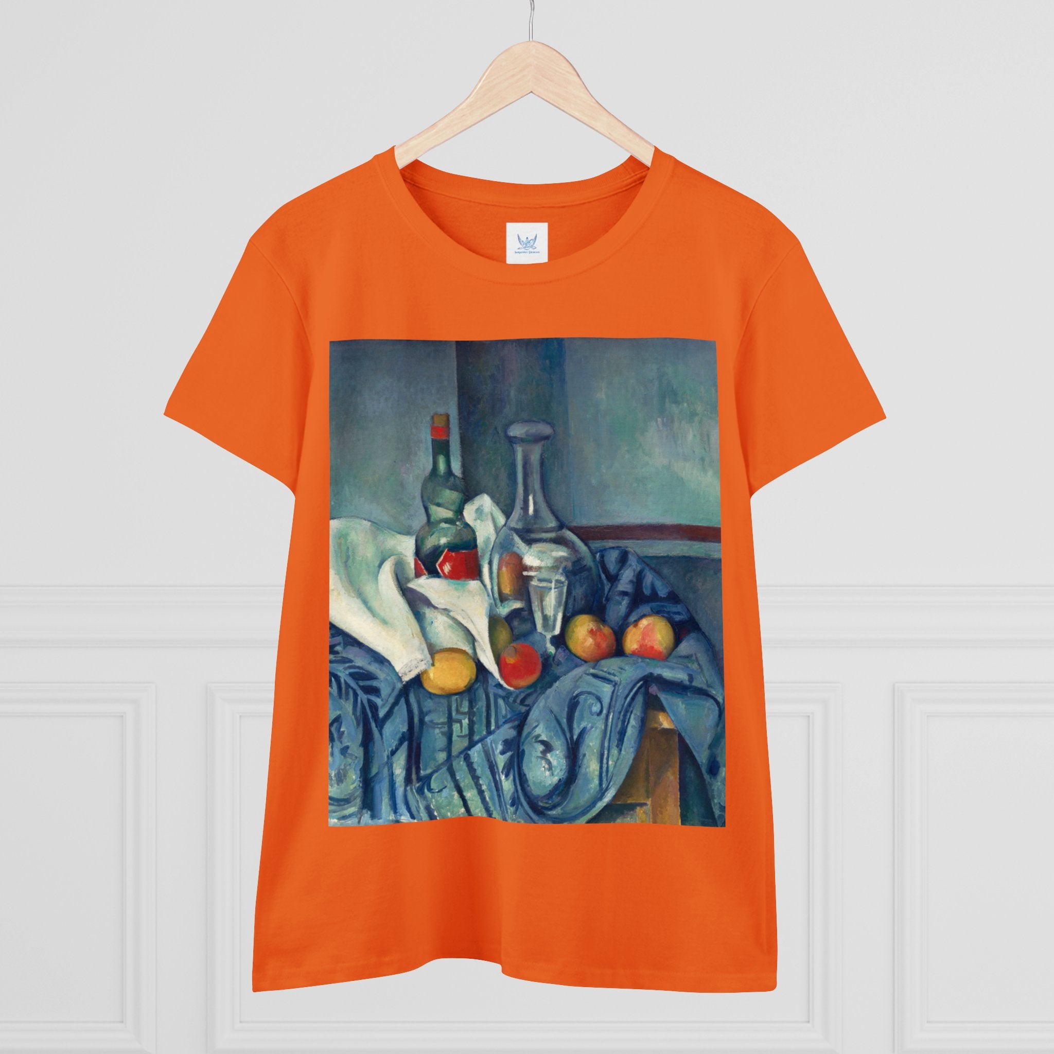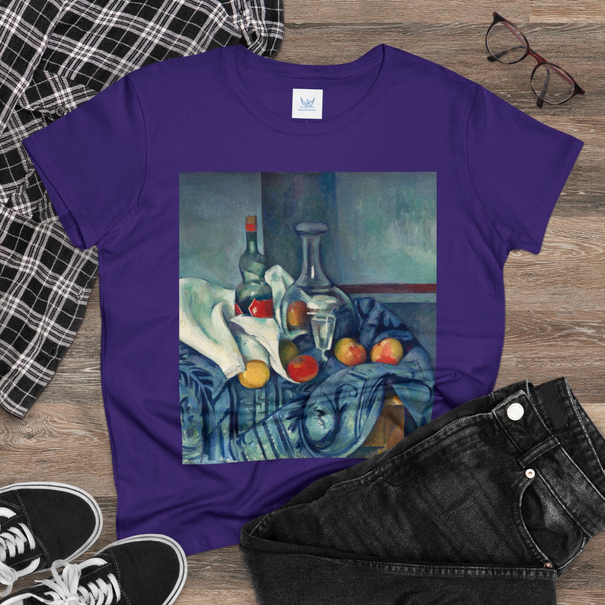 Artwork designed and digitally remastered by Sarasvati Designs. "The Peppermint Bottle" is an artwork created by the renowned French Post-Impressionist artist Paul Cézanne, believed to have been produced between 1893 and 1895. This painting is a striking example of Cézanne's innovative and influential style, which bridged the gap between Impressionism and the emergence of modern art in the 20th century. The painting presents a simple yet captivating still life composition. At the center of the artwork is a glass bottle containing peppermint liqueur. The bottle is placed on a table with a white tablecloth, and it is accompanied by other objects and utensils, such as a glass and a small dish. "The Peppermint Bottle," was highly influential in the development of modern art. His approach to form and space laid the groundwork for Cubism and other 20th-century art movements. This painting showcases his dedication to reimagining traditional still life through a modern lens.