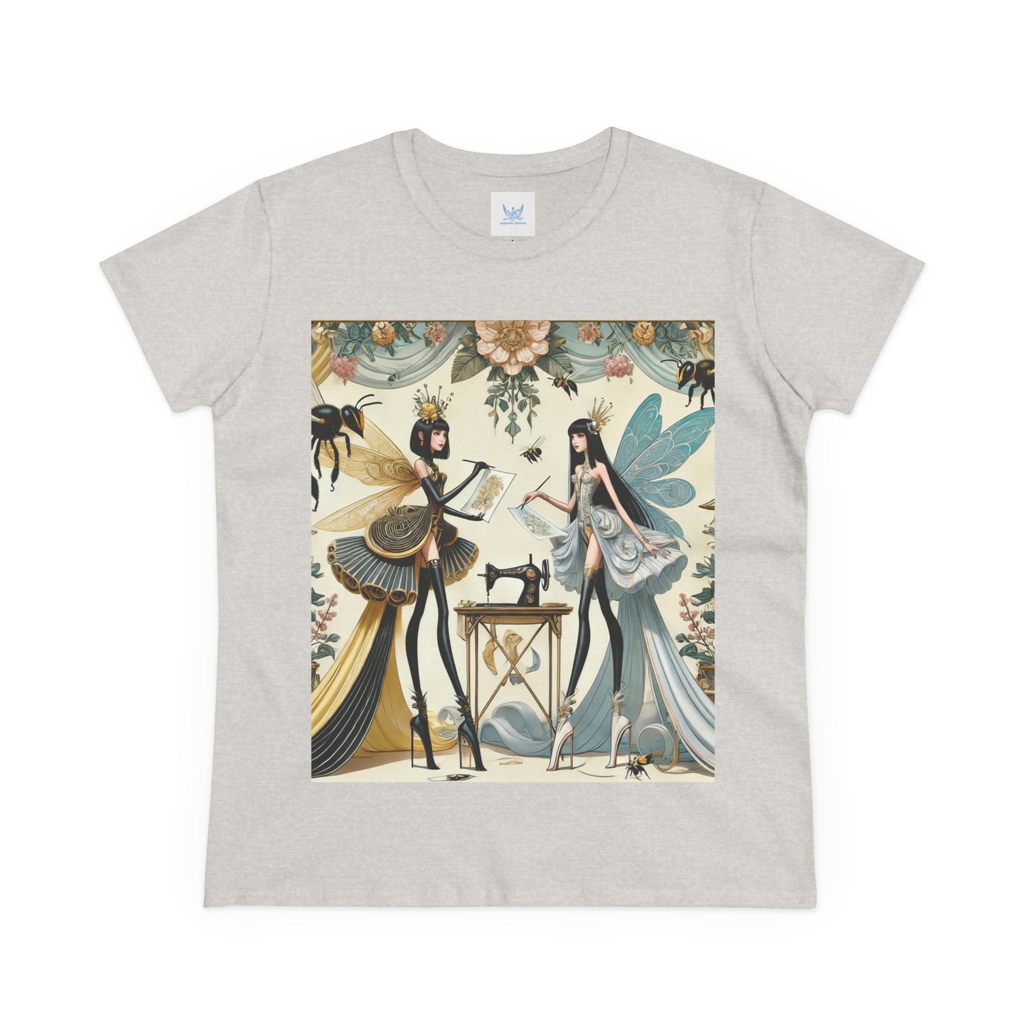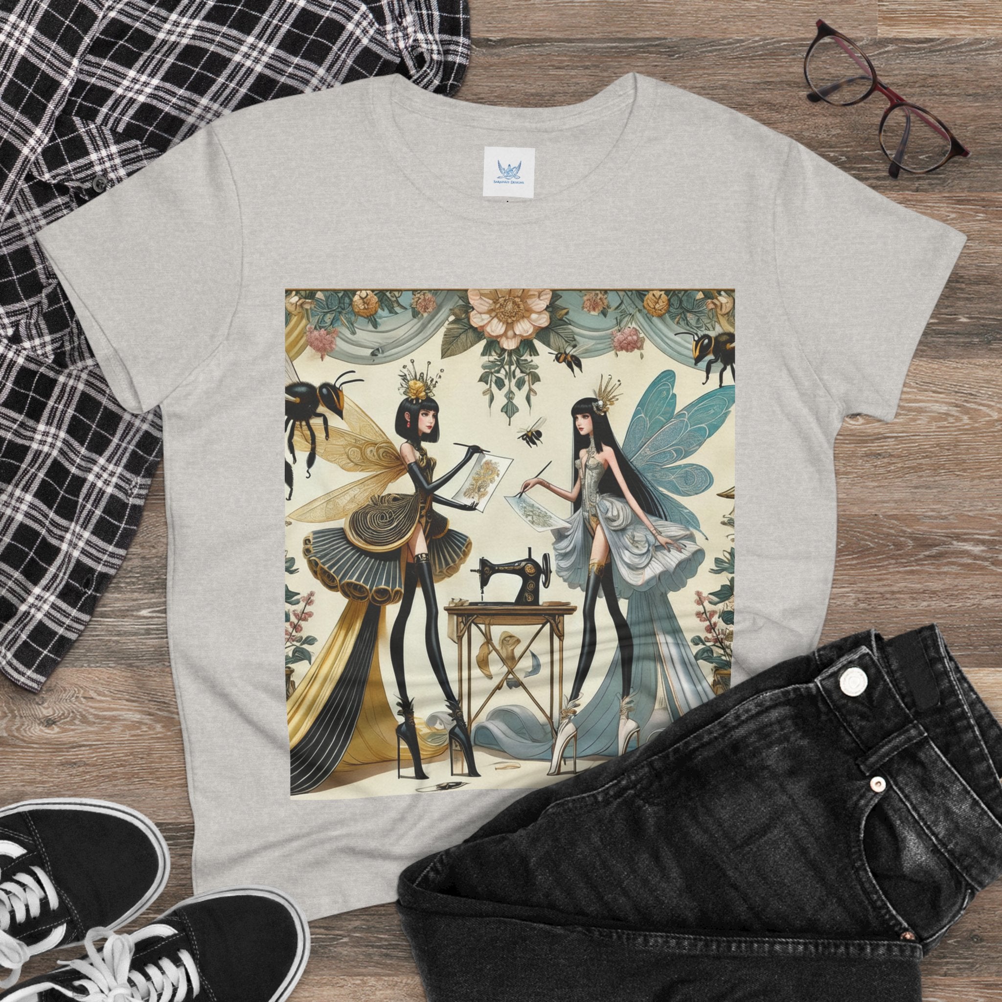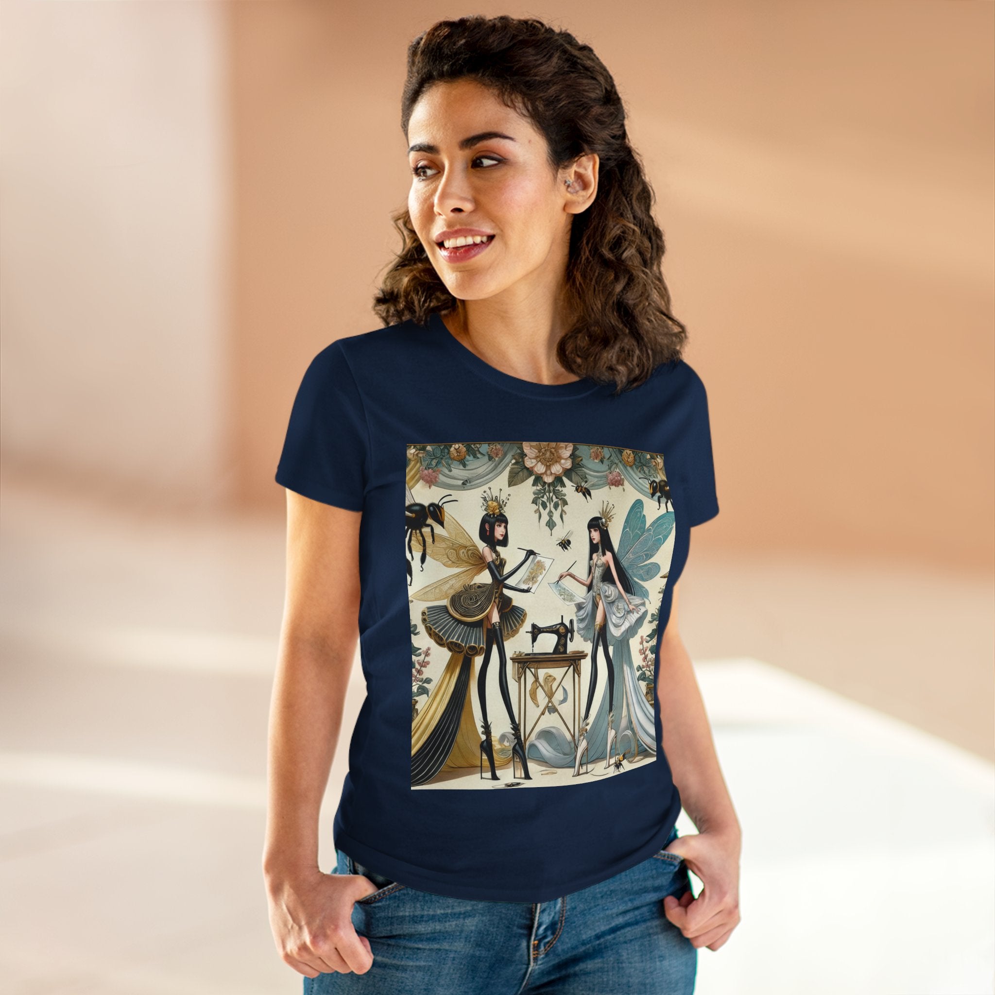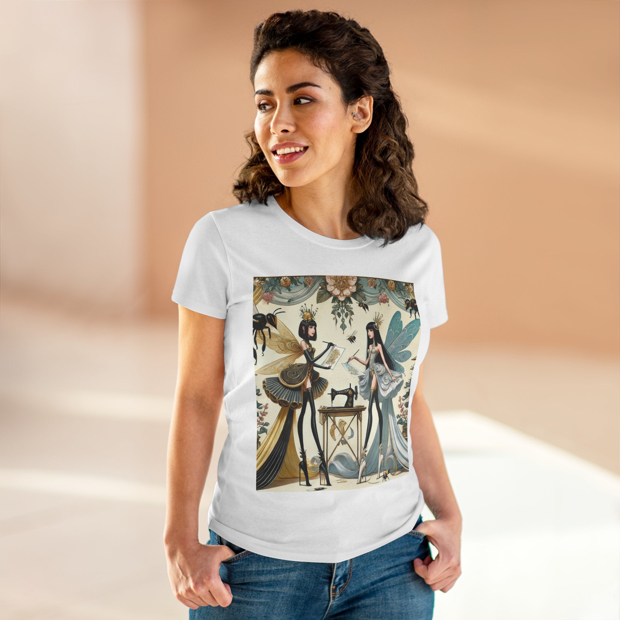 The Quiet Work of Fairies Cotton Tee What’s better than a soft, light cotton, quality t-shirt in your wardrobe? This comfy, contoured 100% cotton tee offers a semi-fitted silhouette and is pre-shrunk to ensure it stays a staple for longer. It features cap sleeves and a taped neck and shoulders. The artwork brings a fashion-forward fantasy mood to everyday wear, featuring two elegant fairies sharing a moment of design and reflection within a decorative interior. Bees drift through the scene as gentle symbols of focus and creative energy, while elongated silhouettes, couture-inspired gowns, and a balanced, dreamlike palette give the design a refined, modern fairy-tale feel.