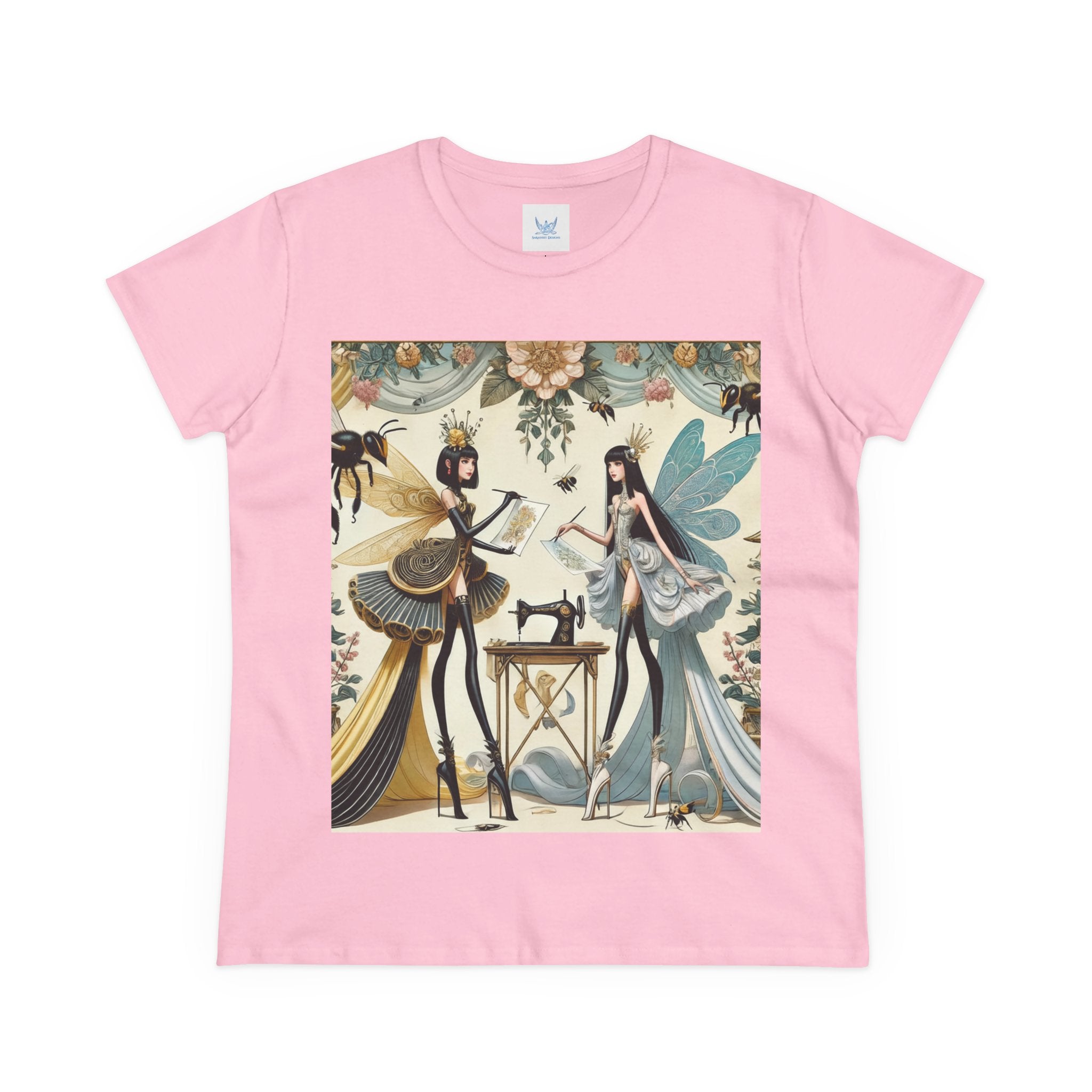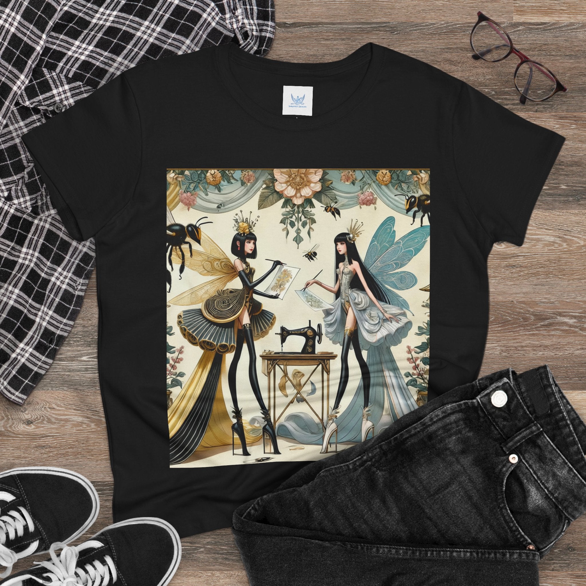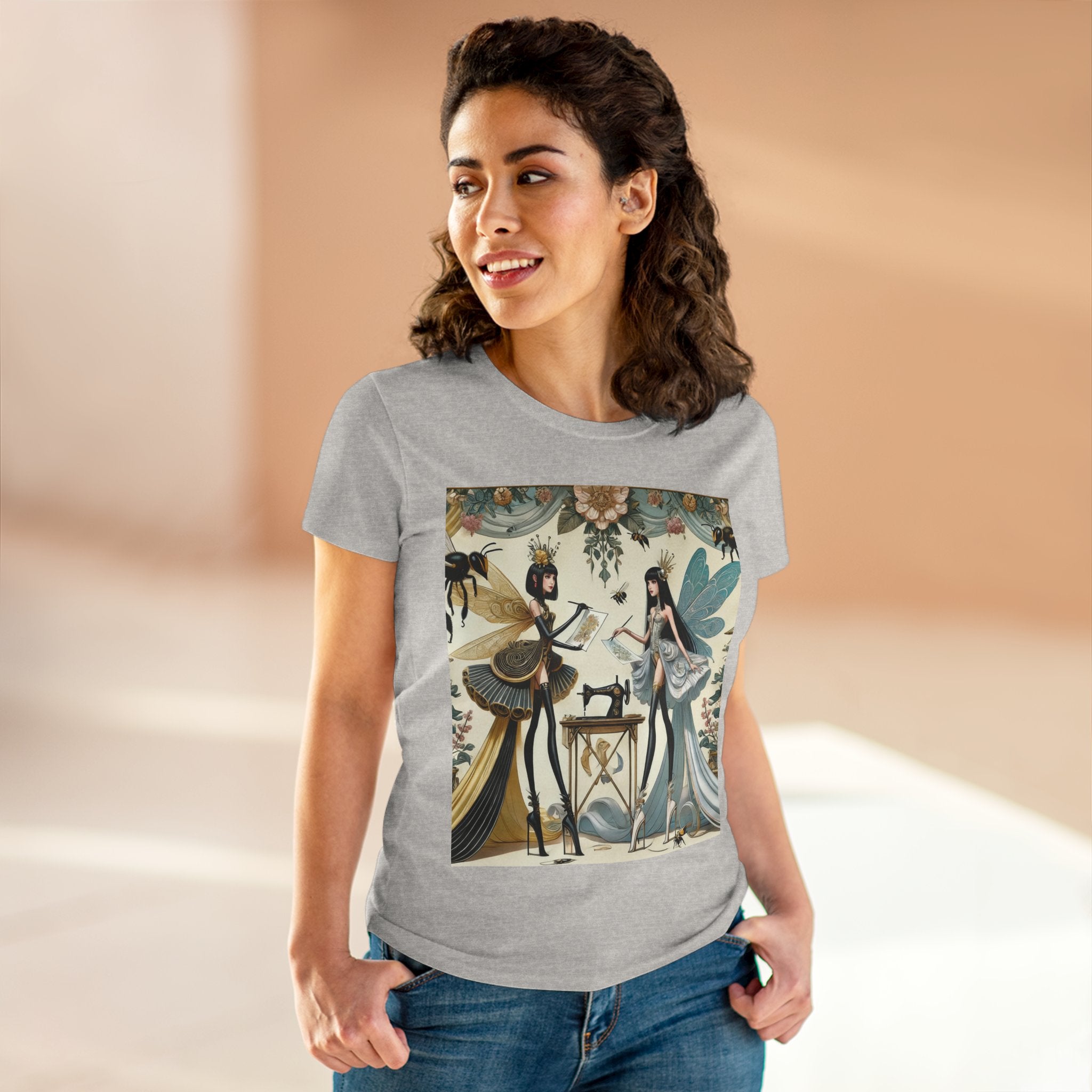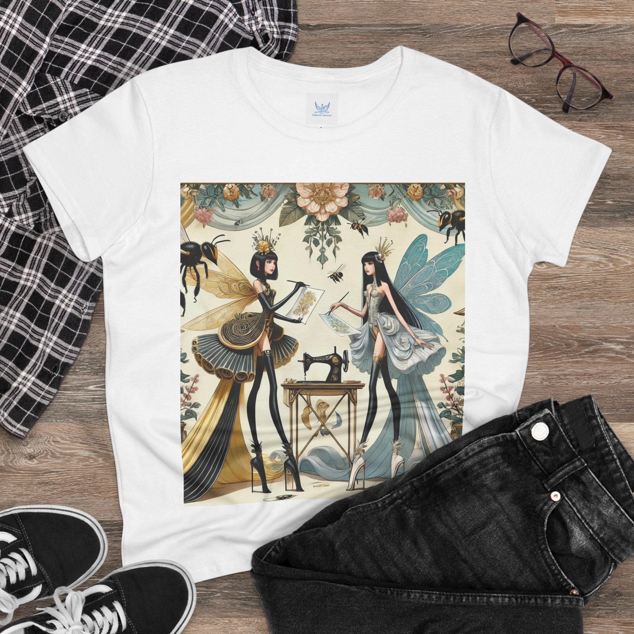The Quiet Work of Fairies Cotton Tee What’s better than a soft, light cotton, quality t-shirt in your wardrobe? This comfy, contoured 100% cotton tee offers a semi-fitted silhouette and is pre-shrunk to ensure it stays a staple for longer. It features cap sleeves and a taped neck and shoulders. The artwork brings a fashion-forward fantasy mood to everyday wear, featuring two elegant fairies sharing a moment of design and reflection within a decorative interior. Bees drift through the scene as gentle symbols of focus and creative energy, while elongated silhouettes, couture-inspired gowns, and a balanced, dreamlike palette give the design a refined, modern fairy-tale feel.