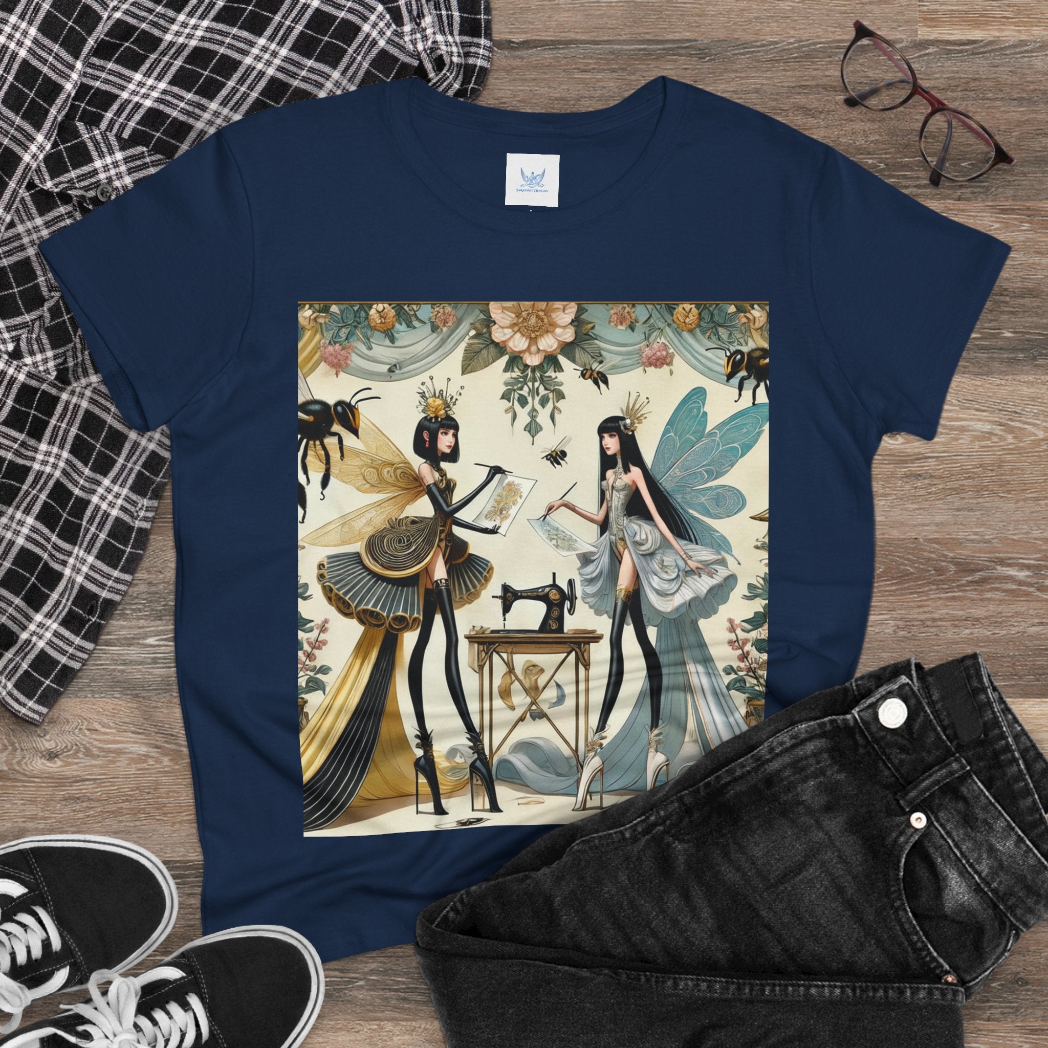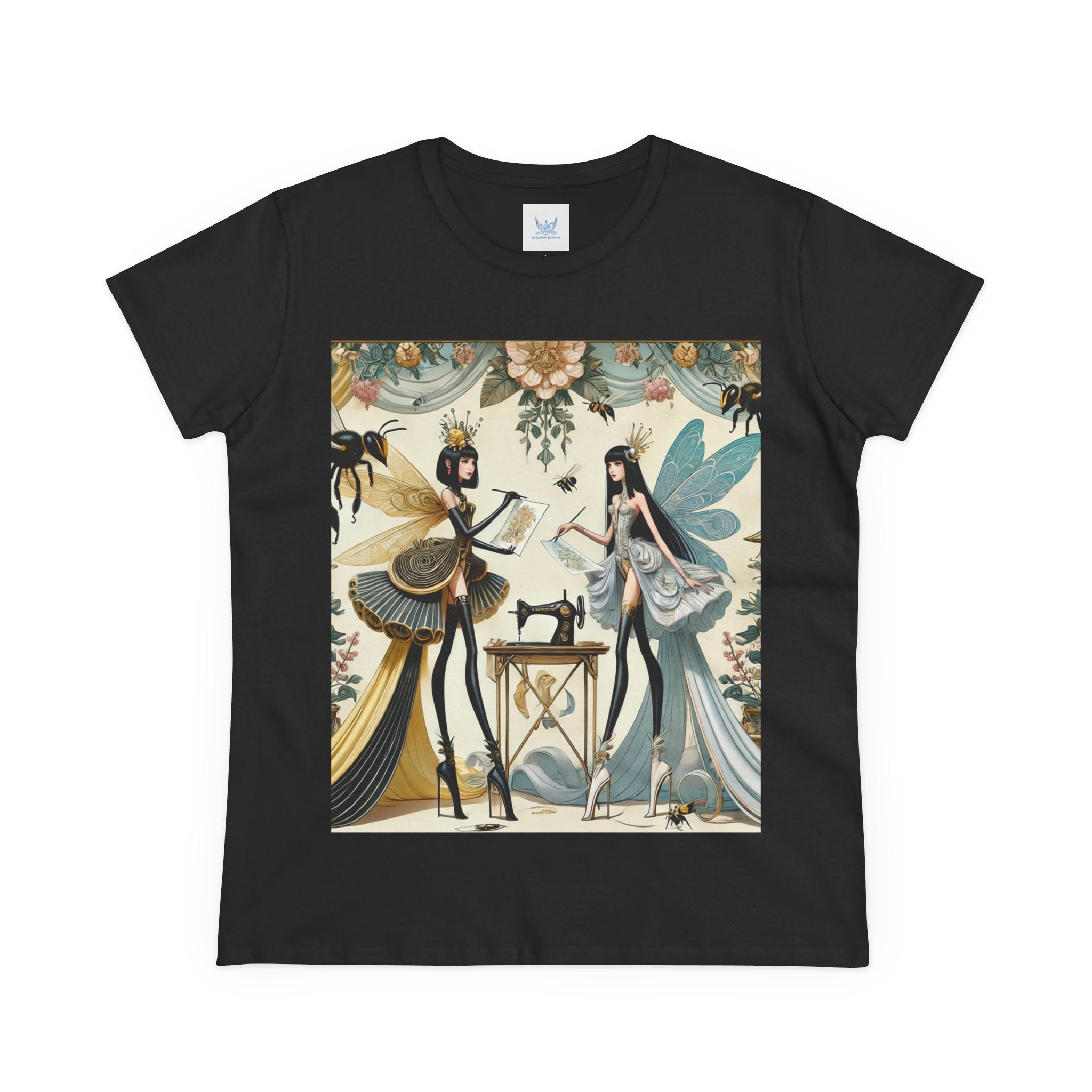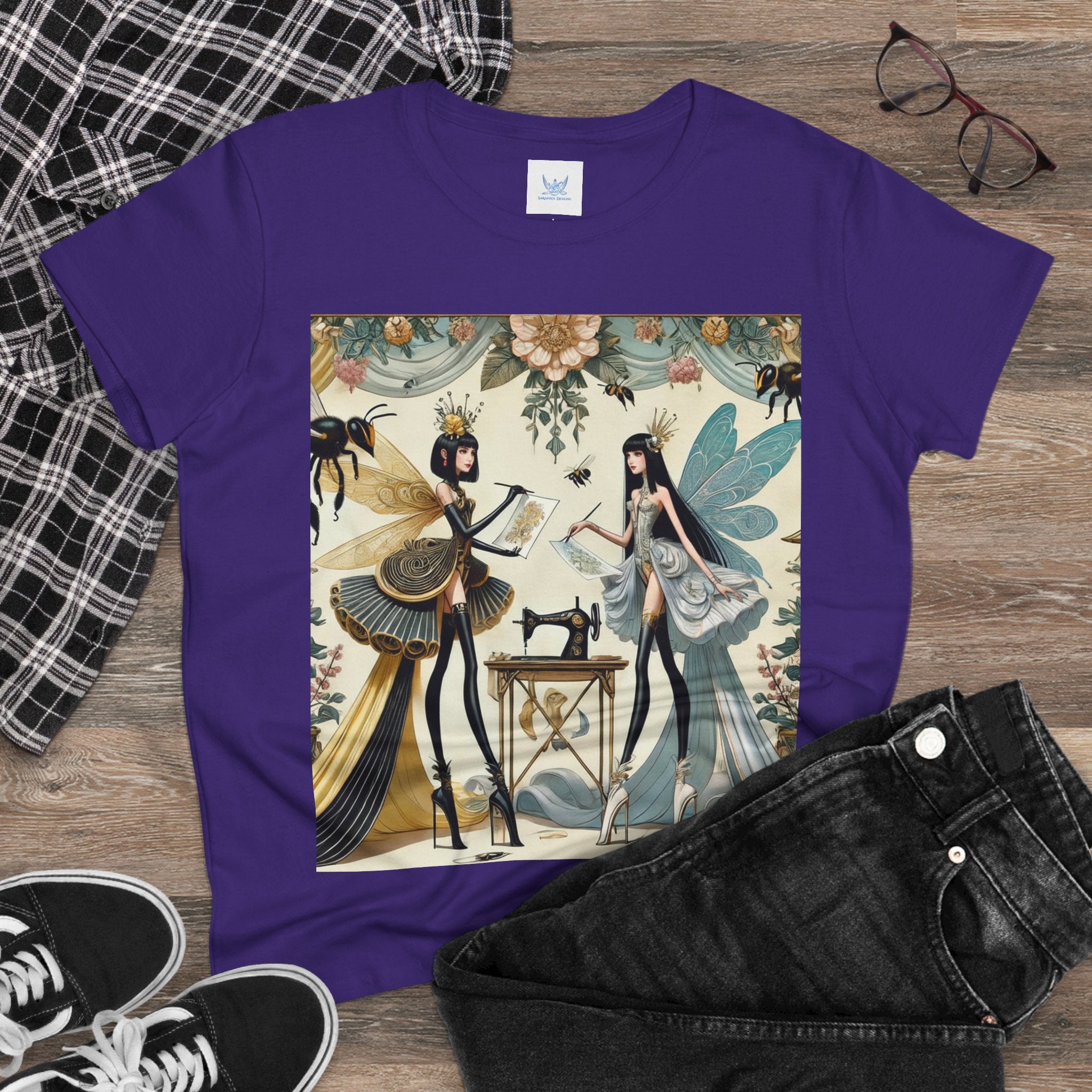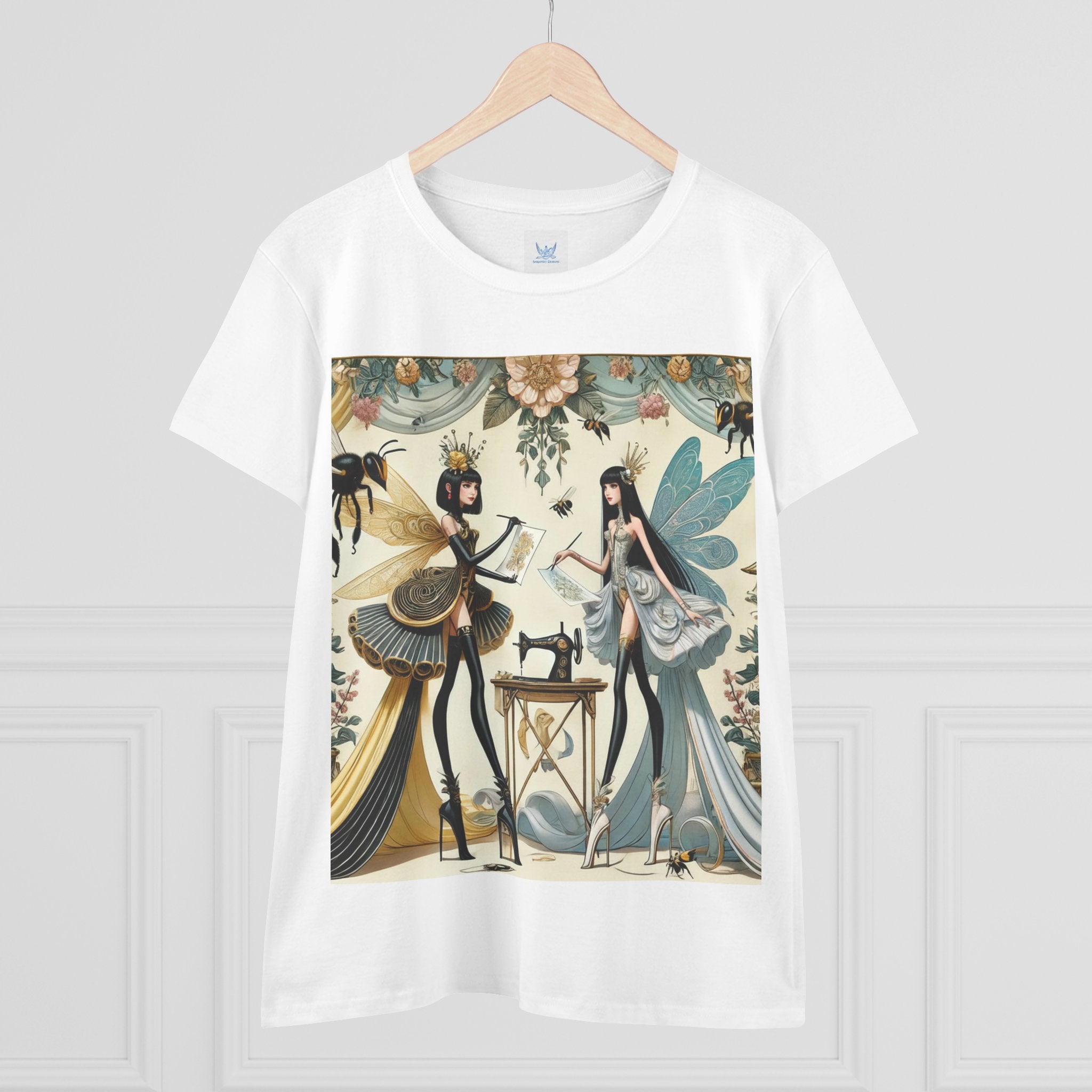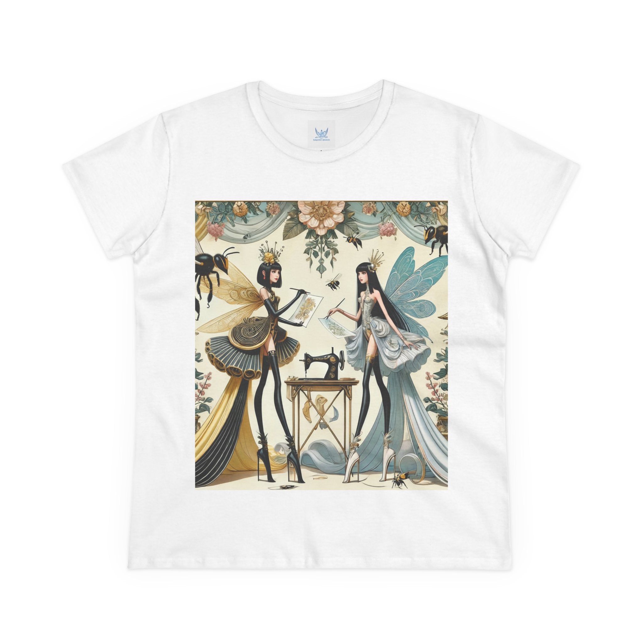The Quiet Work of Fairies Cotton Tee What’s better than a soft, light cotton, quality t-shirt in your wardrobe? This comfy, contoured 100% cotton tee offers a semi-fitted silhouette and is pre-shrunk to ensure it stays a staple for longer. It features cap sleeves and a taped neck and shoulders. The artwork brings a fashion-forward fantasy mood to everyday wear, featuring two elegant fairies sharing a moment of design and reflection within a decorative interior. Bees drift through the scene as gentle symbols of focus and creative energy, while elongated silhouettes, couture-inspired gowns, and a balanced, dreamlike palette give the design a refined, modern fairy-tale feel.
