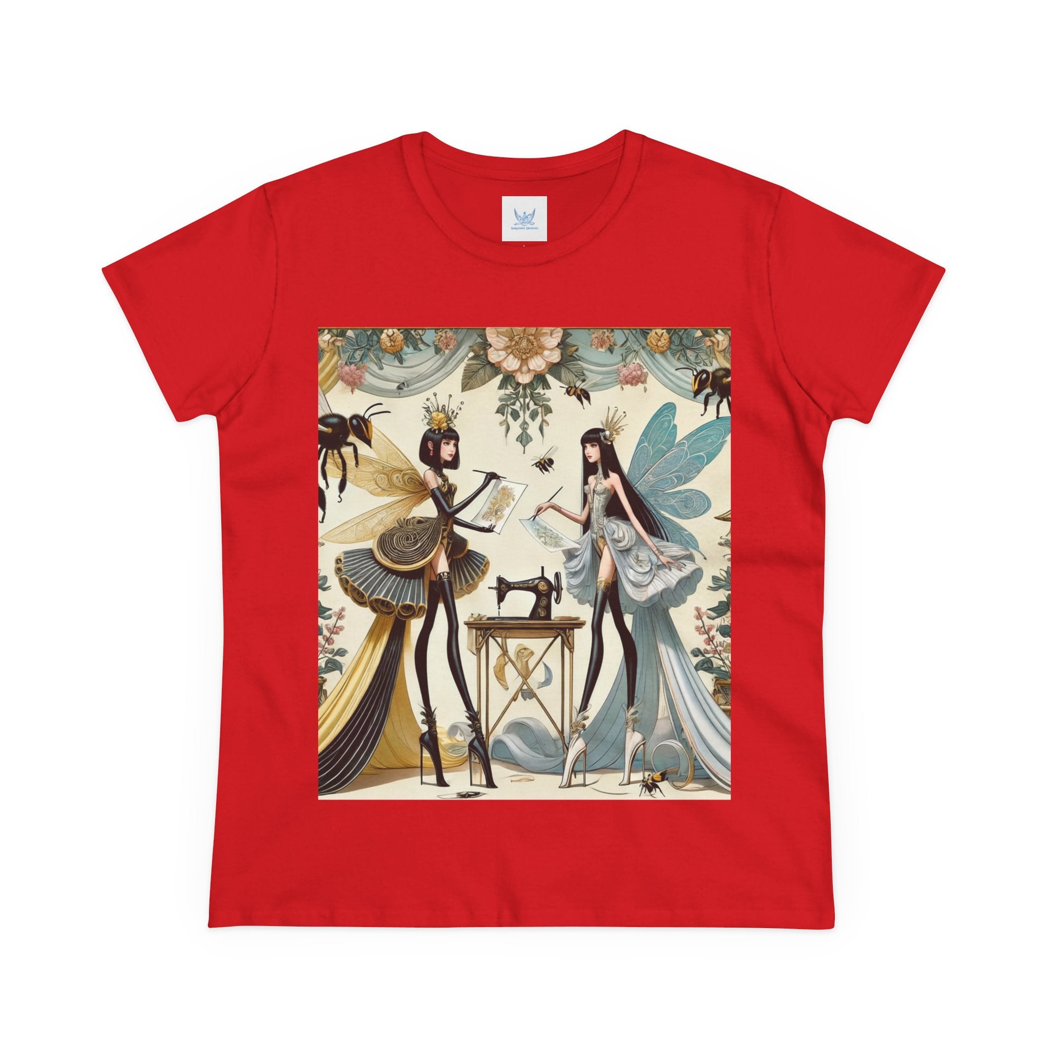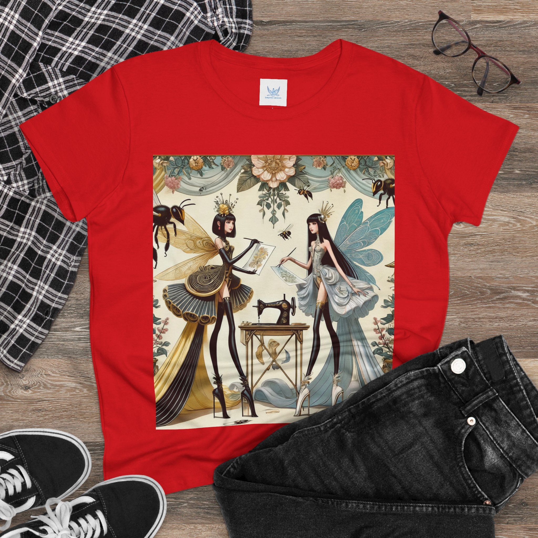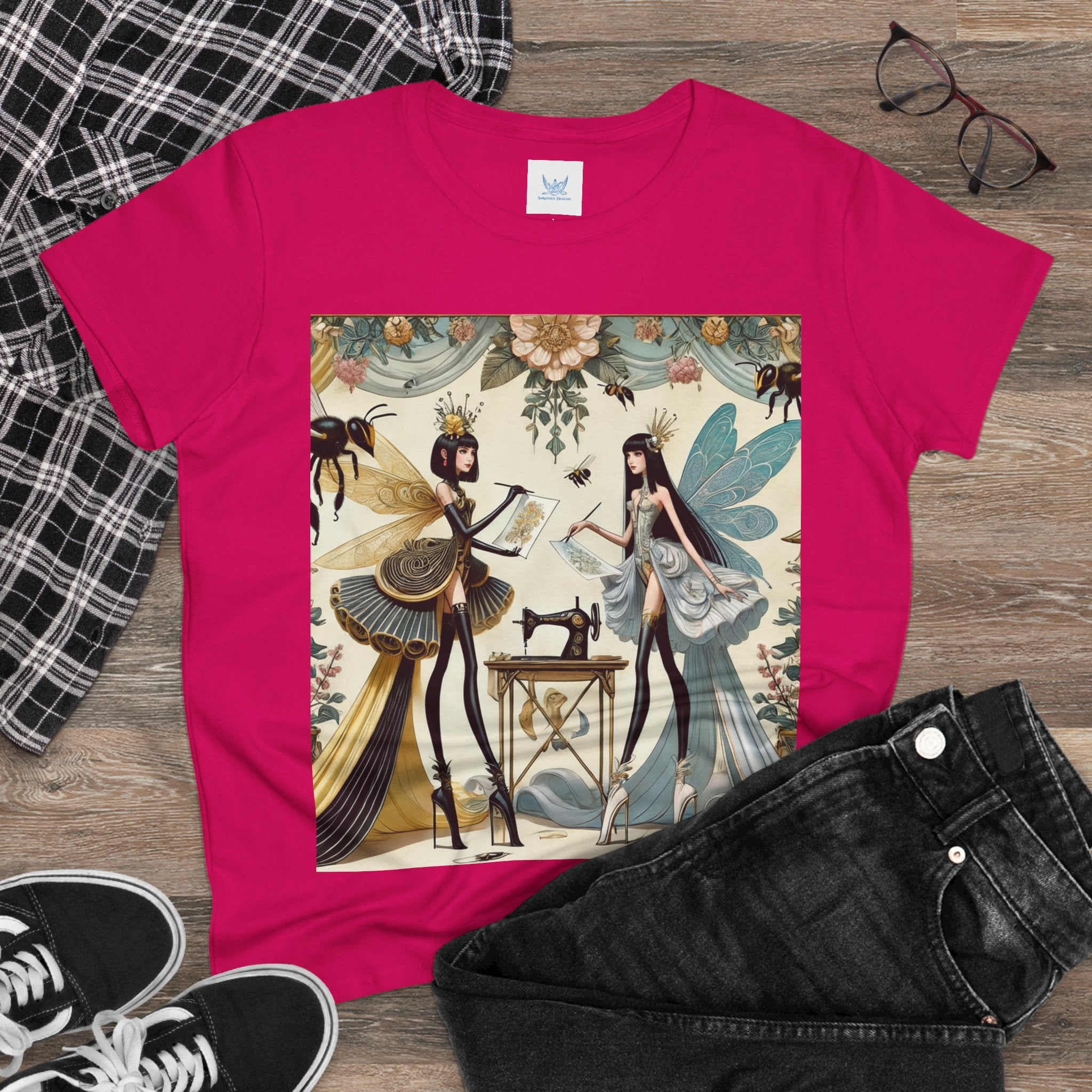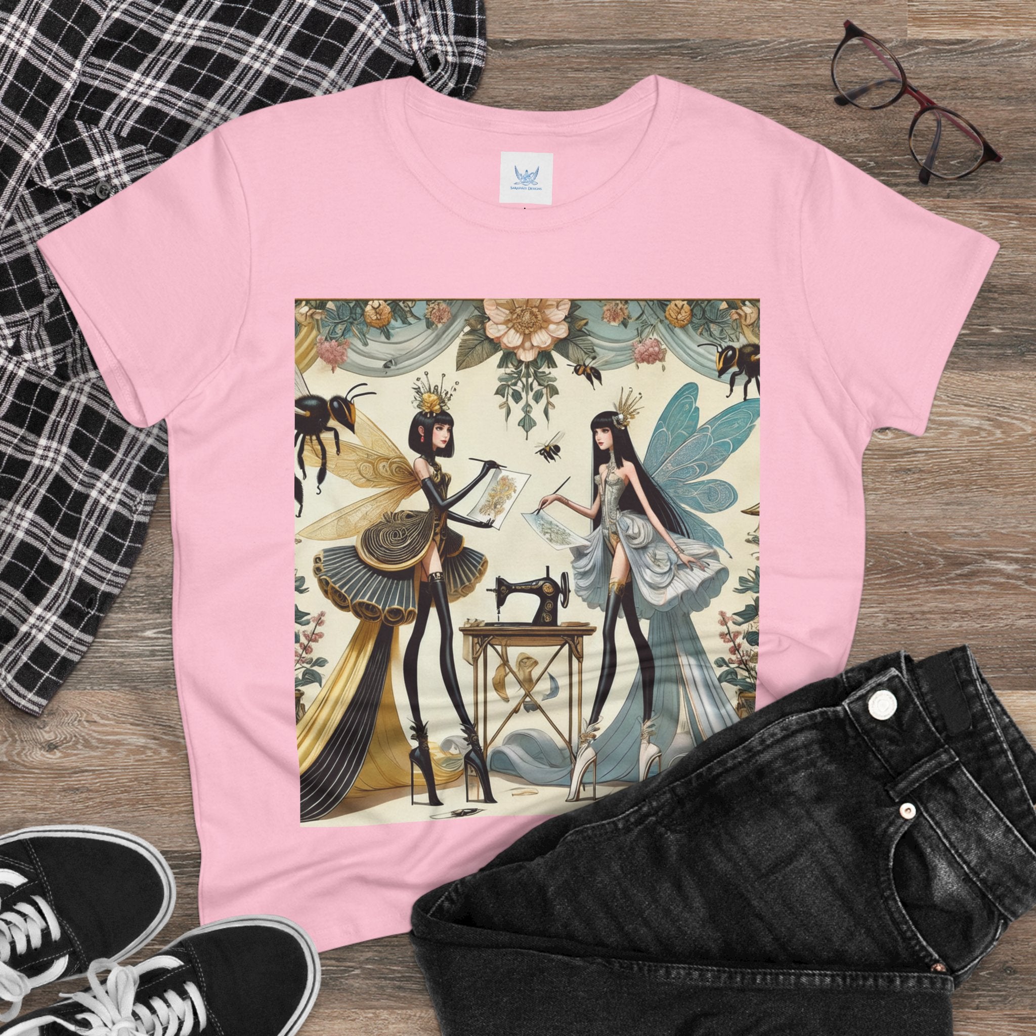 The Quiet Work of Fairies Cotton Tee What’s better than a soft, light cotton, quality t-shirt in your wardrobe? This comfy, contoured 100% cotton tee offers a semi-fitted silhouette and is pre-shrunk to ensure it stays a staple for longer. It features cap sleeves and a taped neck and shoulders. The artwork brings a fashion-forward fantasy mood to everyday wear, featuring two elegant fairies sharing a moment of design and reflection within a decorative interior. Bees drift through the scene as gentle symbols of focus and creative energy, while elongated silhouettes, couture-inspired gowns, and a balanced, dreamlike palette give the design a refined, modern fairy-tale feel.