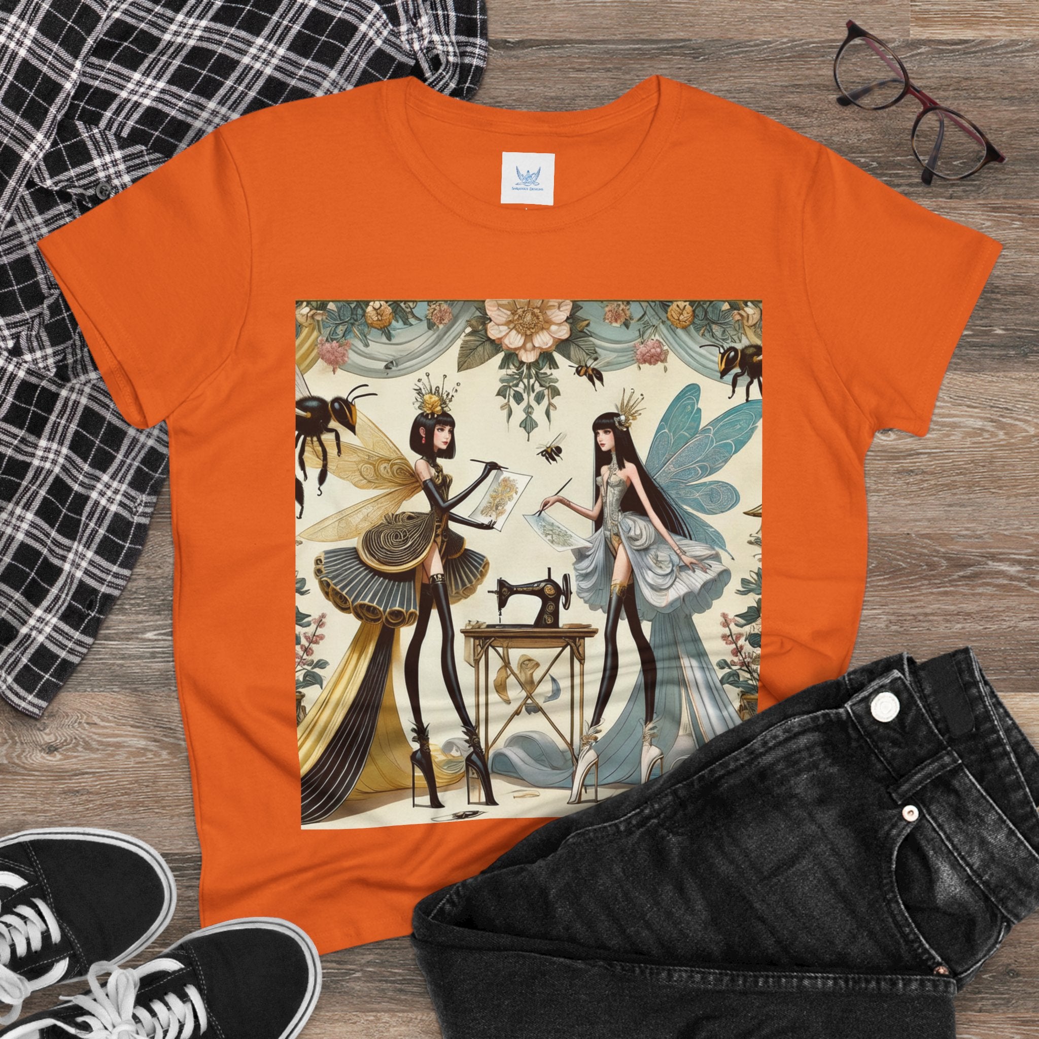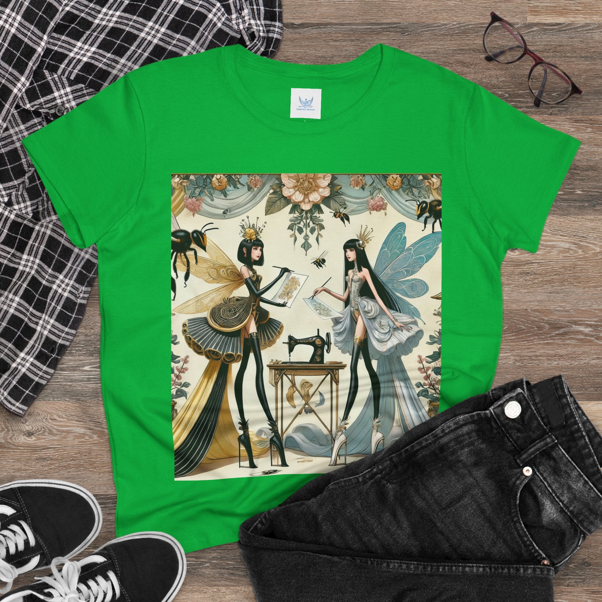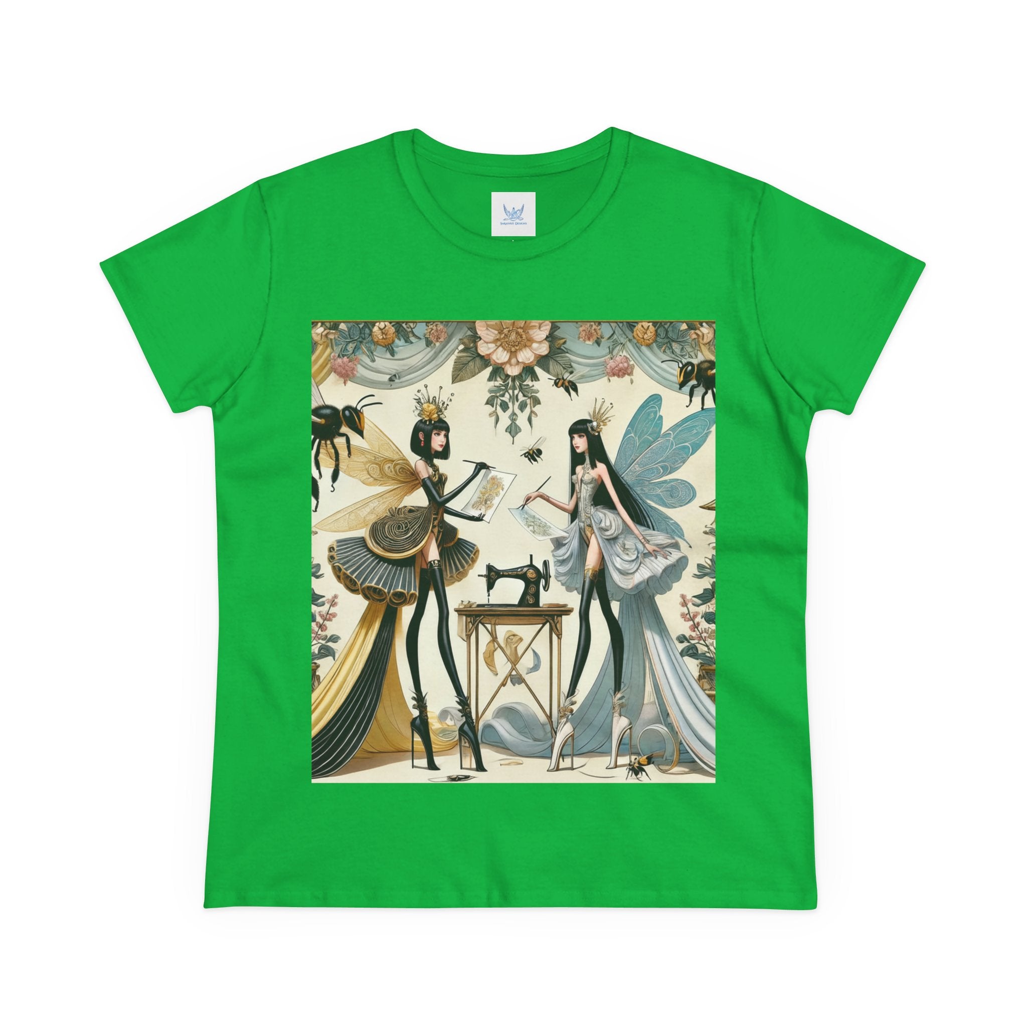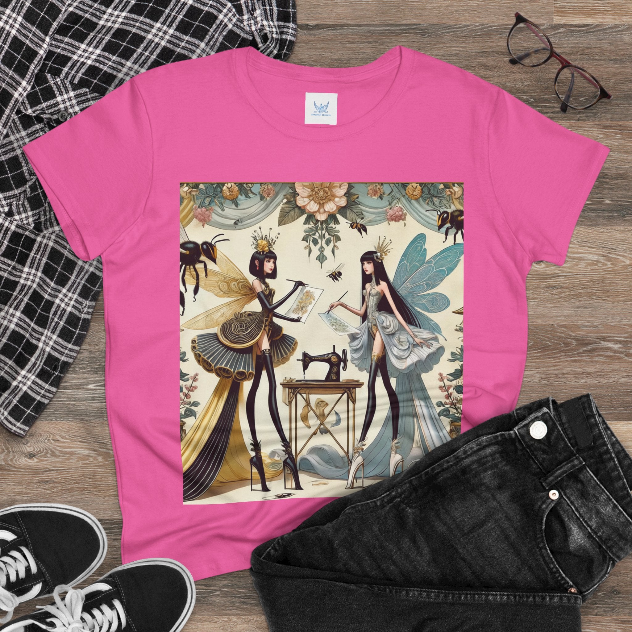 The Quiet Work of Fairies Cotton Tee What’s better than a soft, light cotton, quality t-shirt in your wardrobe? This comfy, contoured 100% cotton tee offers a semi-fitted silhouette and is pre-shrunk to ensure it stays a staple for longer. It features cap sleeves and a taped neck and shoulders. The artwork brings a fashion-forward fantasy mood to everyday wear, featuring two elegant fairies sharing a moment of design and reflection within a decorative interior. Bees drift through the scene as gentle symbols of focus and creative energy, while elongated silhouettes, couture-inspired gowns, and a balanced, dreamlike palette give the design a refined, modern fairy-tale feel.