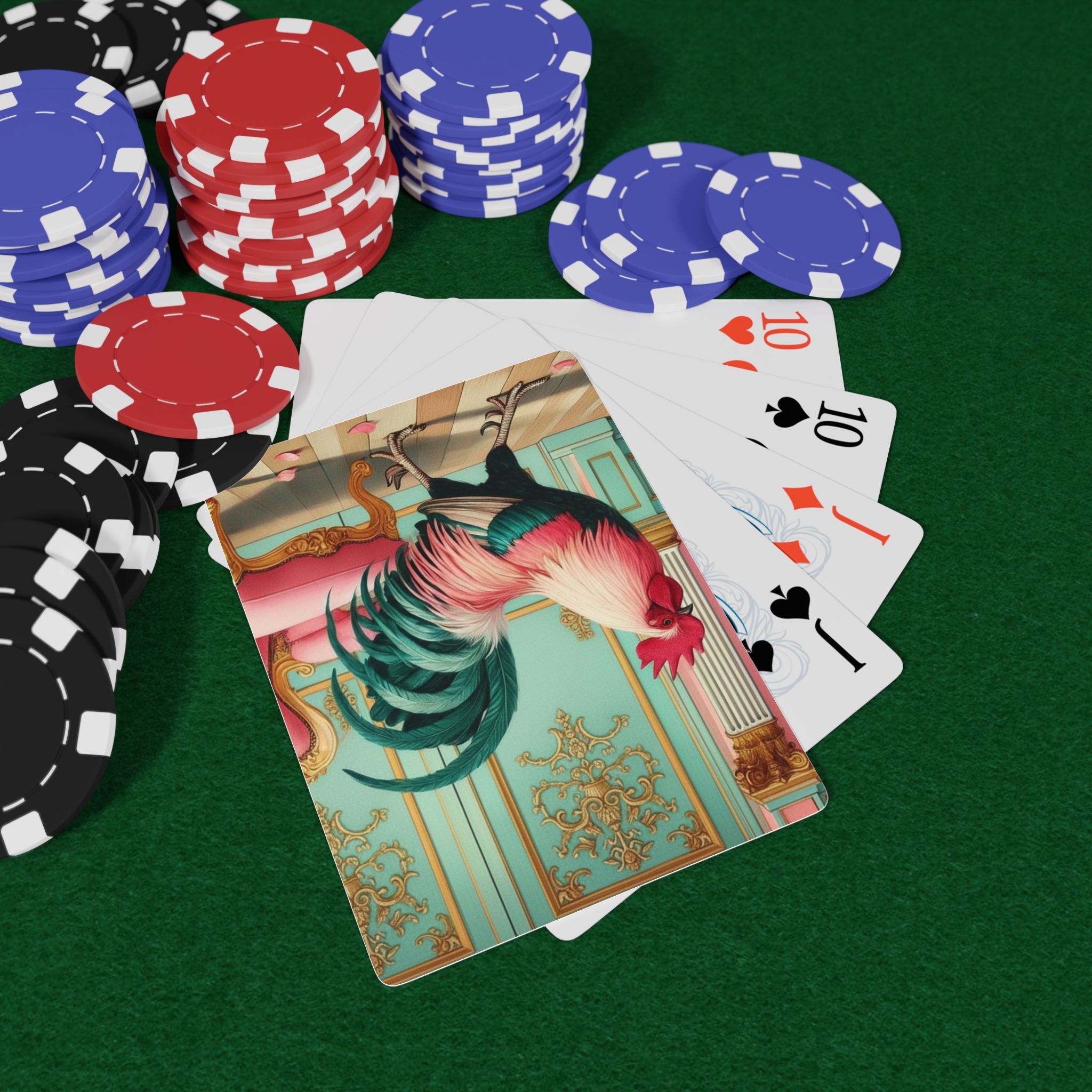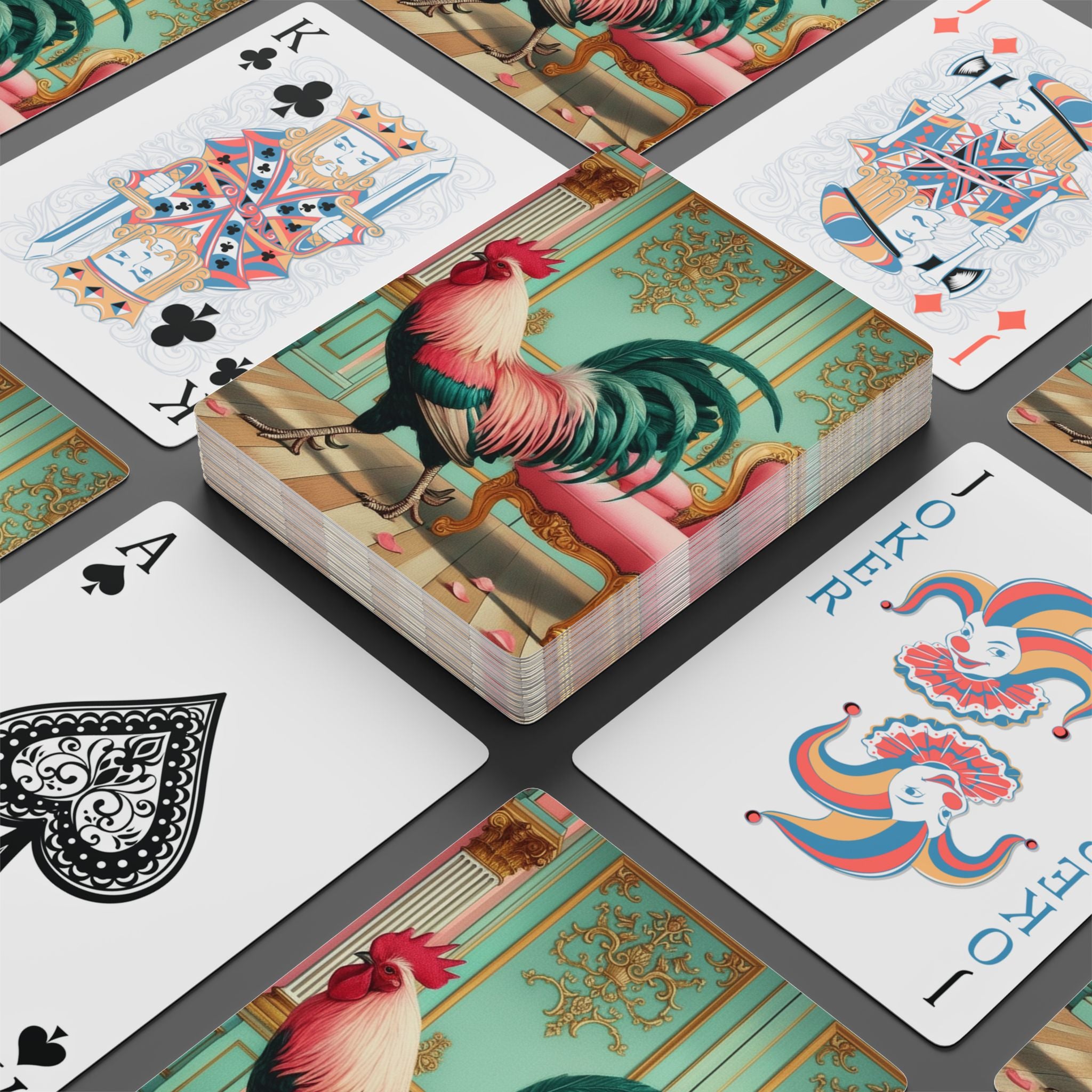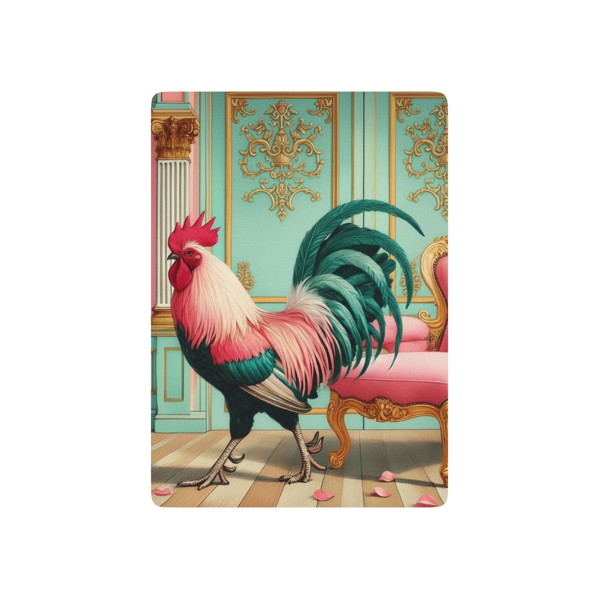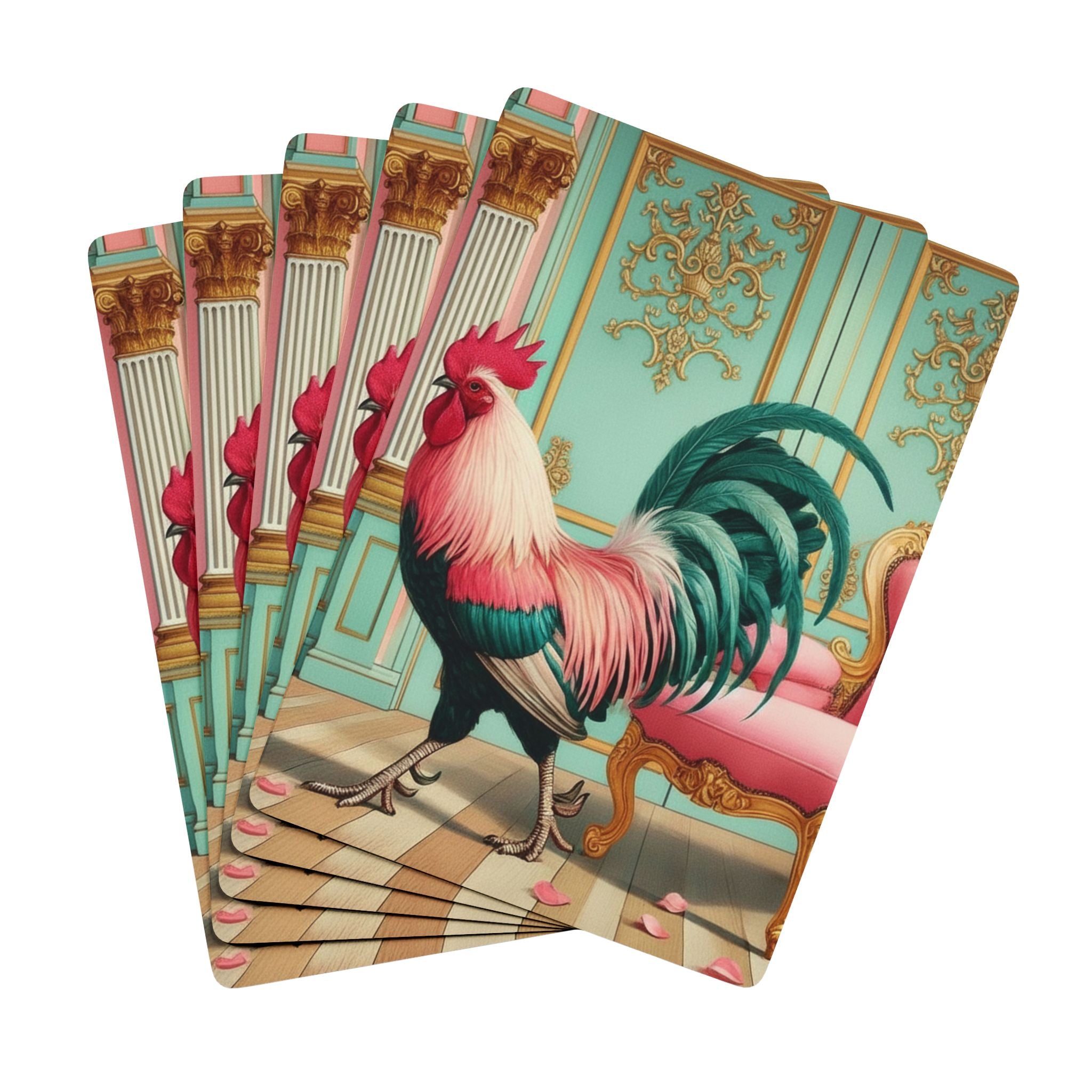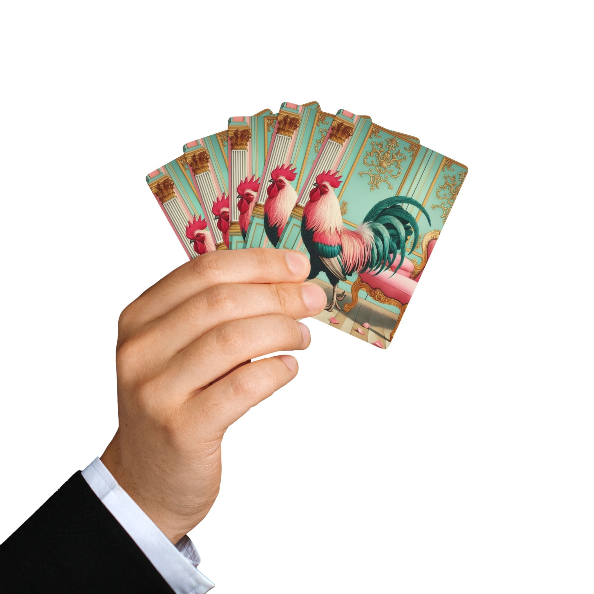 The Salon Rooster Playing Cards turn game night into a little rococo theater, where an unexpected aristocrat poses amid gilded walls and pastel grandeur. With iridescent feathers in shades of emerald, blush, and ivory, the rooster surveys a lavish interior where a tufted pink fauteuil, carved gold accents, and scattered rose petals suggest a world of refined indulgence. Equal parts wit and elegance, the scene playfully blurs the line between portraiture and fantasy—celebrating vanity, character, and the charm of the absurd as a humble rooster becomes a flamboyant icon of style and presence.