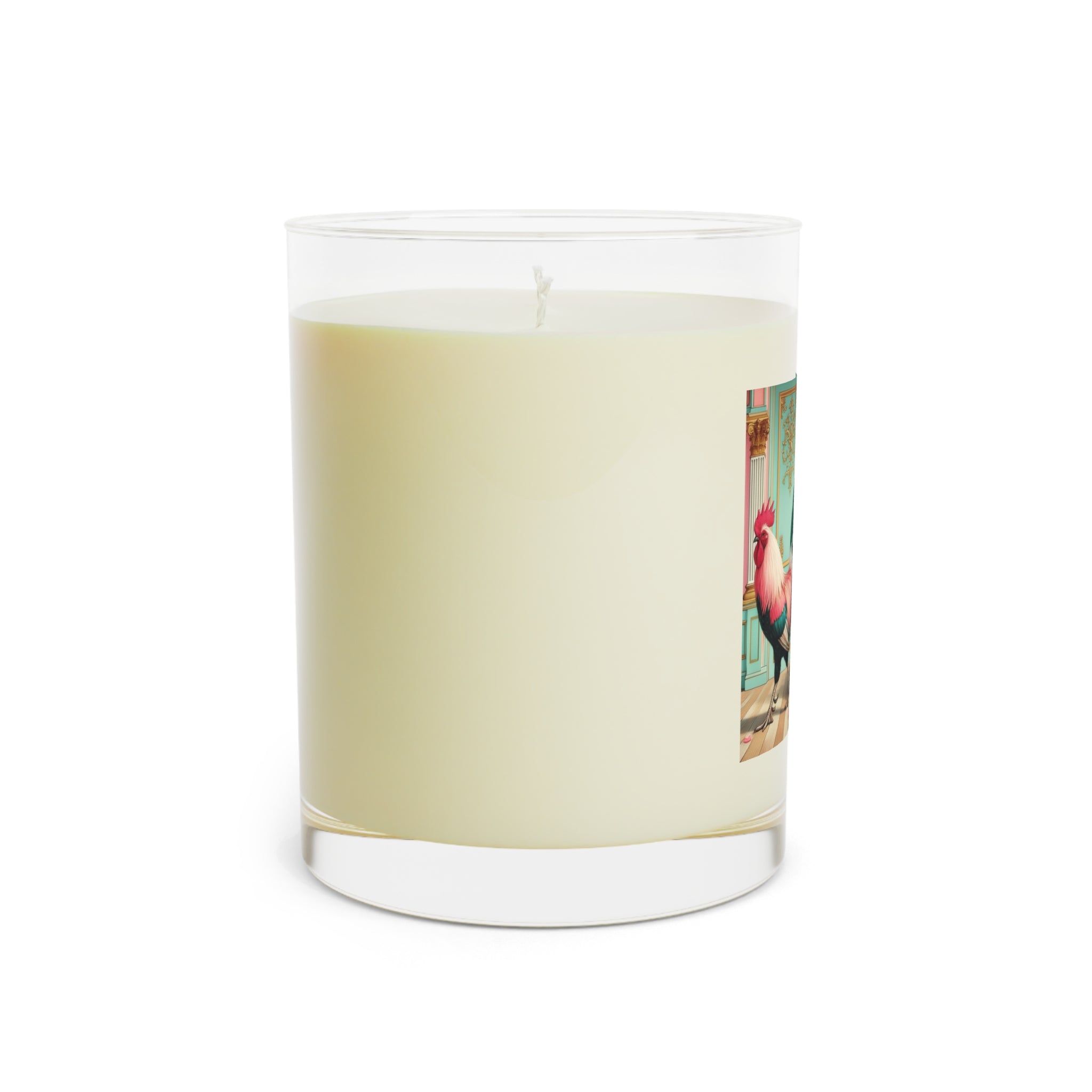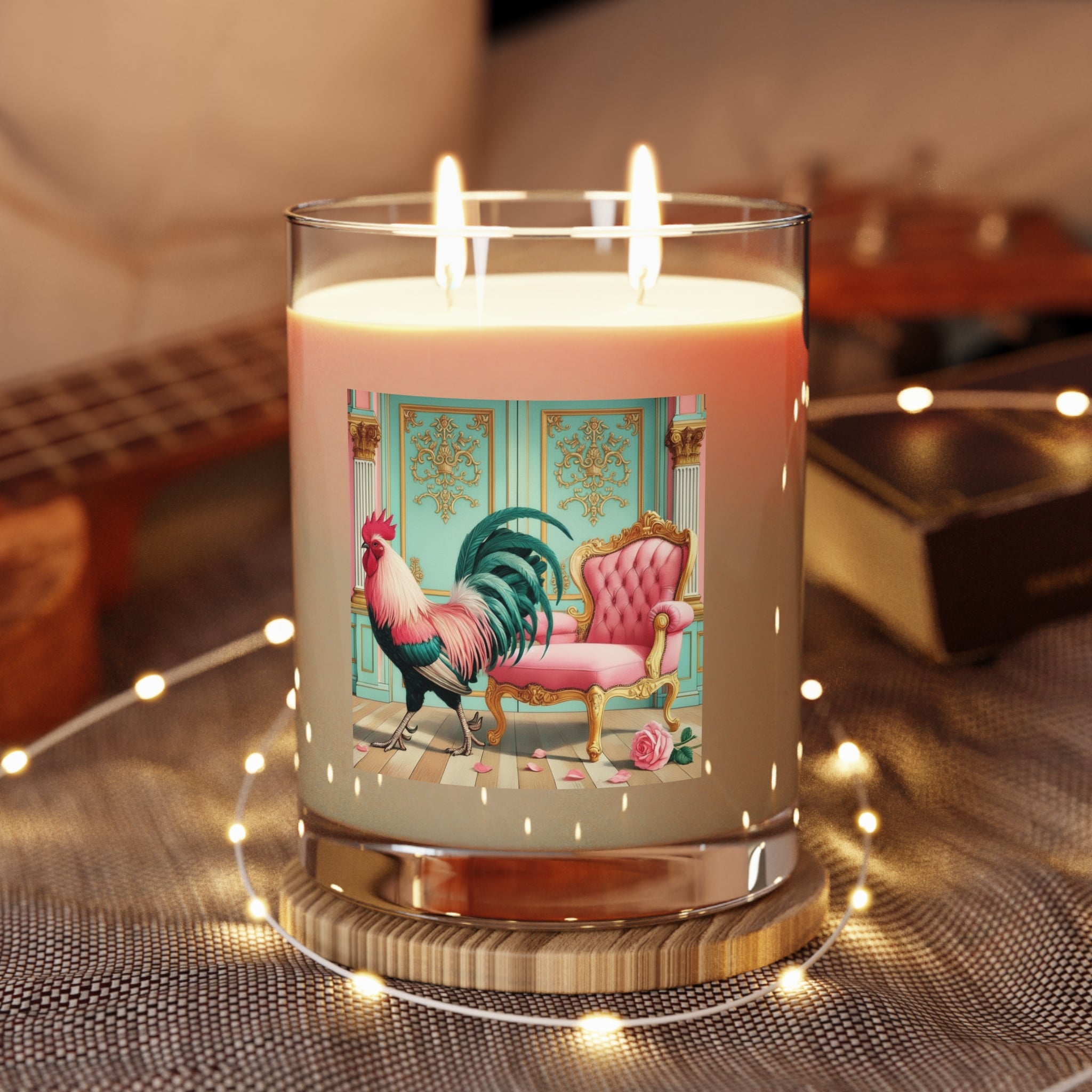 The Salon Rooster Scented Candle - Full Glass, 11oz invites you to breathe in, breathe out, and settle into a moment of playful grandeur. Poised with theatrical confidence, The Salon Rooster stands as an unexpected aristocrat amid gilded walls and pastel splendor. With iridescent feathers in shades of emerald, blush, and ivory, the rooster surveys a lavish interior where a tufted pink fauteuil, carved gold accents, and scattered rose petals suggest a world of refined indulgence. Equal parts wit and elegance, the scene blurs the line between portraiture and fantasy, transforming a humble rooster into a flamboyant icon of style and presence.