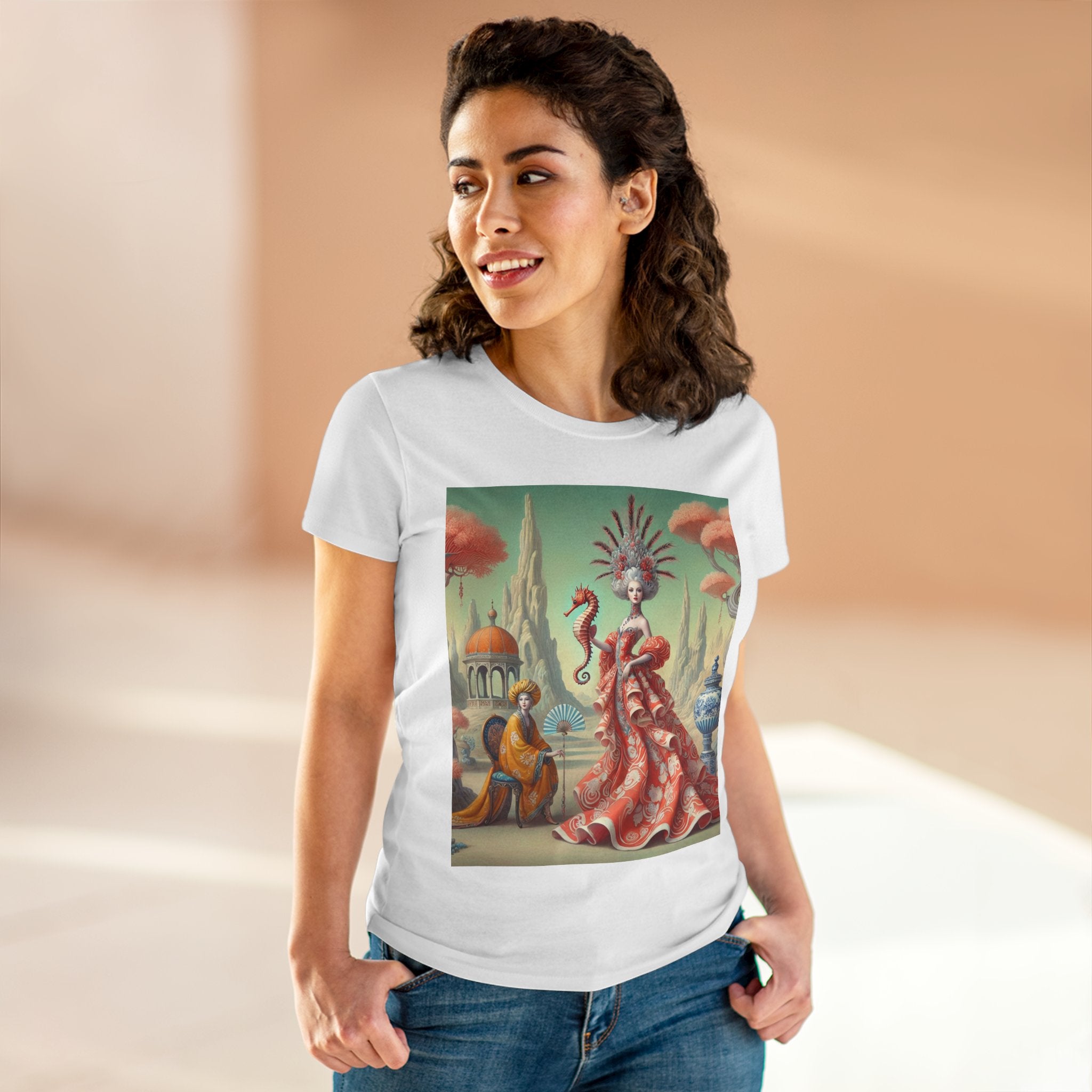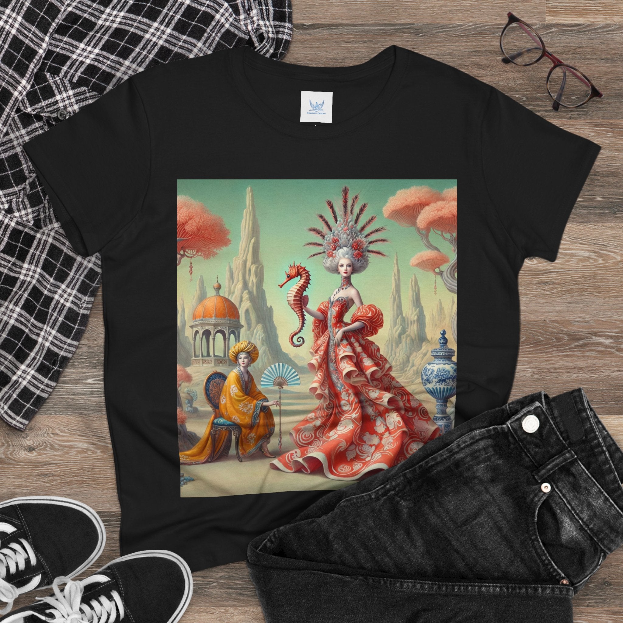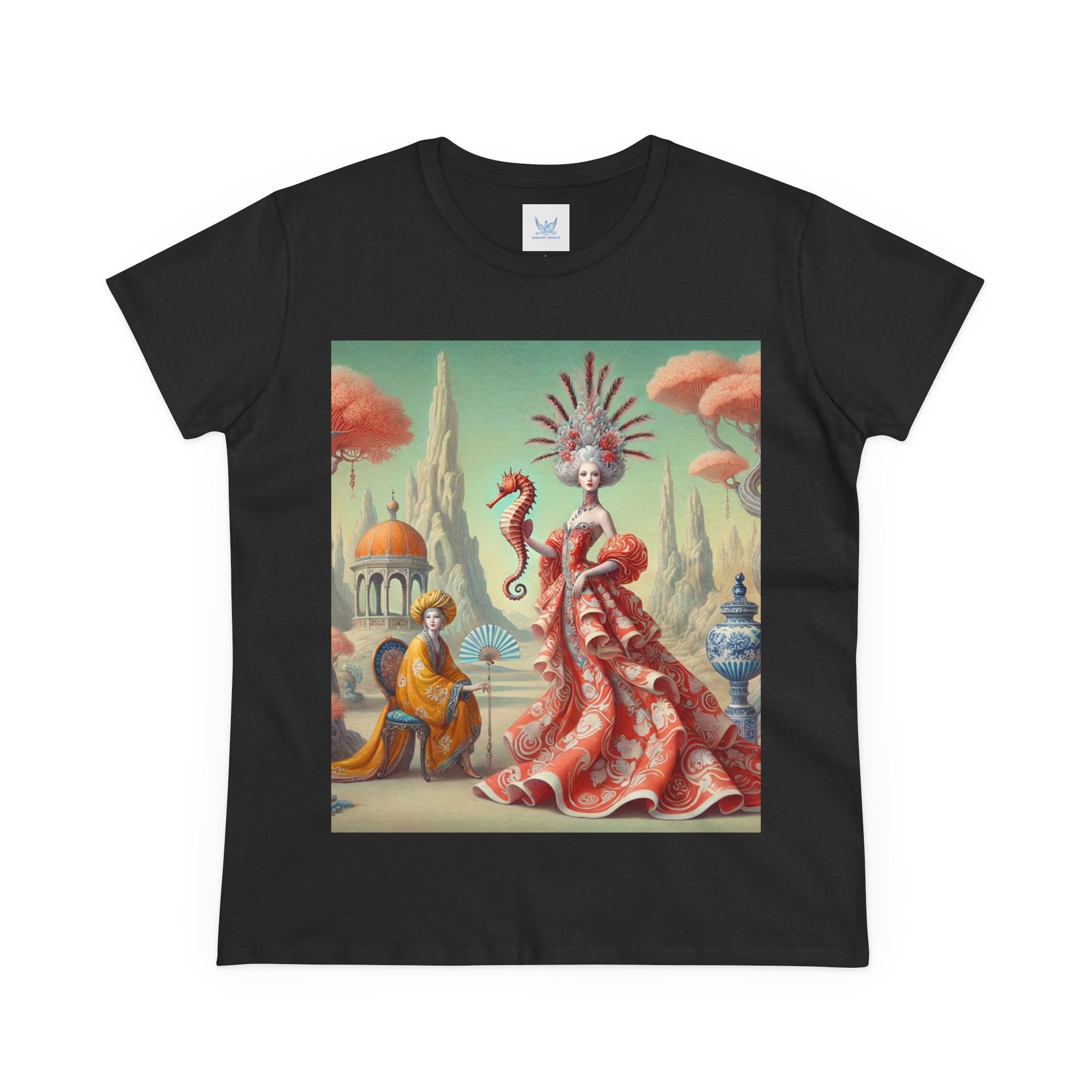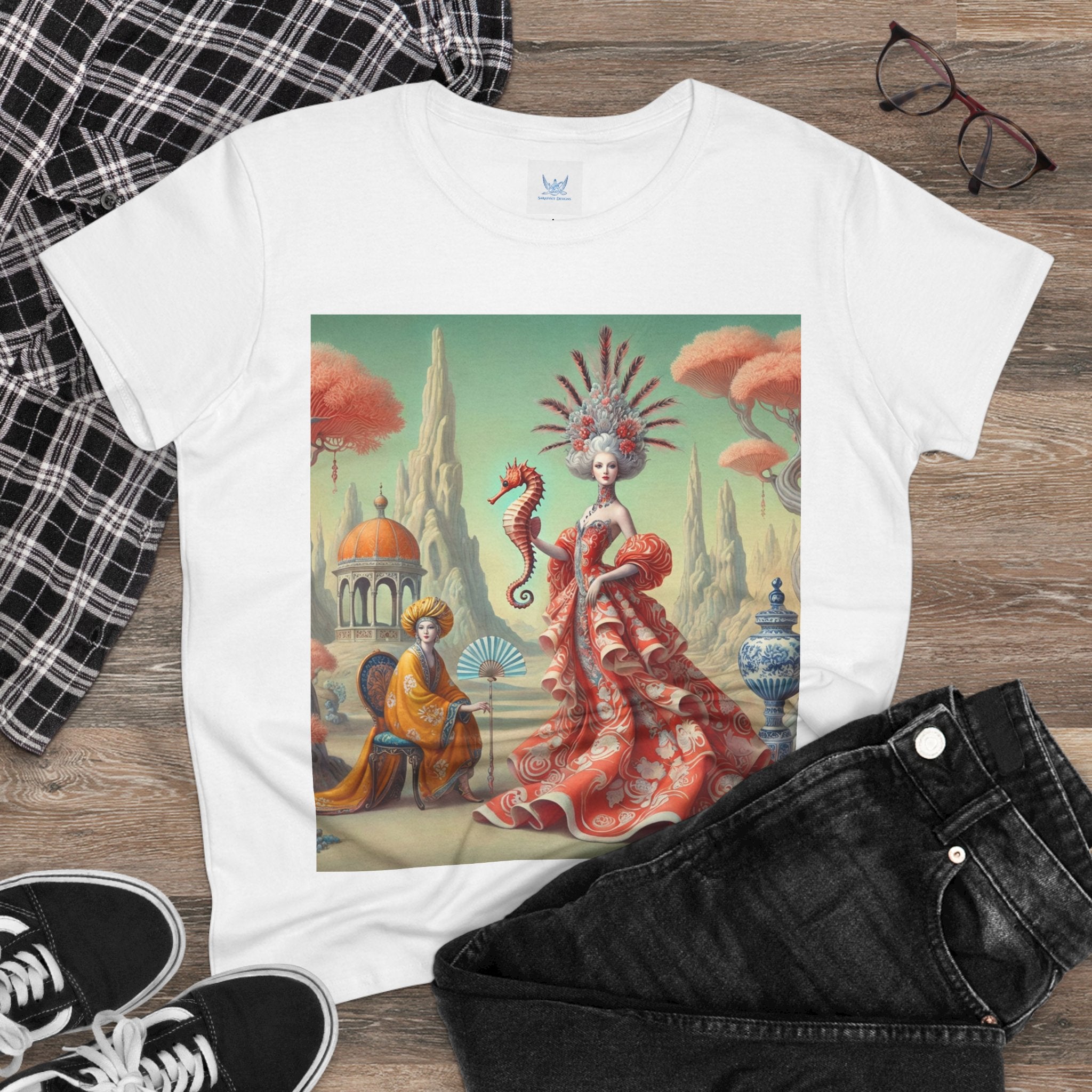The Seahorse Court Cotton Tee brings art into everyday wear, pairing a soft, lightweight cotton shirt with a refined, storybook scene designed to feel both wearable and expressive. The semi-fitted silhouette offers a flattering shape while remaining comfortable enough for daily use, making it an easy staple for art lovers who want something distinctive yet effortless.