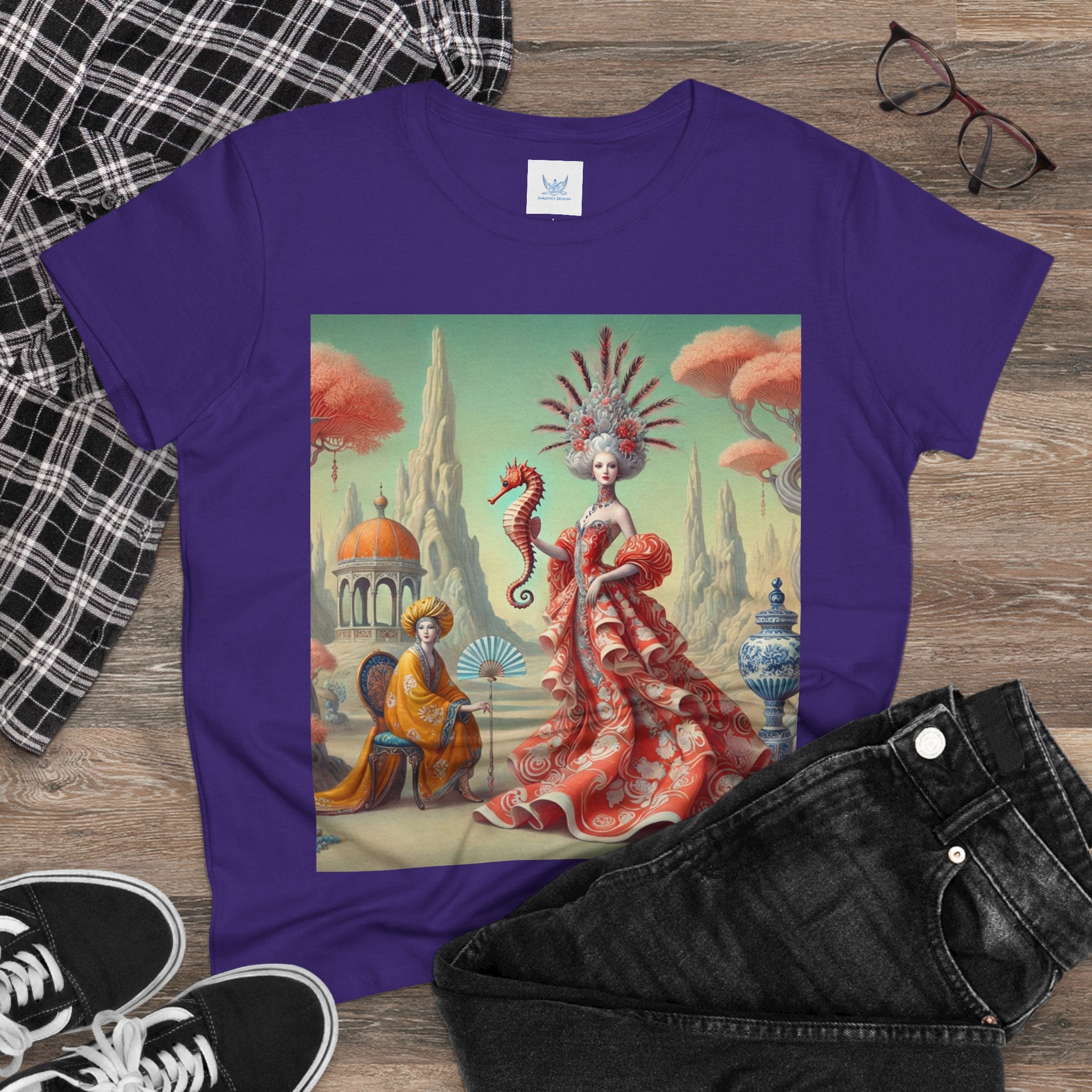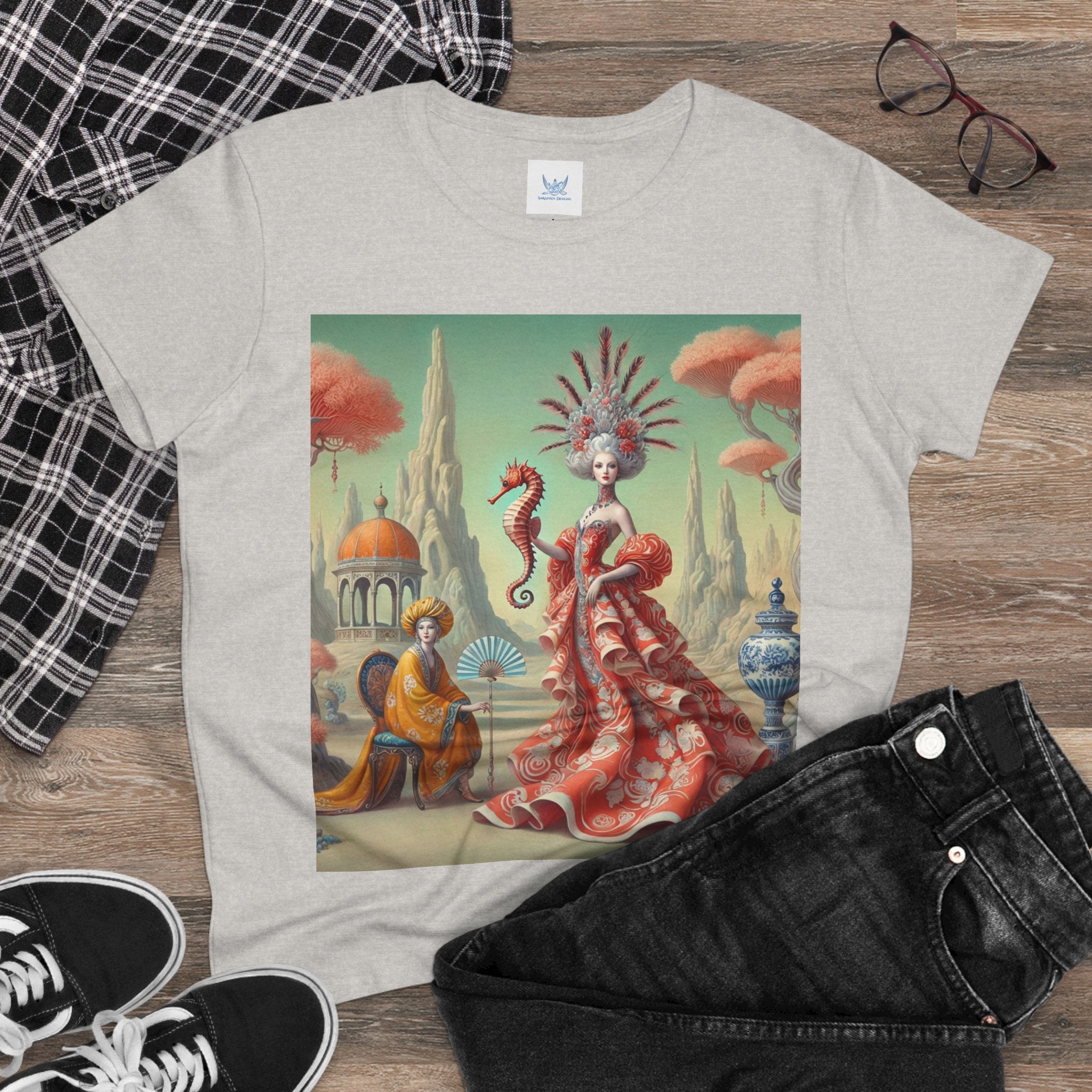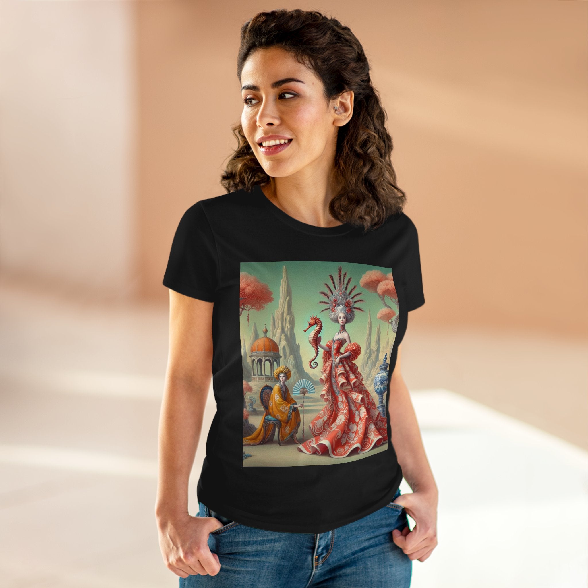 The Seahorse Court Cotton Tee brings art into everyday wear, pairing a soft, lightweight cotton shirt with a refined, storybook scene designed to feel both wearable and expressive. The semi-fitted silhouette offers a flattering shape while remaining comfortable enough for daily use, making it an easy staple for art lovers who want something distinctive yet effortless.