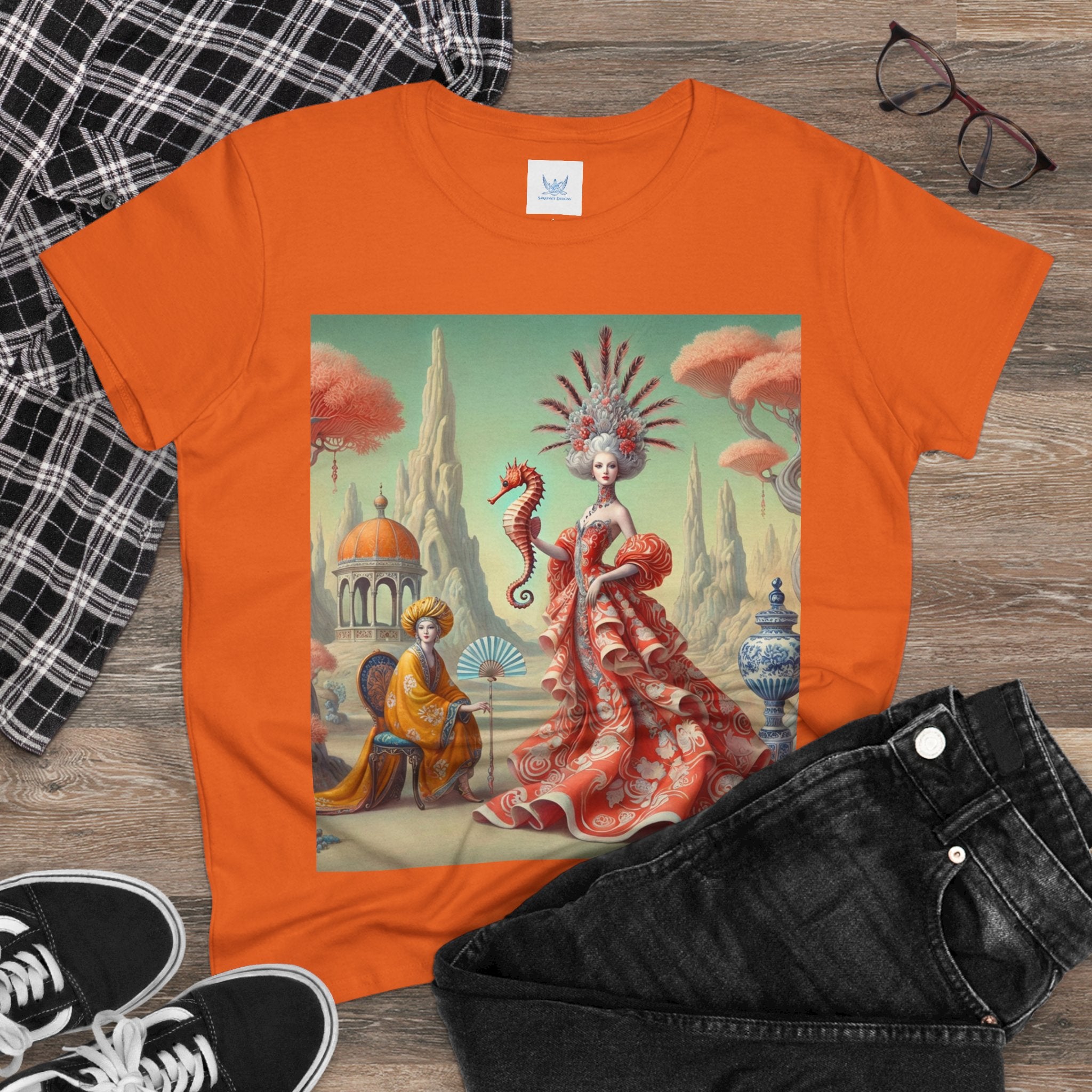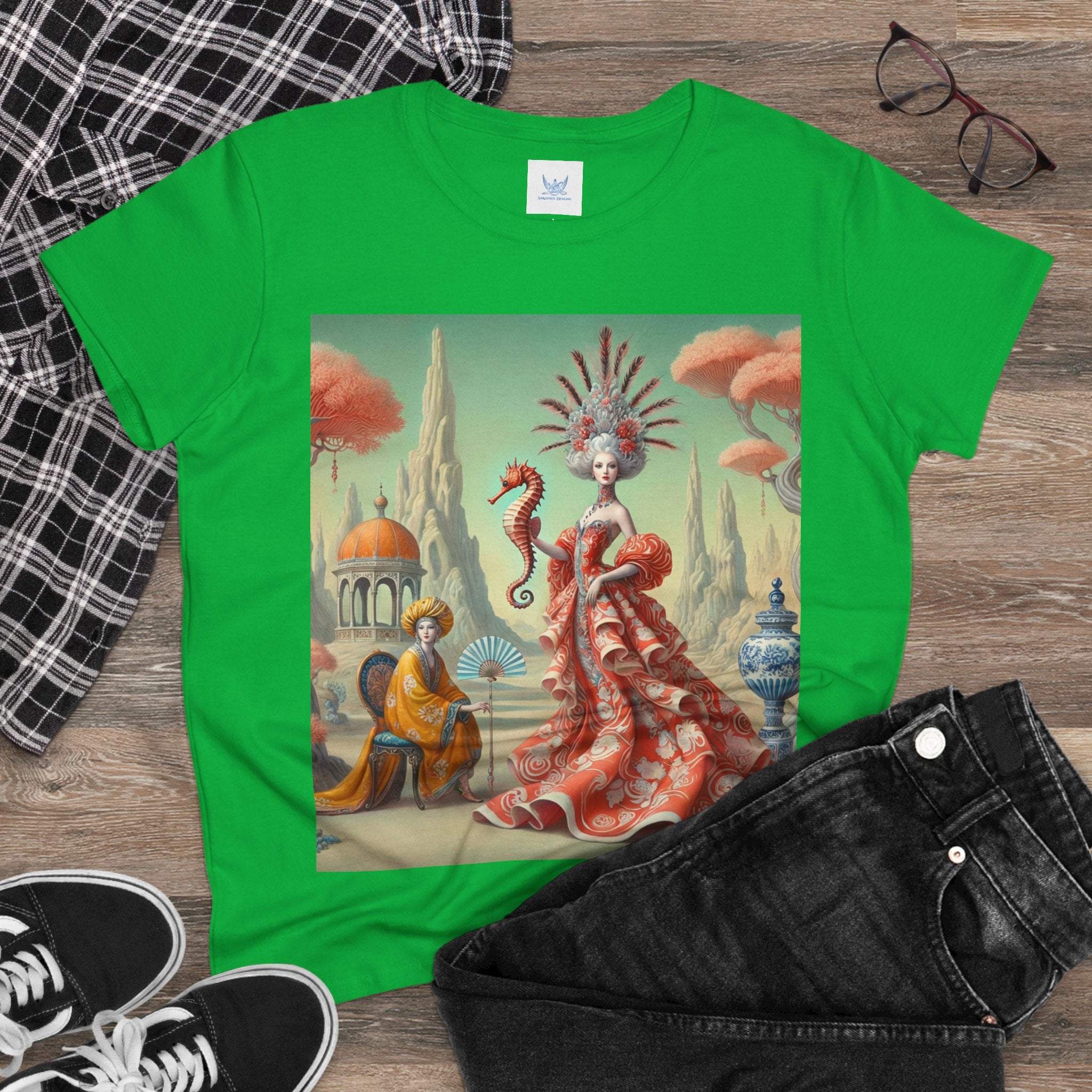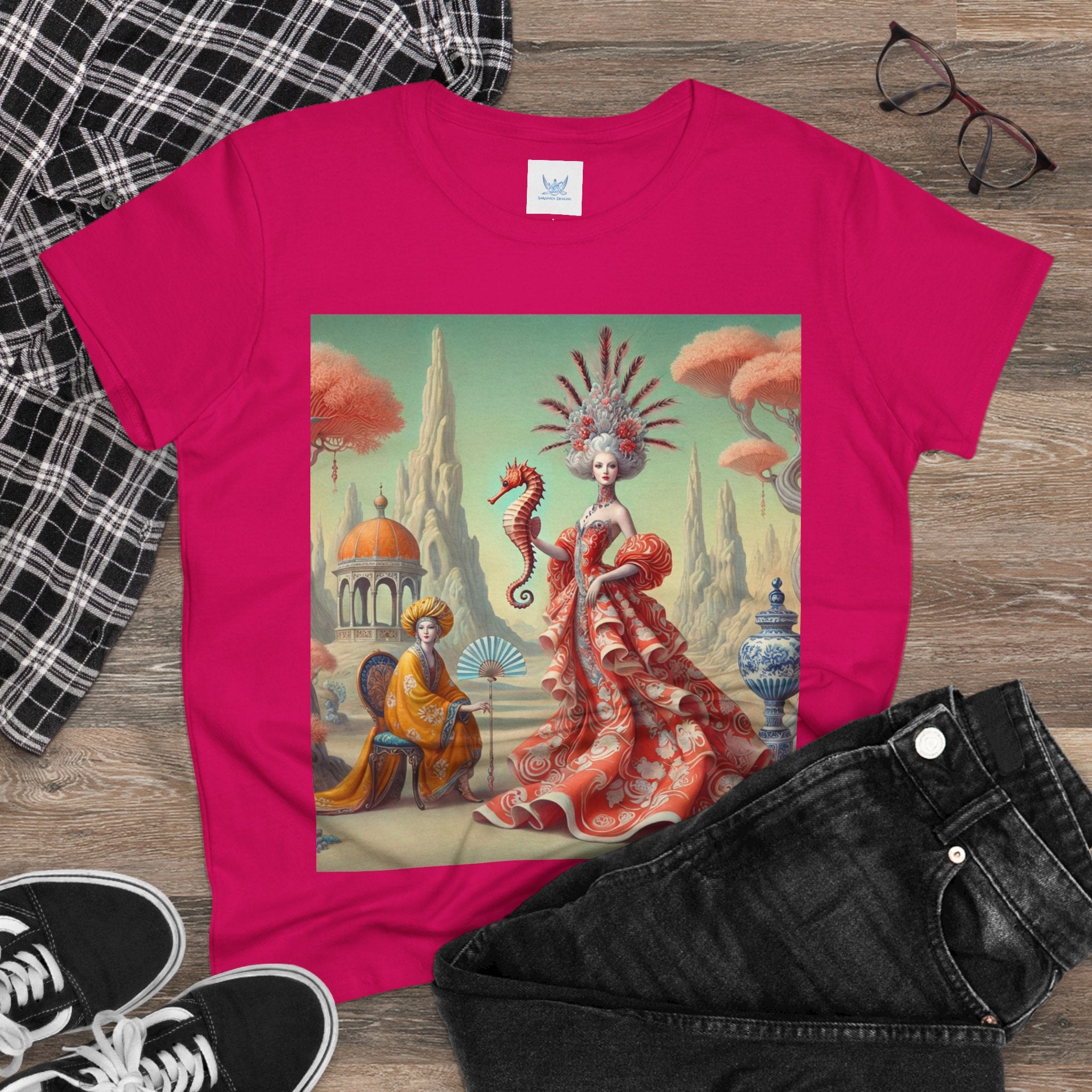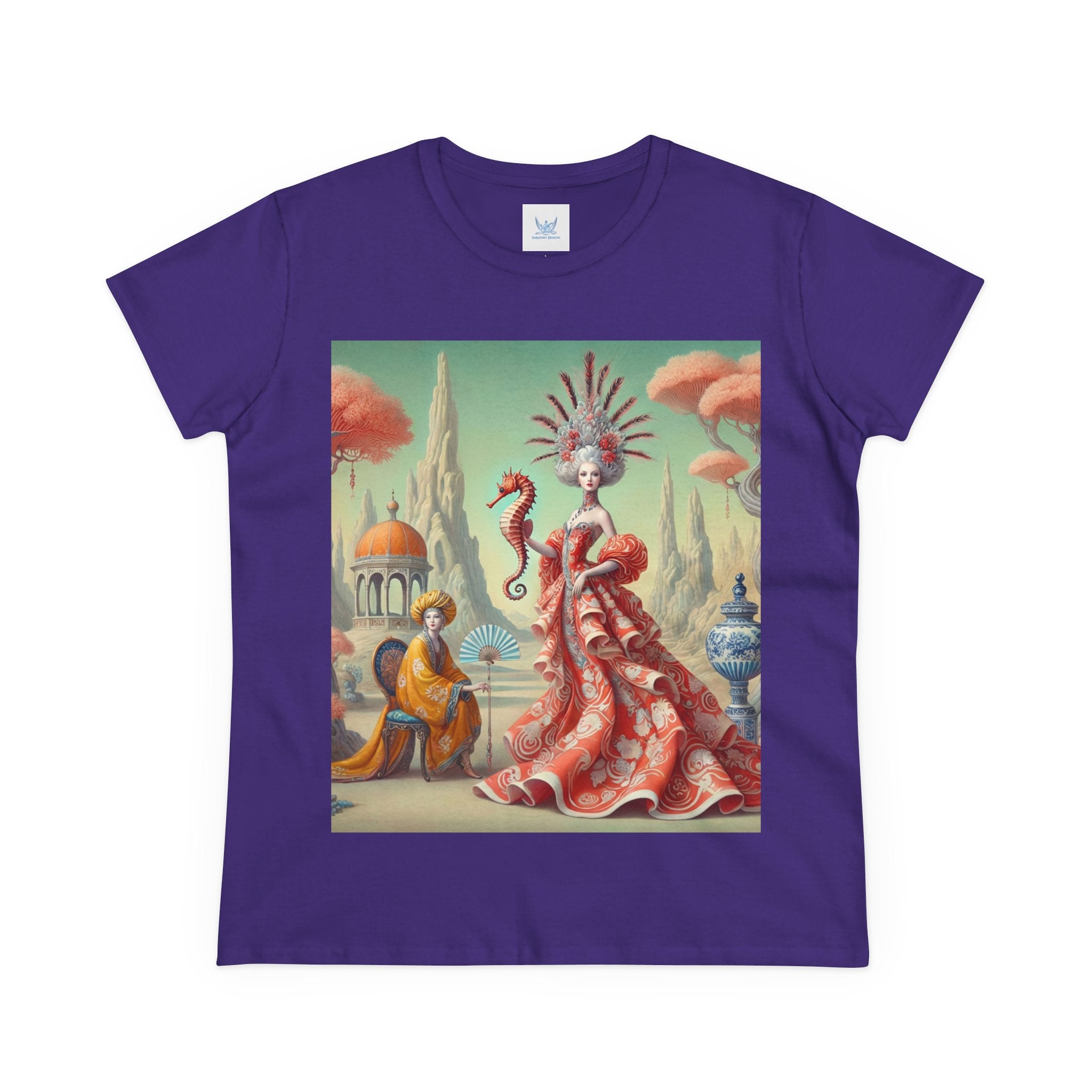 The Seahorse Court Cotton Tee brings art into everyday wear, pairing a soft, lightweight cotton shirt with a refined, storybook scene designed to feel both wearable and expressive. The semi-fitted silhouette offers a flattering shape while remaining comfortable enough for daily use, making it an easy staple for art lovers who want something distinctive yet effortless.