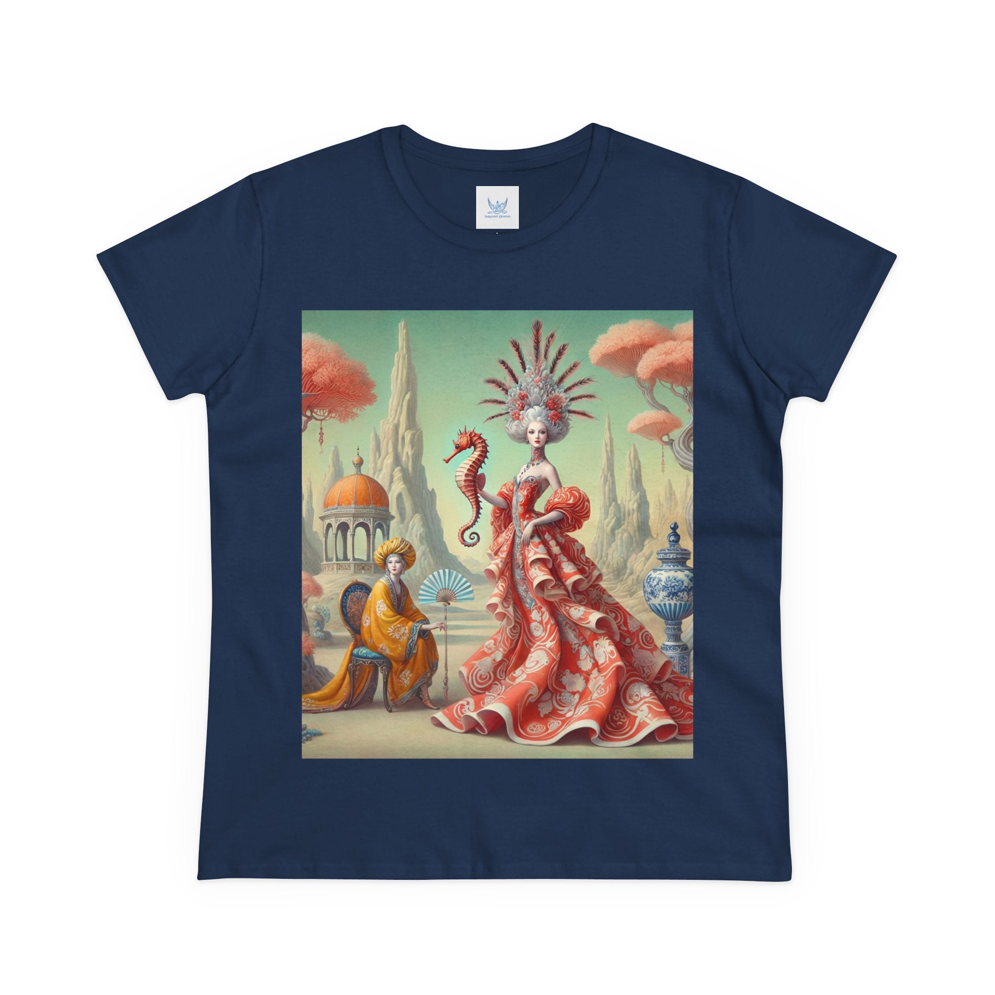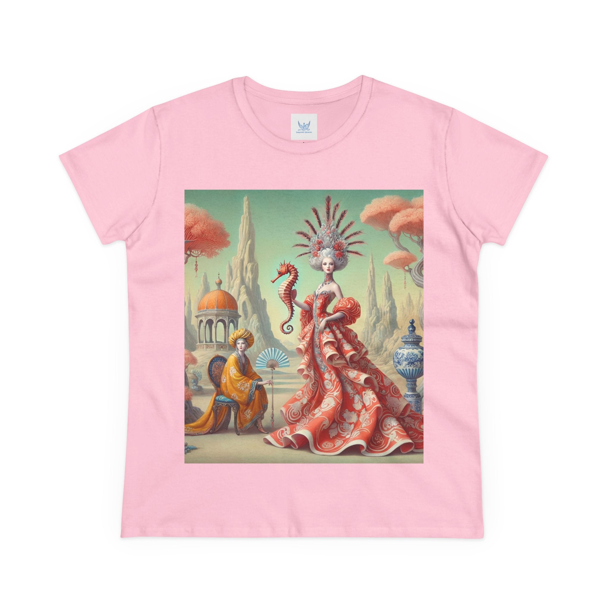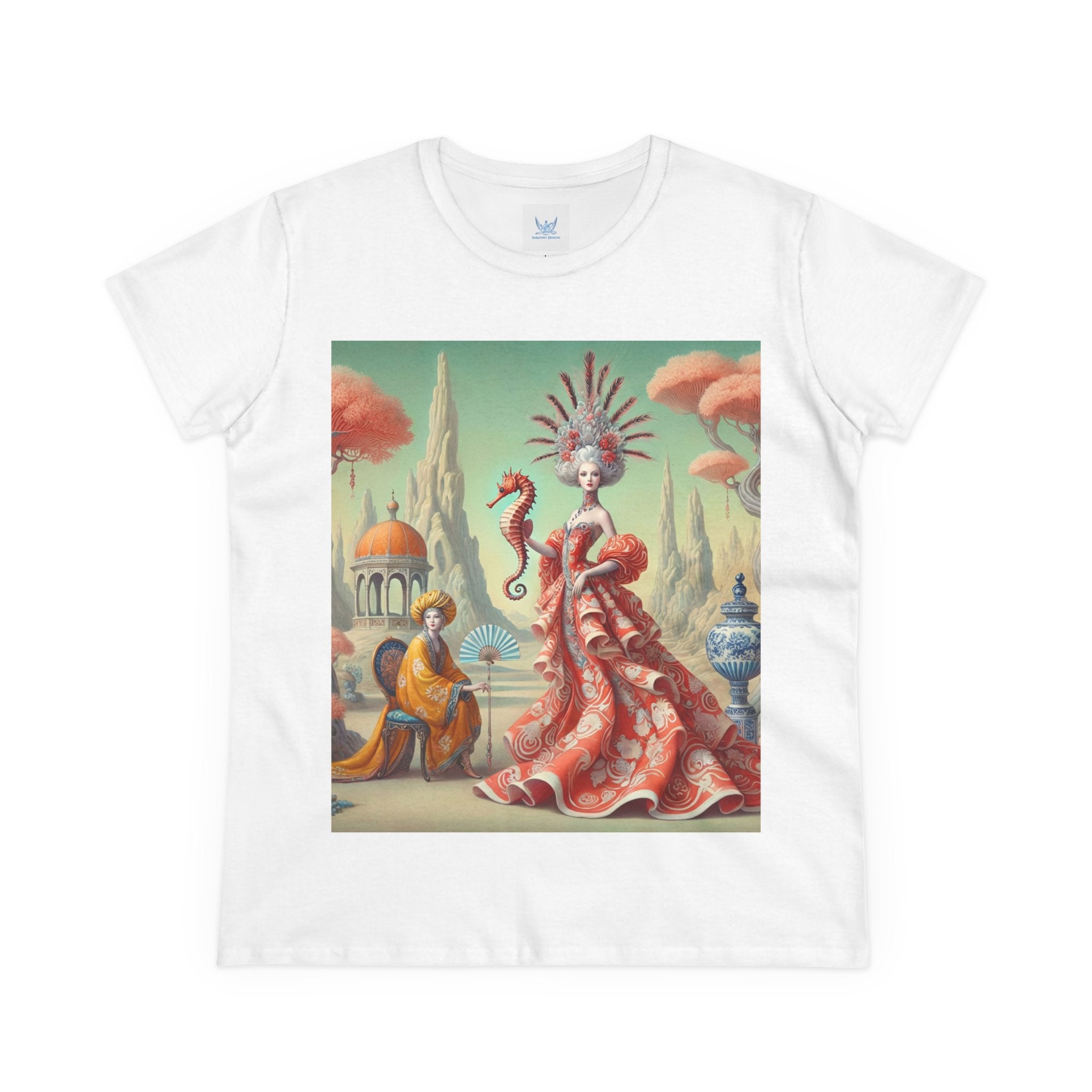 In the artwork, The Seahorse Court unfolds as a poised ceremonial vision. A regal figure in a flowing coral gown holds a seahorse like a living emblem of balance and guardianship, surrounded by porcelain vessels, coral-like trees, and distant pavilions. Soft pastels, coral reds, and muted aquas create a calm, dreamlike harmony that blends classical decorative influence with surreal elegance and quiet authority.