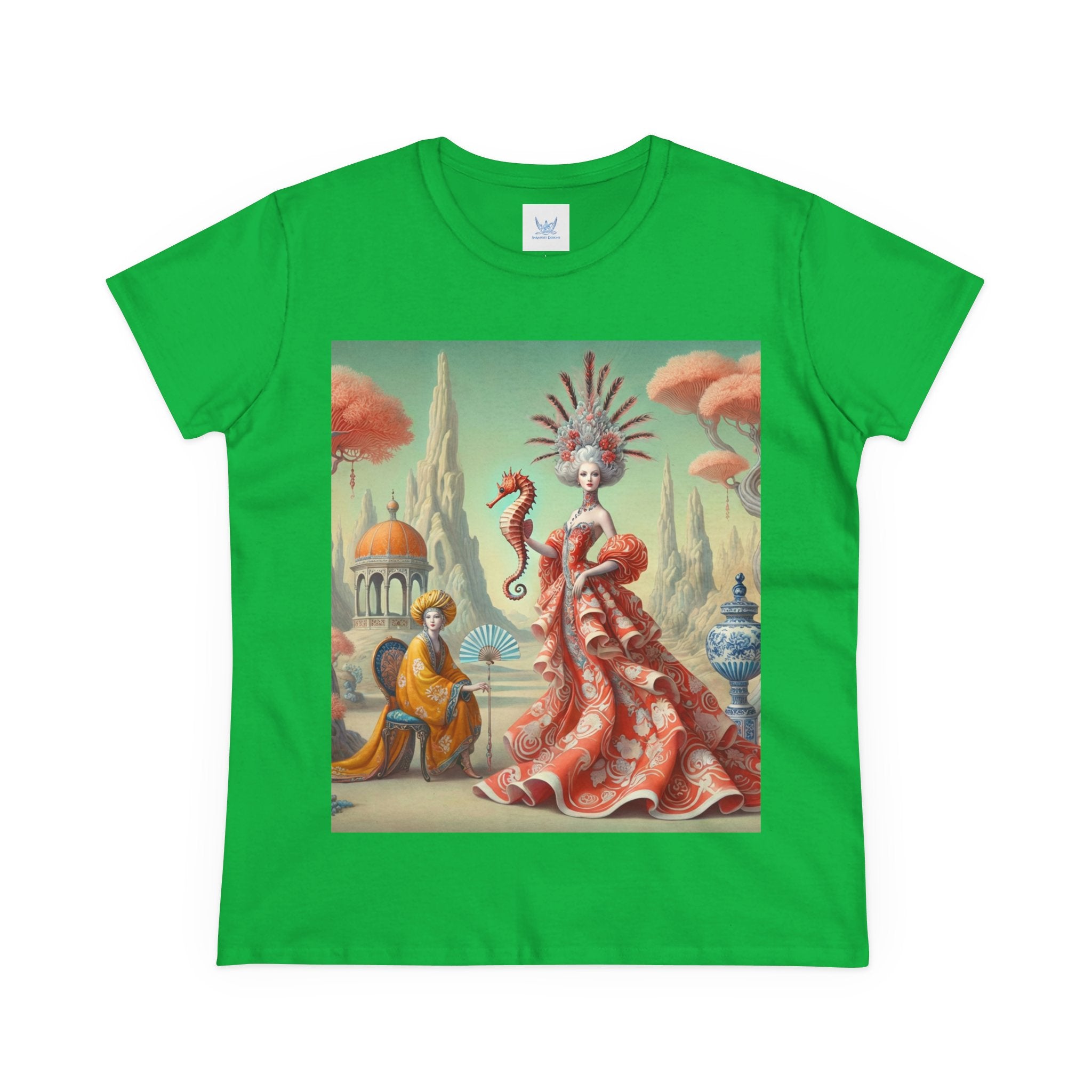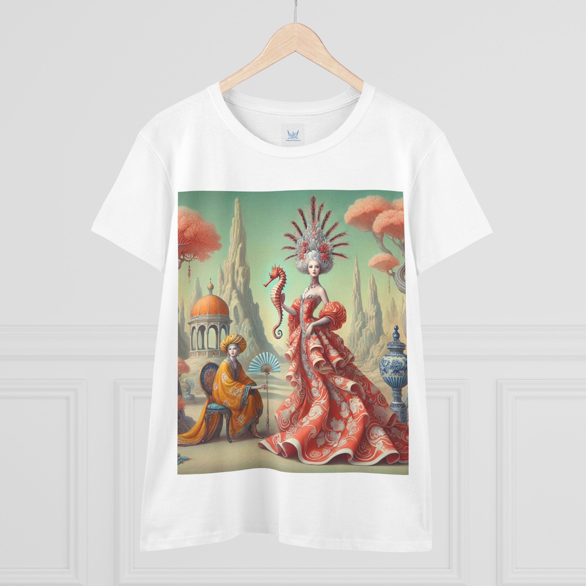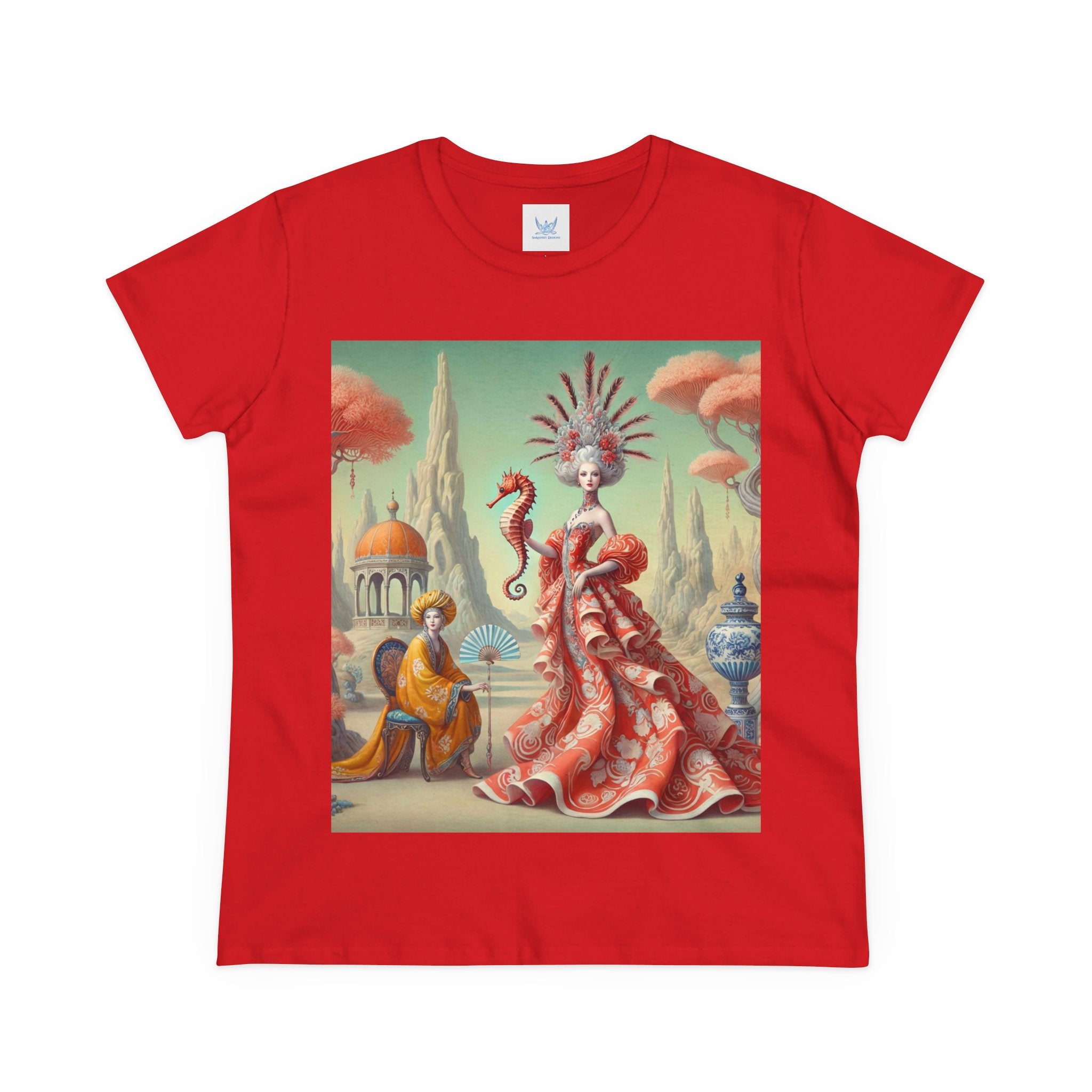 In the artwork, The Seahorse Court unfolds as a poised ceremonial vision. A regal figure in a flowing coral gown holds a seahorse like a living emblem of balance and guardianship, surrounded by porcelain vessels, coral-like trees, and distant pavilions. Soft pastels, coral reds, and muted aquas create a calm, dreamlike harmony that blends classical decorative influence with surreal elegance and quiet authority.