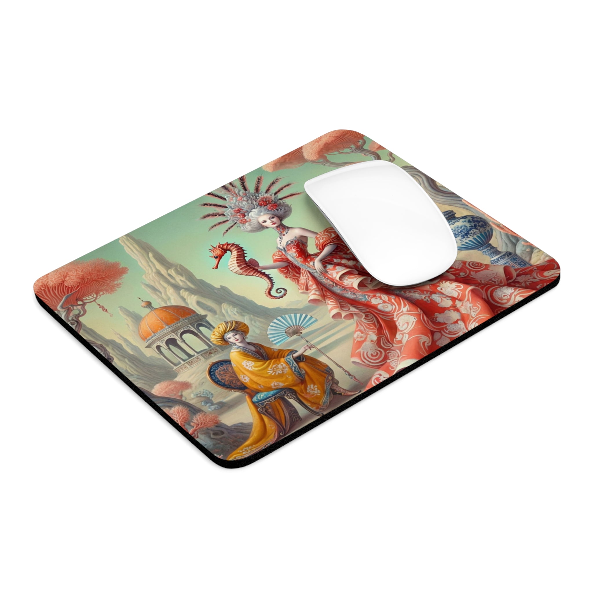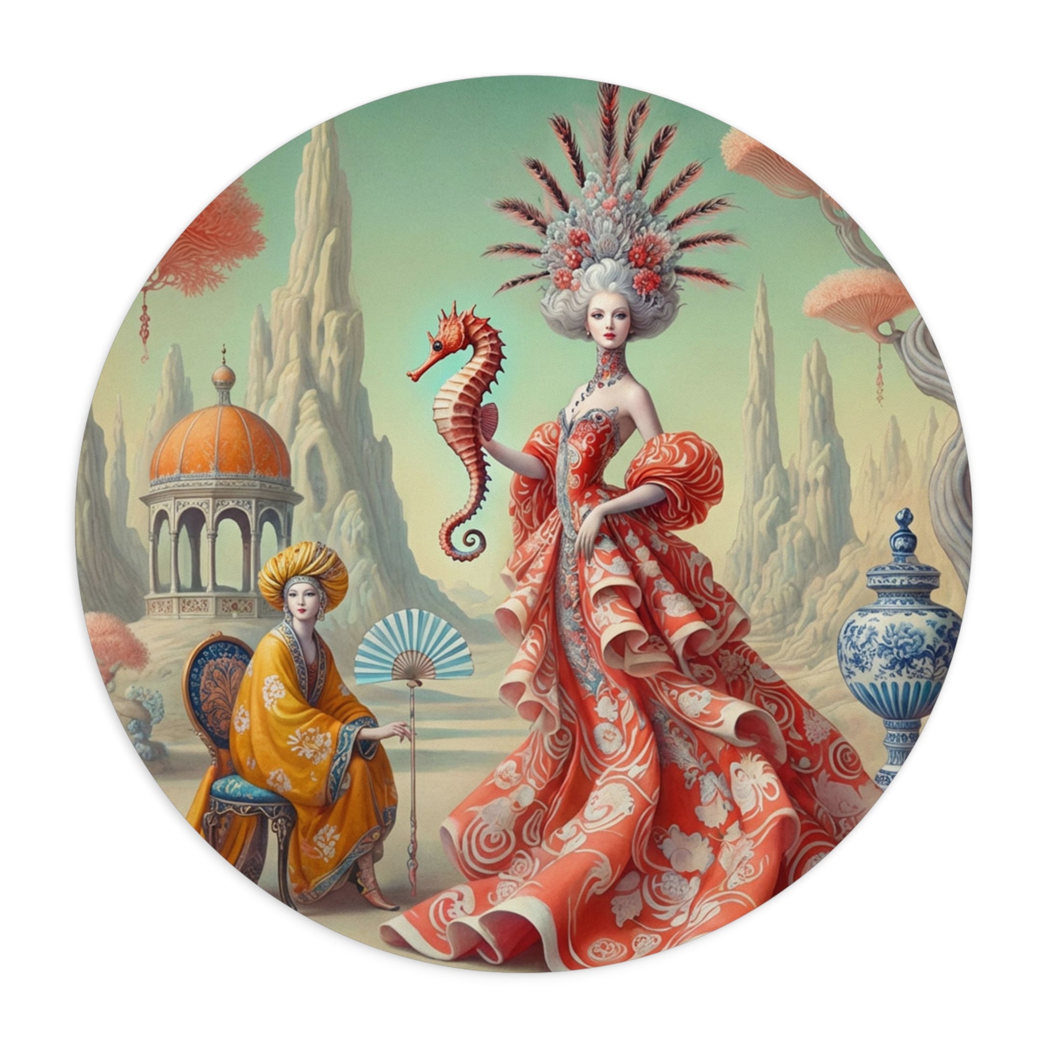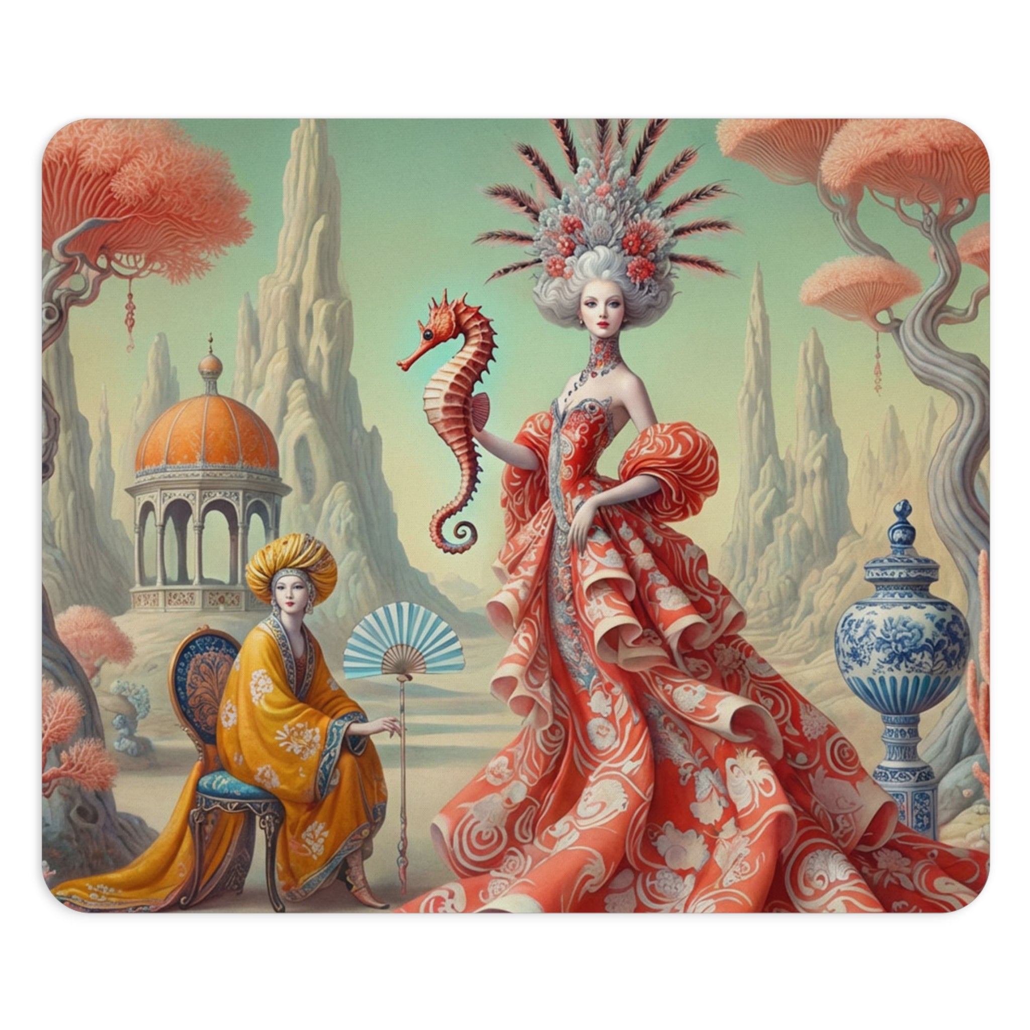 The artwork, The Seahorse Court, unfolds as a poised, dreamlike scene centered on a regal figure in a flowing coral gown, holding a seahorse as a symbol of balance and guardianship. Porcelain vessels, coral-like trees, and distant pavilions suggest a court suspended between land and sea, where soft pastels, coral reds, and muted aquas blend classical decorative influence with surreal calm and quiet authority. The result is peaceful yet powerful—perfect for focused work, creative sessions, and beautiful desk decor.
