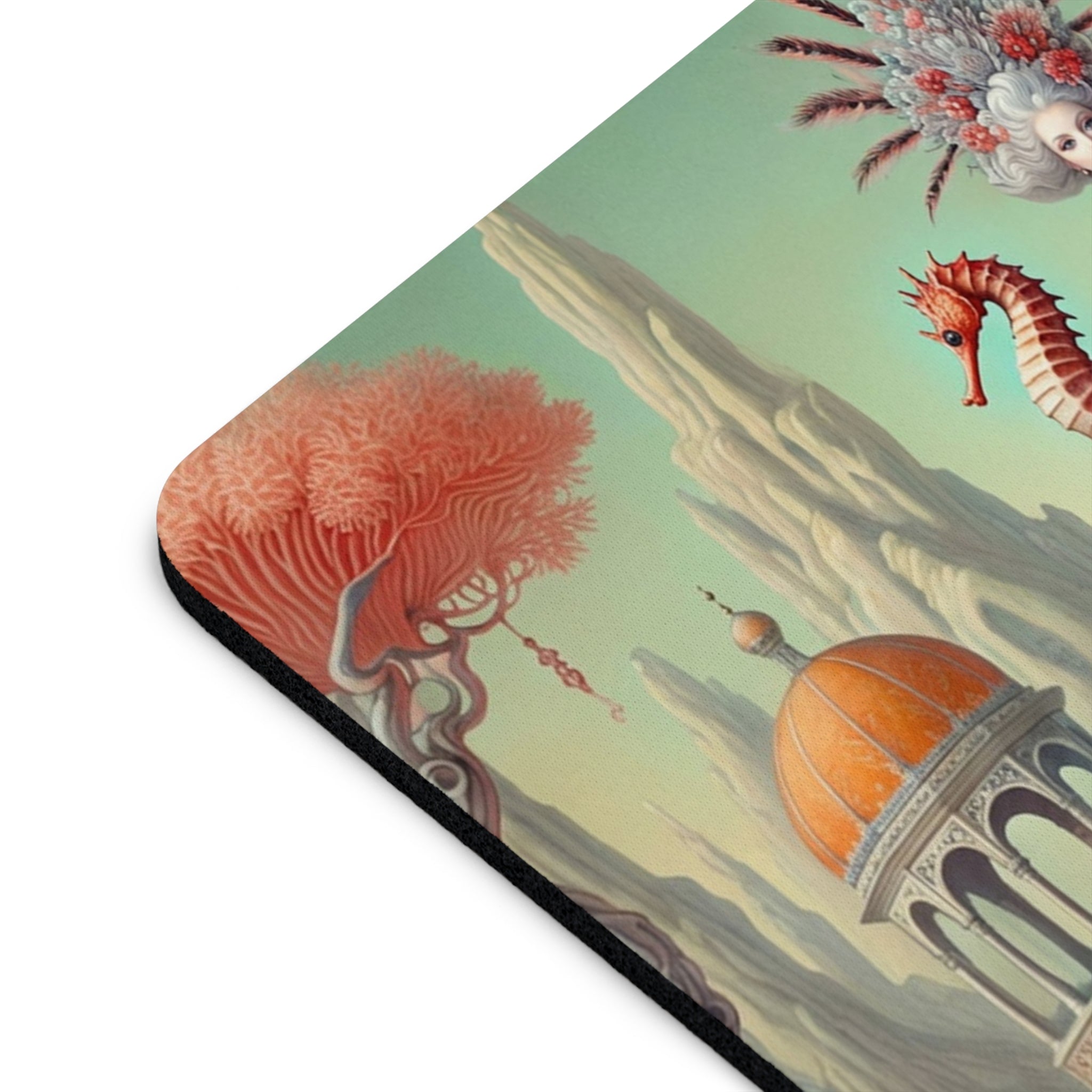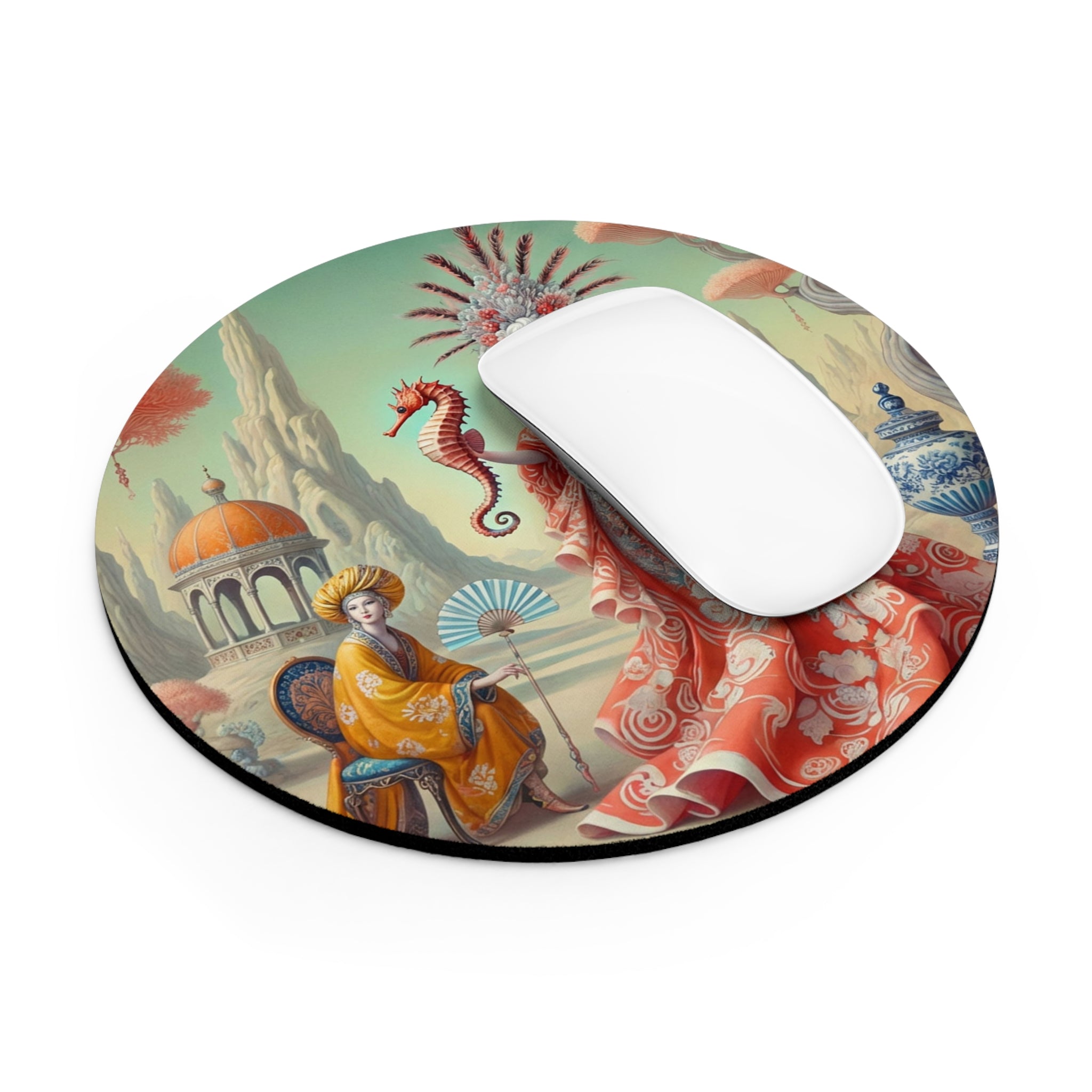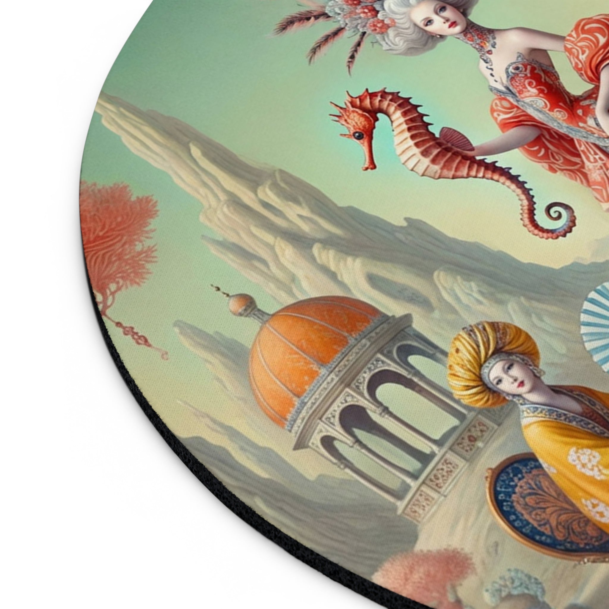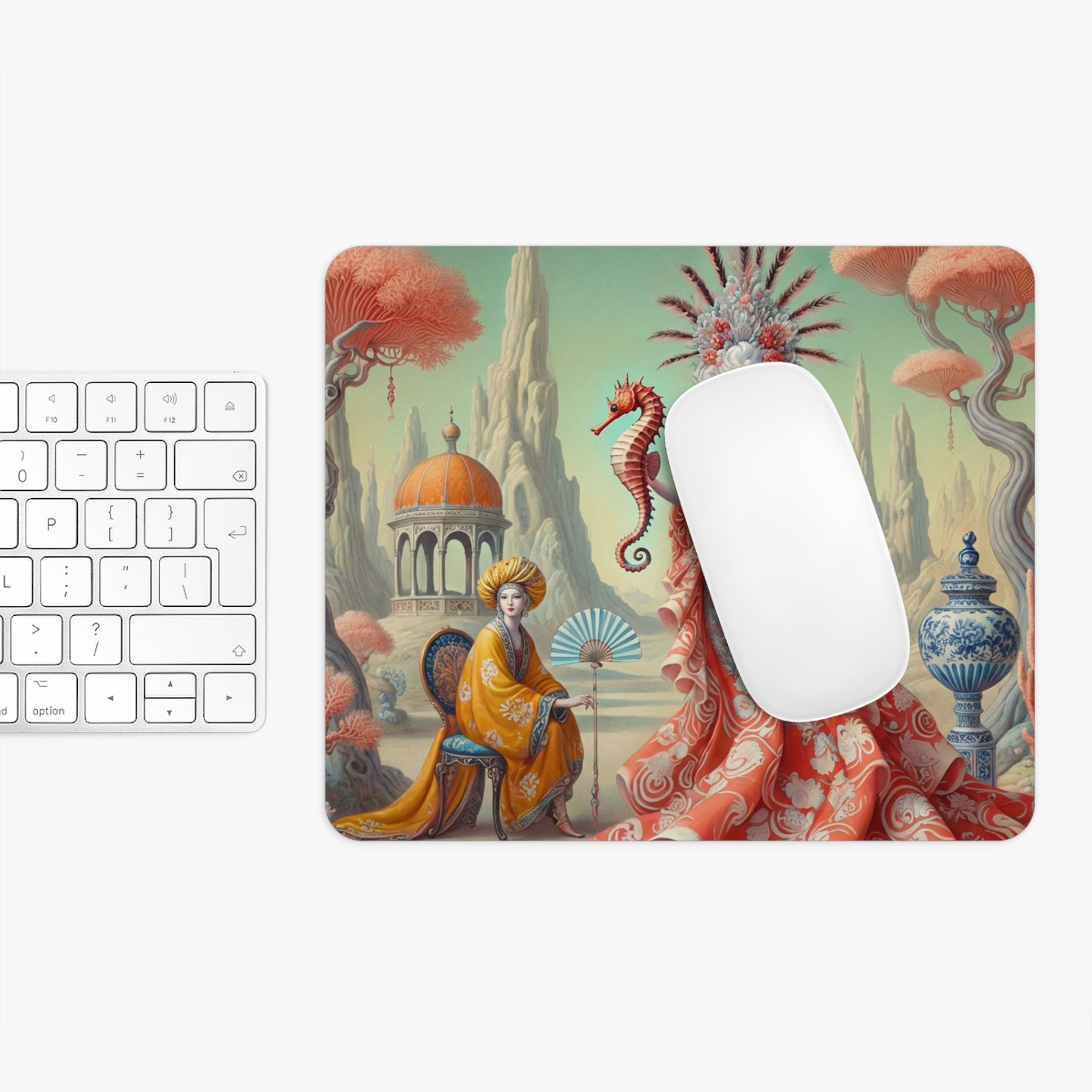 The artwork, The Seahorse Court, unfolds as a poised, dreamlike scene centered on a regal figure in a flowing coral gown, holding a seahorse as a symbol of balance and guardianship. Porcelain vessels, coral-like trees, and distant pavilions suggest a court suspended between land and sea, where soft pastels, coral reds, and muted aquas blend classical decorative influence with surreal calm and quiet authority. The result is peaceful yet powerful—perfect for focused work, creative sessions, and beautiful desk decor.