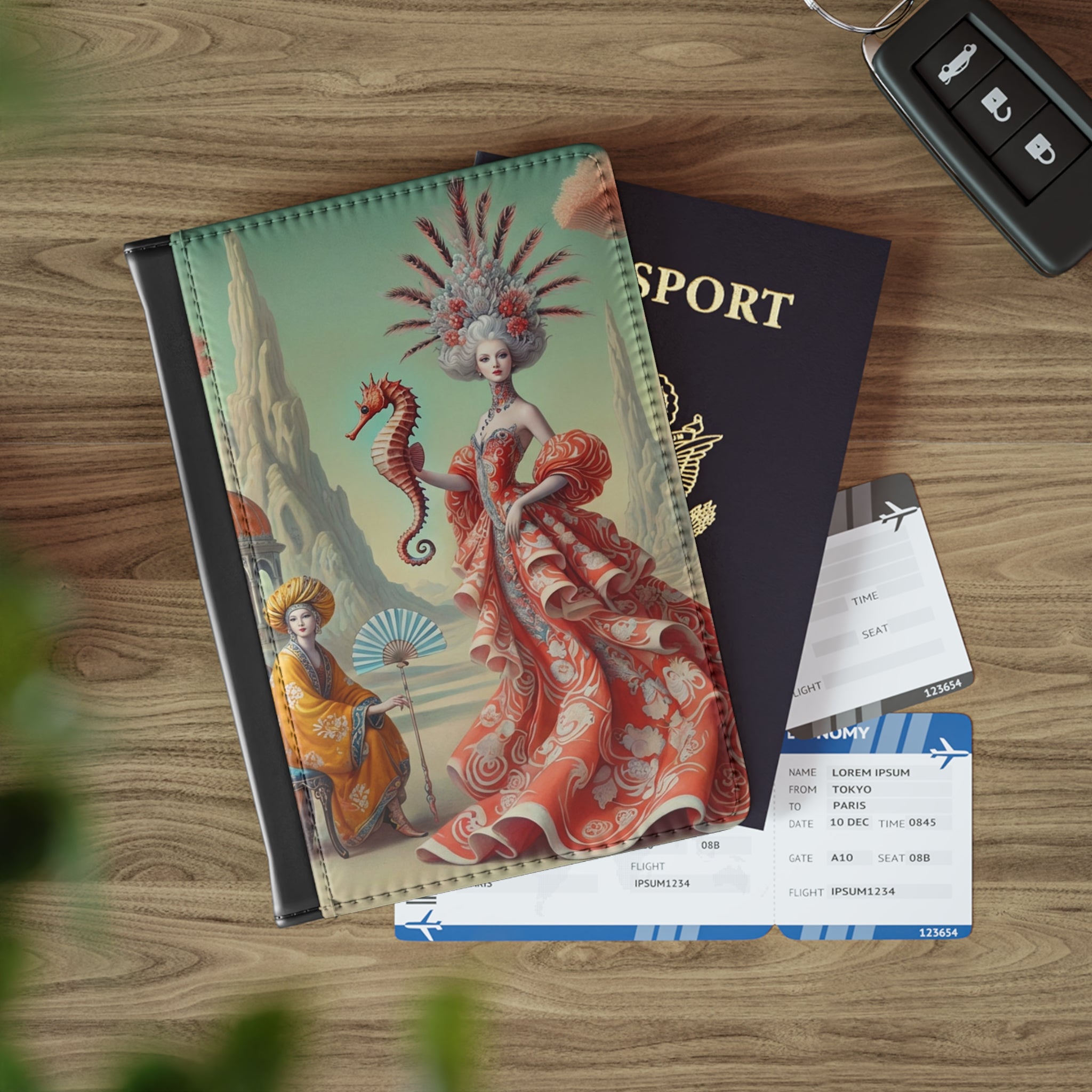 The Seahorse Court unfolds across the front as a poised, symbolic tableau: a regal figure in a flowing coral gown holds a seahorse as an emblem of balance and guardianship. Porcelain vessels, coral-like trees, and distant pavilions suggest a dreamlike court suspended between land and sea, rendered in soft pastels, coral reds, and muted aquas. The composition blends classical decorative influence with surreal elegance, evoking calm authority, grace, and protection—an ideal narrative for travel and transition.