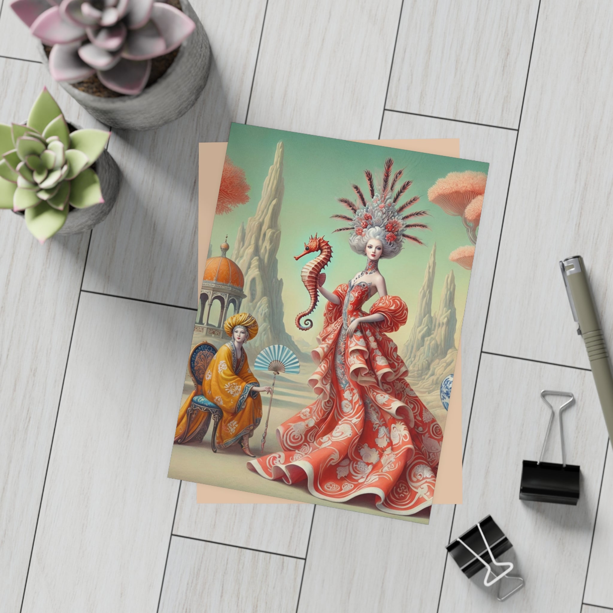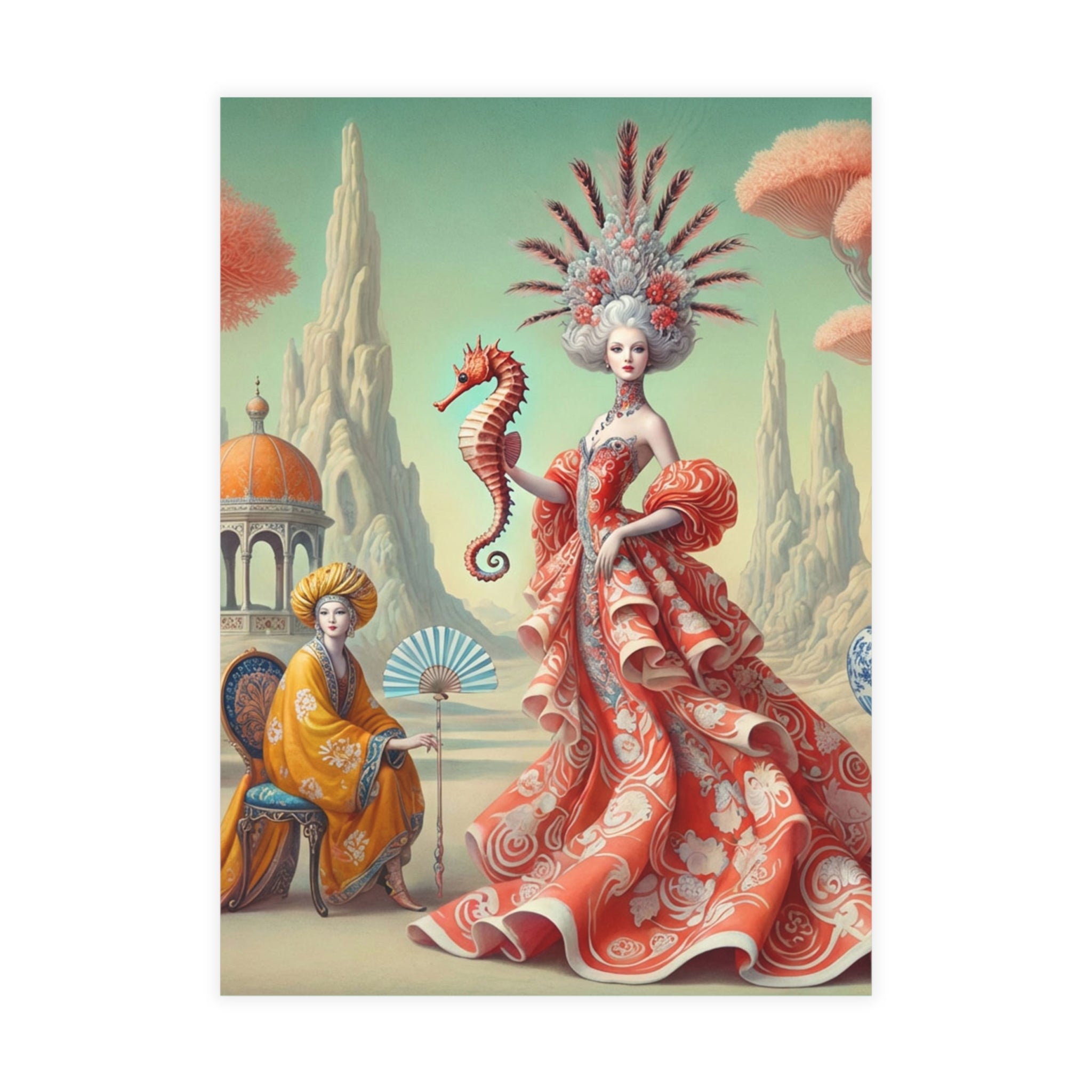 The Seahorse Court unfolds across each card as a poised, ceremonial tableau: a regal figure in a flowing coral gown holds a seahorse like a living emblem of balance and guardianship. Porcelain vessels, coral-like trees, and distant pavilions shape a dreamlike court suspended between land and sea. Soft pastels, coral reds, and muted aquas create a harmonious palette that blends classical decorative influence with surreal elegance and quiet authority.