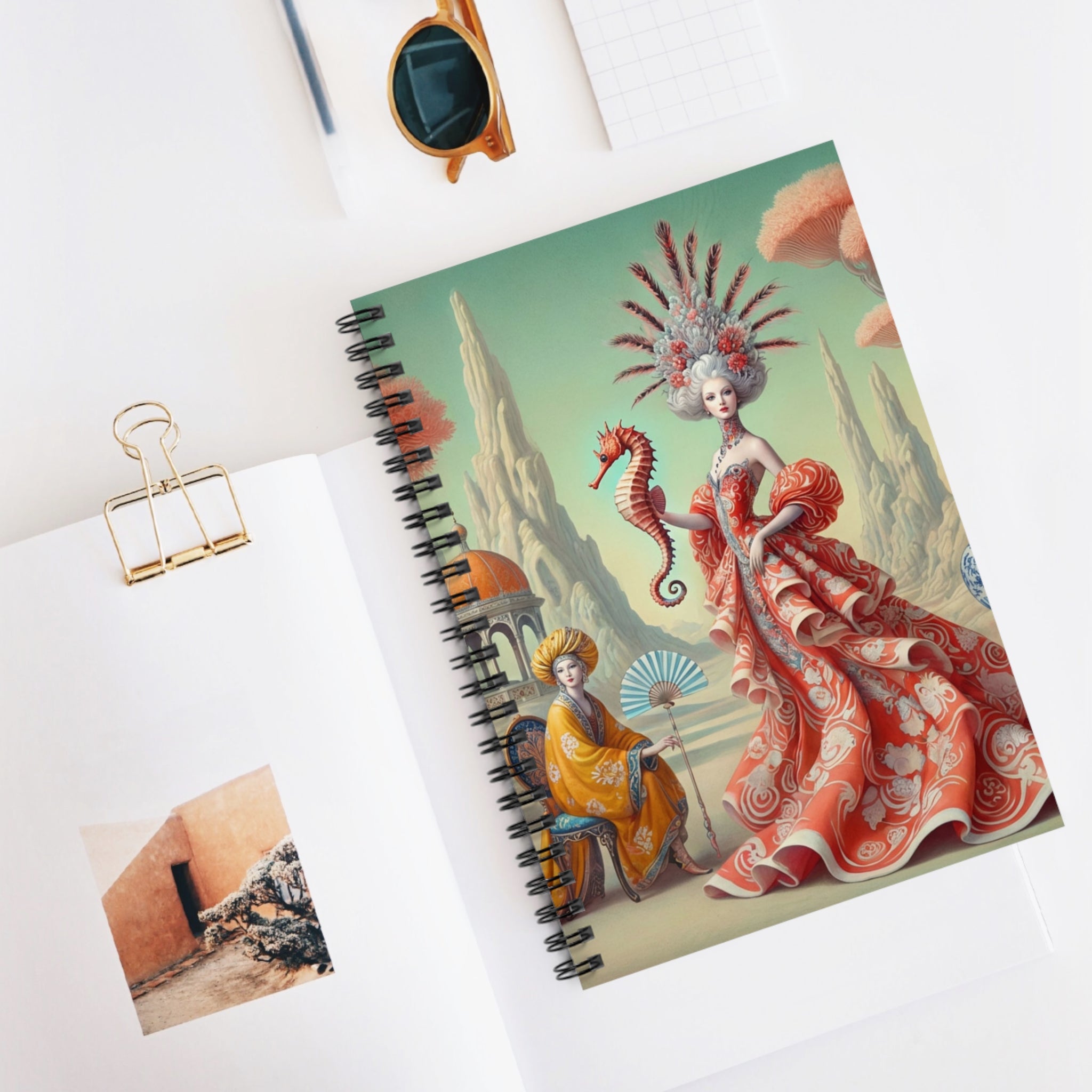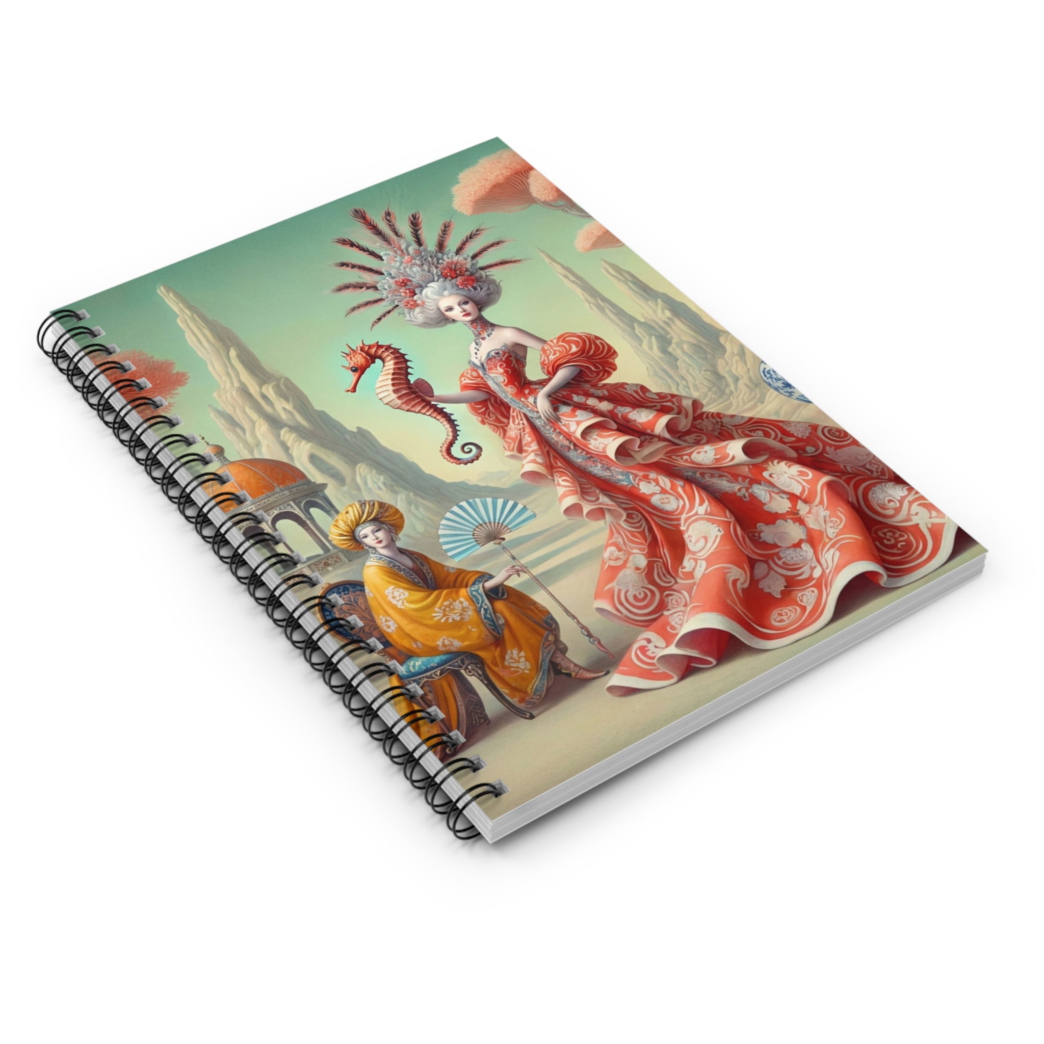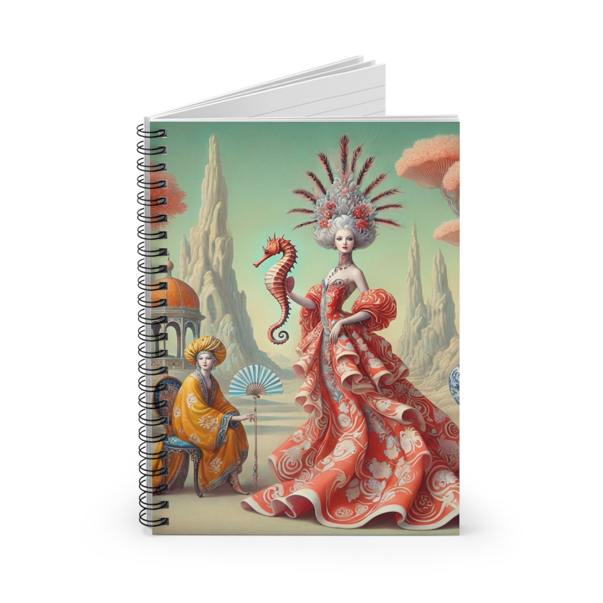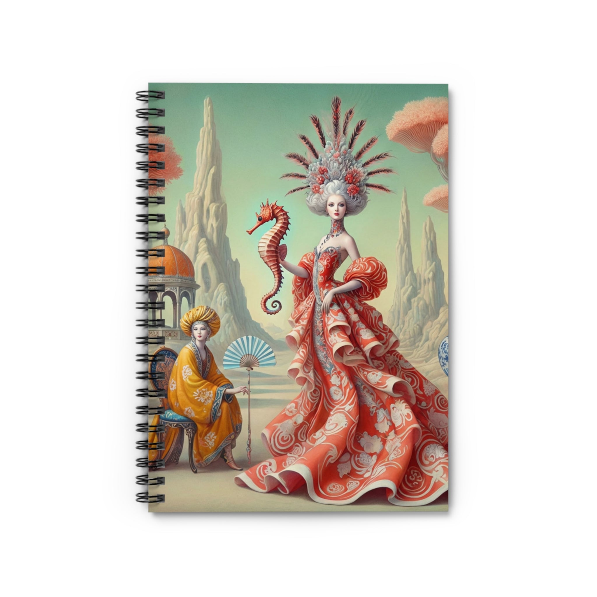 The Seahorse Court unfolds across the cover as a poised, ceremonial scene: a regal figure in a flowing coral gown holds a seahorse like a living emblem of balance and guardianship. Porcelain vessels, coral-like trees, and distant pavilions suggest a dreamlike court suspended between land and sea, rendered in soft pastels, coral reds, and muted aquas. The composition blends classical decorative influence with surreal elegance, lending the notebook a sense of calm authority and imaginative depth that inspires reflection as much as creativity.