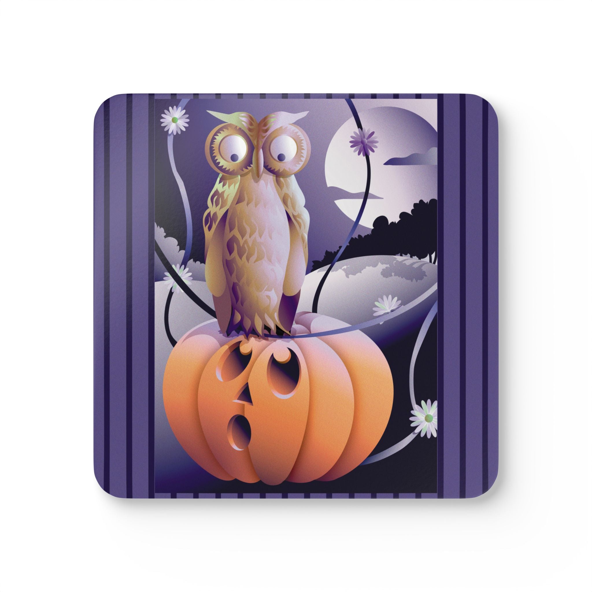 Artwork created, designed and digitally remastered by Sarasvati Designs. In this whimsical and enchanting artwork, an owl with a serious expression perches atop a large, bright orange pumpkin. The pumpkin, with wide eyes and a startled expression, gazes up at the owl in surprise, creating a humorous and endearing interaction between the two. The scene is set against a moody backdrop of a greyish-purple sky, where a full moon, partially veiled by drifting clouds, casts an ethereal glow. Silhouettes of bare trees add a touch of mystery to the night. Surrounding the owl and pumpkin are twisting vines adorned with delicate white daisies, adding a touch of softness to the scene. The overall color palette is a harmonious blend of purples, greys, blacks, and the vibrant orange of the pumpkin, creating a magical and slightly eerie atmosphere.