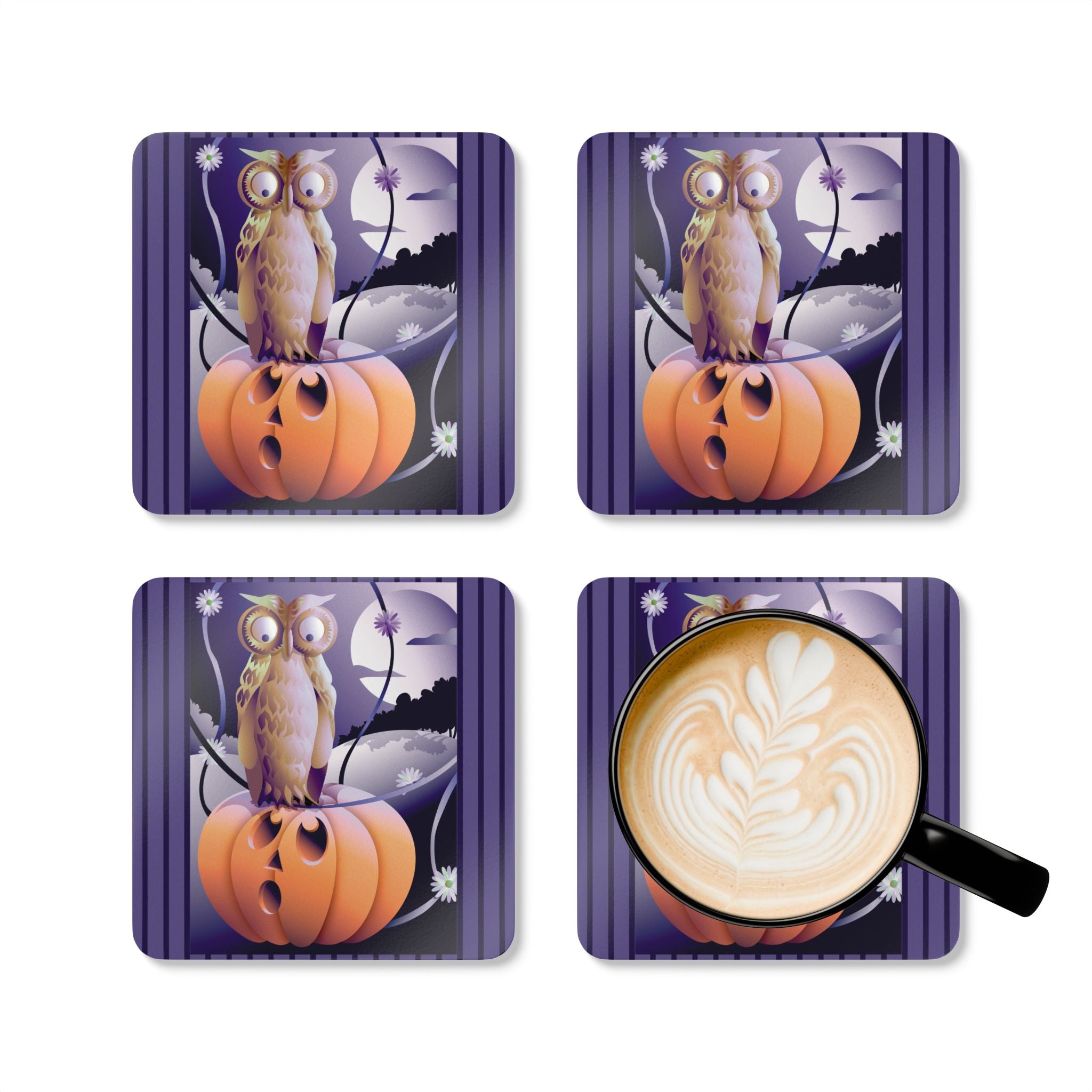 Add a festive touch to your Halloween decor with this elegant set of coasters. Each set includes four coasters, all featuring captivating Halloween designs. Crafted with a high-gloss top and a cork back, these coasters offer both style and functionality, preventing any unwanted sliding while adding a spooky charm to your home or business.