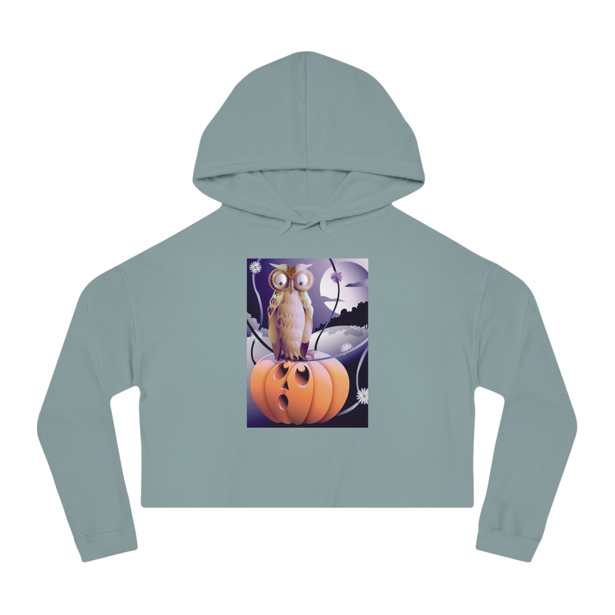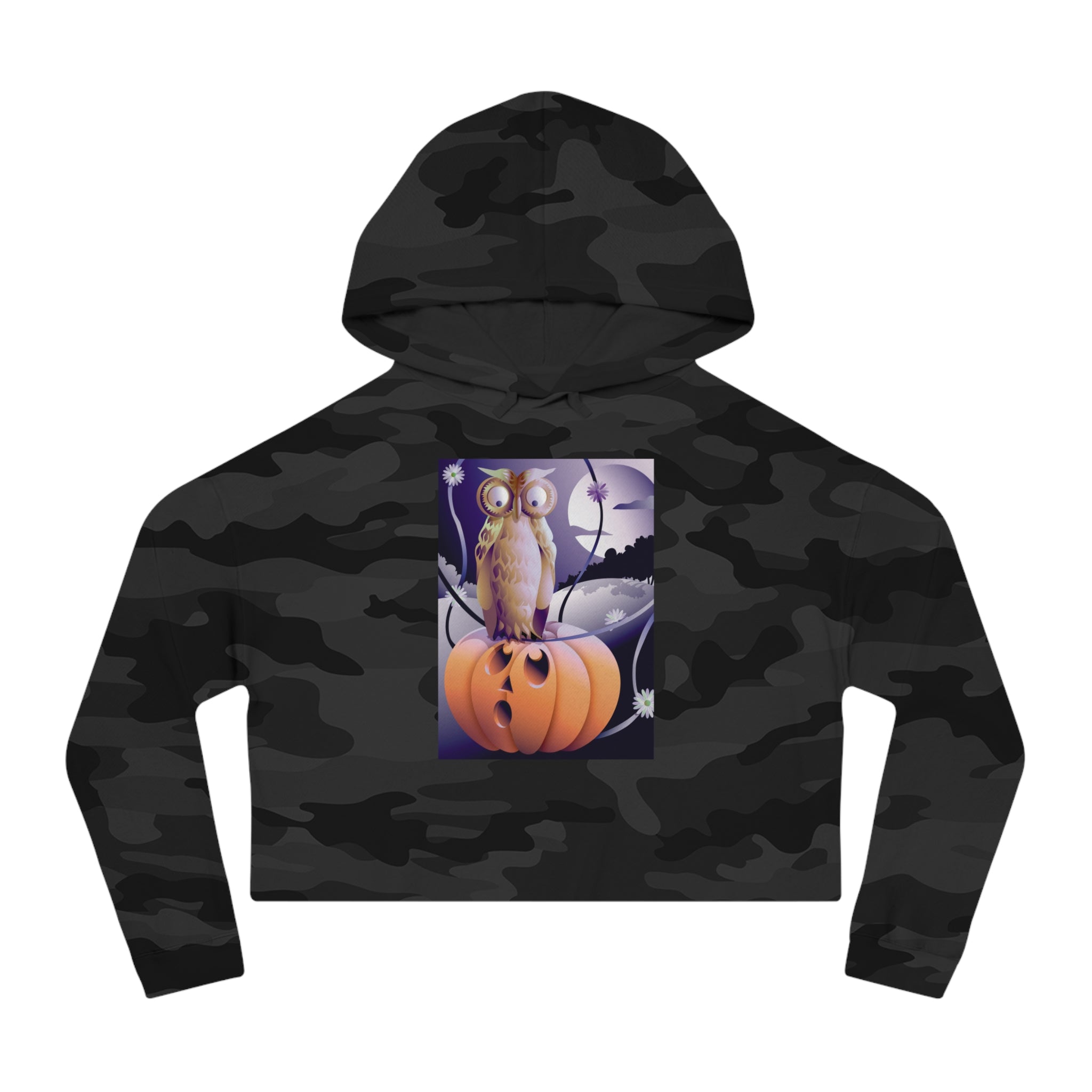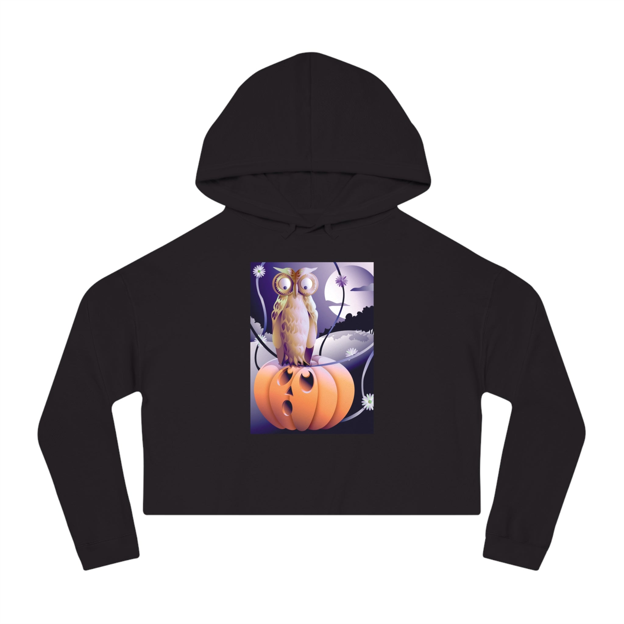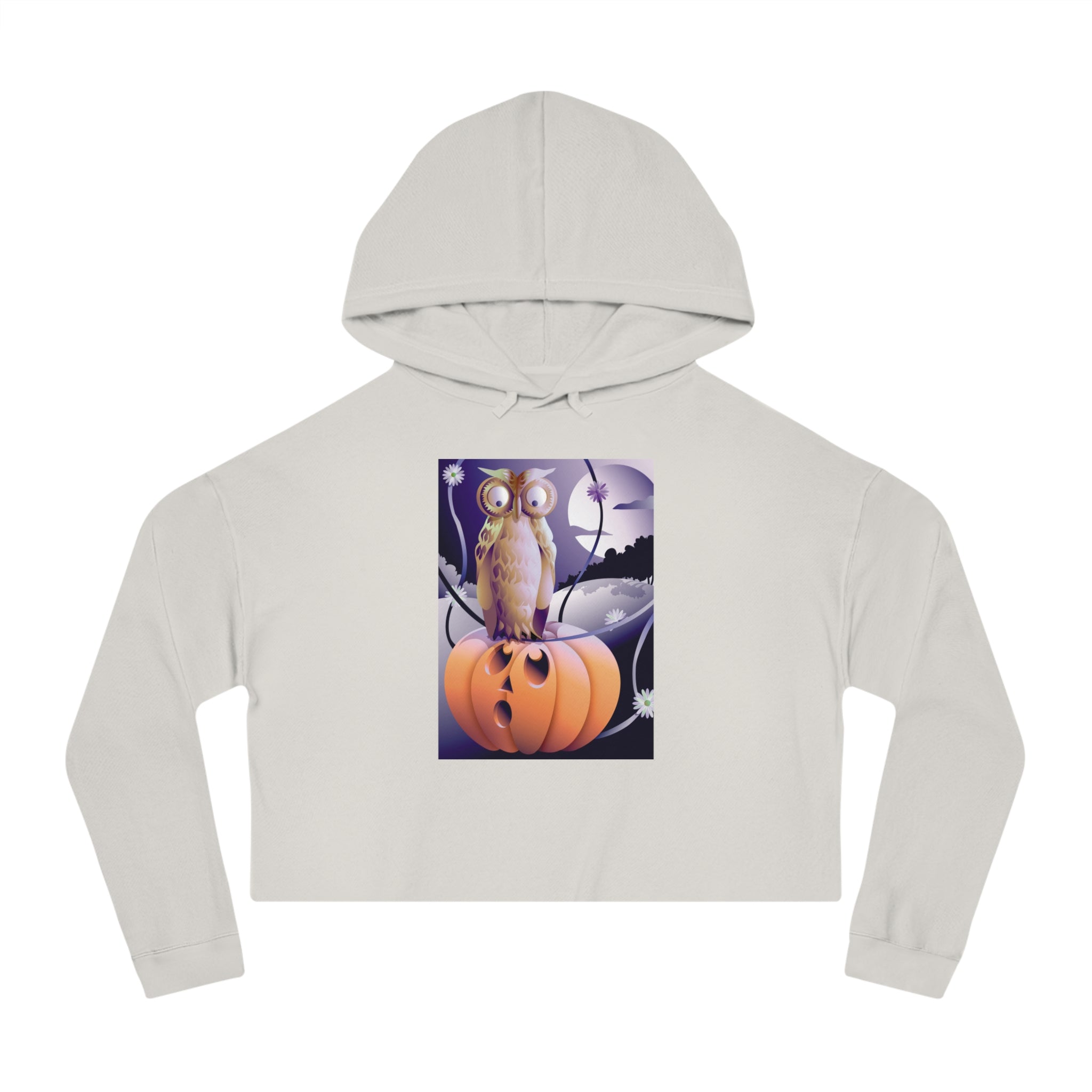 Artwork created, designed and digitally remastered by Sarasvati Designs. In this whimsical and enchanting artwork, an owl with a serious expression perches atop a large, bright orange pumpkin. The pumpkin, with wide eyes and a startled expression, gazes up at the owl in surprise, creating a humorous and endearing interaction between the two. The scene is set against a moody backdrop of a greyish-purple sky, where a full moon, partially veiled by drifting clouds, casts an ethereal glow. Silhouettes of bare trees add a touch of mystery to the night. Surrounding the owl and pumpkin are twisting vines adorned with delicate white daisies, adding a touch of softness to the scene. The overall color palette is a harmonious blend of purples, greys, blacks, and the vibrant orange of the pumpkin, creating a magical and slightly eerie atmosphere.
