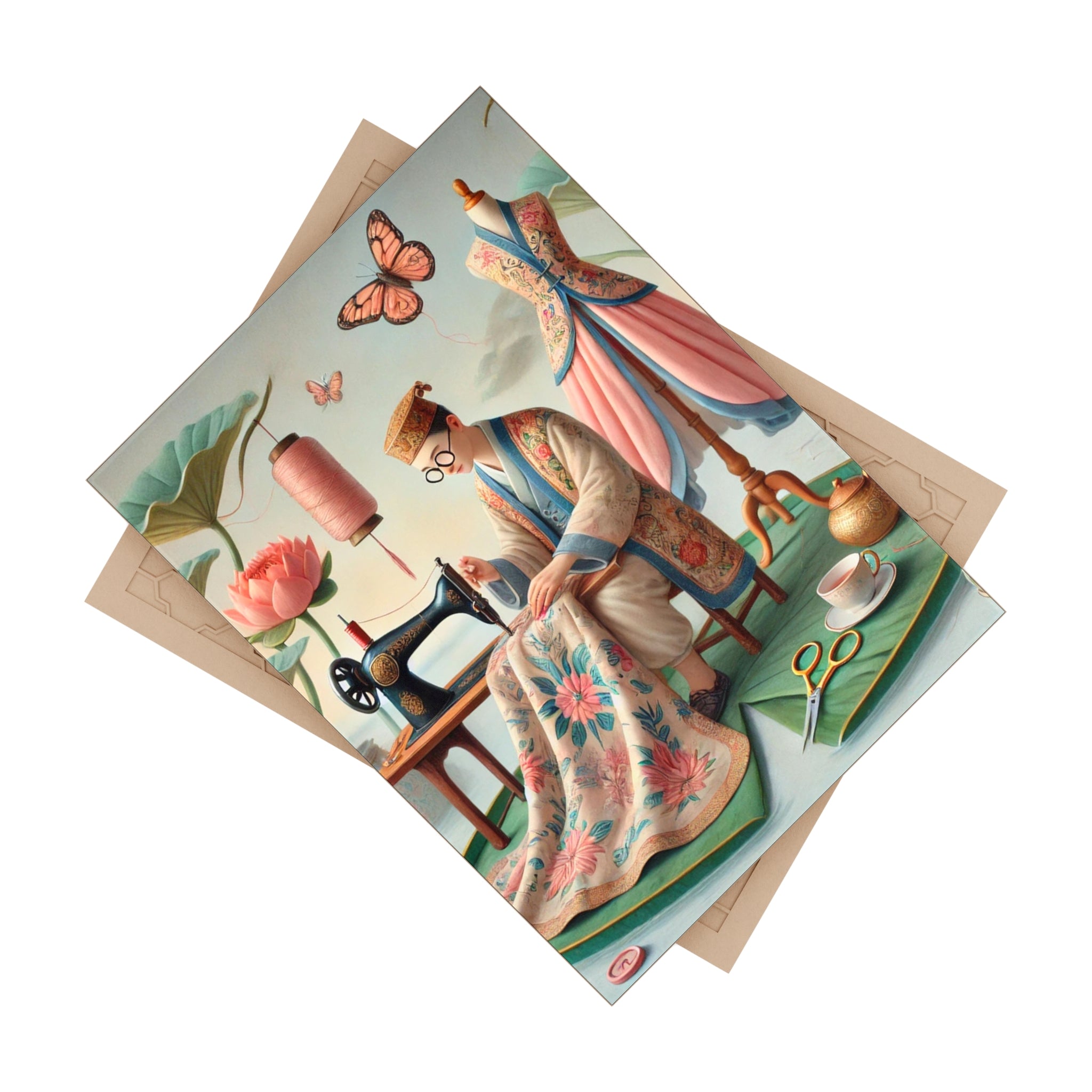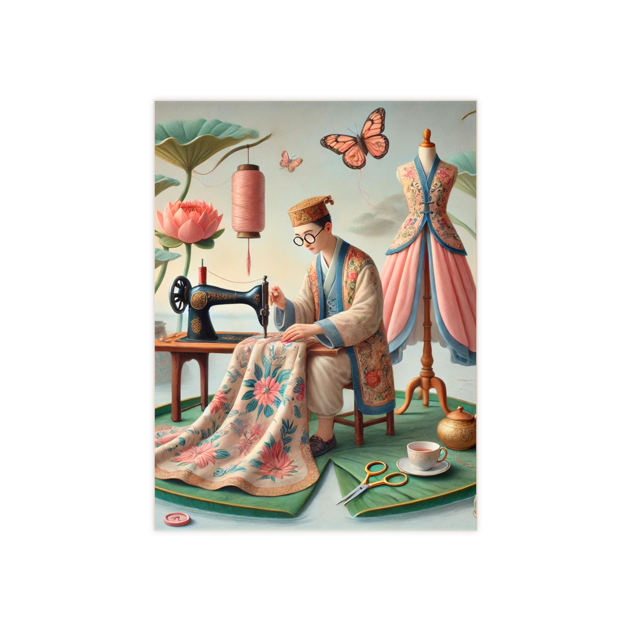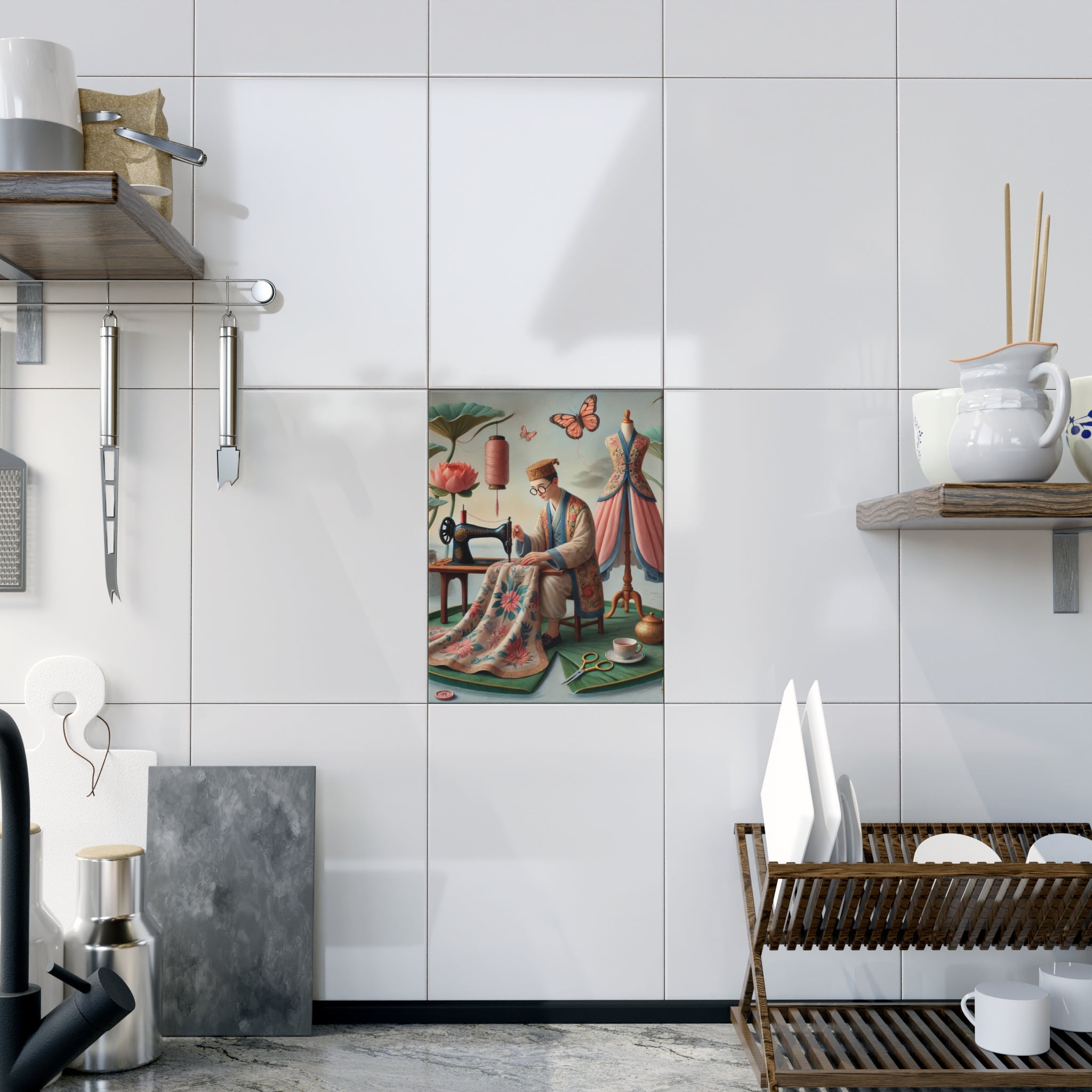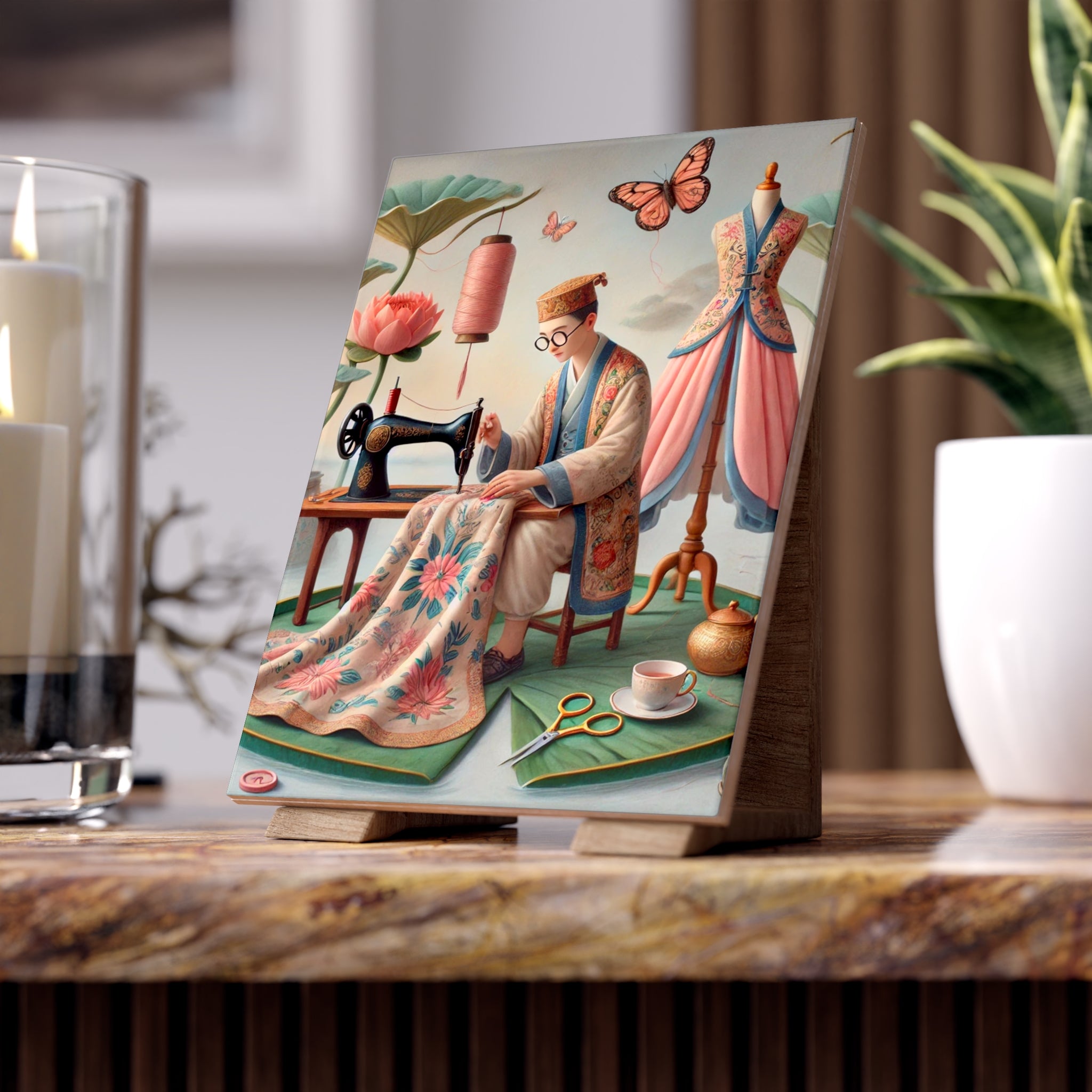 The Tailor’s Garden Ceramic Tile captures a quiet moment of devotion and craft, where a meticulous tailor works calmly beside a sewing machine amid lotus leaves, blooming flowers, and drifting butterflies. Spools of thread, fabric, and well-worn tools surround her, while a nearby dress form mirrors the elegance of the garments taking shape. Rendered in soft turquoise, blush, and warm floral tones, the scene blends traditional craftsmanship with dreamlike serenity, celebrating the beauty of patience, skilled hands, and the gentle poetry of making.