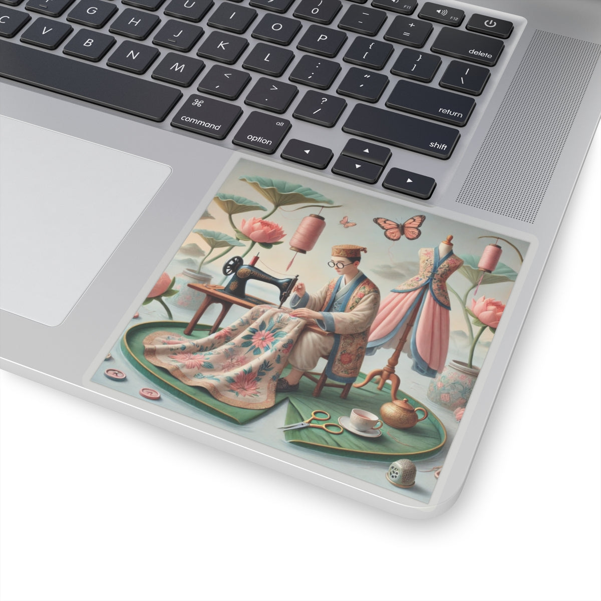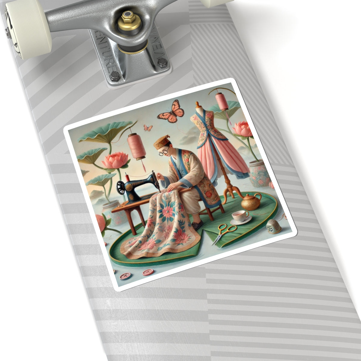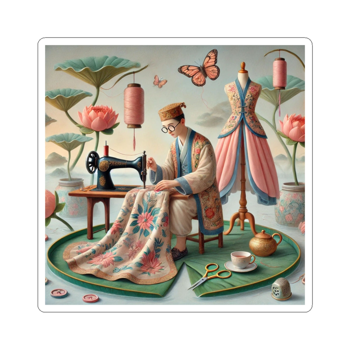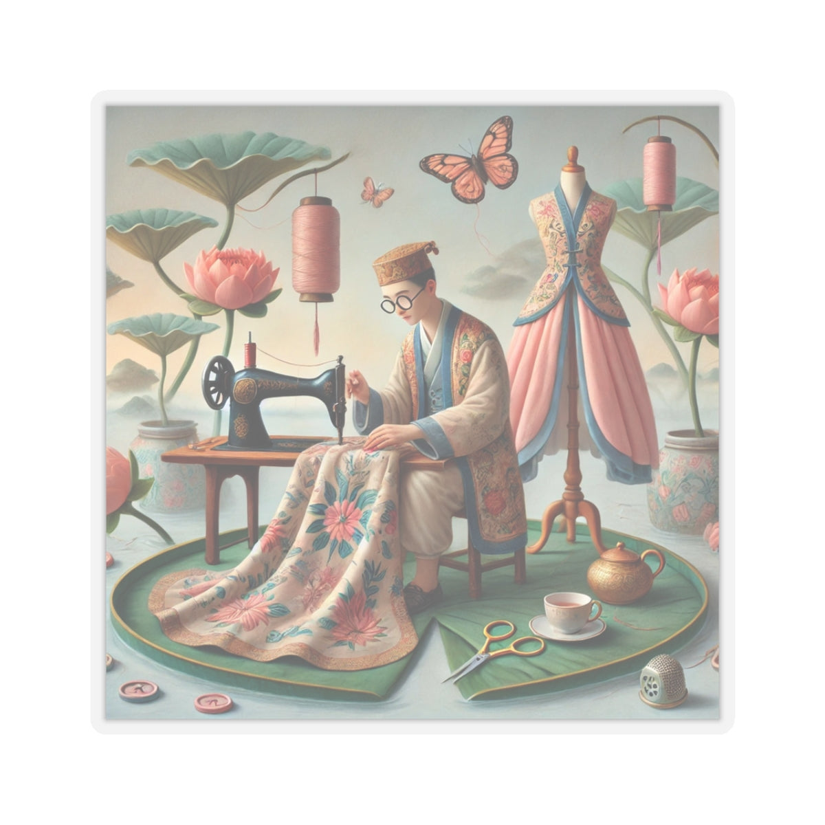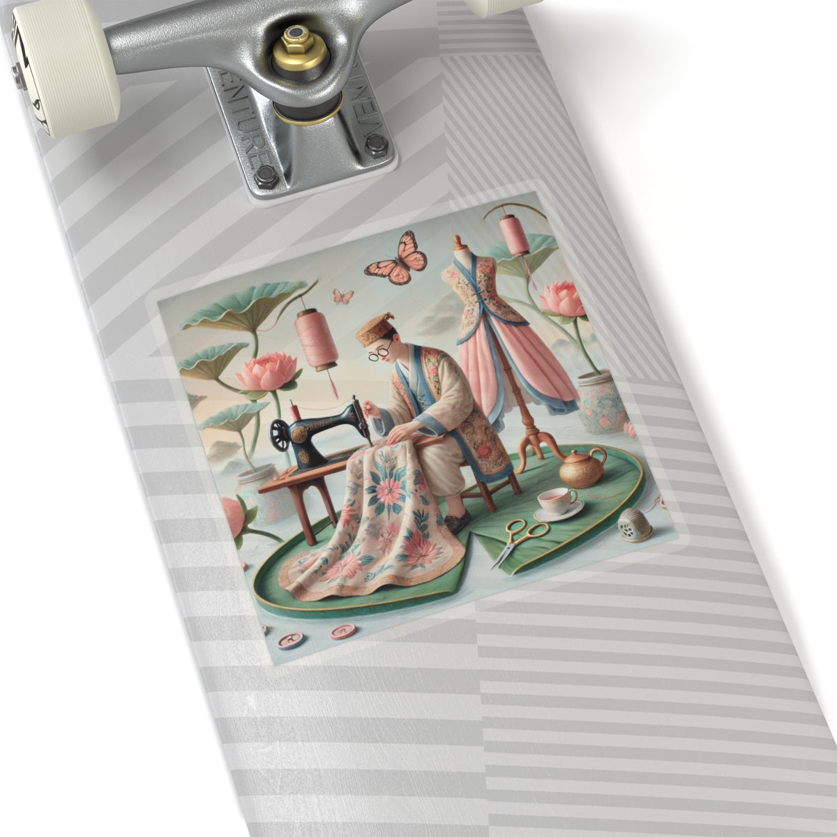 The Tailor’s Garden Kiss-Cut Stickers (4 Sizes) bring a quiet moment of devotion and craft to whatever you love to personalize, where a meticulous tailor works calmly beside a sewing machine amid lotus leaves, blooming flowers, and drifting butterflies. Spools of thread, fabric, and well-worn tools surround her, while a nearby dress form mirrors the elegance of the garments taking shape. Rendered in soft turquoise, blush, and warm floral tones, the scene blends traditional craftsmanship with dreamlike serenity—celebrating the beauty of patience, skilled hands, and the gentle poetry of making.