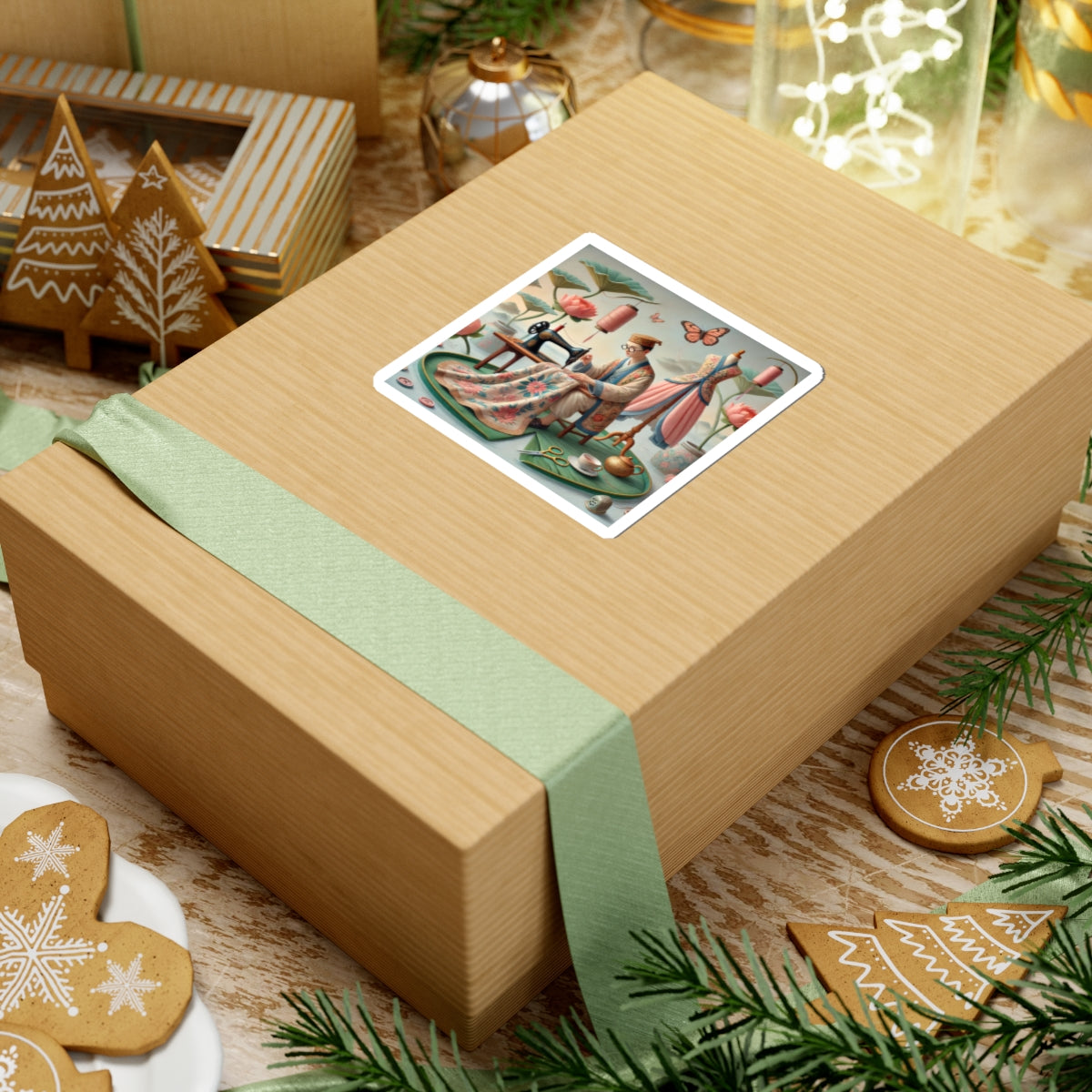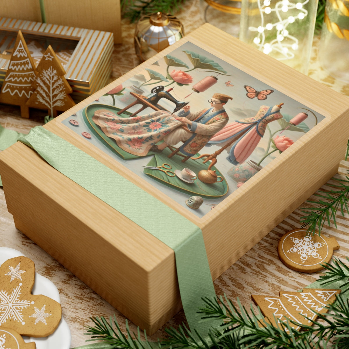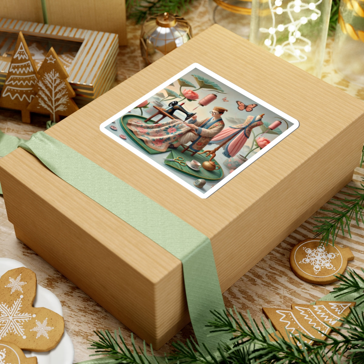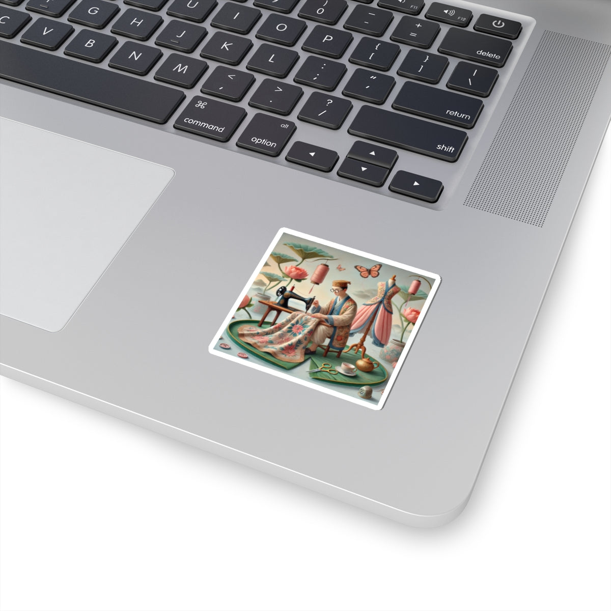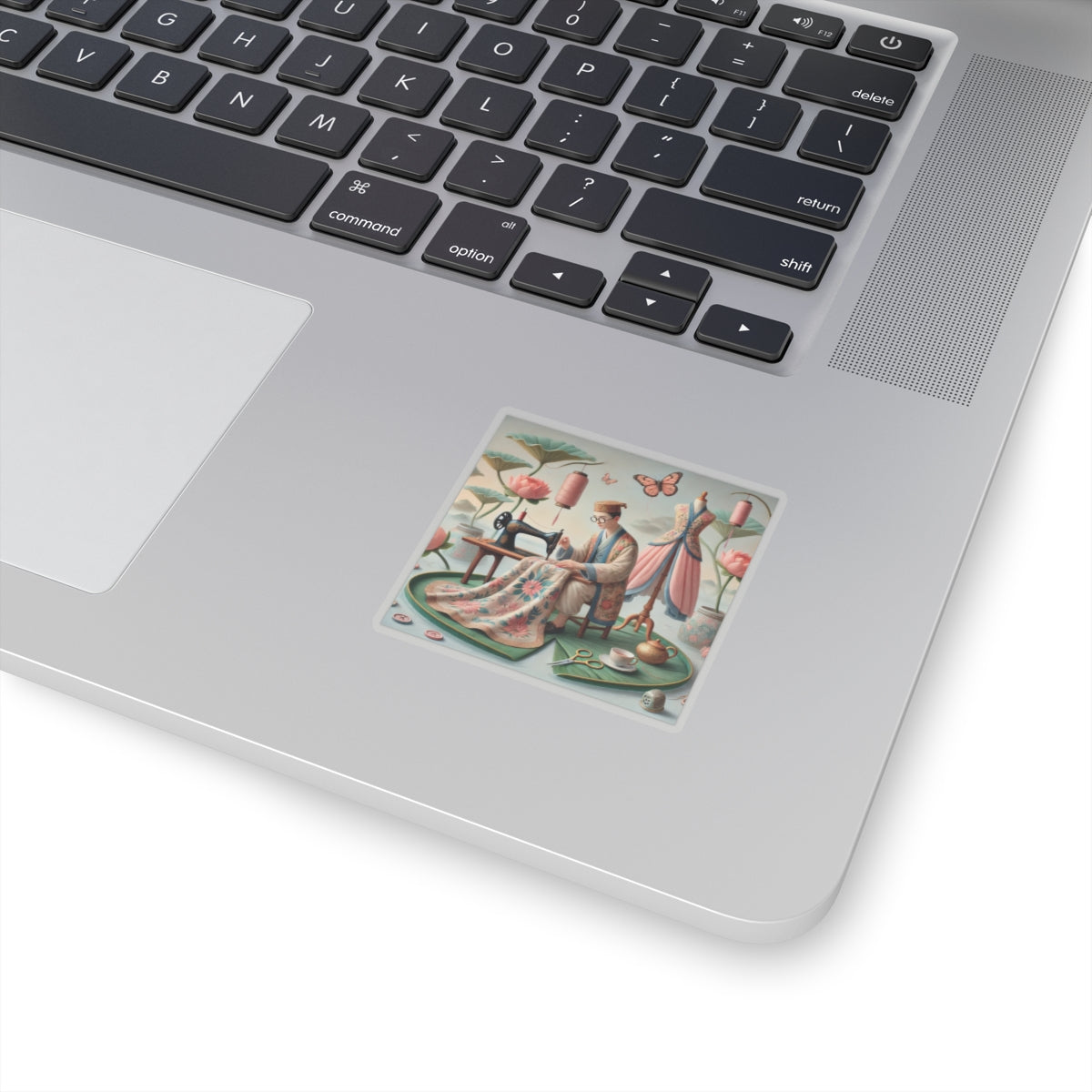 The Tailor’s Garden Kiss-Cut Stickers (4 Sizes) bring a quiet moment of devotion and craft to whatever you love to personalize, where a meticulous tailor works calmly beside a sewing machine amid lotus leaves, blooming flowers, and drifting butterflies. Spools of thread, fabric, and well-worn tools surround her, while a nearby dress form mirrors the elegance of the garments taking shape. Rendered in soft turquoise, blush, and warm floral tones, the scene blends traditional craftsmanship with dreamlike serenity—celebrating the beauty of patience, skilled hands, and the gentle poetry of making.