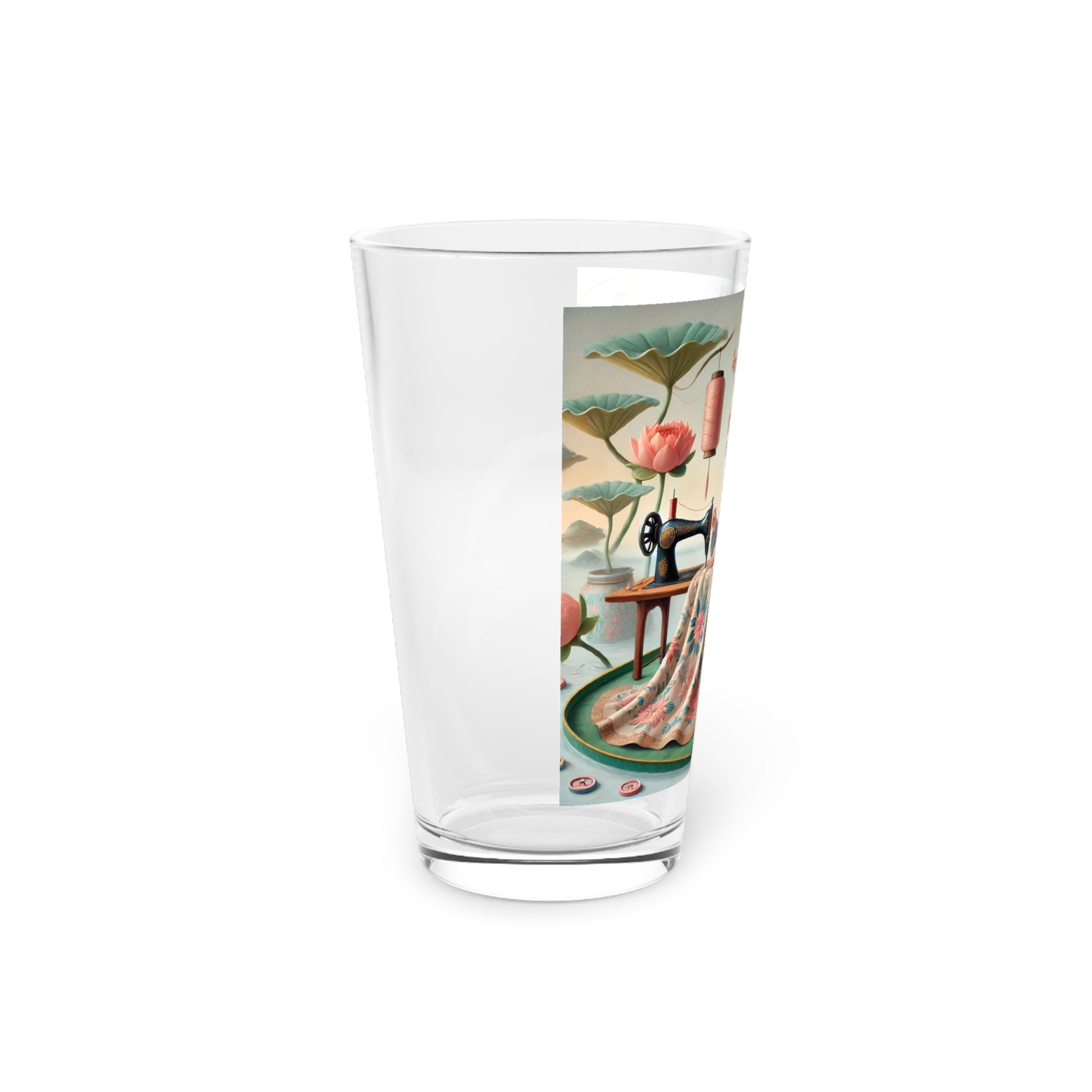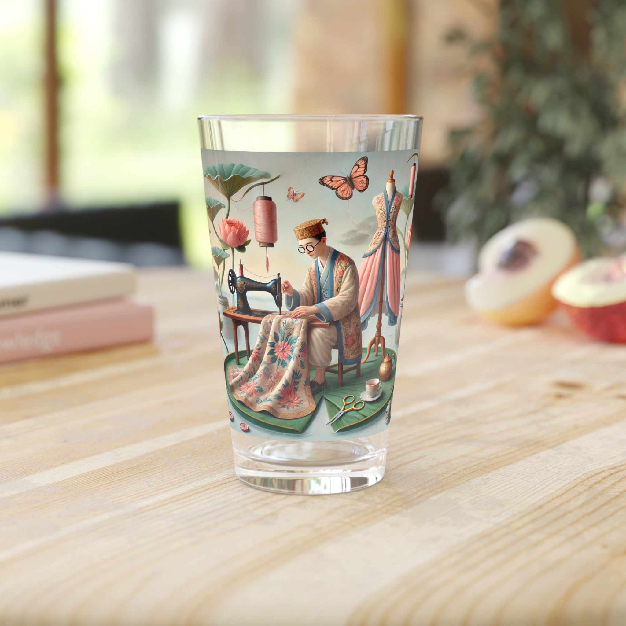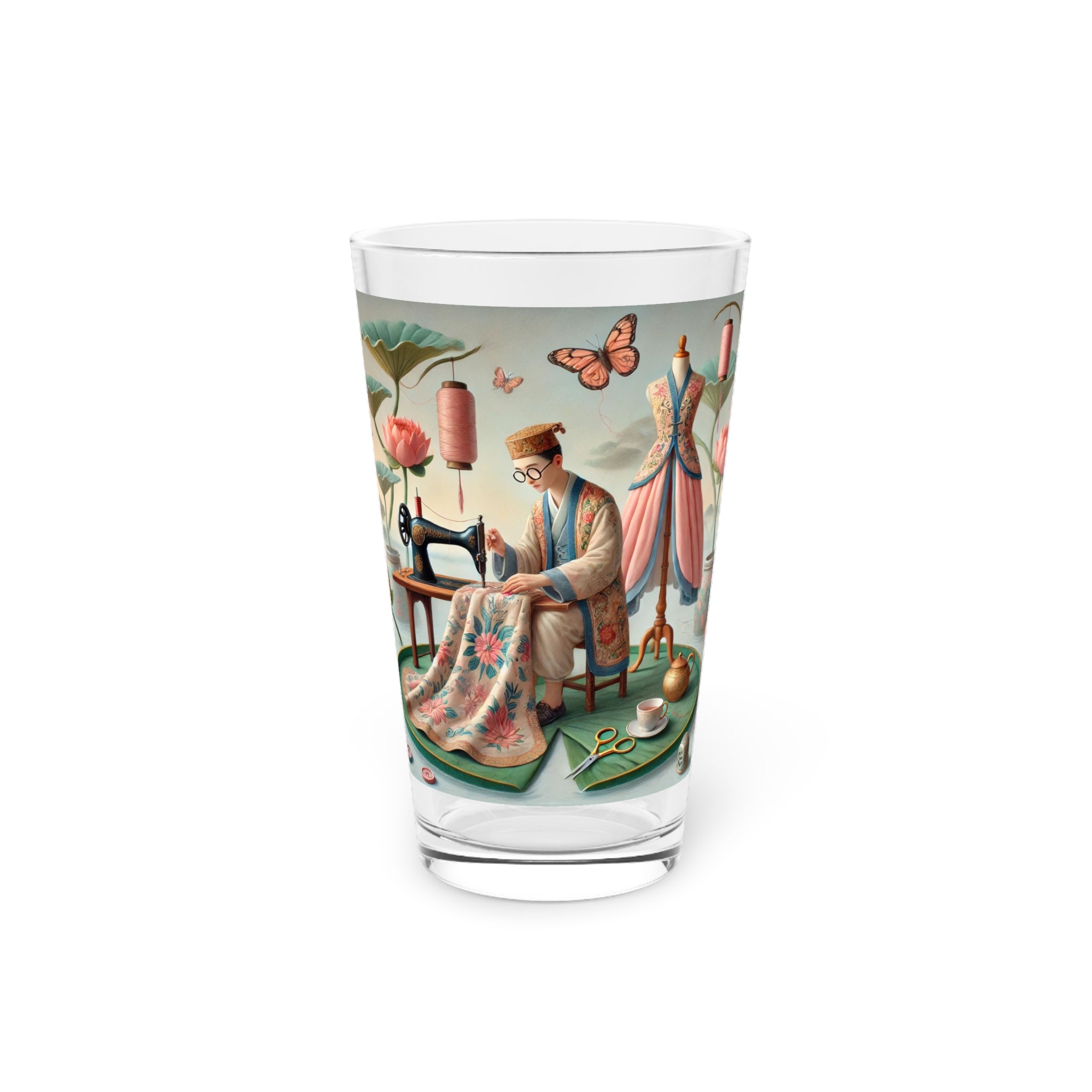 The Tailor’s Garden Pint Glass, 16oz brings a quiet moment of devotion and craft to your table, where a meticulous tailor works calmly beside a sewing machine amid lotus leaves, blooming flowers, and drifting butterflies. Spools of thread, fabric, and well-worn tools surround her, while a nearby dress form mirrors the elegance of the garments taking shape. Rendered in soft turquoise, blush, and warm floral tones, the scene blends traditional craftsmanship with dreamlike serenity—celebrating the beauty of patience, skilled hands, and the gentle poetry of making.