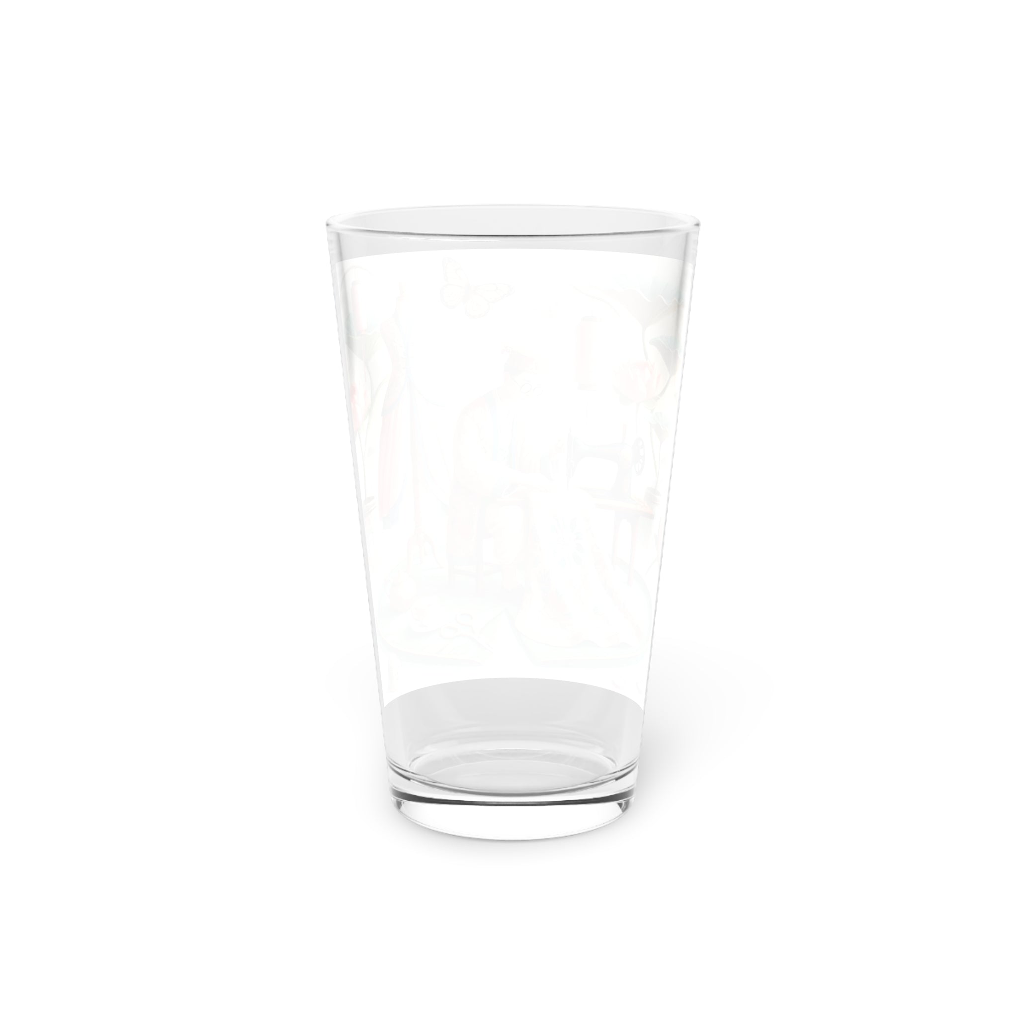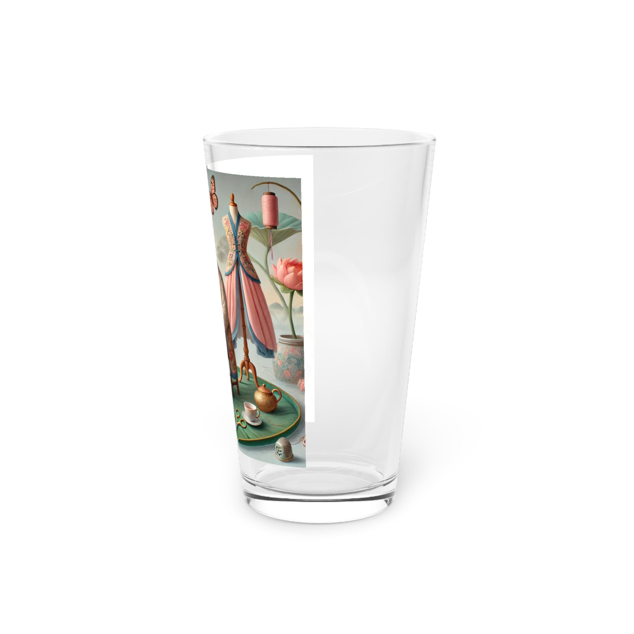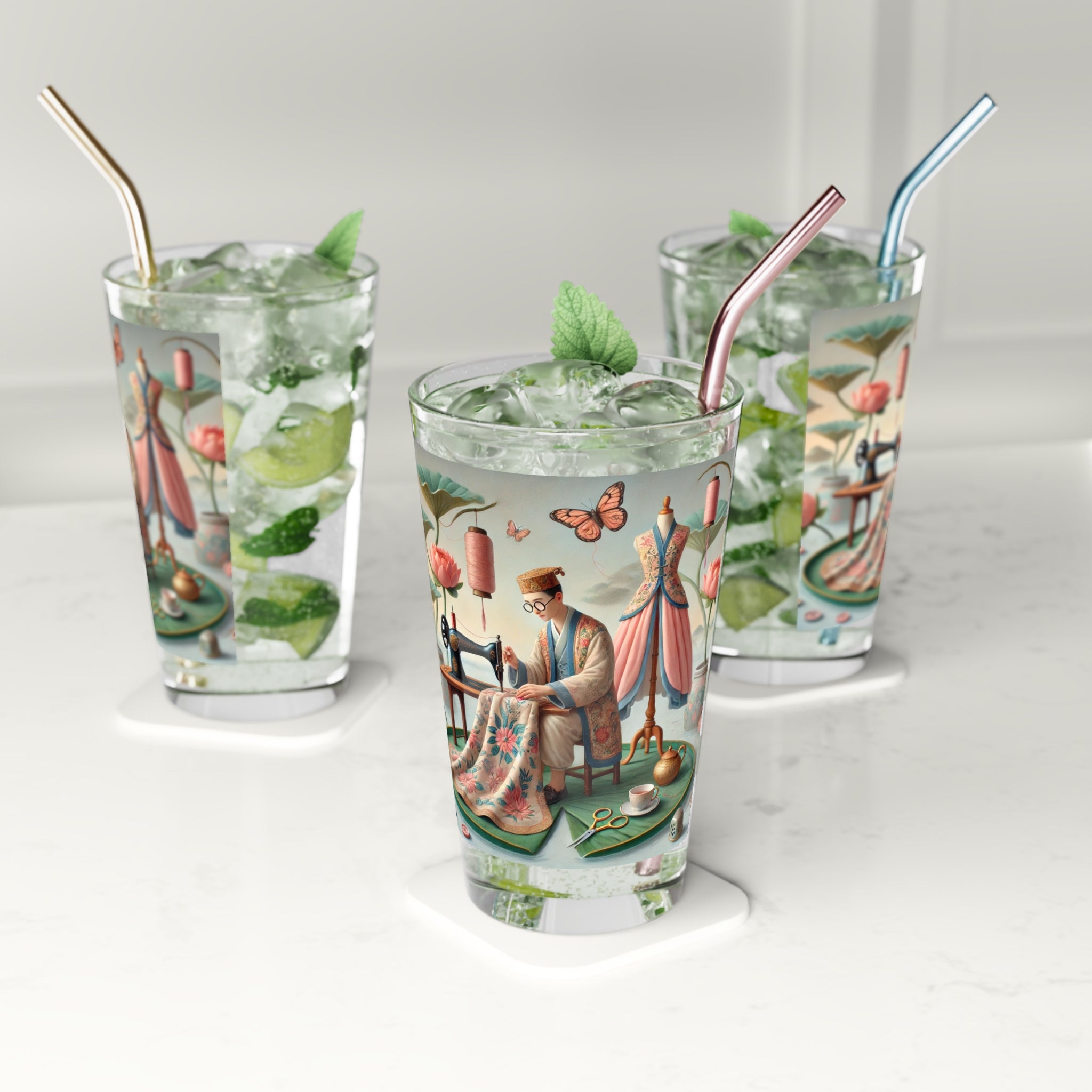The Tailor’s Garden Pint Glass, 16oz brings a quiet moment of devotion and craft to your table, where a meticulous tailor works calmly beside a sewing machine amid lotus leaves, blooming flowers, and drifting butterflies. Spools of thread, fabric, and well-worn tools surround her, while a nearby dress form mirrors the elegance of the garments taking shape. Rendered in soft turquoise, blush, and warm floral tones, the scene blends traditional craftsmanship with dreamlike serenity—celebrating the beauty of patience, skilled hands, and the gentle poetry of making.
