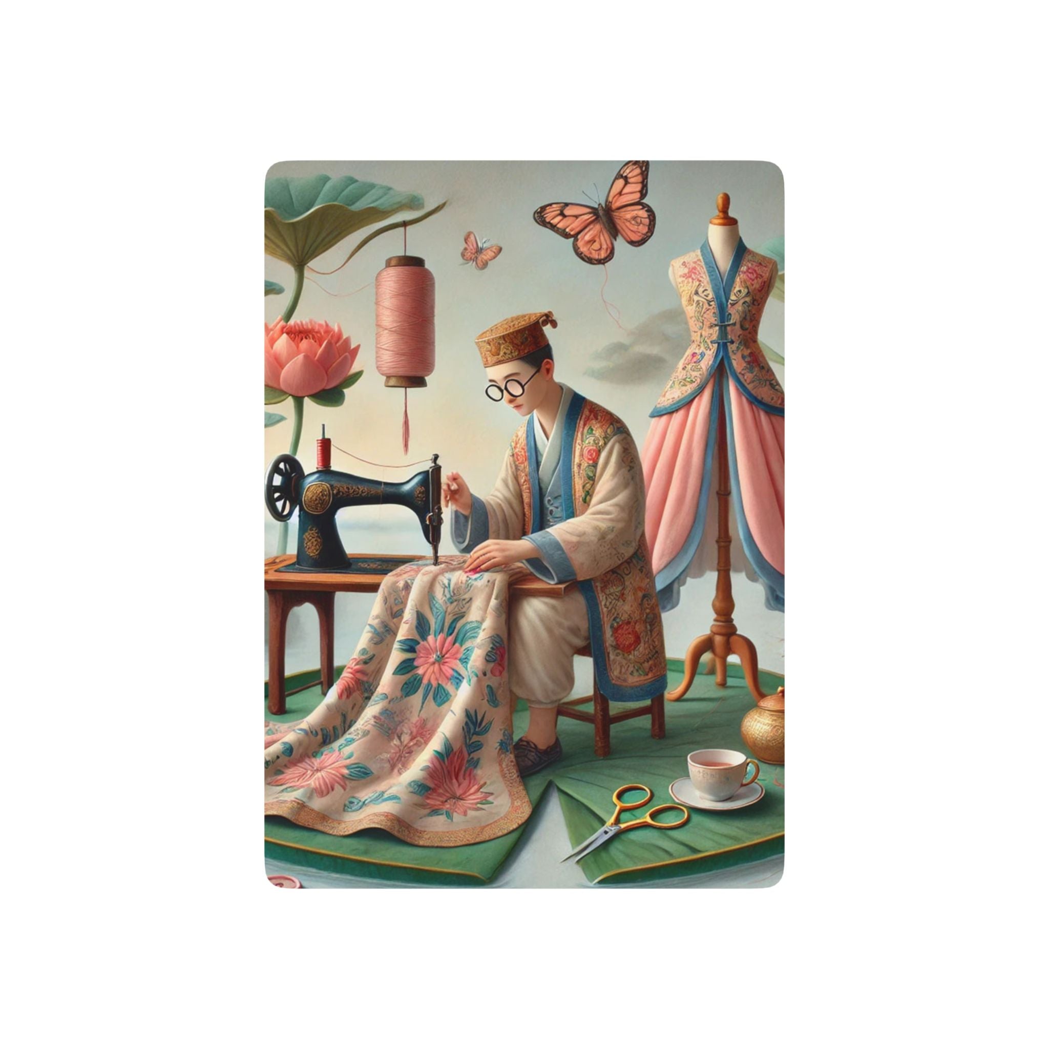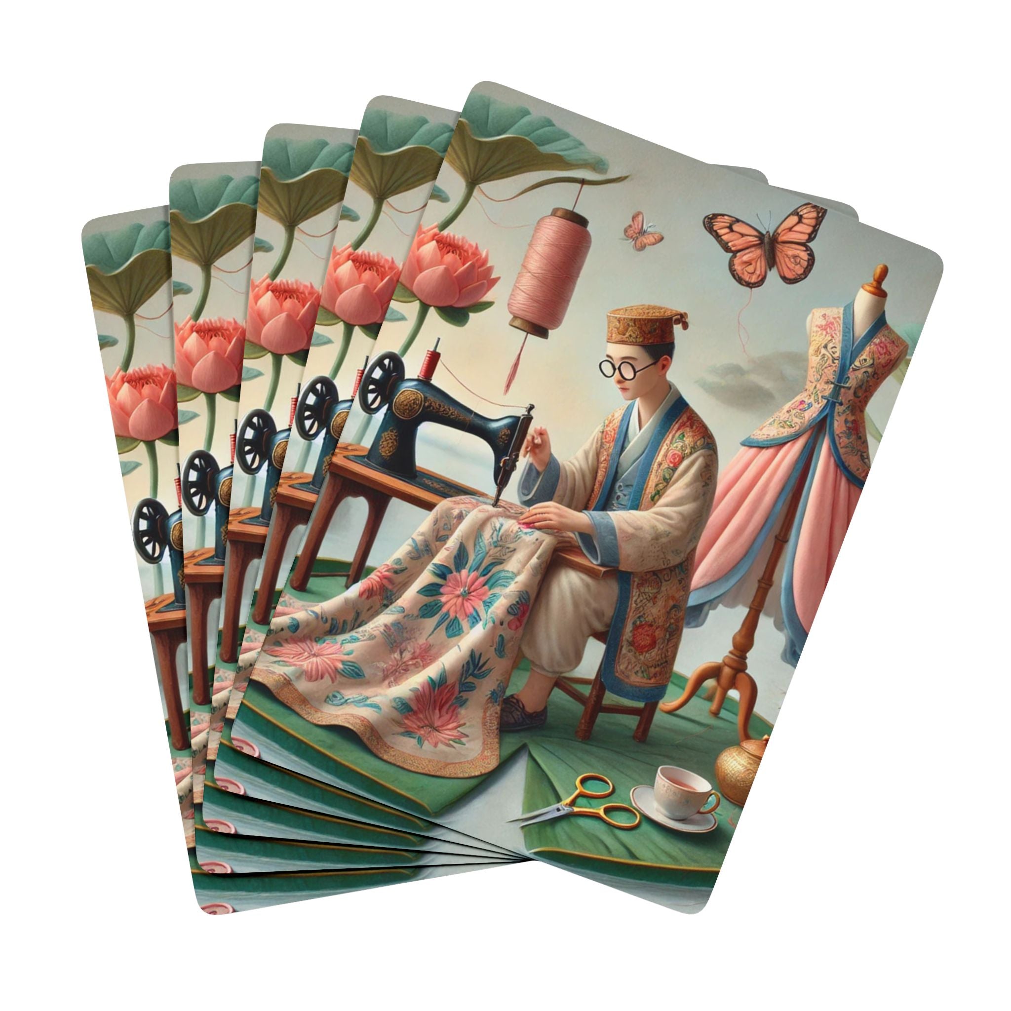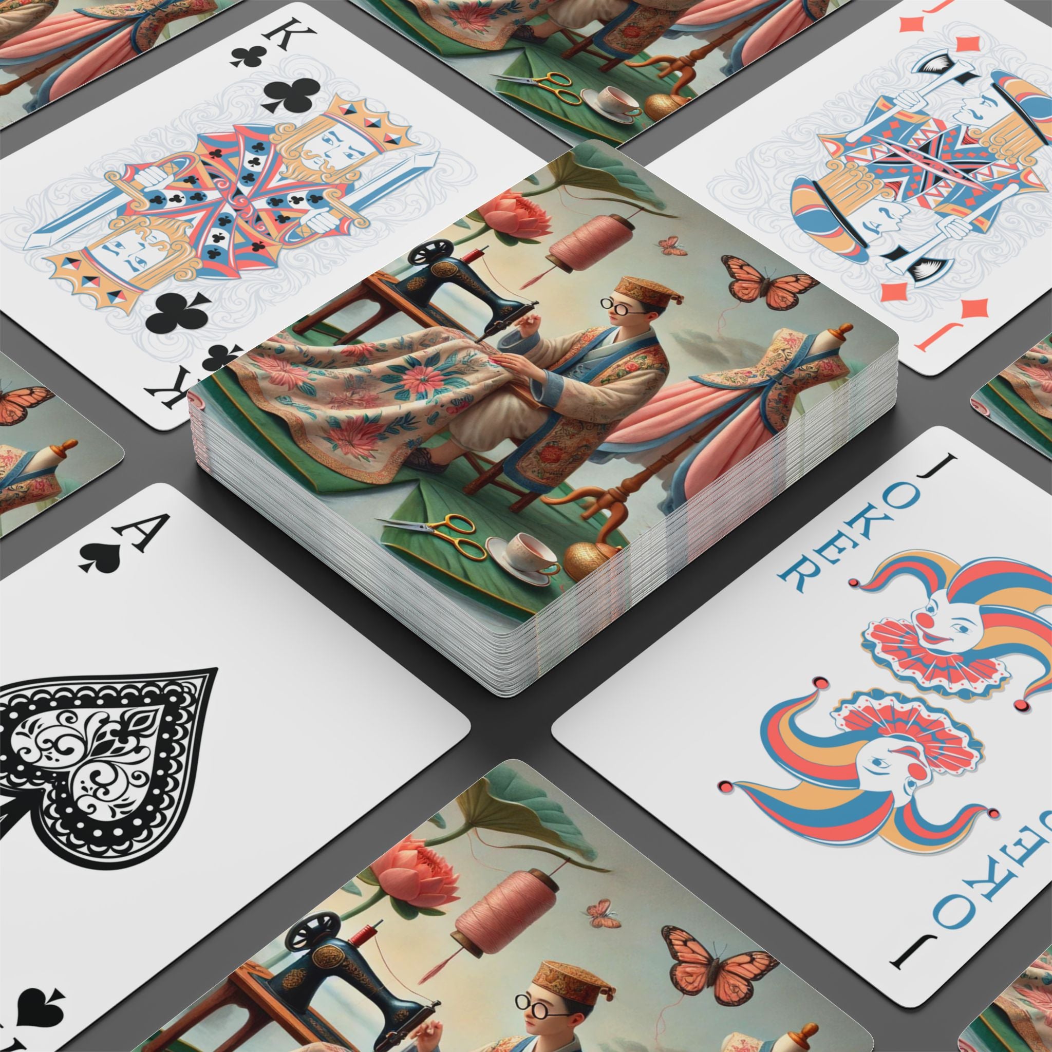 The Tailor’s Garden Playing Cards bring a quiet moment of devotion and craft to game night, turning every hand into a small scene of storybook serenity. The artwork features a meticulous tailor working calmly beside a sewing machine amid lotus leaves, blooming flowers, and drifting butterflies. Spools of thread, patterned fabric, and well-worn tools surround her, while a nearby dress form echoes the elegance of the garments taking shape. Rendered in soft turquoise, blush, and warm floral tones, the scene celebrates patience, skilled hands, and the gentle poetry of making.