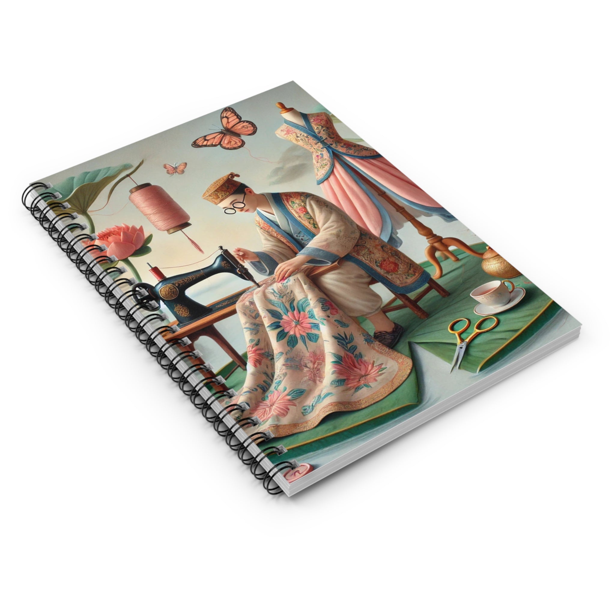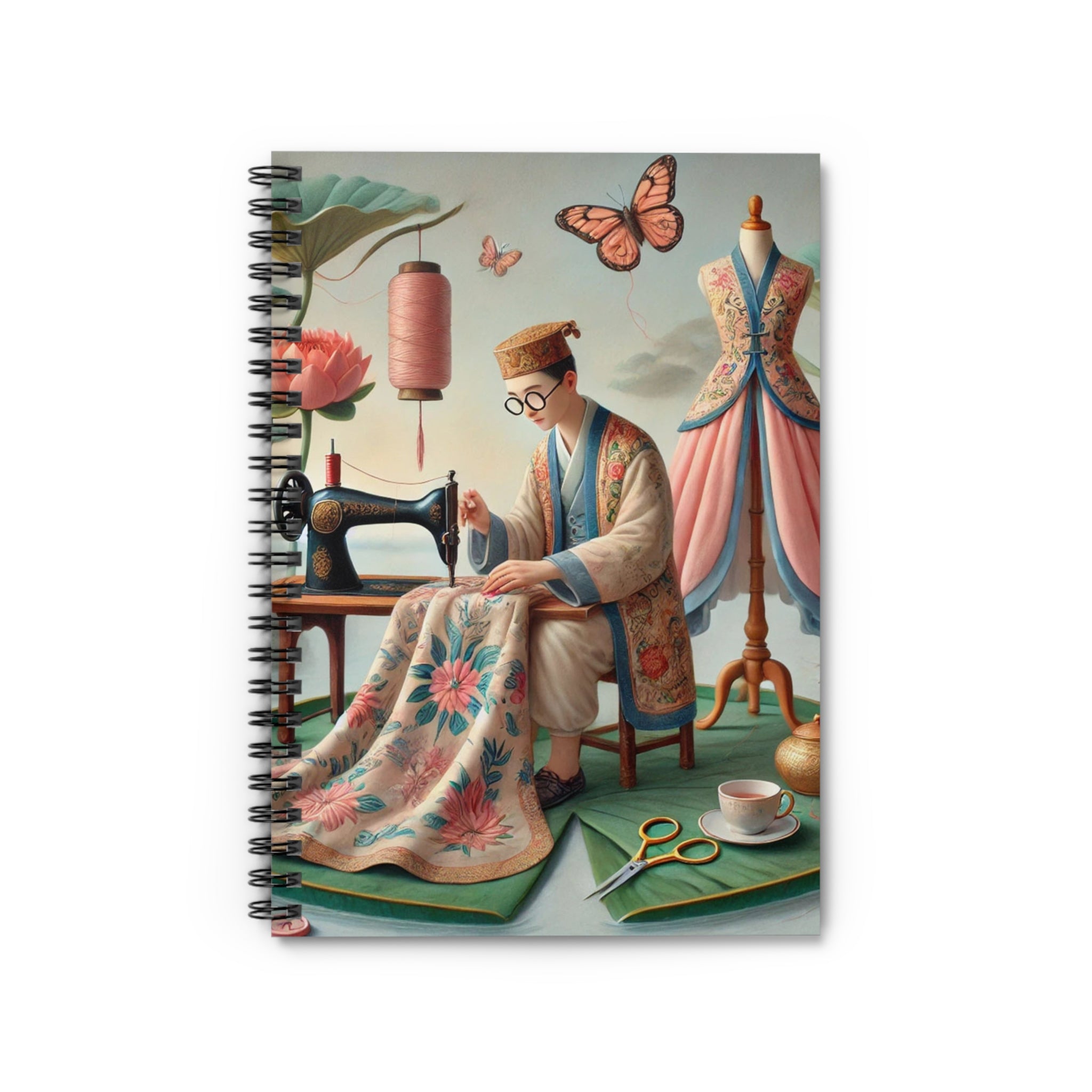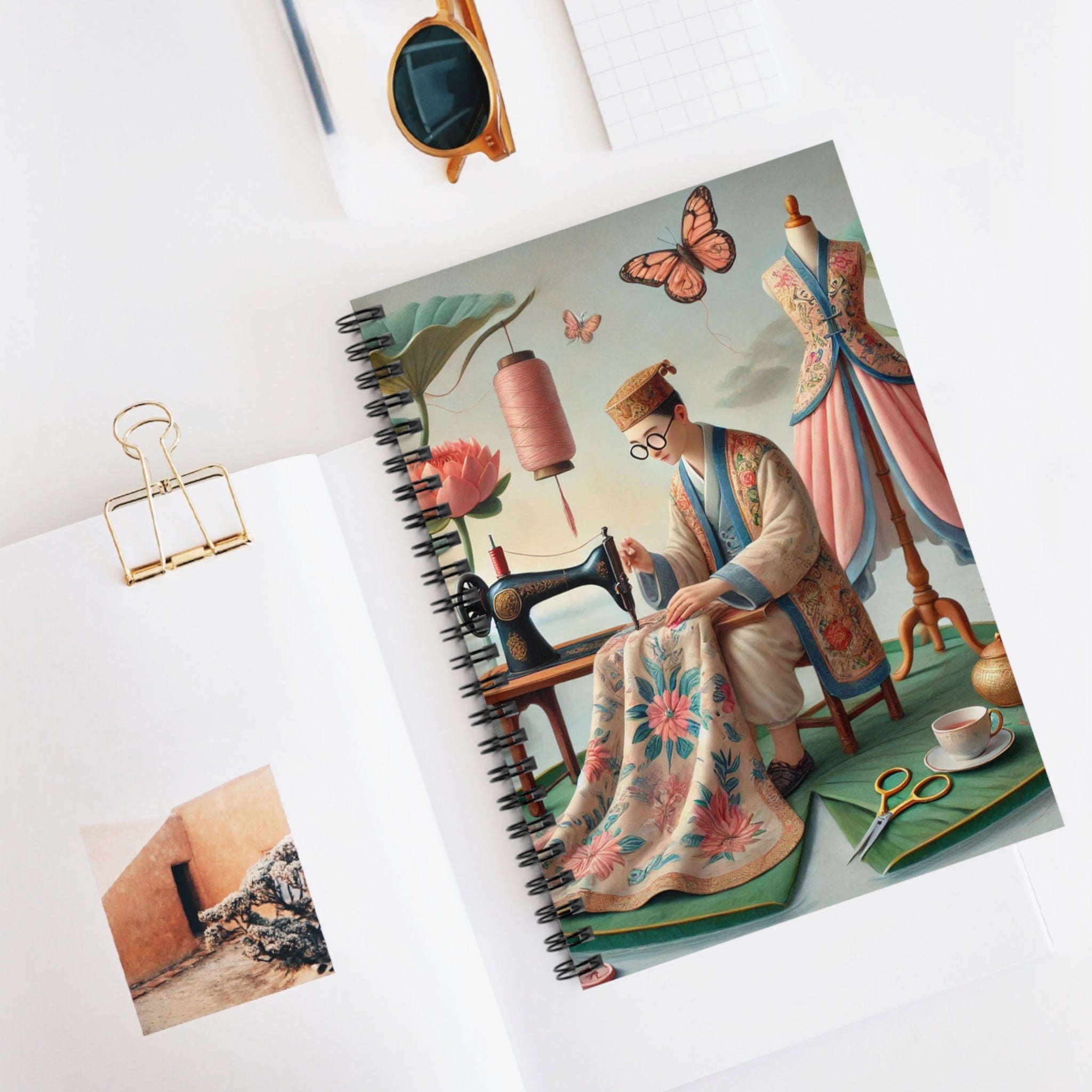 The Tailor’s Garden Spiral Notebook brings a quiet moment of devotion and craft to your everyday writing, where a meticulous tailor works calmly beside a sewing machine amid lotus leaves, blooming flowers, and drifting butterflies. Spools of thread, fabric, and well-worn tools surround her, while a nearby dress form mirrors the elegance of the garments taking shape. Rendered in soft turquoise, blush, and warm floral tones, the scene blends traditional craftsmanship with dreamlike serenity—celebrating the beauty of patience, skilled hands, and the gentle poetry of making.