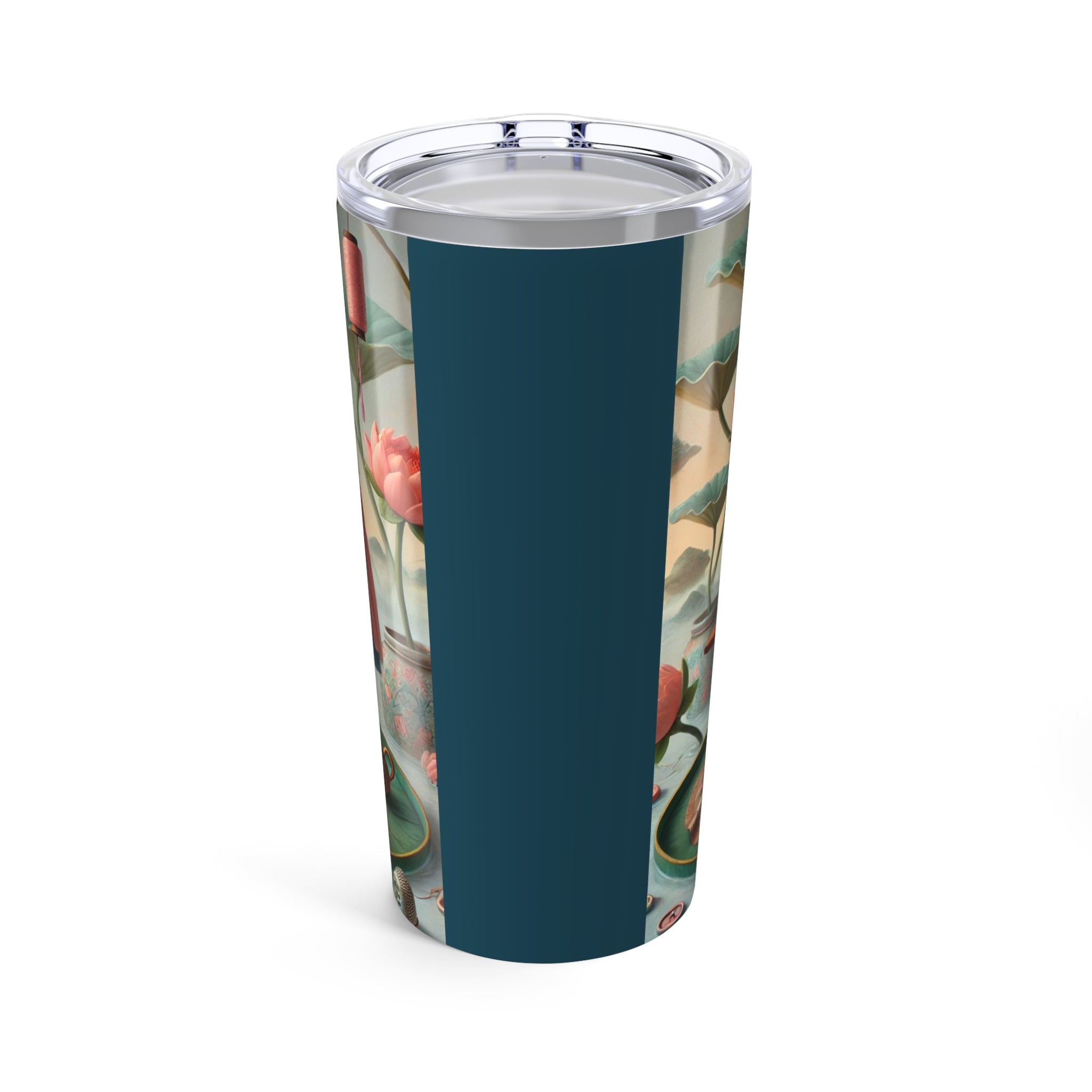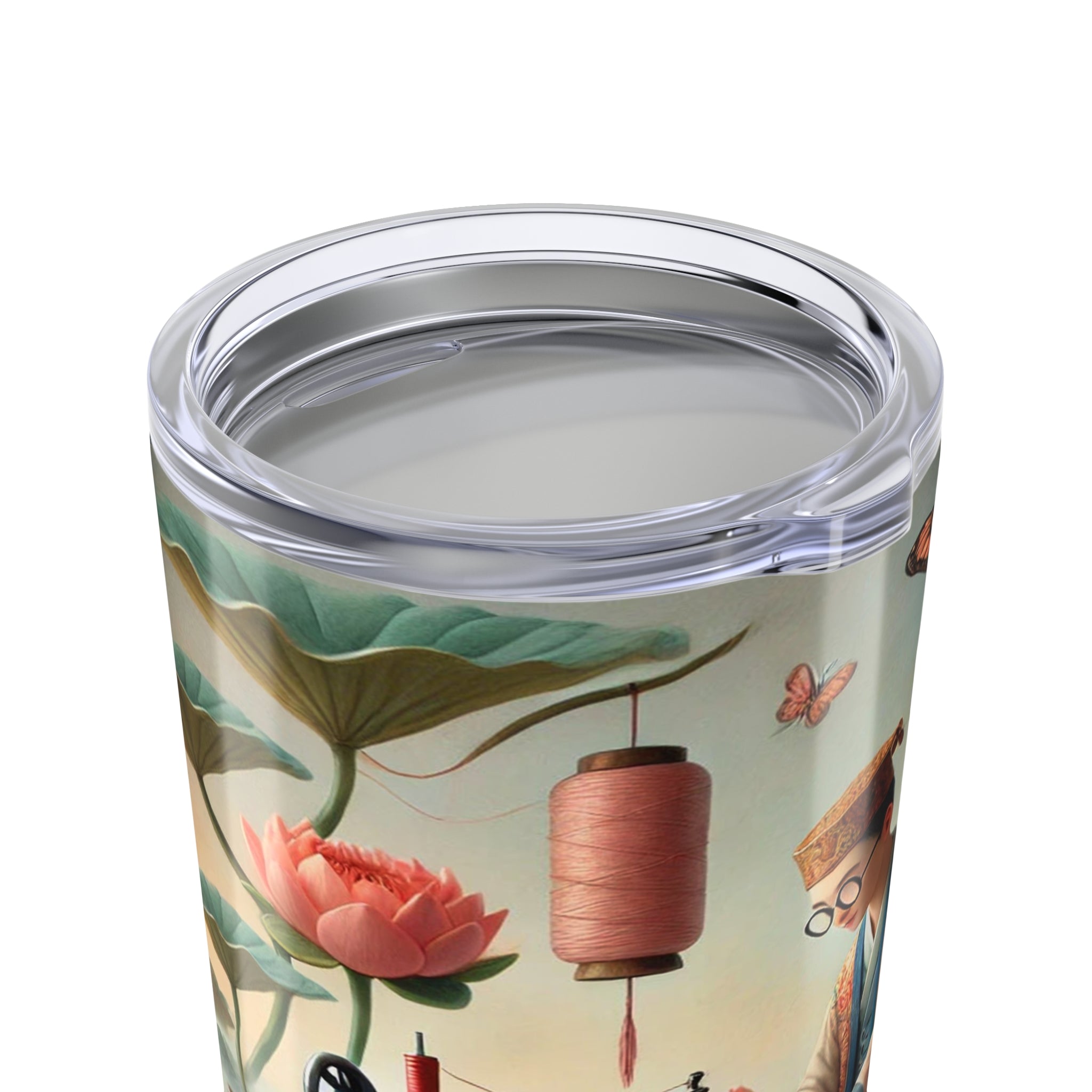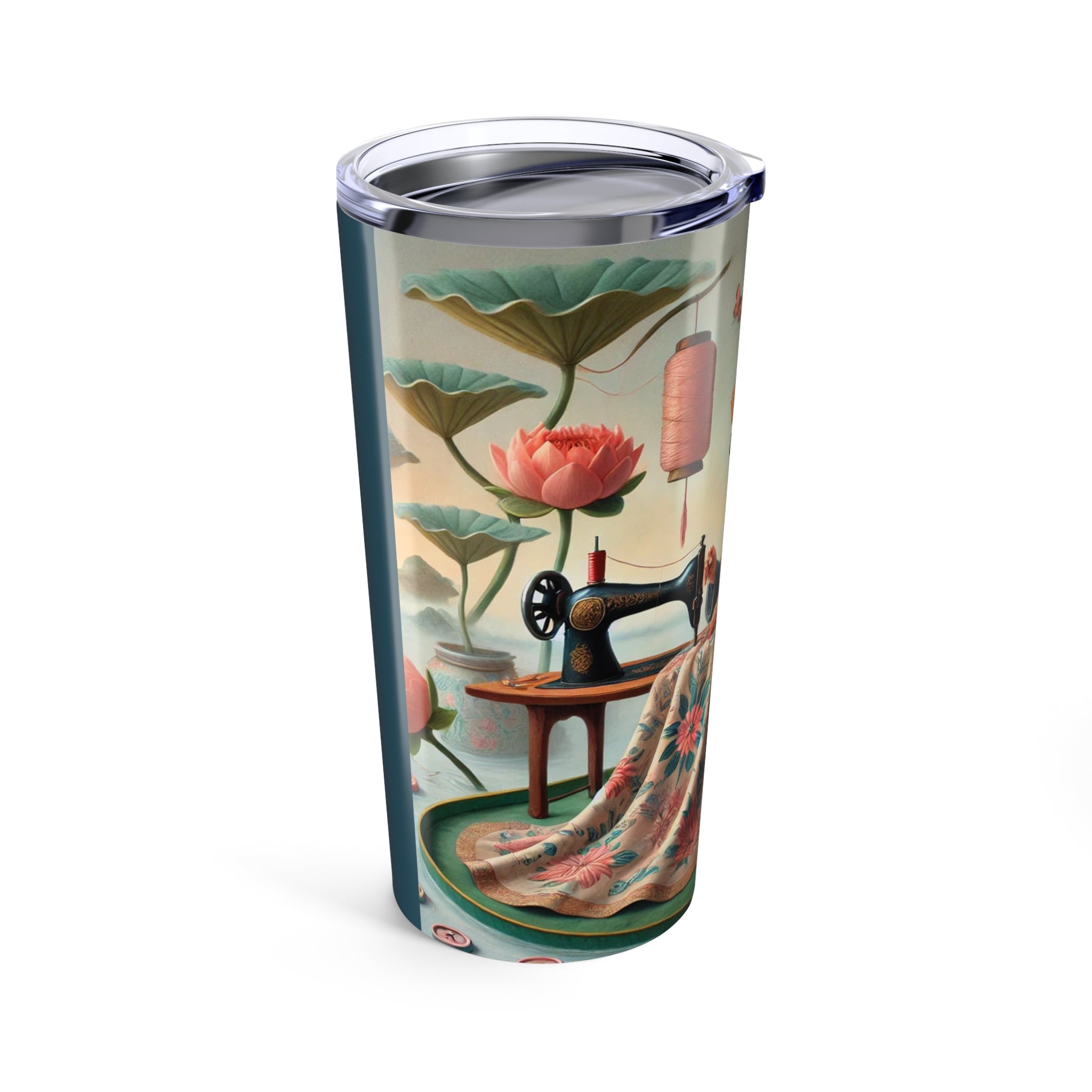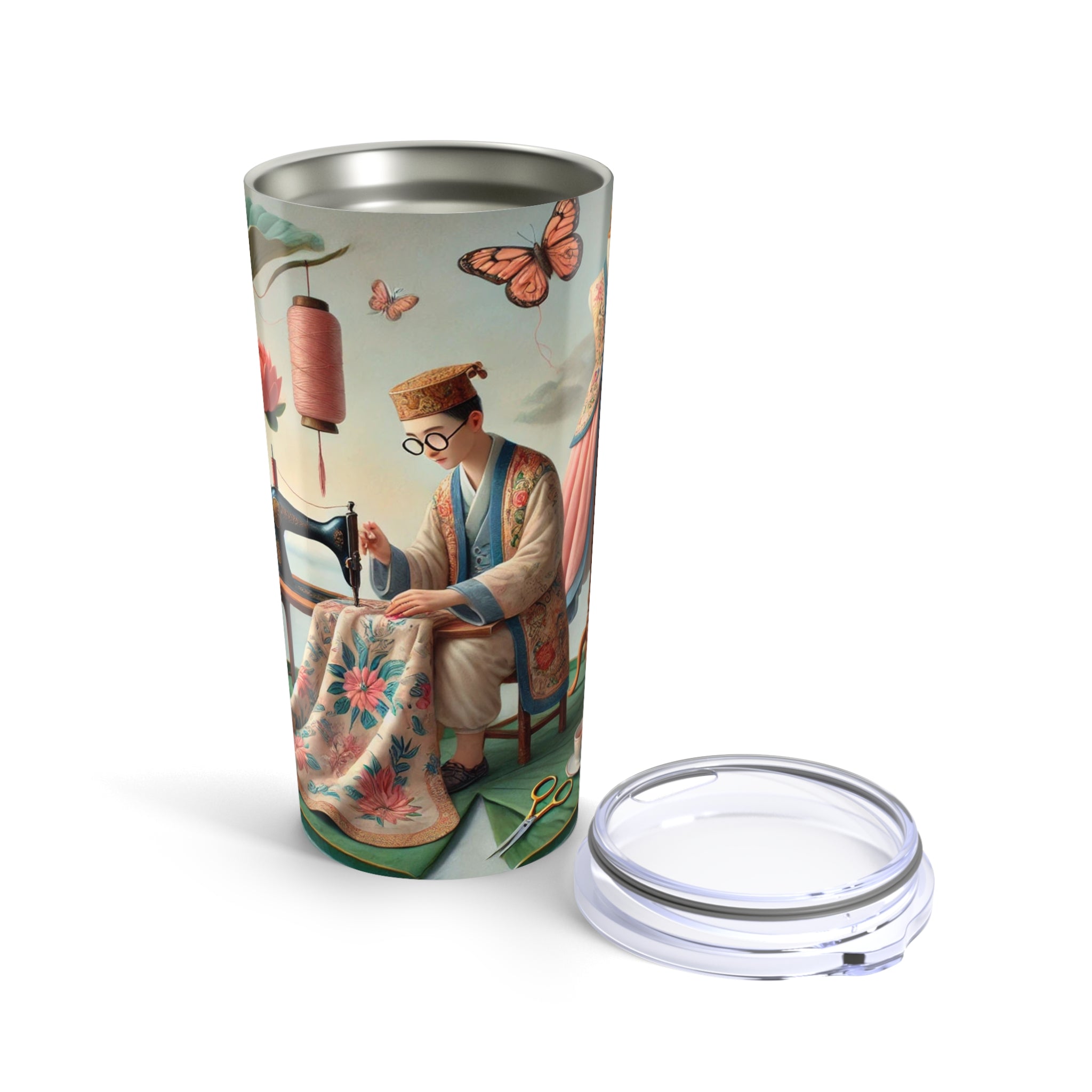 The Tailor’s Garden Tumbler 20oz turns your daily sip into a quiet moment of devotion and craft, where a meticulous tailor works calmly beside a sewing machine amid lotus leaves, blooming flowers, and drifting butterflies. Spools of thread, fabric, and well-worn tools surround her, while a nearby dress form mirrors the elegance of the garments taking shape. Rendered in soft turquoise, blush, and warm floral tones, the scene blends traditional craftsmanship with dreamlike serenity—celebrating the beauty of patience, skilled hands, and the gentle poetry of making.